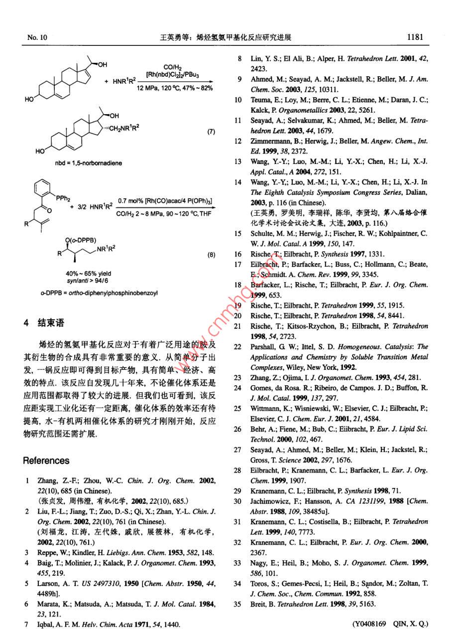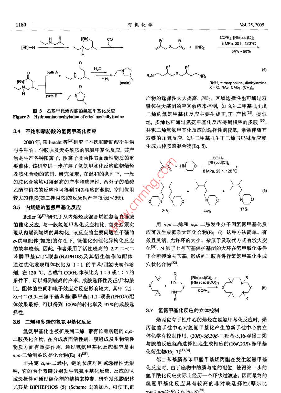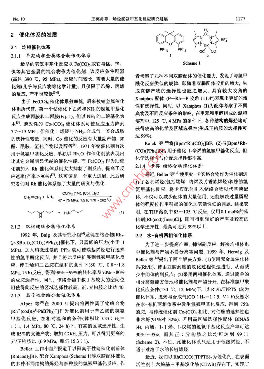 2005年第25卷有機(jī)化學(xué)Vol. 25, 2005第10期, 1176~1181Chin| of OrgarChemistryNo. 10, 1176~1181●綜述與進(jìn)展●烯烴氫氨甲基化反.應(yīng)研究進(jìn)展王英勇羅美明*黎耀忠陳華李賢均(四川大學(xué)化學(xué)學(xué)院教育部綠色化學(xué)與技術(shù)重點(diǎn)實(shí)驗(yàn)室成都610064)摘娶烯烴的氫氨甲基化反應(yīng)是 合成各種胺及其衍生物的有效途徑.以催化體系及應(yīng)用范圍的發(fā)展為線索綜述了該反應(yīng)的研究進(jìn)展.關(guān)鍵詞氫氨甲基化反應(yīng); 催化;烯烴;胺;過渡金屬絡(luò)合物Progress in Hydroaminomethylation of OlefinWANG, Ying- YongLUO, Mei-Ming*LI, Yao-ZhongCHEN, HuaLI, Xian-Jun(Key Laboratory of Green Chemistry and Technology of the Ministry of Education of China,Faculty of Chemistry, Sichuan Universit, Chengdu 610064)Abstract Hydroaminomethylation of olefin is an efficient method for the synthesis of various amines. Thisarticle has summarized the progress in this reaction on the development of catalyst system and applicationscope.Keywords hydroaminomethylation; catalysis; olefin; amine; transition metal complex胺及其衍生物的應(yīng)用范圍極其廣泛,在能源、材料、(圖1). 首先,烯烴發(fā)生氫甲?;磻?yīng)生成正、異構(gòu)醛,醫(yī)藥、環(huán)境及日用化工等領(lǐng)域均有重要的應(yīng)用121.工業(yè)醛再與胺(或氨)縮合生成亞胺或烯胺,最后亞胺或烯胺上生產(chǎn)胺的方法主要有:醇、鹵代烷對氨及胺的烷基化,再通過催化氫化生成相應(yīng)的胺用此三步反應(yīng)在一釜中醛的還原胺化,腈的還原等,但這些方法實(shí)質(zhì)上均為多進(jìn)行,彼此促進(jìn)同時(shí)又相互牽制,其中兩個(gè)催化過程步驟合成,且操作繁雜.因此,從烯烴一步合成胺的反(氫甲?;痛呋託?對催化劑的選擇有-定差異,因.應(yīng)具有重要意義.早在1949年, Reppe等)就發(fā)現(xiàn)由烯此催化體系的選擇是關(guān)鍵.烴、一氧化碳、水(或氫氣)與胺(或氨)可發(fā)生一步催化還原氨甲基化- -即氫氨甲基化反應(yīng)生成伯、仲、叔胺.R個(gè)CO/H2. R'R?NHNR'R2NR'R2)catalysts此反應(yīng)自發(fā)現(xiàn)以來,就因其良好的原子經(jīng)濟(jì)性和在有機(jī)合成中的潛在應(yīng)用價(jià)值受到人們的關(guān)注,并獲得了較大| COH2Hk的發(fā)展,催化體系不斷改進(jìn),應(yīng)用范圍也不斷擴(kuò)展.本文介紹了烯烴及其衍生物氫氨甲基化反應(yīng)的研究進(jìn)展.R'RNH(+ R個(gè)cHOH2Oimine or enamine1反應(yīng)機(jī)理圖1烯烴的氫氨甲基化反應(yīng)Figure 1 Hydroaminomethylation reaction of olefin烯烴的催化氫氨甲基化反應(yīng)從機(jī)理上由三步構(gòu)成* E-mail: luom2@yahoo.com.cnReccived August 31, 2004; revised January 24, 2005; accepted March 17, 2005.No. 10王英勇等:烯烴氫氨甲基化反應(yīng)研究進(jìn)展11772催化體系的發(fā)展BF42.1 均相催化體系PPh2Ph22.1.1早期均相金屬絡(luò) 合物催化體系最早的氫氨甲基化反應(yīng)以Fe(CO)s或它與錳、鋅、Scheme 1鎳等其它金屬的混合物作為催化劑.該反應(yīng)條件劇烈者考察了幾種不同雙膦配體的催化能力,發(fā)現(xiàn)了與氫甲(高達(dá)390 C, 95 MPa),反應(yīng)時(shí)間較長,需要大量的催?;磻?yīng)類似的規(guī)律:即隨著雙膦配體咬角的增大,生化劑(幾乎與反應(yīng)物等化學(xué)計(jì)量),且僅限于乙烯、丙烯成直鏈產(chǎn)物的選擇性也隨之增大.具有較大咬角的的反應(yīng),產(chǎn)率也較低B34.由于Fe(CO)s 催化體系效率低,后來被鈷金屬催化Xantphos配體(P -Rh- -P咬角11.49)表現(xiàn)出更好的活體系所代替.第一個(gè)鈷催化下乙烯和NH3的氫氨甲基化性和選擇性.同時(shí),以Xantphos (1)為配體考察了不同反應(yīng)生成丙胺和二丙胺(Eg.1),但以NH3的二烷基化為底物及不同反應(yīng)條件的影響,在甲苯和甲醇組成的混和主SI.膦改性的Co2(CO); 催化體系可使反應(yīng)壓力降到溶劑中, 125 C, 4 MPa的條件下,各種結(jié)構(gòu)的烯烴均可7.7~ 13 MPa,但催化1-烯烴與NH3、合成氣- -釜合成胺獲得較高的化學(xué)及區(qū)域選擇性(生成正構(gòu)胺的選擇性可的選擇性較低.同時(shí), Co催化的反應(yīng)有大量副產(chǎn)物,如達(dá)9%).Kalck等0]將[Bpm* Rh(CO)2]BF4 (2)與[Bpm*Rh-醛、酰胺、氫化產(chǎn)物以及醇等0.1971年銠催化劑首次(CO(PP;)BF4用于催化1-辛烯的氫氨甲基化反應(yīng),但用于氫氨甲基化反應(yīng),單獨(dú)以Rh2O3 作催化劑就表現(xiàn)出化學(xué)選擇性與位置選擇性都不高.比其它金屬明顯優(yōu)越的催化性能,而Fe(CO)s 作為助催2.1.4卡賓- 銠絡(luò)合物催化體系化劑加入Rh催化體系則大大抑制了副反應(yīng),提高了反應(yīng)速率(產(chǎn)率>90%)".這可謂是一個(gè)重大進(jìn)展,此后研最近,Beller等"]使用銠-卡賓絡(luò)合物作為催化劑進(jìn)究者們對Rh催化體系做了大量的研究與優(yōu)化.行了各種烯烴(包括端烯,內(nèi)烯及芳香族烯烴)和胺的氫氨甲基化反應(yīng).將卡賓配體引入銠絡(luò)合物以代替膦配CO/H2 (14). (Co], El2OCH2=CH2+ NH347~ 75 MPa, 1.5h, 170~ 262°C體,不僅可以減少配體的大量使用,還能解決過量膦配體的強(qiáng)配位作用引起的催化加氫活性低的問題.結(jié)果表+ HN^V明,在THF溶劑中85~105 C反應(yīng),僅用0.1 mol%的催化劑[Rh(cod)(Imes)CI],即可得到較好的產(chǎn)率及較高的2.1.2雙核銠絡(luò) 合物催化體系化學(xué)選擇性,最高可達(dá)到9%以上.1992年, Baig 及其研究小組4發(fā)現(xiàn)在絡(luò)合物[Rhx2.2水-有