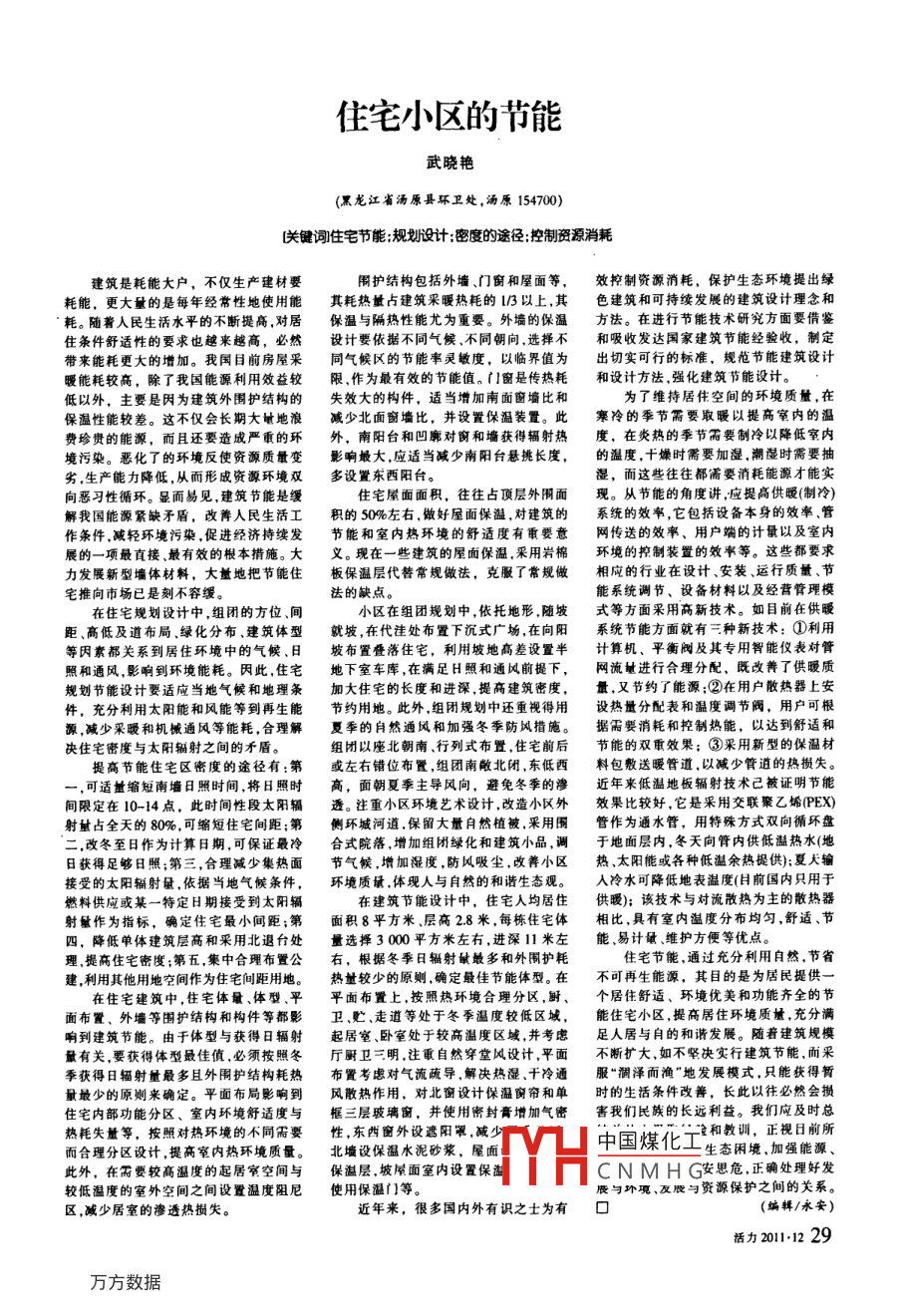 住宅小區(qū)的節(jié)能武曉艷(黑龍江省湯原縣環(huán)衛(wèi)處,湯原154700)關(guān)鍵詞住宅節(jié)能規(guī)劃設(shè)計;度的途徑控制資源消耗建筑是耗能大戶,不僅生產(chǎn)建材要圍護(hù)結(jié)構(gòu)包括外墻、門窗和屋面等,效控制資源消耗,保護(hù)生態(tài)環(huán)境提出綠耗能,更大量的是每年經(jīng)常性地使用能其耗熱量占建筑采暖熱耗的1乃3以上,其色建筑和可持續(xù)發(fā)展的建筑設(shè)計理念和耗。隨著入民生活水平的不斷提高對居保溫與隔熱性能尤為重要。外墻的保溫方法。在進(jìn)行節(jié)能技術(shù)研究方面要借鑒住條件舒適性的要求也越來越高,必然設(shè)計要依據(jù)不同氣候、不同朝向選擇不和吸收發(fā)達(dá)國家建筑節(jié)能經(jīng)驗收,制定帶來能耗更大的增加。我國目前房屋采同氣候區(qū)的節(jié)能率靈敏度,以臨界值為出切實可行的標(biāo)準(zhǔn),規(guī)范節(jié)能建筑設(shè)計暖能耗較高,除了我國能源利用效益較限作為最有效的節(jié)能值。門窗是傳熱耗和設(shè)計方法強(qiáng)化建筑節(jié)能設(shè)計。低以外,主要是因為建筑外圍護(hù)結(jié)構(gòu)的失效大的構(gòu)件,適當(dāng)增加南面窗墻比和為了維持居住空間的環(huán)境質(zhì)量,在保溫性能較差。這不僅會長期大敏地浪減少北面窗墻比,并設(shè)置傑溫裝置。此寒冷的季節(jié)需要取暖以提高室內(nèi)的溫費珍貴的能源,而且還要造成嚴(yán)重的環(huán)外,南陽臺和凹廓對窗和墻獲得輻射熱度,在炎熱的季節(jié)需要制冷以降低室內(nèi)境污染。惡化了的環(huán)境反使資源質(zhì)量變影響最大應(yīng)適當(dāng)減少南陽臺懸挑長度,的溫度干燥時需要加濕潮濕時需要抽劣生產(chǎn)能力降低,從而形成資源環(huán)境雙多設(shè)置東西陽臺。濕,而這些往往都需要消耗能源才能實向惡習(xí)性循環(huán)。顯而易見,建筑節(jié)能是緩住宅屋面面積,往往占頂層外圍面現(xiàn)。從節(jié)能的角度講,應(yīng)提高供暖(制解我國能源緊缺矛盾,改善人民生活工積的50%左右,做好屋面保溫,對建筑的系統(tǒng)的效率,它包括設(shè)備本身的效率管作條件,減輕環(huán)境污染,促進(jìn)經(jīng)濟(jì)持續(xù)發(fā)節(jié)能和室內(nèi)熱環(huán)境的舒適度有重要意網(wǎng)傳送的效率、用戶端的計量以及室內(nèi)展的一項最直接、最有效的根本揹施。大義?,F(xiàn)在一些建筑的屋面保溫,采用巖棉環(huán)境的控制裝置的效率等。這些都要求力發(fā)展新型墻體材料,大齜地把節(jié)能住板保溫層代替常規(guī)做法,克服了常規(guī)做相應(yīng)的行業(yè)在設(shè)計、安裝、運行質(zhì)量、節(jié)宅推向市場已是刻不容緩法的缺點能系統(tǒng)調(diào)節(jié)、設(shè)備材料以及經(jīng)營管理模在住宅規(guī)劃設(shè)計中,組團(tuán)的方位、間小區(qū)在組團(tuán)規(guī)劃中,依托地形,隨坡式等方面采用高新技術(shù)。如目前在供暖距、高低及道布局、綠化分布、建筑體型就坡在代洼處布置下沉式廣場在向陽系統(tǒng)節(jié)能方面就有三種新技術(shù):①利用等因素都關(guān)系到居住環(huán)境中的氣候、日坡布置疊落住宅,利用坡地高差設(shè)置半計算機(jī)、平衡閥及其專用智能儀表對管照和通風(fēng),影響到環(huán)境能耗。因此,住宅地下室車庫,在滿足H照和通風(fēng)前提下,網(wǎng)流址進(jìn)行合理分配、既改善了供暖質(zhì)規(guī)劃節(jié)能設(shè)計要適應(yīng)當(dāng)?shù)貧夂蚝偷乩項l加大住宅的長度和進(jìn)深,提高建筑密度,量,又節(jié)約了能源;②在用戶散熱器上安件,充分利用太陽能和風(fēng)能等到再生能節(jié)約用地。此外組閉規(guī)劃中還重視得用設(shè)熱量分配表和溫度調(diào)節(jié)閥,用戶可根源,減少采暖和機(jī)械通風(fēng)等能耗,合理解夏季的自然通風(fēng)和加強(qiáng)冬季防風(fēng)措施。據(jù)需要消耗和控制熱能,以達(dá)到舒適和決住宅密度與太陽輻射之間的矛盾。組團(tuán)以座北朝南行列式布置住宅前后節(jié)能的雙重效果;③采用新型的保溫材提高節(jié)能住宅區(qū)密度的途徑有:第或左右錯位布置,組團(tuán)南敞北閉東低西料包散送暖管道,以減少管逍的熱損失可適量縮短南墻日照時間將日照時高,面朝夏季主導(dǎo)風(fēng)向,避免冬季的滲近年來低溫地板輻射技術(shù)己被證明節(jié)能間限定在10-14點,此時間性段太陽輻透。注重小區(qū)環(huán)境藝術(shù)設(shè)計改造小區(qū)外效果比較好,它是采用交聯(lián)聚乙烯PEX射量占全天的80%,可縮短住宅間距;第側(cè)環(huán)城河道保留大量自然植被采用圍管作為通水管,用特殊方式雙向循環(huán)盤二,改冬至日作為計算日期,可保證最冷合式院落,增加組閉綠化和建筑小品,調(diào)于地面層內(nèi),冬天向管內(nèi)供低溫?zé)崴?地日獲得足夠日照;第三,合理減少集熱面節(jié)氣候,增加濕度,防風(fēng)吸塵,改善小區(qū)熱太陽能或各種低溫余熱提供);夏天輸接受的太陽輻射量,依據(jù)當(dāng)?shù)貧夂驐l件,環(huán)境質(zhì)量體現(xiàn)人與自然的和諧生態(tài)觀。入冷水可降低地表溫度(目前國內(nèi)只用于燃料供應(yīng)或某一特定日期接受到太陽輻在建筑節(jié)能設(shè)計中,住宅人均居住供暖);該技術(shù)與對流散熱為主的散熱器射量作