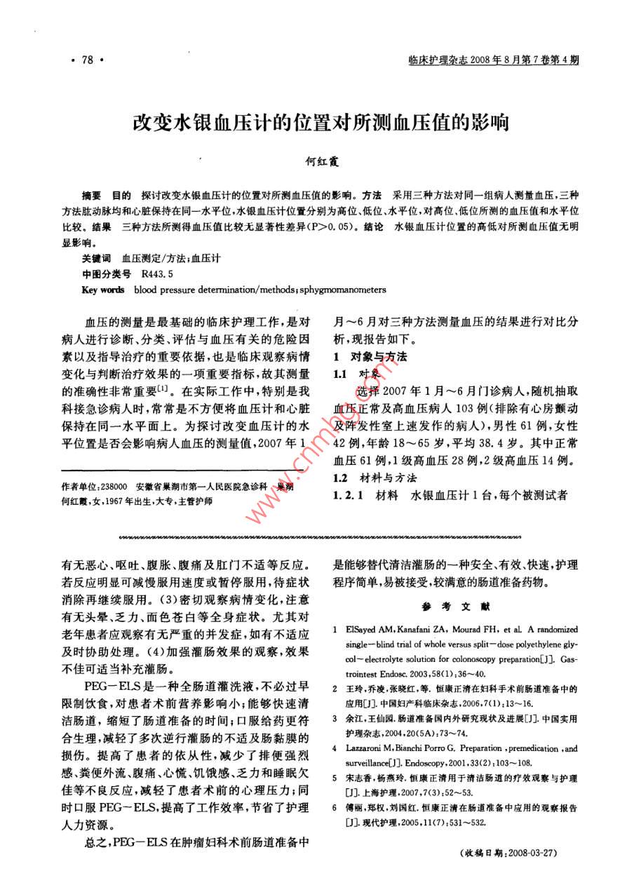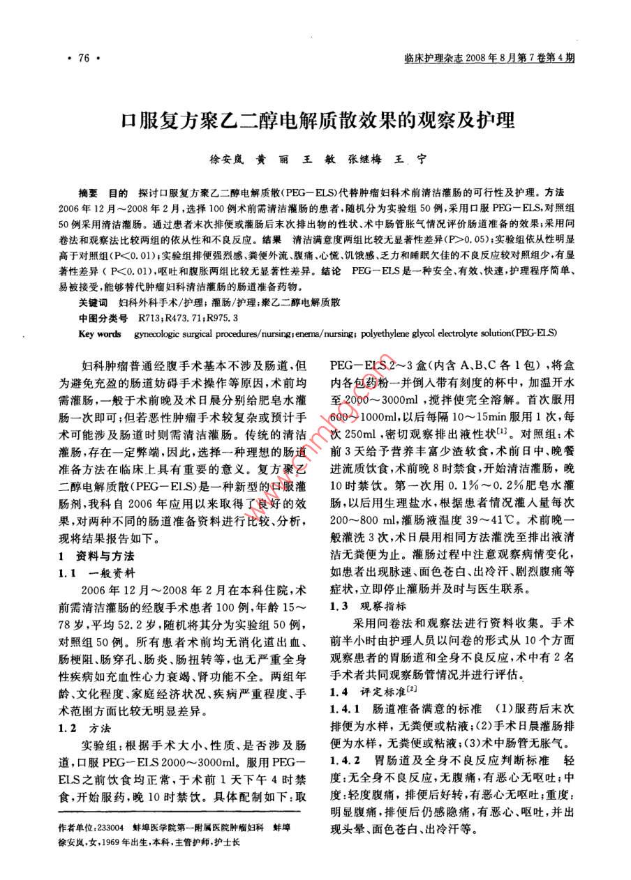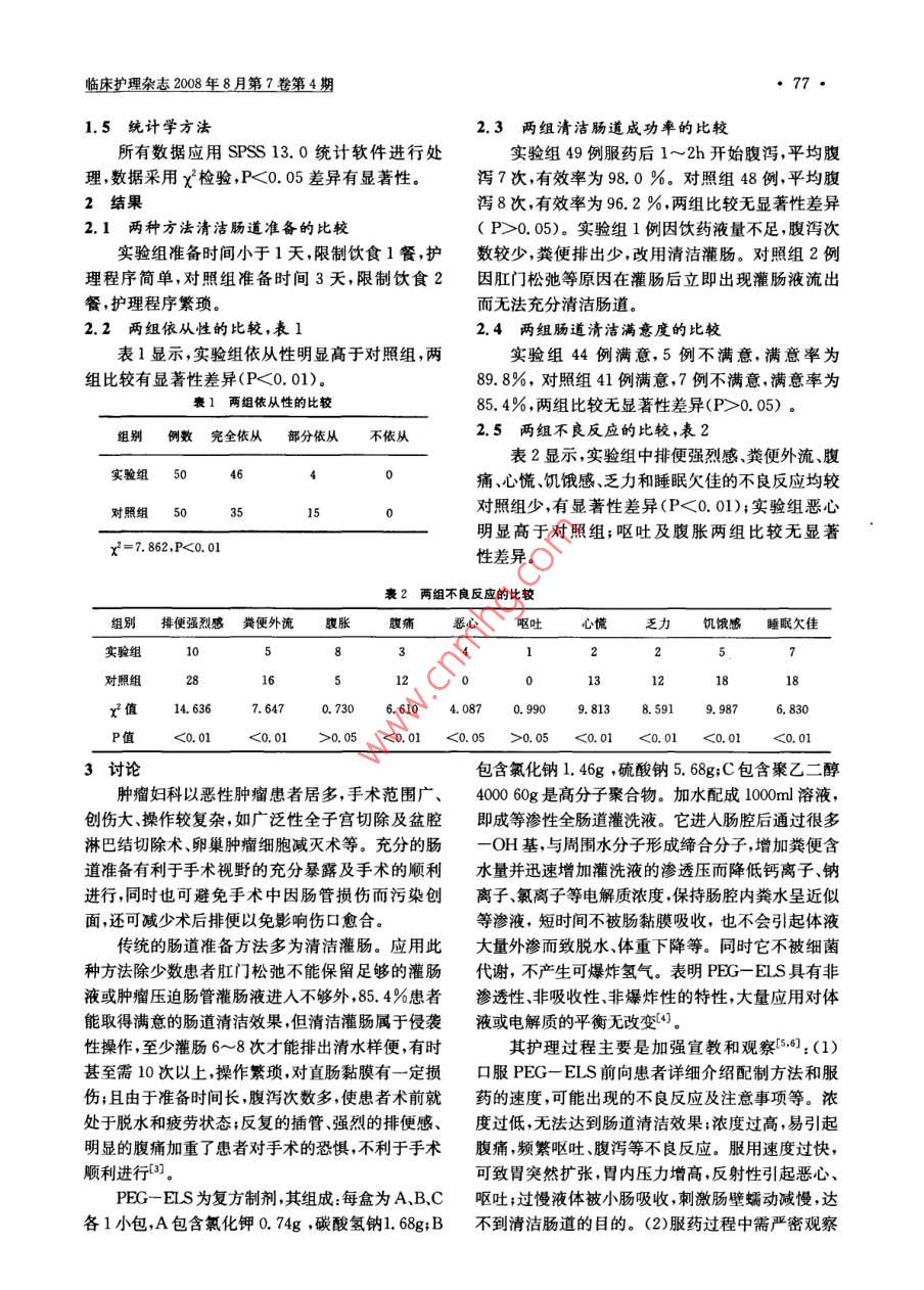 臨床護理雜志2008年8月第7卷第4期口服復(fù)方聚乙二醇電解質(zhì)散效果的觀察及護理徐安崴黃麗王敏張繼梅王寧摘要目的探討口服復(fù)方聚乙二醇電解質(zhì)散(PEG一ELS)代替腫瘤婦科術(shù)前清潔灌腸的可行性及護理。方法2006年12月~2008年2月,選擇100例術(shù)前需清潔灌腸的患者隨機分為實驗組50例,采用口服PEG-ELS,對照組50例采用清潔灌腸。通過患者末次排便或灌腸后末次排出物的性狀、術(shù)中腸管脹氣情況評價腸道準(zhǔn)備的效果;采用問卷法和觀察法比較兩組的依從性和不良反應(yīng)。結(jié)果清潔滿意度兩組比較無顯著性差異(P>0,05);實驗組依從性明顯高于對照組(P<0.01);實驗組排便強烈感、糞便外流、腹痛、心慌、饑餓感、乏力和睡眠欠佳的不良反應(yīng)較對照組少,有顯著性差異(P<0.01),嘔吐和腹脹兩組比較無顯著性差異。結(jié)論PEG一ELS是一種安全、有效、快速,護理程序簡單易被接受,能夠替代腫瘤婦科淸潔藿腸的腸道準(zhǔn)備藥物。關(guān)鍵詞婦科外科手術(shù)/護理;灌腸/護理;聚乙二醇電解質(zhì)散中圖分類號R713;R473.71;R975.3Key words gynecologic surgical procedures/ nursing; enema/nursing: polyethylene glycol electrolyte solution(PEG-ELS)婦科腫瘤普通經(jīng)腹手術(shù)基本不涉及腸道,但 PEG-ELS2~3盒(內(nèi)含AB、C各1包),將盒為避免充盈的腸道妨礙手術(shù)操作等原因,術(shù)前均內(nèi)各包藥粉一并倒入帶有刻度的杯中,加溫開水需灌腸,一般于術(shù)前晚及術(shù)日晨分別給肥皂水灌至2000~3000ml,攪拌使完全溶解。首次服用腸一次即可;但若惡性腫瘤手術(shù)較復(fù)雜或預(yù)計手600~1000ml,以后每隔10~15min服用1次,每術(shù)可能涉及腸道時則需清潔灌腸。傳統(tǒng)的清潔次250ml,密切觀察排出液性狀口3。對照組:術(shù)灌腸,存在一定弊端,因此,選擇一種理想的腸道前3天給予營養(yǎng)豐富少渣軟食,術(shù)前日中晚餐準(zhǔn)備方法在臨床上具有重要的意義。復(fù)方聚乙進流質(zhì)飲食,術(shù)前晚8時禁食,開始清潔灌腸,晚醇電解質(zhì)散(PEG一EIS)是一種新型的口服灌10時禁飲。第一次用0.1%~0.2%肥皂水灌腸劑,我科自2006年應(yīng)用以來取得了良好的效腸,以后用生理鹽水,根據(jù)患者情況灌人量每次果,對兩種不同的腸道準(zhǔn)備資料進行比較、分析,200~800ml,灌腸液溫度39~4l℃。術(shù)前晚現(xiàn)將結(jié)果報告如下。般灌洗3次,術(shù)日晨用相同方法灌洗至排出液清1資料與方法潔無糞便為止。灌腸過程中注意觀察病情變化,1.1一般資料如患者出現(xiàn)脈速、面色蒼白、出冷汗、劇烈腹痛等2006年12月~2008年2月在本科住院,術(shù)癥狀,立即停止灌腸并及時與醫(yī)生聯(lián)系。前需清潔灌腸的經(jīng)腹手術(shù)患者100例,年齡15~1.3觀察指標(biāo)78歲,平均52.2歲,隨機將其分為實驗組50例,采用問卷法和觀察法進行資料收集。手術(shù)對照組50例。所有患者術(shù)前均無消化道出血、前半小時由護理人員以問卷的形式從10個方面腸梗阻、腸穿孔、腸炎、腸扭轉(zhuǎn)等,也無嚴(yán)重全身觀察患者的胃腸道和全身不良反應(yīng),術(shù)中有2名性疾病如充血性心力衰竭、腎功能不全。兩組年手術(shù)者共同觀察腸管情況并進行評估齡、文化程度、家庭經(jīng)濟狀況、疾病嚴(yán)重程度、手1,4評定標(biāo)準(zhǔn)術(shù)范圍方面比較無明顯差異。1.4.1腸道準(zhǔn)備滿意的標(biāo)準(zhǔn)(1)服藥后末次1.2方法排便為水樣,無糞便或粘液;(2)手術(shù)日晨灌腸排實驗組:根據(jù)手術(shù)大小、性質(zhì)、是否涉及腸便為水樣,無糞便或粘液;(3)術(shù)中腸管無脹氣道,口服PEG一EIS2000~3000m。服用PEG-1.4.2胃腸道及全身不良反應(yīng)判斷標(biāo)準(zhǔn)輕ELS之前飲食均正常,于術(shù)前1天下午4時禁度:無全身不良反應(yīng),無腹痛,有惡心無嘔吐;中食,開始服藥,晚10時禁飲。具體配制如下:取度:輕度腹痛,排便后好轉(zhuǎn),有惡心無嘔吐;重度明顯腹痛,排便后仍感隱痛,有惡心、嘔吐,并出作者單位:233004蚌埠醫(yī)學(xué)院第一附屬醫(yī)院腫瘤婦科蚌埠現(xiàn)頭暈、面色蒼白、出冷汗等徐安嵐,女,1969年出生,本科,主管護師護士長臨床護理雜志2008年8月第?卷第4期771.5統(tǒng)計學(xué)方法2.3兩組清潔腸道成功率的比較所有數(shù)據(jù)應(yīng)用SPSS13.0統(tǒng)計軟件進行處實驗組49例服藥后1~2h開始腹瀉,平均腹理數(shù)據(jù)采用x檢驗P<0.05差異有顯著性瀉7次,有效率為98.0%。對照組48例,平均腹2結(jié)果瀉8次,有效率為96.2%兩組比較無顯著性差異2.1兩種方法清潔腸道準(zhǔn)備的比較(P>0.05)。實驗組1例因飲藥液量不足,腹瀉次實驗組準(zhǔn)備時間小于1天,限制飲食1餐,護數(shù)較少,糞便排出少,改用清潔灌腸。對照組2例理程序簡單,對照組準(zhǔn)備時間3天,限制飲食2因肛門松弛等原因在灌腸后立即出現(xiàn)灌腸液流出餐,護理程序繁瑣。而無法充分清潔腸道。2.2兩組依從性的比較,表12.4兩組腸道清潔滿意度的比較表1顯示,實驗組依從性明顯高于對照組,兩實驗組44例滿意,5例不滿意,滿意率為組比較有顯著性差異(P<0.01)89.8%,對照組41例滿意,7例不滿意滿意率為衰1兩組依從性的比較85.4%,兩組比較無顯著性差異(P>0.05)。組別例數(shù)完全依從部分依從不依從2.5兩組不良反應(yīng)的比較,表2表2顯示,實驗組中排便強烈感糞便外流、腹實驗組50痛、心慌、饑餓感、乏