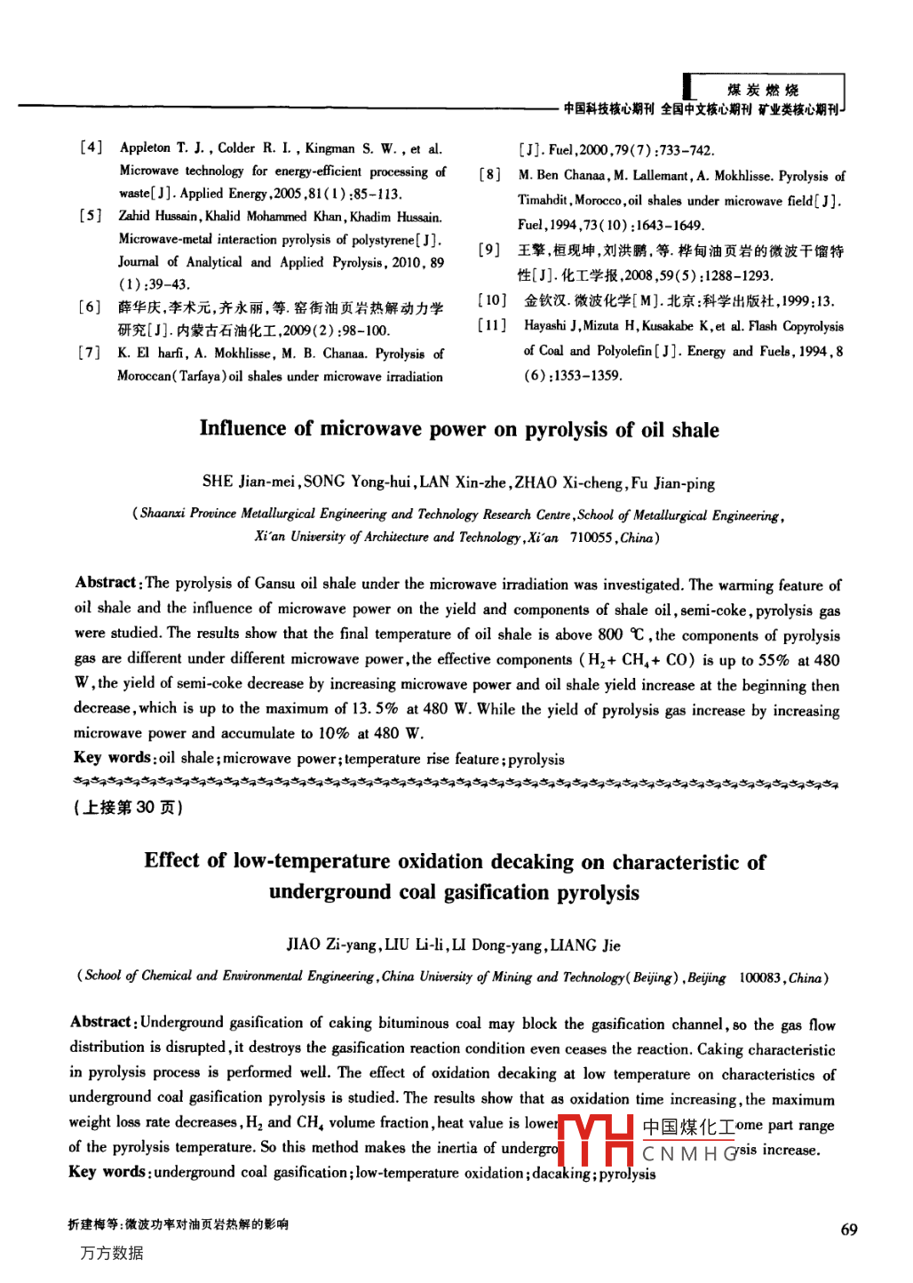 特化利用低溫氧化破粘對(duì)煤炭地下氣化熱解特性的影響焦子陽(yáng),劉麗麗,李冬陽(yáng),梁杰(中國(guó)礦業(yè)大學(xué)(北京)化學(xué)與環(huán)境工程學(xué)院,北京100083)摘要:粘結(jié)性煙煤在地下氣化過(guò)程中容易造成通道堵塞,氣流分布不均勻進(jìn)而導(dǎo)致地下氣化過(guò)程環(huán)境的惡化,使氣化反應(yīng)停止。粘結(jié)特性在熱解過(guò)程中表現(xiàn)得尤為突出,研究了低溫氧化破粘的方法對(duì)地下氣化熱解特性的影響。結(jié)果表明隨著氧化時(shí)間的增加,最大失重速率降低,煤氣中H2,CH4體積分?jǐn)?shù)以及熱值在部分熱解溫度區(qū)間均低于原煤,從而增加了煤炭地下氣化熱解惰性關(guān)鍵詞:煤炭地下氣化;低溫氧化;破粘;熱解中圖分類號(hào):TD841;TQ546文獻(xiàn)標(biāo)識(shí)碼:A文章編號(hào):1006-6772(2011)05-0028-03無(wú)論是煤的地面氣化還是地下氣化,熱解過(guò)程煙煤軟化熔融析出膠質(zhì)體,隨著反應(yīng)溫度的提高在地面氣化固定床中還是在地下氣化過(guò)程中,煤的開(kāi)始析出可燃性氣體如H2,CH4,在450℃時(shí)焦油的熱解對(duì)產(chǎn)品氣的組成有很大影響。氣化反應(yīng)開(kāi)析出量最大,同時(shí)有烴類氣體析出,550℃左右形始,即煤燃燒之前,首先是煤層受到熱產(chǎn)品氣的干成半焦,550℃以后半焦開(kāi)始收縮形成焦,干餾區(qū)的餾釋放出來(lái)的氣體隨氣流移動(dòng)到出氣口。煤層在熱分解產(chǎn)物對(duì)煤炭地下氣化過(guò)程中產(chǎn)品氣質(zhì)量的經(jīng)過(guò)煤的燃燒后進(jìn)入還原區(qū),由于還原區(qū)發(fā)生的是提高非常重要。對(duì)于煙煤破粘處理后的熱解行為吸熱反應(yīng),所以隨著反應(yīng)的進(jìn)行,后面的煤層溫度研究較少,筆者以地下氣化的熱解升溫速度研究了逐漸降低,最后干餾區(qū)的溫度約為200~600℃12),低溫氧化破粘對(duì)地下氣化熱解反應(yīng)的影響。該區(qū)域中煤層被干餾,并釋放出CH4等可燃?xì)怏w由于氣流的移動(dòng)方向與火焰的擴(kuò)展方向一致,干餾實(shí)驗(yàn)部分反應(yīng)得以持續(xù)進(jìn)行。同地面氣化的干餾過(guò)程一樣,1.1煤樣煙煤的地下氣化干餾過(guò)程發(fā)生在300℃以上,首先采用的煤樣是雞西煙煤,煤樣分析見(jiàn)表1和表2。表1工業(yè)分析和元素分析工業(yè)分析元素分析w(Hd)o(O)o(Sdat)1.2926.8021.0152.1984.935.367.501.370.84表2奧亞膨脹度和粘結(jié)指數(shù)軟化溫度t1℃開(kāi)始膨脹溫度l2/℃固化溫度b3/℃最大收縮度a%最大膨脹度b/%粘結(jié)指數(shù)G373418ha中國(guó)煤化工CNMHG收稿日期2011-05-12責(zé)任編輯:孫淑君作者簡(jiǎn)介:焦子陽(yáng)(1985-),男,山西忻州人,中國(guó)礦業(yè)大學(xué)(北京)化學(xué)工藝專業(yè)2008級(jí)在讀碩士研究生研究方向?yàn)闈崈裘杭夹g(shù)。《潔凈煤技術(shù)》201年第17卷第5期轉(zhuǎn)化利用中國(guó)科技核心期刊全國(guó)中文核心期刊礦業(yè)類核心期刊1.2氧化煤樣的制備表3不同氧化時(shí)間下破粘后熱重分析值氧化煤樣的制備是利用140℃、流量為25m3/h時(shí)間/最大失重大失重速/600℃終溫的熱空氣通過(guò)恒溫管式固定床反應(yīng)器進(jìn)行氧化,煤溫度/℃(%·min-1)剩余量/%樣粒度為2~5mm,制備出氧化時(shí)間分別為100,0(原媒)44.070.761875.39640,2920min的氧化煤樣,粘結(jié)指數(shù)G分別為66,439.440.473829,01.3熱重實(shí)驗(yàn)從圖1、圖2和表3可以看出,隨著破粘時(shí)間的增為了研究破粘對(duì)地下氣化熱解特性的影響首先加,煤樣在地下氣化熱解過(guò)程中,最大失重溫度變化不進(jìn)行了熱重實(shí)驗(yàn)。實(shí)驗(yàn)所用儀器為 Thermal Analys大,但是最大失重速率由原煤的0.7618%/min降至公司Q50TGA熱重分析儀;熱重分析條件:煤樣質(zhì)量0.4738%/min,降低了37.8%;同時(shí)在終溫600℃約10mg,粒徑小于0.074mm。起始溫度為室溫終剩余物的百分含量在不斷增加,因此破粘對(duì)地下氣溫600℃,地下氣化特有的升溫速度3.3℃/min,熱化熱解的影響是增加了煤的熱解惰性,使煤樣中的重保護(hù)氣N2,流量40 mL min,反應(yīng)氣人口處通入流揮發(fā)性物質(zhì)不易最終析出。速為60m/min的N2,壓力均為常壓。2.2熱解分析1.4熱解實(shí)驗(yàn)600℃前H2體積分?jǐn)?shù)變化如圖3所示將原煤和氧化煤樣磨碎到粒度為0.5~1mm,+0 min在箱式氣氛爐中進(jìn)行熱解,以地下氣化特有的升溫+100 min速度33℃/min進(jìn)行熱解反應(yīng),終溫為900℃,并-2920 min在200,300,400,500,600℃均收集氣體并進(jìn)入色譜進(jìn)行檢測(cè)。家爾址2實(shí)驗(yàn)結(jié)果與討論溫度/℃2.1熱重分析圖3600℃前H2體積分?jǐn)?shù)變化不同氧化時(shí)間下破粘煤樣TG和DTG曲線如圖由圖3可以看出,在地下氣化熱解過(guò)程中隨著1和圖2所示。不同時(shí)間下破粘后熱重分析結(jié)果見(jiàn)熱解溫度的升高,H2體積分?jǐn)?shù)均在增加但是經(jīng)過(guò)表3。不同時(shí)間低溫氧化處理后的煤樣,熱解煤氣中的H2體積分?jǐn)?shù)有所不同,其中在熱解溫度550~600℃之2920 min間,隨著破粘處理時(shí)間的增加,在相同的熱解溫度下H2溢出的體積分?jǐn)?shù)均呈現(xiàn)出低于原煤的趨勢(shì),640 min原煤這可能與破粘過(guò)程中煤中H元素受到O元素的攻擊有關(guān)0600℃前CH4體積分?jǐn)?shù)變化如圖4所示。溫度/℃4 100 min圖1不同氧化時(shí)間下破粘煤樣TG曲線+640 min64