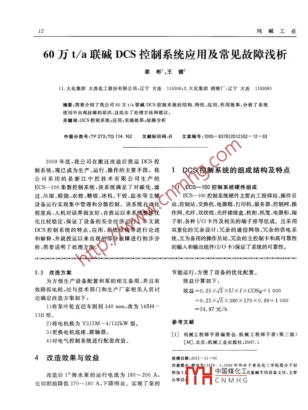 10純堿工業(yè)海水泵改造與節(jié)能運(yùn)行樊培節(jié),馬奉偉,畢寶正,費(fèi)立國(guó)(青島堿業(yè)股份有限公司,山東青島266043)摘要:通過(guò)理論計(jì)算、比較分析,并結(jié)合實(shí)踐經(jīng)驗(yàn),對(duì)泵的葉輪進(jìn)行切割,實(shí)現(xiàn)節(jié)能并保障生產(chǎn)運(yùn)關(guān)鍵詞:泵;葉輪切割;節(jié)能中圖分類(lèi)號(hào):TQ051.21文獻(xiàn)標(biāo)識(shí)碼:B文章編號(hào):1005-8370(2012)02-10-—0中需要按照不同的工況選擇設(shè)備匹配方式。當(dāng)單套1海水泵概況蒸吸系統(tǒng)運(yùn)行時(shí),開(kāi)1臺(tái)12SH-13A小泵就可以滿(mǎn)足流量和壓力要求;當(dāng)兩套蒸吸系統(tǒng)同時(shí)運(yùn)行時(shí),我公司現(xiàn)有2套干法加灰蒸吸系統(tǒng),配備3臺(tái)需要開(kāi)1臺(tái)大泵運(yùn)行或者開(kāi)2臺(tái)小泵并聯(lián)運(yùn)行。并聯(lián)運(yùn)行的冷卻用海水泵。1#海水泵(14SH-13)14海水泵的運(yùn)行電流為360~370A,而兩臺(tái)小泵的為大泵,流量1260m3/h、揚(yáng)程43.8m、電機(jī)功率運(yùn)行電流臺(tái)計(jì)為135A,由此開(kāi)大泵比開(kāi)小泵多用220kW;2*、3#海水泵(12SH-13A)為小泵,流量90A電流,造成電耗偏高,需要進(jìn)行改造。720m/h、揚(yáng)程26m、電機(jī)功率75kW。實(shí)際運(yùn)行2原因分析表1改造前海水泵性能參數(shù)表流量Q揚(yáng)程H轉(zhuǎn)數(shù)n功率N,kW額定電流效率η葉輪直徑葉輪名義直徑型號(hào)r/min軸功率電機(jī)功率AmmnIn97216414SH-13126035043.8147017740014764103718912SH-13A7502082614506114032231881078海水泵的性能參數(shù)如表1所示,14SH-13泵到26m的揚(yáng)程為43.8m,而12SH-13A泵揚(yáng)程為26m,差別很大。因?yàn)楹K到y(tǒng)入口背壓較高(0.15~3節(jié)能改造方案0.25MPa),12SH-13A泵的揚(yáng)程就能滿(mǎn)足要求V凵中國(guó)煤化工14SH-13泵出現(xiàn)了“水頭損失”的現(xiàn)象。另外,揚(yáng)3.1CNMHG程不一樣的泵在并聯(lián)系統(tǒng)中的效率很低,不利于泵有兩種方法可以降低泵的揚(yáng)程:一是降低泵的性能的發(fā)揮。因此需要將14SH-13泵的揚(yáng)程降低轉(zhuǎn)速,二是切割葉輪直徑。變頻調(diào)速和改變電機(jī)極2012年第2期樊培節(jié),等:海水泵改造與節(jié)能運(yùn)行對(duì)數(shù)都是降低轉(zhuǎn)速的有效方式,但是需要購(gòu)置變頻H器和電機(jī),改造費(fèi)用較高;若采取切割葉輪直徑的方H揚(yáng)程與葉輪直徑的平方成正比式,需要配上合適功率的電機(jī),因?yàn)楣拘」β孰姍C(jī)B-(B)功率與葉輪直徑的立方成正比,有庫(kù)存,不需要新購(gòu)置,所以改造費(fèi)用較低;因此我們選擇切割葉輪的方式。式中D1和D2分別為車(chē)削前、后的葉輪外徑;若對(duì)同一型號(hào)的泵換用直徑較小的葉輪而其軸功斷1、P1為泵在車(chē)削葉輪前的流量揚(yáng)程和3.2相關(guān)計(jì)算他幾何尺寸不變,這種現(xiàn)象稱(chēng)為葉輪的“切割”。根Q2、H2、P2為泵在車(chē)削葉輪后的流量、揚(yáng)程和據(jù)切割定律,當(dāng)葉輪直徑變化不大,而轉(zhuǎn)速不變軸功率。時(shí),葉輪直徑和流量、揚(yáng)程、軸功率之間的近似關(guān)系通過(guò)查找該泵生產(chǎn)廠家的樣本,我們發(fā)現(xiàn)該泵為:葉輪經(jīng)第一次切割(14SH-13A泵)后的性能參數(shù)如表2所示,因?yàn)閾P(yáng)程H=36m,仍然高于需要值8=B,流量與葉輪直徑的一次方成正比需要進(jìn)行第二次切割。表214SH-13A泵性能參數(shù)表流量Q揚(yáng)程H轉(zhuǎn)數(shù)功率N,kW額定電流效率n葉輪直徑葉輪名義直徑型號(hào)r/min軸功率電機(jī)功率A86424014SH-13A111290367133237030136因此將D1=410mm,Q1=1260m3/h,H1=0.11,而實(shí)際的43.8m,P1=177kW,H2=26m,代入上式得:D2D1-D2410-340=0,17,這樣使316mm,Q2=972P,=81 kw得泵的效率下降較大,因此選擇132kW的電機(jī)。因?yàn)槔碚撚?jì)算值與實(shí)際數(shù)據(jù)之間有差距,需要進(jìn)行修正。表3葉輪直徑的允許切劑量與比轉(zhuǎn)數(shù)ns的關(guān)系表1)根據(jù)實(shí)踐經(jīng)驗(yàn),葉輪直徑的實(shí)際切割量要按6060~120120~200200~300300~350照理論切割量的75%進(jìn)行切割,經(jīng)修正后的葉輪直D1-D20.20.150.110.090.07徑為340mm。2)根據(jù)葉輪直徑的允許切割量與比轉(zhuǎn)數(shù)ns的經(jīng)修正后葉輪第二次切割(14SH-13B泵)后關(guān)系(見(jiàn)表3)所示:n5=130時(shí)的允許值為的性能參數(shù)如表4所示表4改造后泵的性能參數(shù)表流量Q揚(yáng)程H轉(zhuǎn)數(shù)n功率NkW額定電流效率葉輪直徑葉輪名義直徑型號(hào)m/hL/sr/mn軸功率電機(jī)功率AmInmn14SH-13B9722701470235316YH中國(guó)煤化工CNMHG12純60萬(wàn)t/a聯(lián)堿DCS控制系統(tǒng)應(yīng)用及常見(jiàn)故障淺析姜彬,王健(1.大化集團(tuán)大連化工股份有限公司,遼寧大連116308;2.大化集團(tuán)硝銨廠,遼寧大連116308)摘要:簡(jiǎn)要介紹了我公司60萬(wàn)t/a聯(lián)堿DCS控制系統(tǒng)的結(jié)構(gòu)、特性、應(yīng)用、作用效果,分析了系統(tǒng)使用中出現(xiàn)故障的原因,且給出了處理方法和建議關(guān)鍵詞:DCS控制系統(tǒng);應(yīng)用;實(shí)施效果;故障分析中圖分類(lèi)號(hào):TP273;TQ114.162文獻(xiàn)標(biāo)識(shí)碼:B文章編號(hào):1005-8370(2012)02-12-032009年底,我公司在搬遷改造后投運(yùn)DCS控制系統(tǒng)現(xiàn)已成為生產(chǎn)、運(yùn)行操作的主要手段。我1Dcs控制系統(tǒng)的組成結(jié)構(gòu)及特