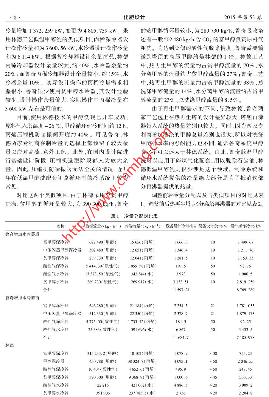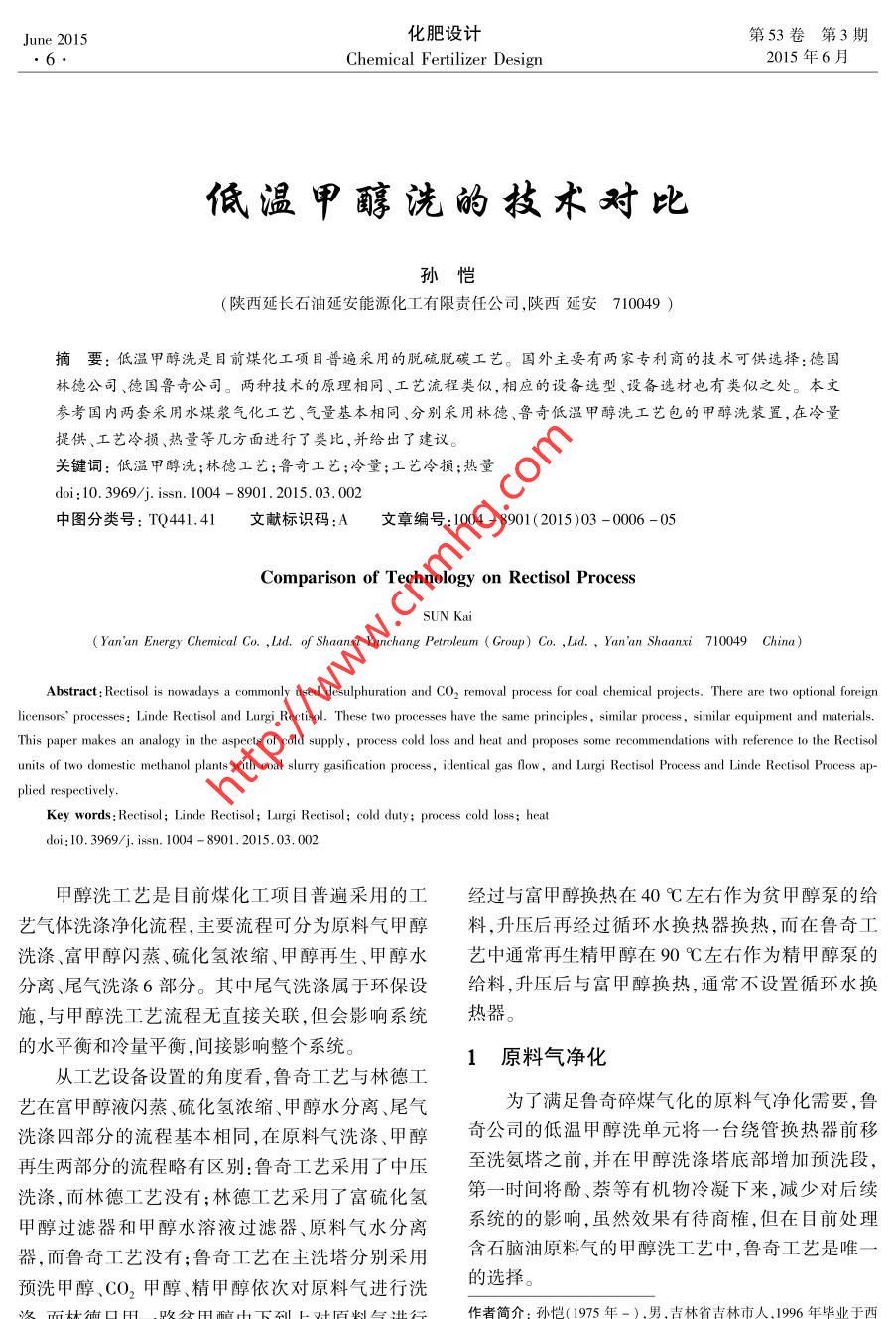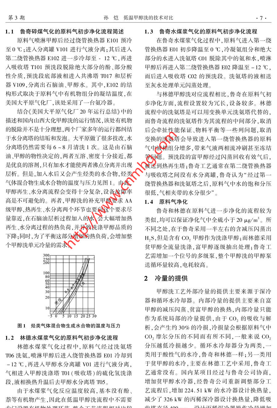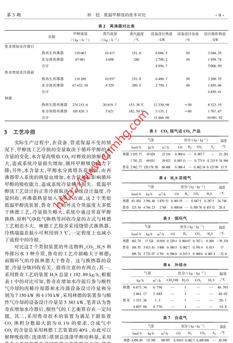 June 2015化肥設(shè)計第53卷第3期●6.Chemical Fertilizer Design2015年6月低溫甲醇洗的技術(shù)對比孫愷(陜西延長石油延安能源化工有限責(zé)任公司,陜西延安710049 )摘要:低溫甲醇洗是目前煤化工項目普遍采用的脫硫脫碳工藝。國外主要有兩家專利商的技術(shù)可供選擇:德國林德公司、德國魯奇公司。兩種技術(shù)的原理相同、工藝流程類似,相應(yīng)的設(shè)備選型、設(shè)備選材也有類似之處。本文參考國內(nèi)兩套采用水煤漿氣化工藝、氣量基本相同、分別采用林德、魯奇低溫甲醇洗工藝包的甲醇洗裝置,在冷量提供、工藝?yán)鋼p熱量等幾方面進(jìn)行了類比,并給出了建議。關(guān)鍵詞:低溫甲醇洗;林德工藝;魯奇工藝;冷量;工藝?yán)鋼p;熱量doi : 10.3969/j. issn. 1004 - 8901.2015. 03.002中圖分類號: TQ441.41文獻(xiàn)標(biāo)識碼:A文章編號:1004 - 8901 (2015)03 -0006 -05Comparison of Technology on Rectisol ProcessSUN Kai( Yan'an Energy Chemical Co. ,Ltd. of Shaanxi Yanchang Petroleum ( Group) Co. ,Ld.,Yan'an Shaanxi 710049 China)Abstract: Rectisol is nowadays a commonly used desulphuration and CO2 removal process for coal chemical projects. There are two optional foreignlicensors' proceses: Linde Rectisol and Lurgi Rectisol. These two processes have the same principles,simnilar process , similar equipment and materials.This paper makes an analogy in the aspects of cold supply ,process cold loss and heat and proposes some recommendations with reference to the Rectisolunits of two domestic methanol plants with coal slurry gasification process, identical gas flow, and Lurgi Rectisol Process and Linde Rectisol Process ap-plied respectively.Key words : Rectisol; Linde Rectisol; Lurgi Rectisol; cold duty; process cold loss; heatdoi:10. 3969/j. isn.1004 - 8901.2015.03.002甲醇洗工藝是目前煤化工項目普遍采用的工經(jīng)過與富甲醇換熱在40C左右作為貧甲醇泵的給藝氣體洗滌凈化流程,主要流程可分為原料氣甲醇料,升壓后再經(jīng)過循環(huán)水換熱器換熱,而在魯奇工洗滌、富甲醇閃蒸、硫化氫濃縮、甲醇再生、甲醇水藝中通常再生精甲醇在90C左右作為精甲醇泵的分離、尾氣洗滌6部分。其中尾氣洗滌屬于環(huán)保設(shè)給料,升壓后與富甲醇換熱,通常不設(shè)置循環(huán)水換施,與甲醇洗工藝流程無直接關(guān)聯(lián),但會影響系統(tǒng)熱器。的水平衡和冷量平衡,間接影響整個系統(tǒng)。從工藝設(shè)備設(shè)置的角度看,魯奇工藝與林德工1原料氣凈化藝在富甲醇液閃蒸、硫化氫濃縮、甲醇水分離、尾氣為了滿足魯奇碎煤氣化的原料氣凈化需要,魯洗滌四部分的流程基本相同,在原料氣洗滌、甲醇奇公司的低溫甲醇洗單元將一臺繞管換熱器前移再生兩部分的流程略有區(qū)別:魯奇工藝采用了中壓至洗氨塔之前,并在甲醇洗滌塔底部增加預(yù)洗段,洗滌,而林德工藝沒有;林德工藝采用了富硫化氫第一時間將酚、蔡等有機物冷凝下來,減少對后續(xù)甲醇過濾器和甲醇水溶液過濾器、原料氣水分離系統(tǒng)的的影響,雖然效果有待商榷,但在目前處理器,而魯奇工藝沒有;魯奇工藝在主洗塔分別采用含石腦油原料氣的甲醇洗工藝中,魯奇工藝是唯一預(yù)洗甲醇、CO2甲醇、精甲醇依次對原料氣進(jìn)行洗的選擇。滌,而林德只用一路貧甲醇由 下到上對原料氣進(jìn)行作者簡介:孫愷(1975年-),男,吉林省吉林市人, 1996年畢業(yè)于西安理工大學(xué)機加工工藝與設(shè)備專業(yè),高級工程師,現(xiàn)從事基礎(chǔ)設(shè)計洗滌,洗滌精度逐漸提高;林德工藝中再生貧甲醇審查、設(shè)備采購分級等工作。第3期孫愷低溫甲醇洗的技術(shù)對比1.1魯奇碎煤氣化的原料氣初步凈化流程簡述1.3魯奇水煤漿氣化的原料氣初步凈化流程原料氣噴淋甲醇后經(jīng)過繞管換熱器E101預(yù)冷在魯奇水煤漿氣化過程中,原料氣進(jìn)入第- -繞至0 C;進(jìn)入分離罐V101進(jìn)行氣液分離;其后進(jìn)入管換熱器E01初步降溫至0C,冷凝氨組分和絕大第二繞管換熱器E102進(jìn)- -步冷卻至- 12 C,再進(jìn)部分的水進(jìn)人洗氨塔C01脫除其中的氨和水,噴淋入吸收塔T101預(yù)洗段脫除絕大部分的酚、部分酸甲醇后再進(jìn)人第二繞管換熱器E02降溫至-12 C,性介質(zhì),預(yù)洗段底部液相進(jìn)人共沸塔T017和層析而后進(jìn)入吸收塔C02的預(yù)洗段。洗氨塔的液相送器V109,分離出石腦油、甲醇水。其中, E102的結(jié)至灰水處理單元閃蒸處理。構(gòu)形式取決于原料氣中有機物組分的凝結(jié)溫度,在與林德甲醇洗對應(yīng)流程相比,魯奇在原料氣初美國大平原氣化廠,該處采用了一臺氨冷器。步凈化方面,流程設(shè)置較為冗長,設(shè)備較多。林德結(jié)合《美國大平原氣化廠20 年運行總結(jié)》中的流程中的洗氨塔是可以用變換單元洗氨塔代替的,描述和國內(nèi)山西大化甲醇洗的運行情況,該處有機物而魯奇流程的洗氨塔作為其流程的中間部分,取消的脫除并不是十分理想,兩個廠家多年的運行都糾結(jié)后會牽扯性能保證、物料平衡等--些列問題,取消于水分離塔的結(jié)垢和發(fā)泡。大平原做了很多技改,水變換的洗氨塔會導(dǎo)致進(jìn)入第一- 繞管換熱器的原料分離塔仍然需要每6~8月清洗1次。這是由石腦氣中液相組分增多,帶來氣液兩相流沖刷甚至凍結(jié)油、甲醇的物性決定的,兩者互溶、密度十分接近,都等問題。預(yù)洗段的富甲醇經(jīng)過閃蒸回收有效氣后,是優(yōu)良