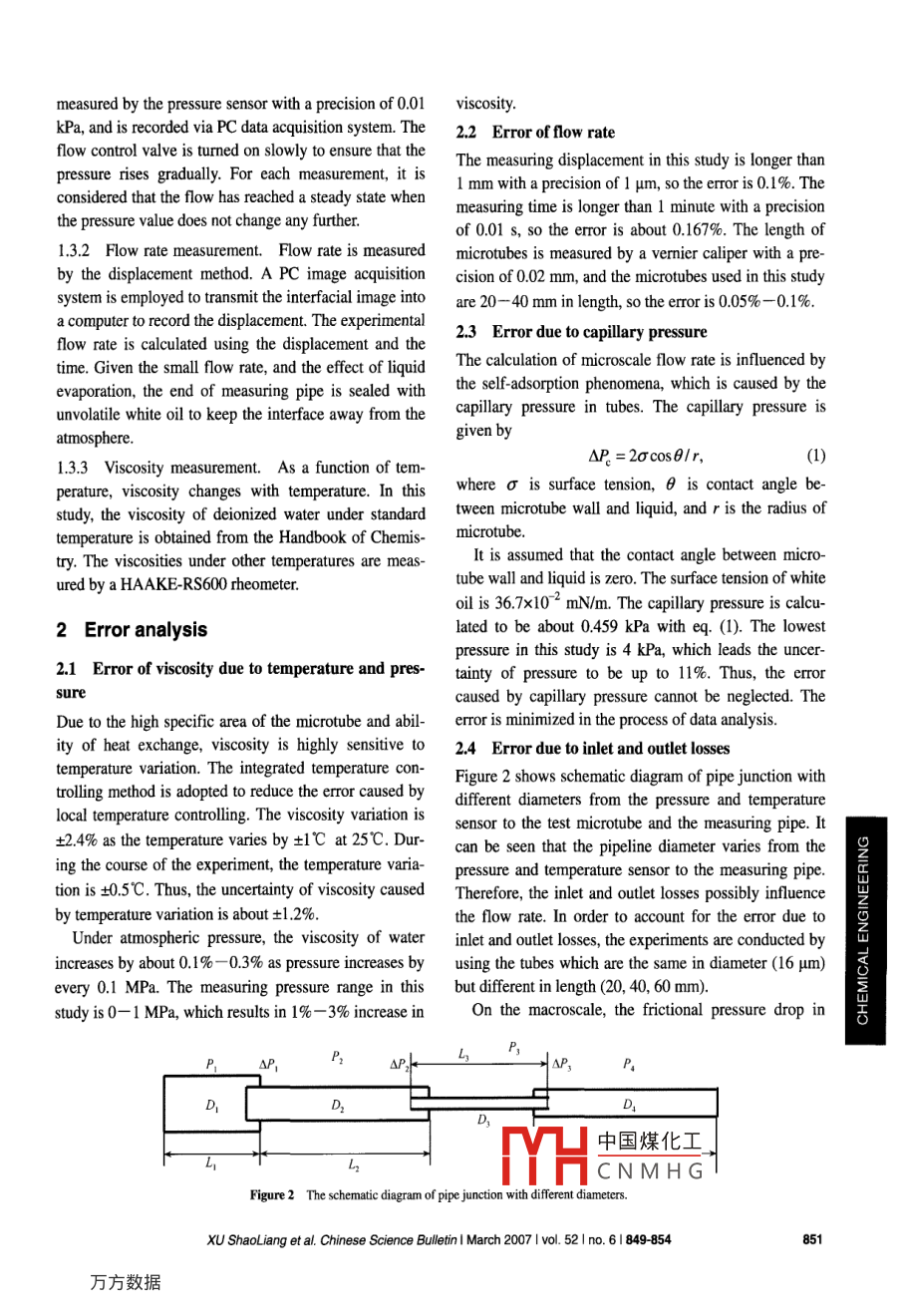 Chinese Science Bulletin◎2007》 Science in China Press包SningrVvetagExperimental investigation on flow characteristics ofdeionized water in microtubesXU ShaoLiang', YUE XiangAn & HOU JiRuiEnhanced 0il Recovery Research Center, China University of Petroleum, Beiing 102249, ChinaThe flow characteristics of deionized water in microtubes with diameters ranging from 2 to 30 μm areinvestigated. The experimental results show that the flow characteristics in microtubes with diametersof 16 μm and larger ones are in agreement with the classical theory. However, as the diameters are de-creased to 5 and 2 μm, the nonlinear flow characteristics prevail and the results indicate significantdeparture of flow characteristics from the predictions of the conventional theory, and the smaller thediameters, the larger the departure. As the Reynolds number increases, the degree of nonlinear flowcharacteristics decrease gradually and the experimental results are approximately equal to the theo-retical expectation. The minimum Reynolds number in this study is only 2.46x10-.microtubes, flow characteristics, microscale efect, fiction factor ratio, boundany layer fluidOver the past years, significant atention has been given toavailable experimental results are broken into two majorliquid flow on the microscale due to the incessant devel- groups: one is in agreement with conventional theoryopment of micro-electro-mechanical systems (MEMS).and the other deviates from it. Some experimental re-As the characteristic lengths are reduced to the same or-sults which are in agreement with classical theory arder of magnitude as the hydrodynamic boundary layershown as follows: Jiang et al.4l studied the variation ofthickness, the equations from the conventional theorythe Darcy friction factor with Reynolds number in mi-are not applicable any longer. Several effects such as thecrotubes with diameters ranging from 8 to 42 μm. Thesize effect and surface effect, which are normally ne-experimental results were in general agreement with theglected on the macroscale, become more and more im-predictions from conventional equations with range ofportant, and even become the dominant influencing fac-Reynolds number being 0.032- 26.1. Li et al.!3I studiedtors. The experiments on microscale flow of gases areexperimentally the flow characteristics of water andvery reproducible and consistent with the theoreticalseveral organic liquids in microtube which was about 25explanation. However, the microscale flow characteris-μm in diameter. They reported that the flow approxi-tics of liquids are much more complicated' because themately followed the Hagen-Poiseuille theory and theliquid is incompressible and the resistance caused byReynolds number was less than 8. Bucci et al!+ investi-viscosity is obvious. In addition, a number of influenc-gated the flow characteristics of water in microtubes5ing factors such as the intense momentum exchange, thewith diameters ranging from 172 to 520 um. Gan et al.5Tmolecular attraction and intermolecular interaction, andstudied the flow of water and methanol in microchannelthe liquid-solid interaction and adhesion also play im-with hydraulic diameter of 155.3 μm. Celata et al!6lportant roles in the microscale flow of liquids.Many researchers have conducted experiments on theRccived Seplember 13, 2006; aceped November 14, 2006flow of single-phase fluid in microchannels. The ex-doi: 10.1中國煤化工、tCorspperiments involved different test fluids and microchan-SuporedHC NMH Granof Chia (Grant No.ation of China (Grant No.50574060nels with different cross-sectional shapes. The current2002CCA00700)Www. scichina. com www.springerink. comChinese Science Bulletin I March 2007 1 vol, 52 Ino. 61 849-854studied the flow characteristics of water in microtubesmicroflow at low velocity, the liquid-solid interaction iswith diameters of 30- 326 μum. All these experimentalmuch stronger, which maybe enhances the microscaleresults were in rough agreement with the conventionaleffect. In this study, we carried out an experiment on thetheory.flow characteristics of deionized water in quartz micro-Some experimental results that deviate from the con-tubes with minimum diameter as small as 2 μm. Theventional theory are shown as follows: Pfahler et al.7minimum Reynolds number in this study was onlyconducted experimental studies on isopropanol in rec-2.46x10~, which enriches the experimental results. Thetangular microchannels which were approximately 100microscale flow effects are obtained and some newμm wide with depth less than 40 μum, finding the viscos-findings have been achieved.ity of liquid decrease. Mala and Lilsl investigated waterflow in microtubes made of fused silica and stainless1 Experimental apparatus and methodsteel, with the maximum Reynolds number reaching.1 Materials2500 and their results indicated that the relationship be-tween Reynolds number and pressure gradient deviatedThe microtubes used in this study are naturally fusedfrom predictions of conventional theory when the di-quartz microtubes (Polymicro Technology Company,ameter was less than 150 μm. Hao et al.'" investigatedUSA) with internal diameters of 30, 20, 16, 5 and 2 μm,water flow in trapezoidal silicon microchannel with arespectively. The working fluid is deionized water.hydraulic diameter of 237 μm, with the relationship be-1.2 Experimental apparatustween Reynolds number and pressure gradient deviatingThe experimental apparatus is shown in Figure 1. Thefrom the linear behavior and the deviation depending onapparatus consists of three parts: the power system, thethe Reynolds number.filter system and the measurement system. N2 from theAs can be seen from the experimental results men-compressed nitrogen gas tank flows through the flowtioned above, the conclusions are inconsistent under dif-control valve and enters the pressure-buffering reservoirferent experimental conditions. The size of micro-where it drives the deionized water to pass th