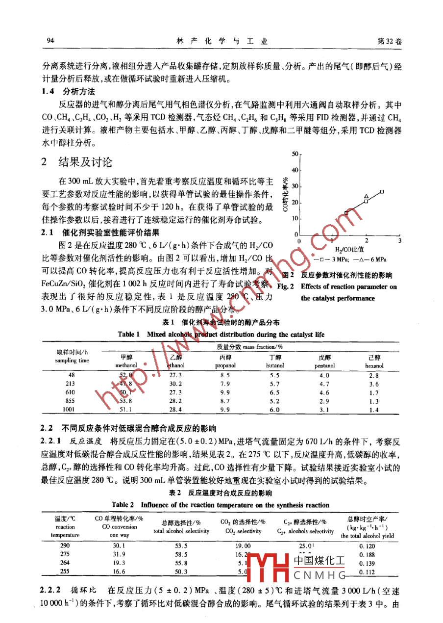 第32卷第3期林產化學與工業(yè)Vol 32 No. 32012年6月Chemistry and Industry of Forest ProductsJune 2012合成氣制低碳混合醇單管放大試驗的研究劉勇',陳楓',張為',寧文生2(1.合肥天焱綠色能源開發(fā)有限公司,安徽合肥230041;2.浙江工業(yè)大學化學工程與材料學院,浙江杭州310032)摘要:選擇生物質氣化制低碳混合醇作為開發(fā)對象,在實驗室完成了3mL級低碳混合醇合成催化劑的篩選工作和壽命考察,進行了催化劑的放大制備;并將選定的催化劑應用于300mL單管LIU Yong低礦醇合成裝置,考察反應溫度和循環(huán)比等對催化劑的C0轉化率、總醇合成收率和C醇選擇性的影響,對低碳醇合成工藝進行優(yōu)化,結果表明:試驗在壓力5MPa、溫度280℃和進塔氣流量3000Lh(空速100h-勹)條件下,CO轉化率達30%,總醇和C醇選擇性分別為50%和35%,總醇時空產率達0.215kg/(kg¨h)(相對于催化劑)。這為千噸級低碳醇合成中試奠定基礎。關鍵詞:生物質基合成氣;低碳醇合成;單管試驗中圖分類號:TQ35文獻標識碼:A文章編號:0253-2417(2012)03-0092-05Single-tube Amplification Test of Biomass- based SynthesIsGas to Prepare Mixed AlcoholsLIU Yong, CHEN Feng, ZHANG Wei, NING Wen-sheng(1. HeFei Tian Yan Green Energy Ltd. Co, Hefei 230041, China; 2. College of Chemical Engineering and Materials ScienceZheJiang Industy University, Hangzhou 310032, China)Abstract: The biomass-based synthesis gases was used to prepare mixed alcohols. In the mixed alcohols synthesis, the catalysta 300 mL single-tube alcohols synthesis device. The effects of reaction temperature, pressure and recycle ratio on the catalyticconversion of CO, total alcohol synthesis yield and C? alcohols selectivity was investigated. The alcohol synthesis process wasoptimized, too. The results showed that under the test condition of pressure 5 MPa, temperature 280C, the air rate 3 000L/hthe CO conversion was 30 % the total alcohols and C2. alcohols selectivity was 50 and 35 respectively. The space timeyield of the total alcohols was 0. 215 ke/(kg.h). All these tests were the foundation for kiloton alcohol synthesis processKey words: biomass-based synthesis gases; lower alcohols synthesis; single-tube test; mixed acohol隨著世界經濟的發(fā)展,對能源的需求日益增長。傳統的化石能源對環(huán)境的污染和資源的有限性,已普遍為人們所認知。開發(fā)利用清潔、低污染,可再生的綠色新能源已成為當今世界各國重大研究課題之。生物質能不僅安全、穩(wěn)定、可再生,而且可通過一系列技術生產不同品種的能源。在發(fā)達國家如美國、加拿大、瑞典等國已有產業(yè)化規(guī)劃和標準部分產品已商業(yè)化。我國在制定的《十二五新能源發(fā)展戰(zhàn)略規(guī)劃》中明確提到大力發(fā)展生物質能。我國是農業(yè)、林業(yè)的大國,生物質資源巨大,發(fā)展生物質能源對于減少石油進口,降低環(huán)境污染,有效的利用生物資源具有十分重要的意義。生物質制合成氣是生物質能利用的一個重要方面,利用它可以生產出許多化工產品,如:低碳混合醇汽油和柴油、石蠟、乙烯等。其中低碳混合醇是一種優(yōu)良的汽油添加劑,與汽油具有良好的相溶性可提高汽油的辛烷值,促進汽油的完全燃燒減小對環(huán)境的污染,可以替代汽油直接用于汽車,不需要改動汽車動力系統;低碳混合醇還可以進一步分離做化工原料。低碳混合醇是由合成氣H中國煤化工化反應合成的,CNMHG收稿日期:2012-03-19基金項目:國家863計劃資助(2009A05Z435)作者簡介:劉勇(1975-),男,山東棗莊人,高級工程師研究方向為生物質能Emal:nhy68@126.cm第3期劉合成氣制低碳混合醇單管放大試驗的研究93煤、天然氣和生物質都可以做為制備合成氣的原料,由于煤和天然氣是不可再生資源,而生物質是可再生的。因此開發(fā)以生物質為起始原料合成低碳混合醇的新工藝,并進一步實現工業(yè)化應用意義重大。本研究是在實驗室開發(fā)的 FeCuzn/SiO2催化劑及其在3mL級1000h穩(wěn)定壽命試驗的基礎上,進行了300mL催化劑的放大實驗,考察催化劑的放大效應,并將放大實驗的結果與實驗室小試結果進行比較,進一步優(yōu)化和改進催化劑制備和反應工藝條件,以期獲得具有實際工業(yè)應用價值的相關參數1411實驗1材料與儀器材料:甲醇,工業(yè)級純度99.95%;高純氮氣,9.9%;高純氫氣,9999%: e cuzn/SO2催化劑(自制);甲醇裂解氣,其組成約為66%H2、30%CO、3%CO2和0.4%CH4儀器:固定床管殼式單管反應器,采用自行制造的反應管(內管),其結構為60mm×25mmx1050m,套管中流動的高壓水與反應管進行換熱。甲醇裂解機,產氣量為3Nm/h,山西華泰為工程設備有限公司制造。色譜儀,GC-LTT,大連藍天中意儀器有限公司;CO、H2等永久性氣體分析采用5A分子篩填充柱,φ3mm(內徑)×3m;GCl12A(2臺),上海精密科學儀器有限公司;液態(tài)產品醇水分析采用水中醇柱,2m×3mmID;氣態(tài)烴分析采用毛細管色譜柱KB-AlO2/Na2S04,30m×0.32mmx10.00μm1.2催化劑實驗室評價性能采用沉淀浸漬方法制備 Fe Cuzn/SiO2催化劑,并在實驗室利用3mL小型固定床反應器評價催化劑性能,同時對該催化劑在1002h反應時間內的壽命試驗進行了考察。1.3單管試驗1.3.1試驗裝置及流程圖1為自制的300mL單管低碳混合醇試驗裝置的工藝流程示意圖。設有甲醇裂解制合成氣、合成氣壓縮機、低碳醇合成器、尾氣循環(huán)氣路、熱交換系統、產物分離系統等裝置。周0D山191.甲醇儲罐 methanol storage tank;2.預熱器 preheater;3.汽化器 gasifier;4.甲醇裂解機 methanol cracking machine;5.凈化