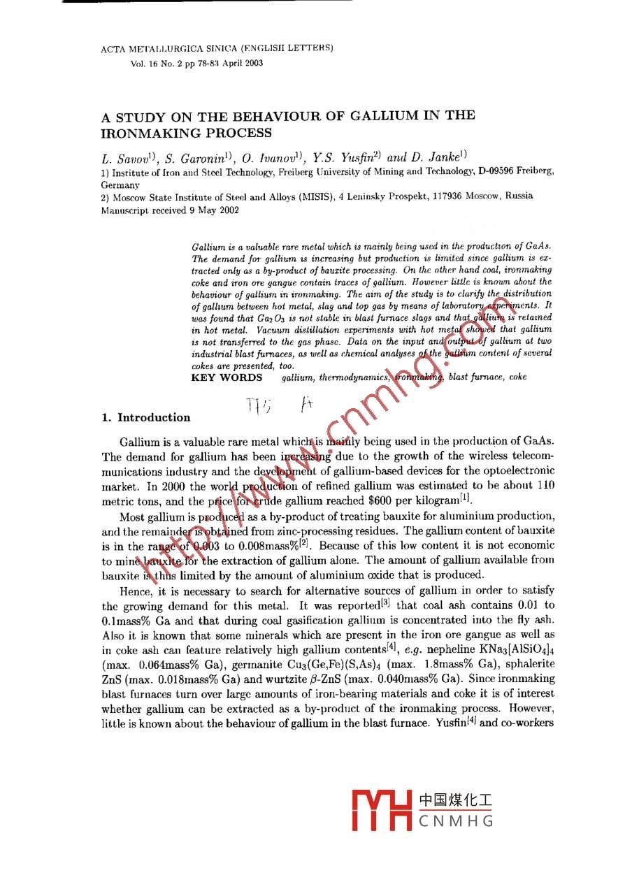 ACTA METALIJURGICA SINICA (ENGLII LETTERS)Vol. 16 No. 2 pp 78-83 April 2003A STUDY ON THE BEHAVIOUR OF GALLIUM IN THEIRONMA KING PROCESSL. Sao), S. Garonin), 0. Ioanov), Y.S. Yusfin2) ard D. Jankse)1) Istitte of Iron and Steel Technology, Freiberg Universty of Mining and Technology, D-09596 Freiberg,Germany2) Moscow State Institute of Steel and Alloys (MISIS), 4 Leninsky Prospekt, 117936 Moscow, RussiaManuscript received 9 May 2002The demand for gallum is increasing but production i8 limited since gallium is ex-tracted only as a by-product of bauxite processing. On the other hand coal, ironmakingcoke and iron ore gangue contain tmaces of galliun. However lttle is known about thebehaviour of gallium in ironmaking. The aim of the study ig to clarify the distributionof gllsum between hot metal, slag and top gas by means of laboratory erperimenls. Itwas found that Ga2O3 is not stable in blast furnace slags and that gllium is relarnedin hot metal. Vacum distillation erperiments with hot metal showed that galliumis not transferred to the gas phase. Data on the input and output of gallium at twoindustrial blast fumaces, as well as chemical analyses of the gallium content of severalcokes are presented, too.KEY WORDSgalium, thermodynamics, irnmaking, blast fumnace, cokeT151. IntroductionGallium is a valuable rare metal which is mainly being used in the production of GaAs.The demand for gallium has been increasing due to the growth of the wireless telecom-munications industry and the development of gallium-based devices for the optoelectronicmarket. In 2000 the world production of refined gallium was estinated to be about 110metric tons, and the price for crude gallium reached $600 per kilogram[4l.Most gallium is produced as a by-product of treating bauxite for aluminium production,and the remainder is obtained from zinc-processing residues. The gallium content of bauxiteis in the range of 0.003 to 0.008mass%l2. Because of this low content it is not economicto mine bauxite for the extraction of gallium alone. The amount of gallium available frombauxite is thus limited by the amount of aluminium oxide that is produced.Hence, it is necessary to search for alternative sources of gallium in order to satisfythe growing demand for this metal. It was reportedl3] that coal ash contains 0.01 to0.1mass% Ga and that during coal gasification gallimn is concentrated into the fty ash.Also it is known that sormne minerals which are present in the iron ore gangue as well asin coke ash can feature relatively high gallium contents(國, e.g. nepheline KNa3[AISiO4]4max.0.064mass% Ga), germanite Cug(Ge,Fe)(S,As)4 (max. 1.8mass% Ga), sphaleriteZnS (max. 0.018mnass% Ga) and wurtzite β ZnS (max. 0.040mass% Ga). Since ironmakingblast furnaces turn over largc amounts of iron-bearing materials and coke it is of interestwhether gallium can be extracted as a by-product of the ironmaking process. However,little is known about the behaviour of gallium in the blast furnace. Yusfin!4i and co-workers中國煤化工MYHCNMHG79determined the gllium input and output at two Russian blast furnace shops (Table 1).The industrial data show that almnost all of the gallium introduced into the blast furnaceis dissolved in hot metal, and only traces of galliuim are found in slag and dust. It shouldbe noted. too, that the glliumn content of blast furnace sludge is relatively high (Table 1).Table 1 Measured input and output of gallium in g/t material and g/t hot metal(HM), respectively, at blast furnaces in Russial4IronmakingInputOutputplantCokeSinterPelletsHot MetalSlag DustSludgeSeverstal5-10 70- 100 5- 7(*)60- 110 Max.2 Traces 150 - 250(ing/t HM) 2-5 60 - 1202- 360- 110 Traces Traces 1.5 - 3.0Tulachermet 30- 40 20 - 40 5- 10(**) 30- 80 Max.3 Traces Max.200(in g/t HM) 15-25 25- 50 .2- 530 - 80 Traces TracesMax.2Note: (*) 一Kostamuscba pellets; (**)一: Lebedinski pellets.One can expect that Ga and Al in the blast furnace behave in a similar way since theseelements are vertical neighbours in the IIA group of the Periodic Table. However theindustrial data in Table 1 show the opposite because it is well known that most aluminiumintroduced into the blast furnace is found as Al2O3 in the slag. Therefore the aim ofthe present study is to clarify the distribution of gallium between the products of theironmaking process: hot metal, slag and top gas, by means of laboratory experimentscarried out under defined conditions. Chemical analysis of various types of coke werecarried out, too, in order to check whether the gallium content varies strongly dependingon the coke.2. Physico-chemical Behaviour of Gallium at Elevated TemperaturesSome physical and thermal properties[5,6] of gallium are as follows: atormic number 31問,atomic weight 69.7235, melting point (m.p.) 29.76C51, boiling point (b.p.) 2204C5, den-sity: sol. at 29.69C 5.904g.cm - -3[5] and liq. at 29.89C 6.095g.cm -3[5, viscosity 1.94mPa.sl6]at m.p, 1.266mPasl5 at 200°C and 0.578mPa.sl5 at 11009C, enthalpy of fusion (at m.p.)80.2J.g -3[5, heat capacity (at 25C) 25.86J mol 1.K - 1例), thermal conductivity (at 27C)0.406W.cmn-1.K-16. Gallium is one of the few metals which can be liquid near roomtemperature and features the longest liquid range of any element. The vapour pressures ofgallium and several other metals as a function of temperature can be seen in Ref.[6]. .In its corpounds, the valency of gallium is usually 3. The monovalent state is unstable,although the monovalent gallium compounds Ga2O and GaCl can be isolated2. Liquidgallium oxidises rapidly and forms a protective layer of oxide. The oxygen compounds ofgallium resemnble those of aluninium in that there are bigh and low temperature formsof Ga2O3 and two hydroxides, Ga(OH)3 and GaO.0H. The melting point of Ga2O3 is1800°C171. It is evident from Ref.[7] that Ga2O3 is less stable than Al2O3 but more stablethan the oxides of other group IIA elements. Data in Ref.[7] also shows that Ga2O3 isreduced by carbon at temperatures higher than 