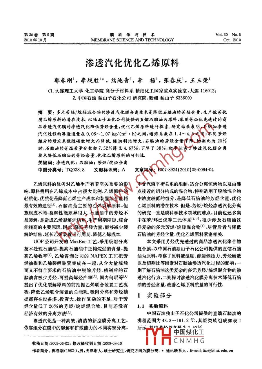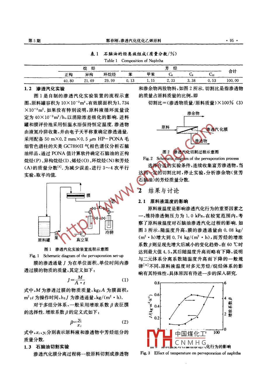 第30卷第5期膜科學(xué)與技術(shù)VoL 30 No. 52010年10月MEMBRANE SCIENCE AND TECHNOLOGYOct. 2010滲透汽化優(yōu)化乙烯原料郭春剛}(cāng),李戰(zhàn)勝'”,熊純青2,李楊', 張春慶',王玉榮'(1.大連理工大學(xué)化工學(xué)院高分子材料系精細(xì)化工國(guó)家重點(diǎn)實(shí)驗(yàn)室,大連116012;2.中國(guó)石油獨(dú)山子石化公司研究院,新疆獨(dú)子833600)摘要: 多元芳烴/烷烴混合物的滲透汽化膜分離技術(shù)是降低石腦油的芳烴含量,生產(chǎn)低芳優(yōu)質(zhì)乙烯原料的潛在技術(shù).以獨(dú)山子石化公司提供的直餾石腦油為原料,采用芳烴優(yōu)先透過的商品滲透汽化膜對(duì)滲透汽化降低芳烴含量,優(yōu)化乙烯原料進(jìn)行探索.研究結(jié)果表明,石腦油滲透汽化過程的滲透通量在0. 08~1.07 kg/(m2●h)之間,增濃系數(shù)在1.4~4.5之間;不同芳烴組分的增濃系數(shù)隨碳數(shù)增大而降低.隨切割比增大,石腦油的芳烴含量下降.切割比為20%時(shí),石腦油的芳烴質(zhì)量分?jǐn)?shù)由7. 52%降至4. 67%,下降了38%,初步證實(shí)了滲透汽化膜分離技術(shù)降低石腦油的芳烴含量,優(yōu)化乙烯原料的可行性.關(guān)鍵詞:滲透汽化;石腦油;芳烴/烷烴分離中圖分類號(hào): TQ028. 8文獻(xiàn)標(biāo)識(shí)碼: A文章編號(hào): 1007-8924(2010)05-0094-04乙烯原料的優(yōu)劣對(duì)乙烯生產(chǎn)有著至關(guān)重要的影不受汽液平衡關(guān)系的限制,適合分離恒沸物以及由沸響,原料費(fèi)用在乙烯成本中占很大比例,乙烯原料的點(diǎn)接近的組分構(gòu)成的混合物,特別適用于脫除混合物輕質(zhì)化、優(yōu)質(zhì)化是降低乙烯生產(chǎn)成本和裝置綜合能耗中濃度較低的組分是降低石腦油的芳烴含量,優(yōu)化最有效的途徑°。石腦油是主要的乙烯裂解原料,但乙烯原料的潛在技術(shù).但是,芳烴/烷烴滲透汽化分離族組成不同,裂解性能差異很大.石腦油中的芳烴不的研究- -直是膜科學(xué)技術(shù)領(lǐng)域的難點(diǎn),目前也還多集易裂解,是造成乙烯裂解爐結(jié)焦、生產(chǎn)周期縮短.綜合中在苯/環(huán)己烷等二元體系(6,7] ,很少涉及石腦油這能耗高的主要原因.因此,降低芳烴含量,能夠減少裂樣復(fù)雜的多元芳烴/烷烴混合物[8] ,盡管后者與降低解爐結(jié)焦,延長(zhǎng)乙烯裝置運(yùn)行周期,降低乙烯成本.石腦油的芳烴含量,優(yōu)化乙烯原料緊密相關(guān).UOP公司開發(fā)的MaxEne工藝,采用吸附分離本文采用芳烴優(yōu)先透過的商品滲透汽化聚合物技術(shù)處理石腦油,提高石腦油中正構(gòu)烷烴的含量,提復(fù)合膜,以中國(guó)石油獨(dú)山子石化公司提供的直餾石腦高乙烯收率[2].乙烯咨詢公司的NAPEX工藝把芳油為原料,考察了原料液溫度、滲透?jìng)?cè)壓力、芳烴碳數(shù)烴抽提和乙烯裂解裝置集成在一起,從含大量烷烴以及切割比等因素對(duì)石腦油滲透汽化過程的影響,一而又不符合要求的石腦油中脫除芳烴,精制后的石則了解石腦油這類復(fù)雜的多元芳烴/烷烴混合物的滲腦油含極少芳烴,可提高烯烴產(chǎn)率8.國(guó)內(nèi)何琨等[4]透汽化行為,二則探討滲透汽化膜分離技術(shù)降低石腦提出了優(yōu)化裂解原料的前抽提乙烯聯(lián)合裝置工藝流油的芳烴含量,改善乙烯原料質(zhì)量的可行性.程,降低乙烯聯(lián)合裝置的總能耗.吸附分離和芳烴抽1實(shí)驗(yàn)部分提都存在設(shè)備多、投資大、操作復(fù)雜的不足,對(duì)于芳烴含量低于20%的芳烴/烷烴混合物,目前還沒有1.1實(shí)驗(yàn) 原料經(jīng)濟(jì)有效的分離方法[5].中國(guó)石油獨(dú)山子石化公司提供的直餾石腦油的滲透汽化是- -種高效、清潔的新型膜分離工藝,沸程范圍為 43. 3~191.2 C,其烴類族組成如表1依靠組分在膜中的溶解和擴(kuò)散能力的不同實(shí)現(xiàn)分離,所中國(guó)煤化工收稨日期:2009 06-02;修改稿收到8期:2009-08-10YHCNMHG.作者簡(jiǎn)介:郭春剛(1982-),男,天津市人,碩士研究生,研究方向?yàn)槟し蛛x. *通訊聯(lián)系人,E-mail; lizs@dlut. edu. cn第5期郭春剛:滲透汽化優(yōu)化乙烯原料●95表1石腦油的烴類族組成(質(zhì)量分?jǐn)?shù)/%)Table 1 Composition of Naphtha烷烴芳烴合計(jì)正構(gòu)異構(gòu)環(huán)烷烴苯甲苯C。C140. 8021. 6929. 99.0.131. 152.330.53100. 001.2滲透汽化實(shí)驗(yàn)和滲余物兩股物料,如圖2所示切割比是指滲透物圖1是自制的滲透汽化實(shí)驗(yàn)裝置的流程示意的質(zhì)量占原料質(zhì)量的比例,即圖,原料罐容積為10X 10~*m3 ,有效膜面積為1.734切割比= (滲透物質(zhì)量/原料質(zhì)量) X100% (3)X 10-*m2.如果沒有特別說明,原料液循環(huán)流量設(shè)滲余物定為40X 10-3m3 /h,以消除濃差極化的影響.進(jìn)料罐和膜評(píng)價(jià)池采用恒溫水浴保持恒定溫度.滲透物原料滲透汽化膜由液氮冷阱收集,并由電子天平稱重確定滲透通量.采用配備50 mX0.2 mmX0.5 μm HP- PONA毛滲透物細(xì)管色譜柱的天美GC7890I1氣相色譜儀分析石腦油樣品,通過PONA值計(jì)算軟件確定石腦油的正構(gòu)圖2滲透汽化切割過程示意圖烷烴(P)、異構(gòu)烷烴(I)、烯烴(O)、環(huán)烷烴(N)和芳烴Fig. 2 Schematic diagram of the pervaporation process(A)的質(zhì)量分?jǐn)?shù)[].為減少誤差,進(jìn)行3~4次平行.選擇合適的實(shí)驗(yàn)條件,連續(xù)收集富芳滲透物,當(dāng)達(dá)到--定的切割比時(shí),停止實(shí)驗(yàn),分析滲余物(