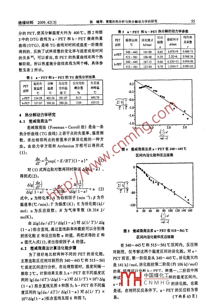 陳曦等:聚酯的熱分析與熱分解動力學的研究絕綠材料200,42(3聚酯的熱分析與熱分解動力學的研究陳曦,于欽學,任文娥,龍虹毓(西安交通大學電力設備電氣絕緣國家重點實驗室,西安710049)摘要:基于熱分析動力學理論,在單一升溫速率下采用差示掃描量熱法(DS)和熱重分析(TG)對兩種PET(a-PET和b-PET〕試樣在空氣中的熱解過程進行研究。通過考察DSC曲線得到兩種PET的玻璃化轉變溫度(T熔點(T。)、結晶溫度(T)和結晶度等得到結果:a-PET和b-PET的玻璃化轉變溫度分別為80.70℃和93.81℃,熔點分別為26141℃和260.31℃,結晶溫度分別為12828℃和229.59℃,結晶度分別為27.76%和31.17%。通過 Freeman-Carroll方法計算不同試樣各階段熱解反應的活化能、反應級數(shù)和指前因子。結果表明:PET有兩個主要的熱解階段,第一階段在340~45℃溫度區(qū)間中,a-PET的活化能、反應級數(shù)和指前因子分別為141.00k·mol和0.65、4.97E+9min';b-PET的活化能、反應級數(shù)和指前因子分別為167.128kJ/mol、0.39和433+1lmin';第二階段在515-561℃溫度區(qū)間內(nèi),a-PET的活化能反應級數(shù)和指前因子分別為10648kJ/mo、0.66和22E+6min-;b-PET的活化能、反應級數(shù)和指前因子分別為12304k/mo,0.70和1.05E+7minb關鍵詞:聚酯;熱分解; TG: DSC中圖分類號:TM2013;TM2014文獻標志碼A文章編號:1009-9239(200903-052-05Thermal Analysis and Thermal DecompositionKinetics of PolyesterCHEN Xi, YU Qin-xue, REN Wen-e, LONG Hong-yuState Key Laboratory of Electrical Insulation and Power equipment;Xi an Jiaotong University, Xi'an 710049, China)Abstract: Based on thermal analysis kinetics, differential scanning calorimetry (dSC)and thermo-gravimetric analysis(TGA)were employed to evaluate the thermal decomposition behaviors of twotypes of polyester(PET, a-PET and b-PET), in air atmosphere at a single heating rate of 10cmin.The glass transition temperature(T,), melting point temperature(T), crystal temperature(TO, crystallinity and some other parameters were obtained through DSC curves. The results areshown as follows: The t of a-pet and b-pet is 80 70c and 93 81respectively; the T. is261.41t and 26031t, respectively; T is 128 28c and 229 59C, respectively; and the crys.tallinity is 27. 76% and 31. 17%, respectively. moreover, the kinetic parameters like activationenergy, reactive index and pre-exponential factor were calculated and analyzed with Freeman-carrollmethod in every decomposition stage, respectively. The conclusions can be deduced that there aretwo main decomposition stages in different temperature sectors of thermal decomposition. The ac-tivation energy, reactive index and pre-exponential factor of a-PET are respectively 141. 00 kJ/mol0. 65 and 4.97E+9 min"; and those of b-PET are 167. 13 k /mol, 0. 39, 4. 33E+ ll min"individuallyduring the first stage (340-445 t)of thermal decomposition. In the second stage(515-561C)ofthermal decomposition, the activation energy, reactive index and pre-exponential factor of a-Petare 106. 48 kJ/mol 0.66 and 2. 2E+ 6 min", respectively; and those of b-PET are 123.04 kJ/mol0. 70, 1.05E+ 7 min"individually.Key words: polyester(PET); thermal decomposition:scanning calorimetry ( DSC)THCN MHG收稿日期:2008-11-17作者簡介:陳曦(1983-),女陜西西安人,博士生,主要從事絕綠材料檢測分析和空間電荷測量技術的研究,(電子信箱) xichen@mail. xjtu. edu.cne絕綠材料2009.42(3)陳曦等:聚酯的熱分析與熱分解動力學的研究1前言℃升至600℃,靜態(tài)空氣氣氛。陶瓷坩堝:70l熱分析是在程序控制溫度的條件下,測量物質(zhì)的物理性質(zhì)與溫度關系的一種技術。常用的熱分析3結果與分析技術,包括熱重(TG)、差示掃描量熱法(DSC)差3,1DSC分析熱分析(DTA)和熱機械分析(TMA),在熱分析中圖1為a-PET和b-PET的DSC圖譜。應用廣泛的有TG和DSC,前者是在程序控制溫度下,測量物質(zhì)的質(zhì)量與溫度關系的一種技術,后者b-PEr則是在程序控制溫度下測量輸入到試樣和參比物的能量差與溫度(或時間)關系的一種技術。熱分析動力學是用熱分析技術研究物質(zhì)的物理變化和化剖0學反應,借助一定的數(shù)學處理方法,獲得相應的反應動力學參數(shù)和反應機理函數(shù)-3。通過這種方法可以為物質(zhì)的熱降解、熱老化等熱性能提供有用的50100-15020參考數(shù)據(jù),廣泛應用在高分子材料的熱穩(wěn)定性研究T(℃)和壽命評估,具有理論和工程應用價值。聚對苯二甲酸乙二醇酯(聚酯,PET),它在較寬的溫度范圍圖1-PET和b-PET的DSC圖譜內(nèi)可以保持良好的物理性能、吸濕性能小、電絕緣如圖1所示,從a-PET試樣的DSC曲線可性能好等優(yōu)點,在生活和工程中應用十分廣泛N但知,在加溫過程中最先出現(xiàn)玻璃化轉變溫度T(80是在高溫環(huán)境中容易發(fā)生降解反應,導致材料本身℃),繼續(xù)升溫達冷結晶峰T!128℃),熔融峰T的絕緣性能下降。陳玉君等利用熱重-紅外光諧(260℃),熔體從290℃開始降溫,210℃開始結晶聯(lián)用的分析方法研究了PET的高溫穩(wěn)定性,王巍1放熱放熱達結晶峰T(200℃),在170℃以下沒用DSC方法研究了PET的熱性能, B Saha等m在有劇烈的反應。同理分析b-PET試樣。由DsC曲非等溫和等溫分解動力學研究中利用非模型動力線可知:學分析PET的動力學參數(shù),但對PET比較系統(tǒng)的a-PET的過熱程度熱分析和熱動力學研究目前比較少。本文通過對兩T過熱=110℃-80℃=30℃種不同厚度的PET試樣的TG曲線和DSC曲線的-PET的過冷程度研究分析,得出兩種試樣的失重、熱解特性和各個T過冷=260℃-200℃=60℃熱轉變溫度,并且通過 Freeman- carrol法得到試b-PET的過熱程度樣的活化能,對