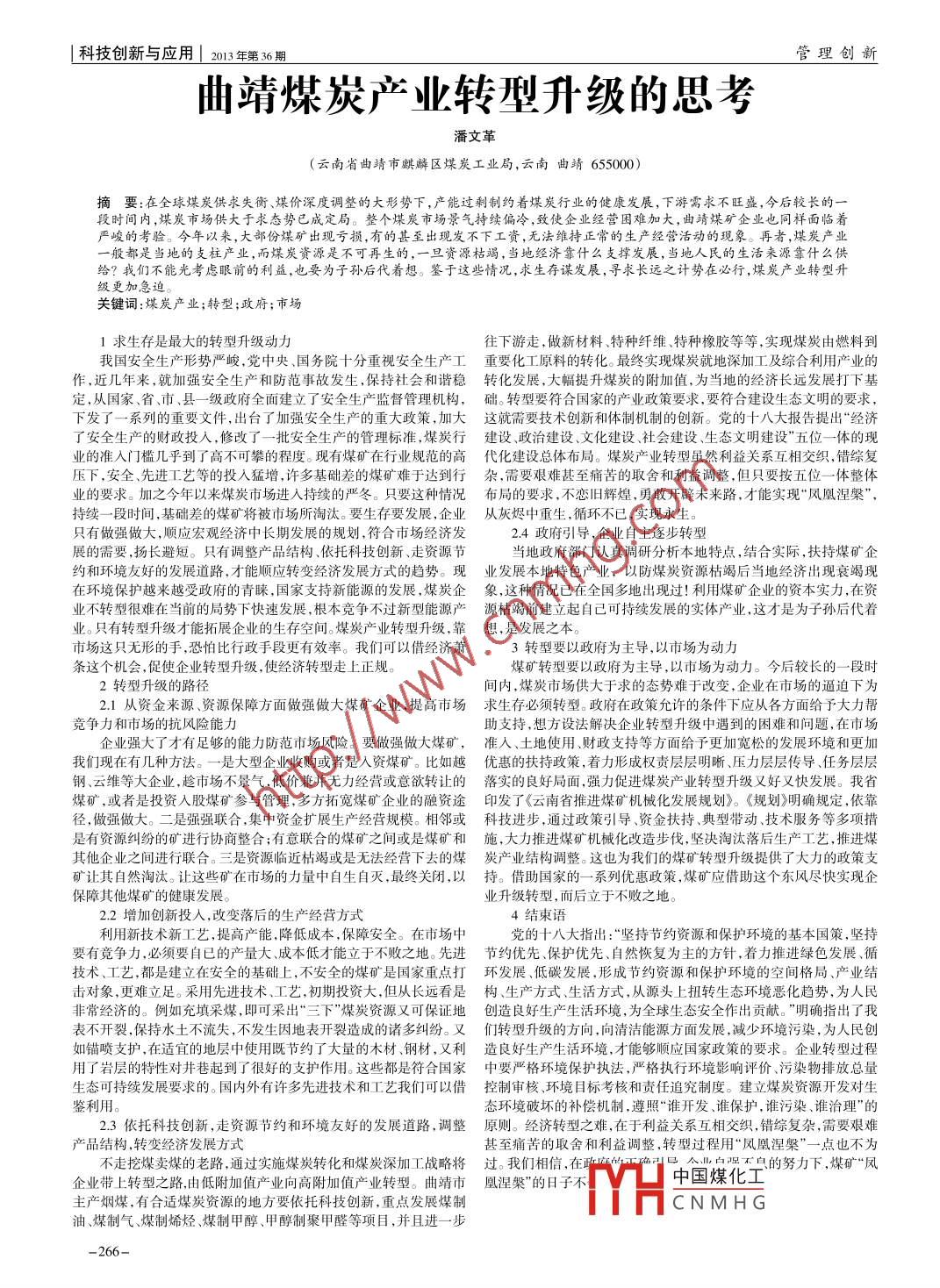 | 科技創(chuàng)新與應(yīng)用| 2013年第36期管理創(chuàng)新曲靖煤炭產(chǎn)業(yè)轉(zhuǎn)型升級的思考潘文革(云南省曲靖市麒麟?yún)^(qū)煤炭工業(yè)局,云南曲靖655000)摘要:在全球煤炭供求失衡、煤價深度調(diào)整的大形勢下,產(chǎn)能過剩制約著煤炭行業(yè)的健康發(fā)展,下游需求不旺盛,今后較長的一段時間內(nèi),煤炭市場供大于求態(tài)勢已成定局。整個煤炭市場景氣持續(xù)偏冷,致使企業(yè)經(jīng)營困難加大,曲靖煤礦企業(yè)也同祥面臨著嚴(yán)峻的考驗。今年以來,大部份煤礦出現(xiàn)虧損,有的甚至出現(xiàn)發(fā)不下工資,無法維持正常的生產(chǎn)經(jīng)營活動的現(xiàn)象。再者,煤炭產(chǎn)業(yè)一般都是當(dāng)?shù)氐闹еa(chǎn)業(yè),而煤炭資源是不可再生的,一旦資源枯竭,當(dāng)?shù)亟?jīng)濟靠什么支撐發(fā)展,當(dāng)?shù)厝嗣竦纳顏碓纯渴裁垂┙o?我們不能光考慮眼前的利益,也要為子孫后代著想。鑒于這些情況,求生存謀發(fā)展,尋求長遠(yuǎn)之計勢在必行,煤炭產(chǎn)業(yè)轉(zhuǎn)型升級更加急迫。關(guān)鍵詞:煤炭產(chǎn)業(yè);轉(zhuǎn)型;政府;市場1求生存是最大的轉(zhuǎn)型升級動力往下游走,做新材料、特種纖維、特種橡膠等等,實現(xiàn)煤炭由燃料到我國安全生產(chǎn)形勢嚴(yán)峻,黨中央、國務(wù)院十分重視安全生產(chǎn)工重要 化工原料的轉(zhuǎn)化。最終實現(xiàn)煤炭就地深加工及綜合利用產(chǎn)業(yè)的作,近幾年來,就加強安全生產(chǎn)和防范事故發(fā)生,保持社會和諧穩(wěn)轉(zhuǎn)化發(fā)展,大幅提升煤炭的附加值,為當(dāng)?shù)氐慕?jīng)濟長遠(yuǎn)發(fā)展打下基定,從國家、省市、縣--級政府全面建立了安全生產(chǎn)監(jiān)督管理機構(gòu),礎(chǔ)。轉(zhuǎn)型要符合國家的產(chǎn)業(yè)政策要求,要符合建設(shè)生態(tài)文明的要求,下發(fā)了一系列的重要文件,出臺了加強安全生產(chǎn)的重大政策,加大這 就需要技術(shù)創(chuàng)新和體制機制的創(chuàng)新。黨的十八大報告提出“經(jīng)濟了安全生產(chǎn)的財政投入,修改了-批安全生產(chǎn)的管理標(biāo)準(zhǔn),煤炭行建設(shè) 、政治建設(shè)、文化建設(shè)、社會建設(shè)、生態(tài)文明建設(shè)”五位一體的現(xiàn)業(yè)的準(zhǔn)人門檻幾乎到了高不可攀的程度?,F(xiàn)有煤礦在行業(yè)規(guī)范的高代化建設(shè)總體布局。煤炭產(chǎn)業(yè)轉(zhuǎn)型雖然利益關(guān)系互相交織,錯綜復(fù)壓下,安全、先進工藝等的投入猛增,許多基礎(chǔ)差的煤礦難于達到行雜,需要艱難甚至痛苦的取舍和利益調(diào)整,但只要按五位一體整體業(yè)的要求。加之今年以來煤炭市場進人持續(xù)的嚴(yán)冬。只要這種情況布 局的要求,不戀舊輝煌,勇敢開辟未來路,才能實現(xiàn)“鳳凰涅架”,持續(xù)一.段時間 ,基礎(chǔ)差的煤礦將被市場所淘汰。要生存要發(fā)展,企業(yè)從灰燼中重生 ,循環(huán)不已,實現(xiàn)永生。只有做強做大,順應(yīng)宏觀經(jīng)濟中長期發(fā)展的規(guī)劃,符合市場經(jīng)濟發(fā)2.4政府引導(dǎo),企業(yè)自主逐步轉(zhuǎn)型展的需要,揚長避短。只有調(diào)整產(chǎn)品結(jié)構(gòu)、依托科技創(chuàng)新、走資源節(jié)當(dāng)?shù)卣块T認(rèn)真調(diào)研分析本地特點,結(jié)合實際,扶持煤礦企約和環(huán)境友好的發(fā)展道路,才能順應(yīng)轉(zhuǎn)變經(jīng)濟發(fā)展方式的趨勢?,F(xiàn)業(yè)發(fā)展本地特色產(chǎn)業(yè),以防煤炭資源枯竭后當(dāng)?shù)亟?jīng)濟出現(xiàn)衰竭現(xiàn)在環(huán)境保護越來越受政府的青睞.國家支持新能源的發(fā)展,煤炭企象,這種情況已在全國多地出現(xiàn)過!利用煤礦企業(yè)的資本實力,在資業(yè)不轉(zhuǎn)型很難在當(dāng)前的局勢下快速發(fā)展,根本競爭不過新型能源產(chǎn)源枯竭前建立起自己可持續(xù)發(fā)展的實體產(chǎn)業(yè),這才是為子孫后代著業(yè)。只有轉(zhuǎn)型升級才能拓展企業(yè)的生存空間。煤炭產(chǎn)業(yè)轉(zhuǎn)型升級,靠想, 是發(fā)展之本。市場這只無形的手,恐怕比行政手段更有效率。我們可以借經(jīng)濟蕭3轉(zhuǎn)型要以政府為主導(dǎo),以市場為動力條這個機會,促使企業(yè)轉(zhuǎn)型升級,使經(jīng)濟轉(zhuǎn)型走上正規(guī)。煤礦轉(zhuǎn)型要以政府為主導(dǎo),以市場為動力。今后較長的一- 段時2轉(zhuǎn)型升級的路徑間內(nèi),煤炭市場供大于求的態(tài)勢難于改變,企業(yè)在市場的逼迫下為2.1從資金來源、資源保障方面做強做大煤礦企業(yè),提高市場求生存必須轉(zhuǎn)型。政府在政策允許的條件下應(yīng)從各方面給予大力幫競爭力和市場的抗風(fēng)險能力助支持,想方設(shè)法解決企業(yè)轉(zhuǎn)型升級中遇到的困難和問題.在市場企業(yè)強大了才有足夠的能力防范市場風(fēng)險。要做強做大煤礦,準(zhǔn)入、土地使用財政支持等方面給子更加寬松的發(fā)展環(huán)境和更加我們現(xiàn)在有幾種方法。- -是大型企業(yè)收購或者是入資煤礦。比如越優(yōu)惠的扶持政 策,著力形成權(quán)責(zé)層層明晰壓力層層傳導(dǎo)、任務(wù)層層鋼.云維等大企業(yè),趁市場不景氣,低價兼并無力經(jīng)營或意欲轉(zhuǎn)讓的落實的良好局面,強力促進煤炭產(chǎn)業(yè)轉(zh