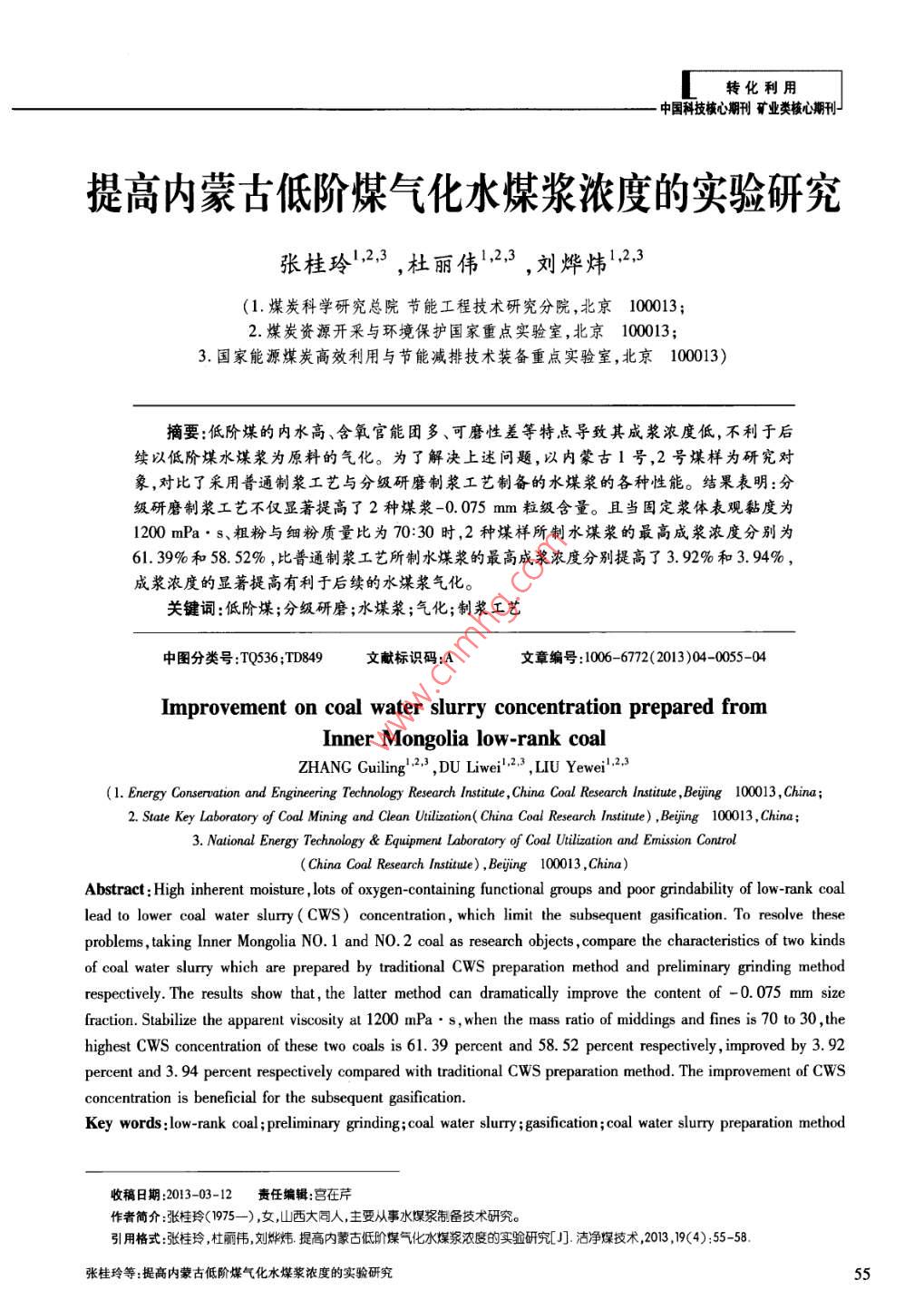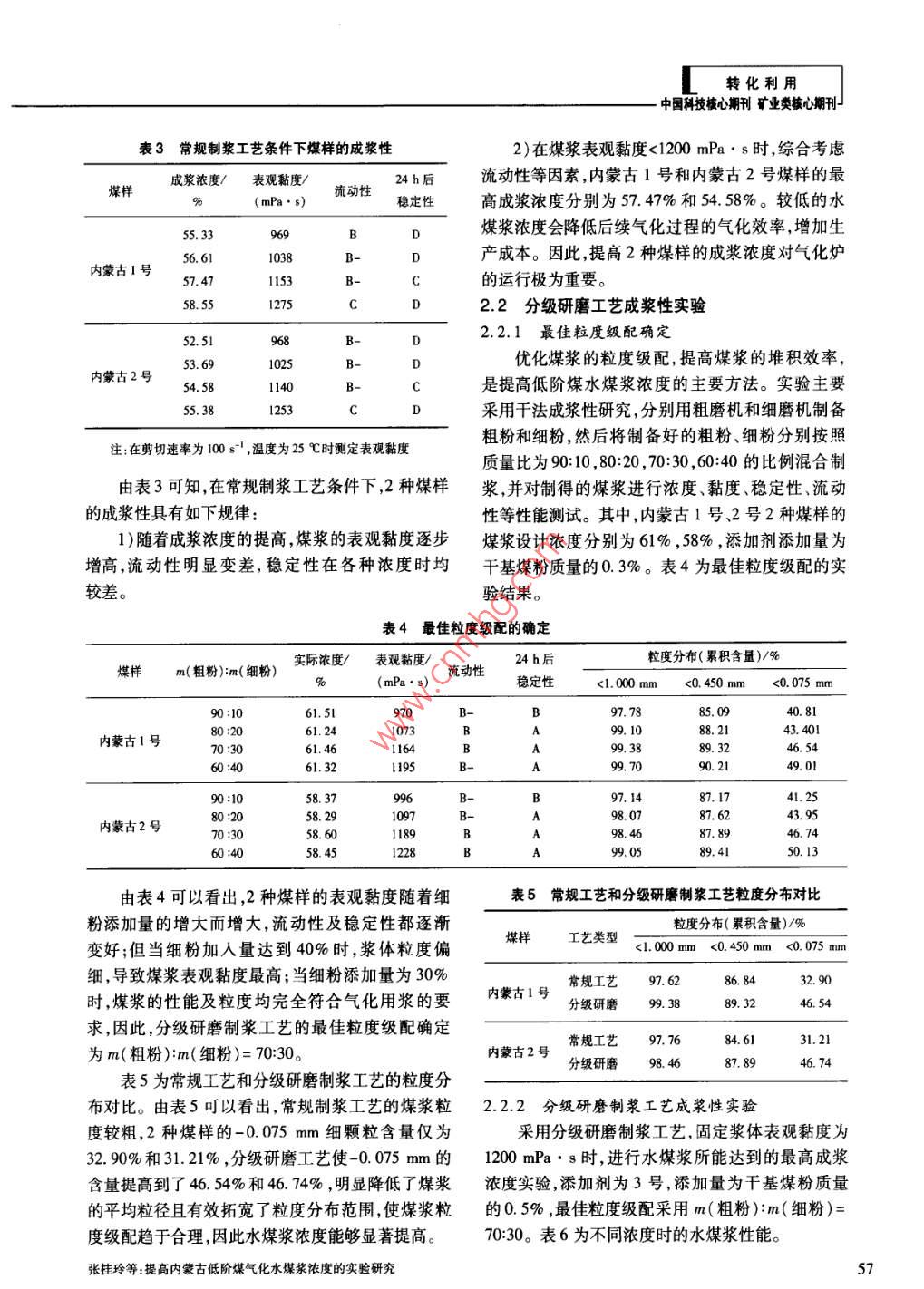 轉(zhuǎn)化利用中國科技核心期刊礦業(yè)類核心期刊提高內(nèi)蒙古低階煤氣化水煤漿濃度的實驗研究張桂玲123,杜麗偉123,劉燁煒123(1.煤炭科學(xué)研究總院節(jié)能工程技術(shù)研究分院,北京100032.煤炭資源開采與環(huán)境保護(hù)國家重點實驗室,北京100013;3.國家能源煤炭高效利用與節(jié)能減排技術(shù)裝備重點實驗室,北京10013)摘要:低階煤的內(nèi)水高、含氧官能團(tuán)多、可磨性差等特點導(dǎo)致其成漿濃度低,不利于后續(xù)以低階煤水煤漿為原料的氣化。為了解決上述問題,以內(nèi)蒙古1號,2號煤樣為研究對象,對比了采用普通制漿工藝與分級研磨制漿工藝制備的水煤漿的各種性能。結(jié)果表明:分級研磨制漿工藝不僅顯著提高了2種煤漿-0.075mm粒級含量。且當(dāng)固定漿體表觀黏度為1200mPa·s、粗粉與細(xì)粉質(zhì)量比為70:30時,2種煤樣所制水渫漿的最高成漿濃度分別為61.39%和58.52%,比普通制漿工藝所制水煤漿的最高成漿濃度分別提高了3.9%和3.94%,成漿濃度的顯著提高有利于后續(xù)的水煤漿氣化。關(guān)鍵詞:低階煤;分級研磨;水煤漿;氣化;制漿工藝中圖分類號:TQ536;TD849文獻(xiàn)標(biāo)識碼:A文章編號:1006-6772(2013)04-0055-04Improvement on coal water slurry concentration prepared fromInner Mongolia low-rank coalZHANG Guiling,2, 3, DU Liwei. 2. 3, LIU Yewei"2,3(1. Energy Conservation and Engineering Technology Research Institute, China Coal Research Institute, Beying 100013, China;2. State Key Laboratory of Coal Mining and Clean Utilization( China Coal Research Institute ), Beying 100013, China;3. National Energy Technology equipment Laboratory of Coal Utilization and Emission ControlChina Coal Research Institute), Beying 100013, China)Abstract: High inherent moisture, lots of oxygen-containing functional groups and poor grindability of low-rank coallead to lower coal water slurry( CwS)concentration, which limit the subsequent gasification. To resolve theseproblems, taking Inner Mongolia NO. 1 and NO. 2 coal as research objects, compare the characteristics of two kindsof coal water slurry which are prepared by traditional CWS preparation method and preliminary grinding methodrespectively. The results show that, the latter method can dramatically improve the content of -0 075 mm sizefraction. Stabilize the apparent viscosity at 1200 mPas, when the mass ratio of middings and fines is 70 to 30, theest CWS concentration of these two coals is 61. 39 percent and 58 52 percent respectively, improved by 3. 92ent and 3. 94 percent respectively compared with traditional CwS preparation method. The improvement of Cwsconcentration is beneficial for the subsequent gasificationKey words: low-rank coal; preliminary grinding; coal water slurry; gasification; coal water slurry preparation methd收稿日期:2013-03-12責(zé)任編輯:宮在芹作者簡介:張桂玲(1975-),女,山西大同人,主要從事水煤漿制備技術(shù)研究引用格式:張桂玲,杜廁偉,劉燁煒.提高內(nèi)蒙古低價煤氣化水煤漿濃鏖的實驗硏究[冂.潔凈煤技術(shù),2013,19(4):55-58張桂玲等:提髙內(nèi)蒙古低階煤氣化水煤漿濃度的實驗研究轉(zhuǎn)化利用中國低階煤(長焰煤、弱黏煤、不黏煤、褐煤等)為此,國家水煤漿工程技術(shù)研究中心開發(fā)了工資源豐富,用低階煤制漿不僅能以較低的價格保證藝流程簡單,不需對低階煤進(jìn)行改性,磨機能耗低制漿用煤的供應(yīng),提高水煤漿的經(jīng)濟(jì)性,而且符合的分級研磨制漿工藝,該工藝不僅可以提高低階煤國家合理利用煤炭資源的政策,是近年來制漿用煤水煤漿濃度,還可以改善低階煤的流動性和穩(wěn)定的主要研究方向。但由于低階煤具有內(nèi)水高、含氧性0目前該工藝已在中國東部沿海城市的燃官能團(tuán)多、可磨性差等特點,導(dǎo)致用常規(guī)制漿工藝料水煤漿廠以及北方的氣化行業(yè)得到應(yīng)用。制備的水煤漿濃度偏低。由于低濃度煤漿粒度偏由于不同低階煤種具有不同的研磨特性,因此粗且分布不合理,漿體流變性及霧化性能差,致使必須針對實驗用煤進(jìn)行分級研磨制漿工藝研究,以煤漿管道、泵、閥門、氣化爐噴嘴等磨損嚴(yán)重,氣化確定獲得最高制漿濃度的最佳粒度級配及粒度分煤耗和氧耗偏高,氣化效率降低,氣化運行成本布。為此,對2種內(nèi)蒙古低階煤進(jìn)行了分級研磨制增加。備高濃度氣化水煤漿的實驗研究為了提高低階煤水煤漿濃度,常釆用低階煤改性制漿工藝,但該工藝需要在制漿前對低階煤進(jìn)行1實驗熱力脫水提質(zhì)改性,以降低內(nèi)水及含氧官能團(tuán)含1.1原料煤性質(zhì)量使低階煤的成漿性提高9,這不僅增加了改性表1為2種內(nèi)蒙古低階煤的工業(yè)分析和元素裝置的投資和熱能消耗,還使工藝變得復(fù)雜。分析。表1內(nèi)蒙古低階煤的工業(yè)分析和元素分析工業(yè)分析/%元素分析/%煤種a0(C。)內(nèi)蒙古1號15.6014.2628.3126.450.28內(nèi)蒙古2號20.3320.3315.7730.020.3049.043.2010.16由表1可以看出,2種煤均屬于低硫、高內(nèi)水實驗采用干法制漿。將磨好的煤粉、定量添加高氧含量、高揮發(fā)分的低階煤,OC比都較高,分別劑和水加入燒杯中,用J-1型定時電動攪拌器攪拌為0.23和0.21,因而用常規(guī)制漿工藝很難制備高6min即得水煤漿。將制備好的水煤漿進(jìn)行表觀黏濃度水煤漿。度、濃度測試,并妥善保存,之后進(jìn)行流變性、流動1.2實驗儀器和方法性、穩(wěn)定性測試。水煤漿濃度、黏度的測定分別按表2為實驗用儀器。照GBT18856.2-2008《