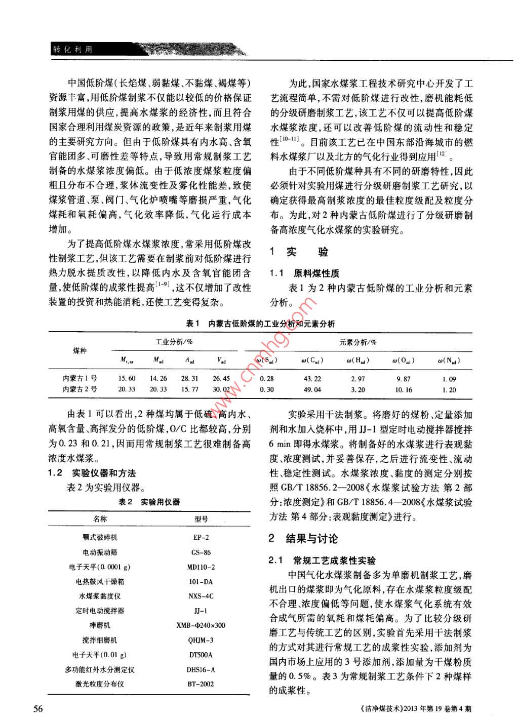 提高內(nèi)蒙古低階煤氣化水煤漿濃度的實驗研究