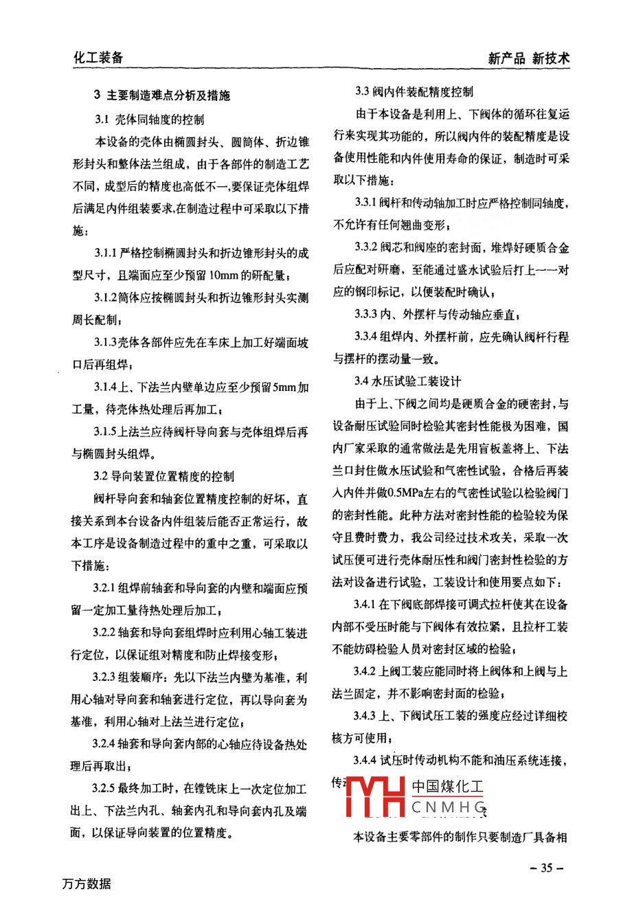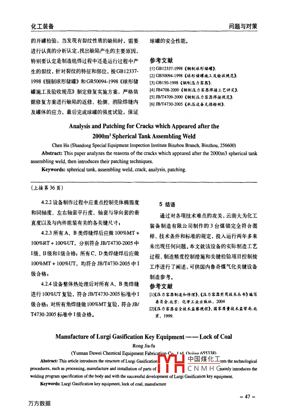 化工裝備新產(chǎn)品新技術(shù)魯奇煤氣化關(guān)鍵設(shè)備一煤鎖的制造戎加富(云南大為化工裝備制造有限公司,曲靖655338)摘要:根據(jù)魯奇煤氣化關(guān)鍵設(shè)備-- 煤鎖的主要設(shè)計參數(shù)及制造實踐,論述了該設(shè)備的主要制造工藝、檢驗和試驗要點,并對該設(shè)備的制造難點及解決方法、措施,按工序做了詳細(xì)的闡述。關(guān)鍵詞:魯奇煤氣化關(guān)鍵設(shè)備煤鎖制造檢驗2.1設(shè)備結(jié)構(gòu)示意圖(見圖1)1前言近年來,雖然殼牌煤氣化技術(shù)得到了較大推2.2設(shè)備主要設(shè)計參數(shù)表(見表1)廣,但魯奇加壓氣化技術(shù)作為目前世界上最成熟可靠、應(yīng)用數(shù)量最多的氣化工藝之一,它具有投1資及營運(yùn)成本低、碳轉(zhuǎn)化率高、煤種適用范圍廣.15等諸多優(yōu)點,在國內(nèi)外煤化工領(lǐng)域得到了廣泛應(yīng)用。例如,我國的中煤龍化公司(原哈爾濱氣化廠)、山西化肥廠和云南解化公司等。據(jù)多家在役設(shè)備的操作人員反映,魯奇加壓氣化技術(shù)現(xiàn)已較成熟,操作也很簡單,但由于國內(nèi)裝備制造廠對山d:1_該系統(tǒng)關(guān)鍵設(shè)備一煤鎖的制造精度較低, 在實際使用過程中其傳動機(jī)構(gòu)和閥門經(jīng)常出現(xiàn)異常導(dǎo)致單臺爐停車,如國內(nèi)某資深化工裝備制造廠幾.年前制作的2臺煤鎖,因內(nèi)件質(zhì)量問題至今仍難收1-設(shè)備法蘭: 2-下閥座: 3-下法蘭, 4-下閥芯;回貨款,給業(yè)主和制作廠帶來了不應(yīng)有的損失。s-.三向鍛件接頭; 6-折邊錐形封頭: 7一閥桿: 8-支架;本文將重點闡述云南大為化工裝備制造有限公9-簡體: 10-導(dǎo)向套: 11-內(nèi)擺桿, 12 -軸套;13-傳動軸14-防護(hù)裝置: 15-橢圓封頭16-上閥托架司制造煤鎖時的一些經(jīng)驗,供相關(guān)業(yè)者借鑒和參考。17-上法蘭,18-上閥座: 19-上閥芯圖1煤鎖結(jié)構(gòu)示意圖2煤鎖簡介表1煤鎖主要設(shè)計參數(shù)表設(shè)計壓力設(shè)計溫度介質(zhì)工作壓力工作溫度腐蝕裕量液壓試驗壓力(MPa)('C)(C)(mm)煤+粗堞氣3.33500~3.02404.66(中度危害,易燃)熬處理焊接接頭系數(shù)容器類別全容積(m)疵勞壽命(次)|簡體內(nèi)徑(m)簡體壁厚(mm)要求二類16.5中國煤化工δ.601、《壓力客器安全技術(shù)監(jiān)察規(guī)程》fHC N M H GB6641696標(biāo)準(zhǔn)規(guī)范2. JB4732-95 《鋼制壓力容器一20MnMo皿(調(diào)質(zhì)) JB4726 2000分析設(shè)計標(biāo)準(zhǔn)》-34-化工裝備新產(chǎn)品新技術(shù)3主要制造難點分析及措施3.3閥內(nèi)件裝配精度控制3.1殼體同軸度的控制由于本設(shè)備是利用上、下閥體的循環(huán)往復(fù)運(yùn)本設(shè)備的殼體由橢圓封頭、圓簡體.折邊錐行來實現(xiàn)其功能的,所以閥內(nèi)件的裝配精度是設(shè)形封頭和整體法蘭組成,由于各部件的制造工藝備使用性能和內(nèi)件使用壽命的保證,制造時可采不同,成型后的精度也高低不-,要保證殼體組焊取以下措施: .后滿足內(nèi)件組裝要求,在制造過程中可采取以下措3.3.1閥桿和傳動軸加工時應(yīng)嚴(yán)格控制同軸度,施:不允許有任何翹曲變形,3.1.1嚴(yán)格控制橢圓封頭和折邊錐形封頭的成3.3.2 閥芯和閥座的密封面,堆焊好硬質(zhì)合金型尺寸,且端面應(yīng)至少預(yù)留10mm的研配量;后應(yīng)配對研磨,至能通過盛水試驗后打上一--對3.1.2簡體應(yīng)按橢圓封頭和折邊錐形封頭實測應(yīng)的鋼印標(biāo)記,以便裝配時確認(rèn):周長配制;3.3.3內(nèi)、外擺桿與傳動軸應(yīng)垂直,3.1.3殼體各部件應(yīng)先在車床上加工好端面坡3.3.4組焊內(nèi)、外擺桿前,應(yīng)先確認(rèn)閥桿行程口后再組焊;與擺桿的擺動量-致。3.1.4上、下法蘭內(nèi)壁單邊應(yīng)至少預(yù)留5mm加3.4水壓試驗工裝設(shè)計工量,待殼體熱處理后再加工,由于上、下閥之間均是硬質(zhì)合金的硬密封,與3.1.5.上法蘭應(yīng)待閥桿導(dǎo)向套與殼體組焊后再設(shè)備耐壓試驗同時檢驗其密封性能極為困難,國與橢圓封頭組焊。內(nèi)廠家采取的通常做法是先用盲板蓋將上、下法3.2導(dǎo)向裝置位置精度的控制蘭口封住做水壓試驗和氣密性試驗,合格后再裝閥桿導(dǎo)向套和軸套位置精度控制的好壞,直入內(nèi)件并做0.5MPa左右的氣密性試驗以檢驗閥門接關(guān)系到本臺設(shè)備內(nèi)件組裝后能否正常運(yùn)行,故的密封性能。此種方法對密封性能的檢驗較為保本工序是設(shè)備制造過程中的重中之重,可采取以守且費(fèi)時費(fèi)力,我公司經(jīng)過技術(shù)攻關(guān),采取- -次下措施:試壓便可進(jìn)行殼體耐壓性和閥門密封性檢驗的方3.2.1組焊前軸套和導(dǎo)向套的內(nèi)壁和端面應(yīng)預(yù)法對設(shè)備進(jìn)行試驗,工裝設(shè)計和使用要點如下:留一定加工量待熱處理后加工,3.4.1在下閥底部焊接可調(diào)式拉桿使其在設(shè)備3.2.2軸套和導(dǎo)向套組焊時應(yīng)利用心軸工裝進(jìn)內(nèi)部不受壓時能與下閥體有效拉緊,且拉桿工裝行定位,以保證組對精度和防止焊接變形,不能妨礙檢驗人員對密封區(qū)域的檢驗;3.2.3組裝順序:先以下法蘭內(nèi)壁為基準(zhǔn),利3.4.2. 上閥工裝應(yīng)能同時將上閥體和上閥與上用心軸對導(dǎo)向套和軸套進(jìn)行定位,再以導(dǎo)向套為法蘭固定, 并不影響密封面的檢驗,基準(zhǔn),利用心軸對上法蘭進(j