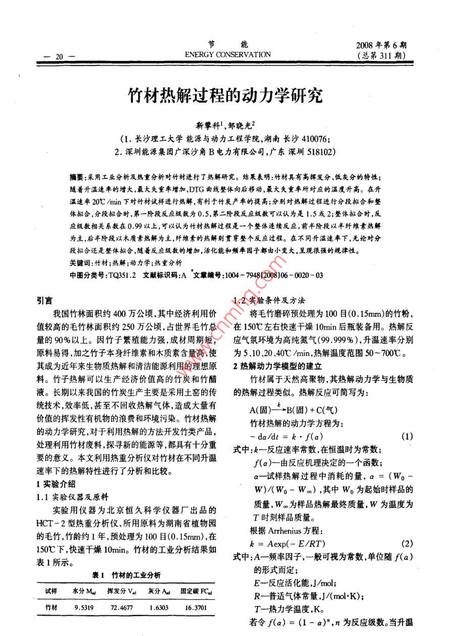 能2008年第6期ENERGY CONSERVATION(總第311期)竹材熱解過(guò)程的動(dòng)力學(xué)研究新攀科1,鄒曉光2(1.長(zhǎng)沙理工大學(xué)能源與動(dòng)力工程學(xué)院,湖南長(zhǎng)沙410076;深圳能源集團(tuán)廣深沙角B電力有限公司,廣東深圳518102)摘要:采用工業(yè)分析及熱重分析對(duì)竹材進(jìn)行了熱解研究。結(jié)果表明:竹材具有高揮發(fā)分、低灰分的特性;隨著升溫連率的增大,最大失重率增加,DTG曲線整體向后移動(dòng),最大失重率所對(duì)應(yīng)的溫度升高。在升溫速率20℃/min下對(duì)竹材試樣進(jìn)行熱解,有利于竹炭產(chǎn)率的提高;分別對(duì)熱解過(guò)程進(jìn)行分段擬合和整體擬合,分段擬合時(shí),第一階段反應(yīng)級(jí)數(shù)為0.5,第二階段反應(yīng)級(jí)數(shù)可以認(rèn)為是1.5或2;整體擬合時(shí),反應(yīng)級(jí)數(shù)相關(guān)系數(shù)在0.99以上,可以認(rèn)為竹材熱解過(guò)程是一個(gè)整體連續(xù)反應(yīng),前半階段以半纖維素?zé)峤鉃橹?后半階段以木質(zhì)素?zé)峤鉃橹?纖維素的熱解則貫穿整個(gè)反應(yīng)過(guò)程。在不同升溫速率下,無(wú)論對(duì)分段擬合還是整體擬合,隨著反應(yīng)級(jí)數(shù)的增加,活化能和頻率因子都由小變大,呈現(xiàn)很強(qiáng)的規(guī)律性關(guān)鍵詞:竹材;熱解;動(dòng)力學(xué);熱重分析中圖分類號(hào):TQ3512文獻(xiàn)標(biāo)識(shí)碼:A文章編號(hào):1004-79481(2008)06-0020-03引言12實(shí)驗(yàn)條件及方法我國(guó)竹林面積約400萬(wàn)公頃,其中經(jīng)濟(jì)利用價(jià)將毛竹磨碎預(yù)處理為100目(0.5mm)的竹粉值較高的毛竹林面積約250萬(wàn)公頃,占世界毛竹總在150℃左右快速干燥10min后瓶裝備用。熱解反量的90%以上。因竹子繁殖能力強(qiáng),成材周期短,應(yīng)氣氛環(huán)境為高純氮?dú)?99.99%),升溫速率分別原料易得,加之竹子本身纖維素和木質(zhì)素含量高使為5、10、20、40℃/min,熱解溫度范圍50~700℃。其成為近年來(lái)生物質(zhì)熱解和清潔能源利用的理想原2熱解動(dòng)力學(xué)模型的建立料。竹子熱解可以生產(chǎn)經(jīng)濟(jì)價(jià)值高的竹炭和竹醋竹材屬于天然高聚物,其熱解動(dòng)力學(xué)與生物質(zhì)液。長(zhǎng)期以來(lái)我國(guó)的竹炭生產(chǎn)主要是采用土窯的傳的熱解過(guò)程類似。熱解反應(yīng)可簡(jiǎn)寫(xiě)為:統(tǒng)技術(shù),效率低,甚至不回收熱解氣體,造成大量有A(固)→→B(固)+C(氣)價(jià)值的揮發(fā)性有機(jī)物的浪費(fèi)和環(huán)境污染。竹材熱解竹材熱解的動(dòng)力學(xué)方程為:的動(dòng)力學(xué)研究,對(duì)于利用熱解的方法開(kāi)發(fā)竹類產(chǎn)品,- da/dt=k·f(a)(1)處理利用竹材廢料探尋新的能源等都具有十分重式中:k-反應(yīng)速率常數(shù)在恒溫時(shí)為常數(shù);要的意義。本文利用熱重分析儀對(duì)竹材在不同升溫速率下的熱解特性進(jìn)行了分析和比較。f(a)-由反應(yīng)機(jī)理決定的一個(gè)函數(shù);a一試樣熱解過(guò)程中消耗的量,a=(W0-1實(shí)驗(yàn)介紹W)/(W-W∞),其中W0為起始時(shí)樣品的1.1實(shí)驗(yàn)儀器及原料實(shí)驗(yàn)用儀器為北京恒久科學(xué)儀器廠出品的質(zhì)量,W為樣品熱解最終質(zhì)量,W為溫度為HCT-2型熱重分析儀,所用原料為湖南省植物園T時(shí)刻樣品質(zhì)量。的毛竹,竹齡約1年,預(yù)處理為100目(0.15mm),在根據(jù) Arrhenius方程:150℃下,快速干燥10min。竹材的工業(yè)分析結(jié)果如k= Aexp(- E/RT)(2)表1所示。式中:A一頻率因子,一般可視為常數(shù),單位隨f(a)表1竹材的工業(yè)分析的形式而定;E一反應(yīng)活化能,J/ml;試樣水分M揮發(fā)分V灰分A固定碳FCR普適氣體常量,/(molK);竹材9.531972.46771.630316.3701一熱力學(xué)溫度,K。若令f(a)=(1-a)”,n為反應(yīng)級(jí)數(shù)。當(dāng)升溫2008年第6期節(jié)能(總第311期)ENERGY CONSERVATION速率β=dTdt一定時(shí),由式(1)和式(2)可得:在約30℃,DTG曲線形成第二個(gè)峰,但峰形不明-da/dT=(A/B)·(1-a)”·exp(-E/RT)(3)顯。由此可以推測(cè),竹材熱解過(guò)程是一個(gè)整體反應(yīng)根據(jù) Coats- Redfern的推導(dǎo),式(3)可近似為:過(guò)程,在確定竹材熱解最佳動(dòng)力學(xué)方程時(shí),將采用分(1)當(dāng)n≠1時(shí),段擬合和整體擬合的方法。嗎1r(1=)]籃(-21)R是由圖2可知,升溫速率為5℃/min、10℃/min、20℃hin時(shí),TG曲線明顯后移,但升溫速率為(4)40℃/min下的TG曲線卻位于20℃min的TG曲(2)當(dāng)n=1時(shí),線之下,可能是由于一些低升溫速率下難以斷裂的11-(1-3)是(5)鏡在熱沖擊作用下開(kāi)始斷裂.經(jīng)題時(shí)間后形成捍由于式(4)和式(5)中存在多個(gè)變量,因此先假小。由圖可知,升溫速率20℃min下,最后熱解失定反應(yīng)級(jí)數(shù)將上面兩式分別擬合成Y=a+bX形重量最少,說(shuō)明在此升溫速率下對(duì)竹材試樣進(jìn)行熱式得到相關(guān)系數(shù)R最大的方程即為最符合熱解過(guò)解,有利于竹炭產(chǎn)率的提高。程的動(dòng)力學(xué)方程。然后根據(jù)得到的斜率和截距計(jì)算表2為不同升溫速率下DTG峰值及對(duì)應(yīng)溫度。出反應(yīng)活化能E和頻率因子A。表2不同升溫速率下DTG峰值及對(duì)應(yīng)溫度3數(shù)據(jù)分析及討論加熱速率第二峰值第二峰值對(duì)第三峰值第三峰值對(duì)3.1熱解特性分析欠mn1 'mg.min!應(yīng)溫度 /mg'min應(yī