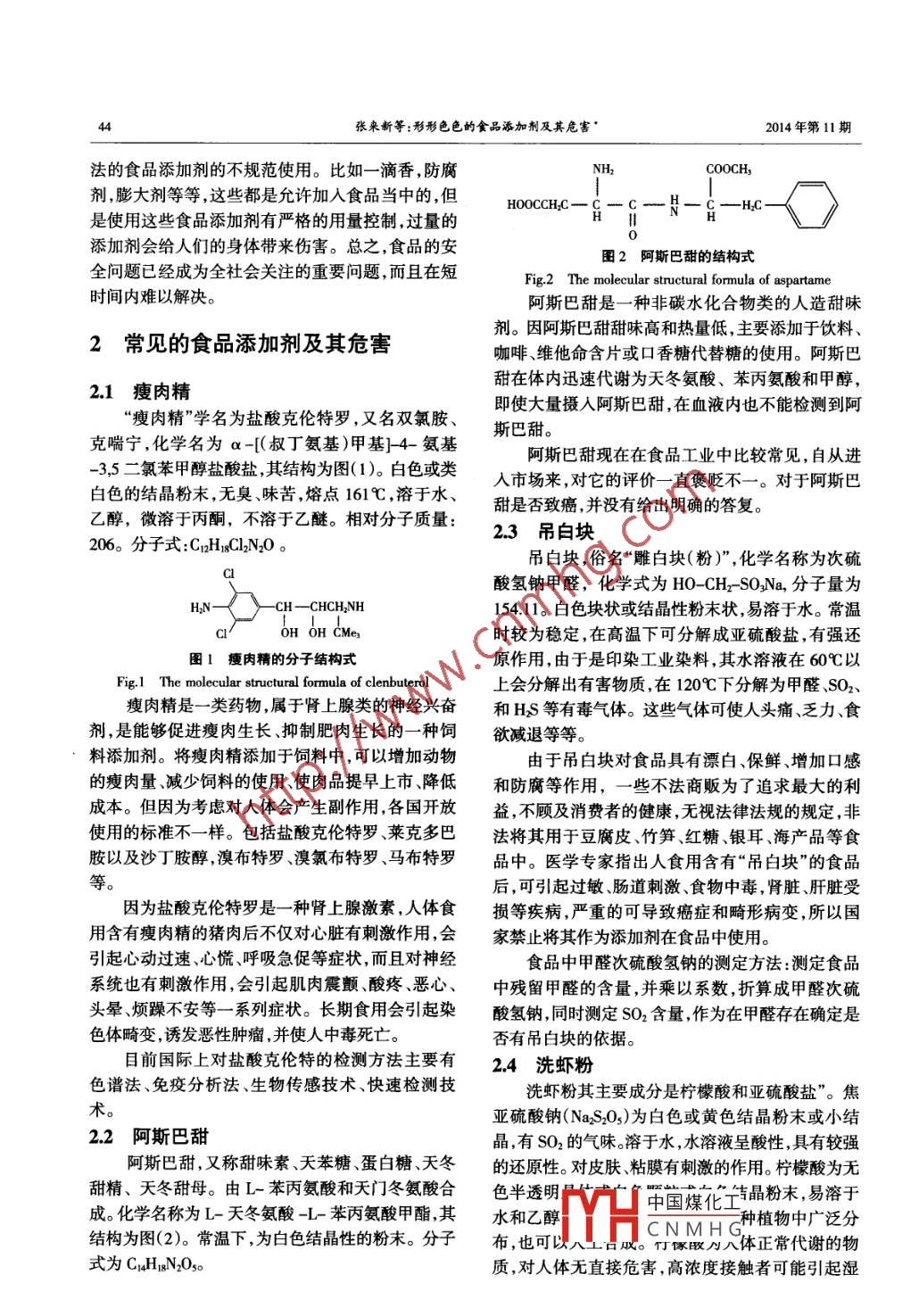 化學(xué)工程師Sum 230 No.11Chemical Engineer2014年第11期文章編號(hào):1002-1124(2014)11-0043-05形形色色的食品添加劑及其危害*述張來新",段玲(寶雞文理學(xué)院化學(xué)化工學(xué)院,陜西寶雞721013)摘要:本文簡要介紹了常見食品添加劑的種類及食品安全問題,詳細(xì)介紹了:(1)11種常見的食品添加劑及其危害;(2)常見食品添加劑對人們生活及健康的影響;(3)對使用食品添加劑所引發(fā)的思考。并對食品添加劑的使用和發(fā)展進(jìn)行了展望。關(guān)鍵詞:食品添加劑;安全;危害中圖分類號(hào):TS202.3文獻(xiàn)標(biāo)識(shí)碼:AVarious food additives and their hazards'ZHANG Lai-xin* ,DUAN Ling(Chemistry & Chemical Engineering Department, Baoji University of Arts and Sciences, Baoji 721013,China)Abstract:This paper briefly introduces different kinds of common food additives and food safety problem.Emphases are put on three parts: (1)11 cormmon food additives and their hazards; (2 )influences of common foodadditives on human life and health; (3 )considerations about the utilization of food additives. Future developmentsare prospected in the end.Key words:food additives; safety ;hazard隨著人們生活水平的不斷提高,人們對食品的品質(zhì)和色、香、味、營養(yǎng)價(jià)值也越來越重視。食品添食品添加劑及其安全加劑的使用對食品產(chǎn)業(yè)的發(fā)展有重要的作用,它可以增強(qiáng)食品的儲(chǔ)存和轉(zhuǎn)運(yùn)效能,改善風(fēng)味、調(diào)節(jié)營近幾十年來,食品的質(zhì)量問題已成為全社會(huì)關(guān)養(yǎng)成分,防止食品變質(zhì),從而提高質(zhì)量,滿足消費(fèi)者注的焦點(diǎn)問題。食品安全問題的頻頻曝光,老百姓的各種需求。食品添加劑是把雙刃劍,它對食品的的食品安全感越來越差,因而造成了公眾嚴(yán)重的心生產(chǎn)和食用是有益的,是不可缺少的,但超過規(guī)定理恐慌??梢哉f當(dāng)今社會(huì)人們幾乎所接觸的每- -種量使用和濫用是十分有害的,它已經(jīng)深人到我們的食品都與食品添加劑有關(guān)系,食品添加劑的使用關(guān)日常生活中,故不能盲目使用。隨著食品添加劑的乎食品質(zhì)量安全,也關(guān)乎消費(fèi)者的身體健康。品種和范圍不斷地再擴(kuò)大,如果不科學(xué)使用或?yàn)E用1.1食 品添加劑的含義將會(huì)威脅人們的生命安全。近年來,食品安全問題食品添加劑是為改善食品色、香、味等品質(zhì),以屢屢發(fā)生,許多事故都是食品添加劑惹的禍。“蘇丹及為防腐和加工工藝的需要而加人食品中的化學(xué)紅事件”、“三鹿”三聚氰胺毒奶粉事件、雙匯“瘦肉合成物質(zhì)或者天然提取物質(zhì)。目前,我國使用的食精”事件,都給我們敲響警鐘。所以我們必須重視食品添加劑有23個(gè)類別, 2000多個(gè)品種,包括酸度調(diào)品安全問題,學(xué)習(xí)有關(guān)食品安全方面的知識(shí),以便節(jié)劑抗結(jié)劑、消泡劑、抗氧化劑、漂白劑、膨松劑、于消除危害。著色劑、護(hù)色劑、酶制劑、增味劑、營養(yǎng)強(qiáng)化劑、防腐劑甜味劑、增稠劑、香料等等.1.2食 品添加劑的安全問題食品安全事故的頻頻發(fā)生,自然會(huì)引起公眾的極大關(guān)注。由食品添加劑引起的食品安全問題包括收稿日期:2014-08-18基金項(xiàng)目:陜西省植物化學(xué)重點(diǎn)實(shí)驗(yàn)室基金資助項(xiàng)目(0915066);陜西兩個(gè)方面:(1)非法添加,就是在食品中添加一-些不省教育廳自然科學(xué)基金資助課題(04JK147);寶雞文理學(xué)屬于國家允許的化學(xué)合成物、比如在豬肉中加人瘦院自然科學(xué)基金資助課題(zk12014)肉精,在奶粉中國煤化工中加人蘇丹作者簡介:張來新( 1955-),男,漢族陜西周至人,寶雞文理學(xué)院化學(xué)化工學(xué)院教授,碩:士生導(dǎo)師,主要從事大環(huán)化學(xué)研究及天紅等等。這些Y片CN M H G業(yè)原料,許多商家為了牟取暴利而非法添加在食品當(dāng)中;(2)合然產(chǎn)物分離提取。44張來新等:形形色色的食品添加劑及其危害●2014年第11期.法的食品添加劑的不規(guī)范使用。比如一滴香,防腐C0OCH,劑,膨大劑等等,這些都是允許加入食品當(dāng)中的,但是使用這些食品添加劑有嚴(yán)格的用量控制,過量的H0OCCH2Cl,C -(》添加劑會(huì)給人們的身體帶來傷害??傊?食品的安圖2阿斯巴甜的結(jié)構(gòu)式全問題已經(jīng)成為全社會(huì)關(guān)注的重要問題,而且在短Fig.2 The molecular structural formula of aspartame時(shí)間內(nèi)難以解決。阿斯巴甜是一-種非碳水化合物類的人造甜味劑。因阿斯巴甜甜味高和熱量低,主要添加于飲料、2常見的食品添加劑及其危害咖啡、維他命含片或口香糖代替糖的使用。阿斯巴甜在體內(nèi)迅速代謝為天冬氨酸、苯丙氨酸和甲醇,2.1瘦肉精“瘦肉精”學(xué)名為鹽酸克倫特羅,又名雙氯胺、即使大量攝人阿斯巴甜,在血液內(nèi)也不能檢測到阿克喘寧,化學(xué)名為a-[(叔丁氨基)甲基]-4-氨基斯巴甜。阿斯巴甜現(xiàn)在在食品工業(yè)中比較常見,自從進(jìn)-3,5二氯苯甲醇鹽酸鹽,其結(jié)構(gòu)為圖(1)。白色或類人市場來,對它的評價(jià)-直褒貶不一。對于阿斯巴白色的結(jié)晶粉末,無臭、味苦,熔點(diǎn)161C,溶于水、甜是否致癌,并沒有給出明確的答復(fù)。乙醇,微溶于丙酮,不溶于乙醚。相對分子質(zhì)量:2.3吊白塊206。分子式:CnHxCIlN20 。吊白塊,俗名“雕白塊(粉)”,化