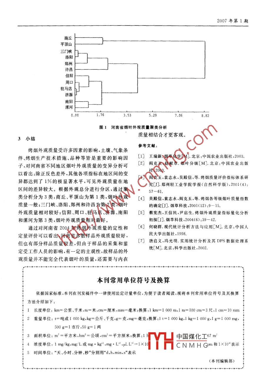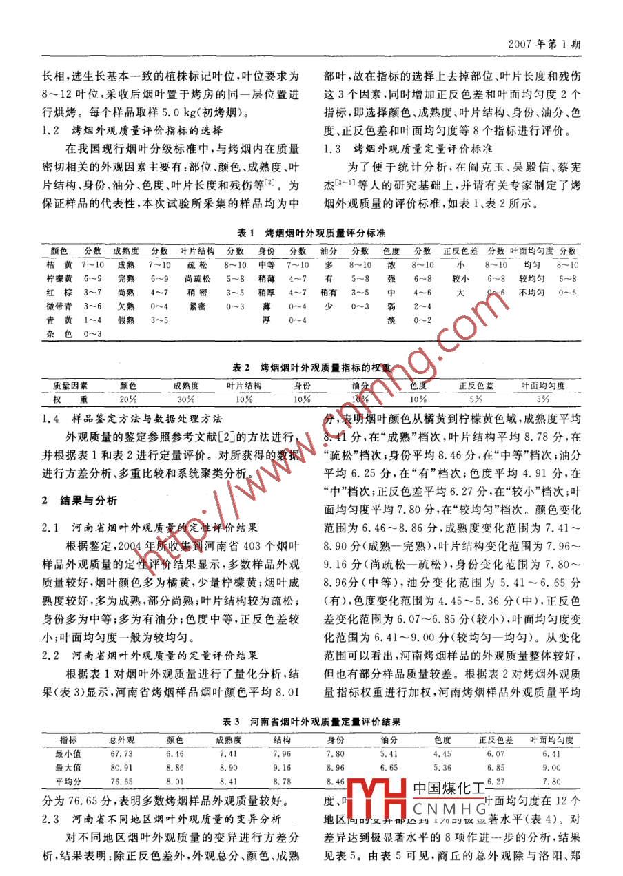 河南農(nóng)業(yè)科學(xué)河南省不同地區(qū)烤煙外觀質(zhì)量評(píng)價(jià)王英元',李亞娟”,葉協(xié)鋒”°,趙春華2(1.中國煙草總公司鄭州煙草研究院,河南鄭州450001;2.河南農(nóng)業(yè)大學(xué)國家煙草栽培生理生化研究基地,河南鄭州450002)摘要:對所收集到的2004年河南省403份烤煙樣品進(jìn)行了外觀質(zhì)量評(píng)價(jià),并對定量評(píng)價(jià)結(jié)果進(jìn)行了地區(qū)間的方差分析和聚類分析。結(jié)果表明:多數(shù)樣品外觀質(zhì)量較好,但也有部分樣品質(zhì)量較差;除正反色差外,其他各項(xiàng)指標(biāo)在地區(qū)間的變異都達(dá)到了1%的極顯著水平;根據(jù)外觀總分進(jìn)行聚類,可分為3類,商丘和平頂山為第1類,質(zhì)量一般;三門峽、洛陽、鄭州和許昌歸為第2類.質(zhì)量較好;信陽、周口、駐馬店、濟(jì)源、南陽和漯河為第3類,質(zhì)量最好。關(guān)鍵詞:河南;烤煙;外觀質(zhì)量;評(píng)價(jià)中圖分類號(hào): S572文獻(xiàn)標(biāo)識(shí)碼: A文章編號(hào): 1004 - 3268(2007)01 - 0039 - 04Evaluation on Appearance Quality of Flue - cured Tobacco inDifferent Areas of Henan ProvinceWANG Ying yuan' ,LI Ya-juan2 ,YE Xie-feng"* ,ZHAO Chun hua?(1. Zhengzhou Tobacco Research Institute of CNTC, Zhengzhou 450001 ,China; 2. National Tobacco Cultiviation &.Physiology & Biochemistry Research Center, Henan Agriculture University ,Zhengzhou 450002 ,China)Abstract: The appearance quality of 403 flue cured tobacco samples collected from Henan prov-ince in 2004 was evaluated by the method of variance analysis and cluster analysis. The resultswere as follows: the appearance quality of the most samples were better and the variation of allthe indexes, except the color difference, was highly significant at 0.01 level between different ar-eas; according to the cluster analysis, all the samples could be divided into 3 grades, the samplesfrom Xinyang, Zhoukou, Zhumadian, Jiyuan, Nanyang and Luohe had the best quality, the sam-ples from Sanmenxia,Luoyang, Zhengzhou and Xuchang had better quality than the ones didfrom Shangqiu and Pingdingshan.Key words: Henan; Flue-cured tobacco; Appearance quality; Evaluation煙葉的外觀質(zhì)量即煙葉外在的特征特性,是指為有關(guān)煙區(qū)確定生產(chǎn)目標(biāo),進(jìn)行合理栽培提供依據(jù)。人們感官可以做出判斷的質(zhì)量方面,是煙葉分級(jí)的1材料和方法主要依據(jù)。煙葉的外觀特征和煙葉質(zhì)量有密切的關(guān)系,一般認(rèn)為優(yōu)質(zhì)煙葉的外觀特征是煙葉成熟度好,1.1材料葉組織疏松,葉片厚薄適中,顏色橘黃,油分足,色度根據(jù)《河南省煙草種植區(qū)劃實(shí)施方案》,2004年濃"。本研究對河南省烤煙外觀質(zhì)量進(jìn)行了定性和在河南省12個(gè)植煙市61個(gè)植煙縣收集烤煙樣品定量評(píng)價(jià),并對外觀質(zhì)量進(jìn)行了地區(qū)間的變異分析和403個(gè)。采樣點(diǎn)選擇在能代表全縣煙葉生產(chǎn)水平的聚類分析,以期了解不同煙區(qū)煙葉的外觀質(zhì)量特征,地點(diǎn),品種為該縣的主裁品種,在煙葉生長中期視其中國煤化工YHCNMHG收稿日期:2006 -10-10基金項(xiàng)目:國家煙草專賣局重點(diǎn)科研項(xiàng)目(110200401017 ,110200401021)作者簡介:王英元(1976-).男,河南鎮(zhèn)平人,工程師,主要從事煙葉檢驗(yàn)工作。通訊作者:葉協(xié)鋒(1979-),男,河南郟縣人,助理研究員,碩士,主要從事煙草栽培生理生化研究。2007年第1期長相,選生長基本一致的植株標(biāo)記葉位,葉位要求為部葉,故在指標(biāo)的選擇上去掉部位、葉片長度和殘傷8~12葉位,采收后煙葉置于烤房的同一層位置進(jìn)這3個(gè)因素,同時(shí)增加正反色差和葉面均勻度2個(gè)行烘烤。每個(gè)樣品取樣5. 0 kg(初烤煙)。指標(biāo),即選擇顏色、成熟度、葉片結(jié)構(gòu)、身份、油分、色1.2 烤煙外觀質(zhì)量評(píng)價(jià)指標(biāo)的選擇度、正反色差和葉面均勻度等8個(gè)指標(biāo)進(jìn)行評(píng)價(jià)。在我國現(xiàn)行煙葉分級(jí)標(biāo)準(zhǔn)中,與烤煙內(nèi)在質(zhì)量1.3 烤煙外觀質(zhì)量定量評(píng)價(jià)標(biāo)準(zhǔn)密切相關(guān)的外觀因素主要有:部位、顏色、成熟度、葉為了便于統(tǒng)計(jì)分析,在閻克玉、吳殿信、蔡憲片結(jié)構(gòu)、身份、油分、色度、葉片長度和殘傷等[印]。為杰[3~5等人的研究基礎(chǔ)上,并請有關(guān)專家制定了烤保證樣品的代表性,本次試驗(yàn)所采集的樣品均為中煙外觀質(zhì)量的評(píng)價(jià)標(biāo)準(zhǔn),如表1.表2所示。表1烤煙煙葉外觀質(zhì)量評(píng)分標(biāo)準(zhǔn)_顏色分?jǐn)?shù)成熟度分?jǐn)?shù)葉片結(jié)構(gòu)分?jǐn)?shù)身份分?jǐn)?shù)油分分?jǐn)?shù)色度分?jǐn)?shù)正反色差分?jǐn)?shù)葉面均勻度分?jǐn)?shù)桔黃7~10成熟7~10疏松8~10中等7~10多8~10濃8~10小8~10均勻 8~ 10檸檬黃6~9完熟6~9尚疏松5~8 稍薄4~7有5~8強(qiáng)6~8較小6~8較均勻6~8紅棕3~尚熟4~7稍密有3~5大0~6 不均勻 0~6微帶青3~6欠熟0~4緊密0~3薄0~4少0~32~4青黃1~4假熟3~50~2雜色0~3表2烤煙煙葉外觀質(zhì)量 指標(biāo)的權(quán)重質(zhì)量因素顏色.成熟度葉片結(jié)構(gòu)身份油分色度正反色差葉面均勻度漢___ 雨20%30% .10%_5% .5%.4 樣品鑒定方法與數(shù)據(jù)處理方法分,表明煙葉顏色從橘黃到檸檬黃色域,成熟度平均外觀質(zhì)量的鑒定參照參考文獻(xiàn)[2]的方法進(jìn)行,8.41分,在“成熟"檔次,葉片結(jié)構(gòu)平均8.78