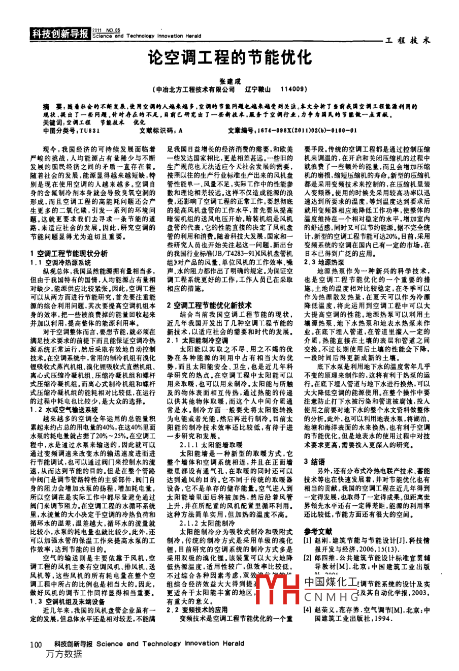 科技創(chuàng)新導報mTechnolory Innovation Herald工程枝術論空調工程的節(jié)能優(yōu)化張建成中冶北方工程技術有限公司遼寧鞍山114009)摘要:隨著社會的不斷發(fā)展,使用空調的人越來越多,空訓的節(jié)能問題也越來越受到類注。本文分新了當前我國空調工程能源利用的現狀,提出了一些問題,針對存在的不尾,貝前巳研究出了一些新技術,服務于空訓行業(yè),力爭為國民的節(jié)能做一點貫獻關鍵詞:空訓工程節(jié)能技術優(yōu)化中圖分類號:TU831文獻標識碼:A文章編號:1674-098X(2011)02(b)-0100-01現今,我國經濟的可持續(xù)發(fā)展面臨著足我國日益增長的經濟消費的需要,和歐美要手段。傳統(tǒng)的空調工程都是通過控制壓縮嚴峻的挑戰(zhàn),人均能源占有量稀少與不斷一些發(fā)達國家相比,更是相差甚遠。一些舊的機來調溫的,在開啟和關閉壓縮機的過程中發(fā)展的國民經濟之間的矛盾一直存在著。生產規(guī)范也無法適應今天社會發(fā)展的需要,就浪費了一些額外的能量,而且會增加壓縮隨著社會的發(fā)展,能源顯得越來越短峽,特按照以往的生產行業(yè)標準生產出來的風機盤機的磨損縮短壓縮機的壽命新型的壓縮機別是現在使用空調的人越來越多??照{自管性能單一風量不足,實際T作中的性能參都是采用變頻技術來控制的,在壓縮機里裝身的含氟制冷劑本身就會導致臭氧空洞的數和理論相差較遠。這樣不僅造成能源的浪變頻器。使用的時候先采用較高功率以迅形成,而且空調工程的高能耗問題還會產費,還影響了空調工程的正常工作。要想徹底速達到所要求的溫度,等到溫度達到要求后生更多的二氧化碳,引發(fā)一系列的環(huán)境問的提高風機盤管的工作水平,首先要從提高就用變頻器相應地降低工作功率,使整體的題。這就更要求我們去尋求一條節(jié)能的道暗裝機組的送風電壓開始暗裝機組是風機溫度維持在一個相對穩(wěn)定的水平,增加室內路,來適應社會的發(fā)展。因此,研究空調的盤管的代表,它的性能直接的決定了風機盤的舒適感,同時又可以節(jié)約能源,據不完全統(tǒng)節(jié)能問題顯得尤為迫切且重要。管的利用和消費。隨著科技大發(fā)展,國家和一計新型的空調工程節(jié)能可達20%目前采用些研究人員也開始關注起這一問題新出臺變頻系統(tǒng)的空調在國內已有一定的市場,在1空調工程節(jié)能現狀分析的我國行業(yè)標準(JB/T4283-9)風機盤管機日本已得到廣泛的應用調冷熱源系統(tǒng)組》對產品的風量、單位風機的工作效率、噪2.3地源熱泵縱觀總體,我國雖然能源擁有量相當多,聲,水的阻力都作出了明確的規(guī)定。為保證空地源熱泵作為一種新興的科學技術但由于我國特有的國情,人均能源占有量相調工程系統(tǒng)更好的工作,工作人員已在采取也是空調工程節(jié)能優(yōu)化的一個重要的措對缺少,能源供應比較緊張。因此,空調工程相應的措施施。土地的溫度相對比較穩(wěn)定,在冬季可以可以從兩方面進行節(jié)能研究,首先要注重能作為熱源散發(fā)熱量,在夏天可以作為冷源源的綜合利用問題,其次要提高空調機組本2空調工程節(jié)能優(yōu)化新技術降低溫度,將此運用到空調工程中可以大身的效率,把一些被浪費掉的能量回收起來結合當前我國空調工程節(jié)能的現狀,大提高空調的性能。地源熱泵可以利用土并加以利用,提高整體的能源利用率近幾年我國開發(fā)出了幾種空調丁程節(jié)能的壤源熱泵、地下水熱泵和地表水熱泵來作對于空調整體而言,要想節(jié)能就必須在新技術,以適應社會的需要和時代的發(fā)展。業(yè)。在底下埋入管道,在管道里灌入一定的滿足技術要求的前提下而且能保證空調冷熱2.1太陽能制冷空調介質,熱能直接在土壤的表層和管道之間源系統(tǒng)正常運行,然后采取有效地自動控制太陽能以其取之不盡、用之不竭的優(yōu)交換。不過長期使用后土壤的性能會下降技術。在空調系統(tǒng)中,常用的制冷機組有溴化勢在各種能源的利用中占有相當大的優(yōu)一段時間后得更新成新的土壤。鋰吸收式蒸汽機組溴化鋰吸收式直燃機組、勢,而且太陽能安全、衛(wèi)生,也是近幾年科底下水泵是利用地下水的溫度常年幾平離心式壓縮冷凝機組、壓縮冷凝機組和螺桿學研究的熱點。在空調工程中太陽能可以不變的原理來制作的,這將有利于熱泵的運式壓縮冷凝機組而離心式制冷機組和螺桿用來取暖,也可以用來制冷。太陽能與所觸行。在底下埋入管道與地下水進行換熱,可以式壓縮冷凝機組的能耗相對比較低,在運行及的物體表面相互傳熱,通過熱能的傳遞大大降低空調的能源使用在整個操作中要的過程中耗電也比較少,是大眾的選擇以供其他物體取暖,而這個人中間介質通注意防止打下水被污染和管道被腐蝕投入1.2水或空氣輸送系統(tǒng)常是水。制冷方面一般要先將太陽能轉換使用之前要對地下水的整個水文資料做整體越來越多的空調全年運用的總能量積為電能或者光能,然后再進行制冷目前太的分析此外,也可以利用地表水泵,將湖泊累起來約占總的用電量的40%,在這40%里面陽能的制冷技術效率還比較低,有待于進池塘和海洋表面的水來換熱,也有利于空調水泵的耗電量就占據了20%~25%在空調工一歲研究和發(fā)展。的節(jié)能優(yōu)化,但是地表水的使用過程中對