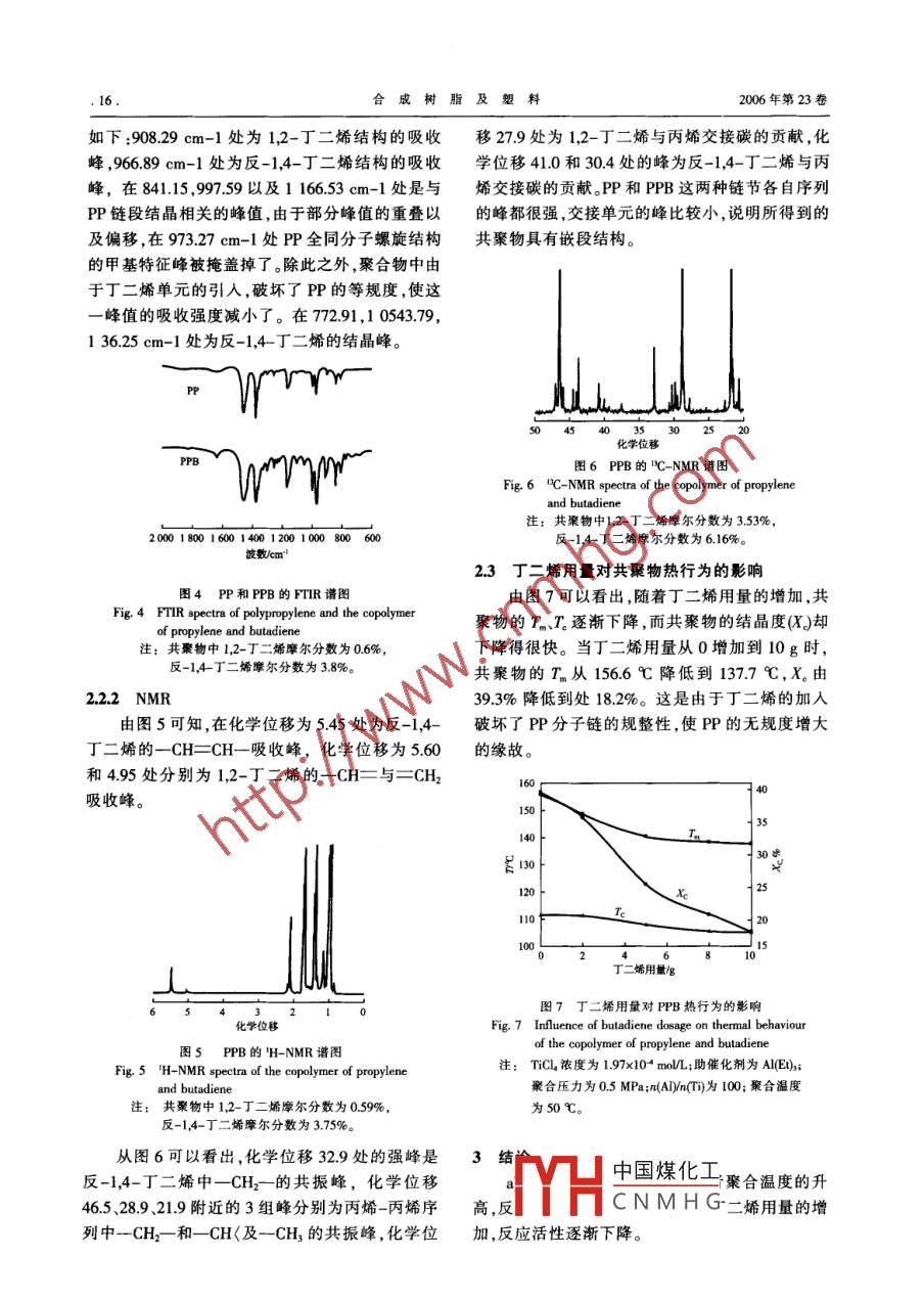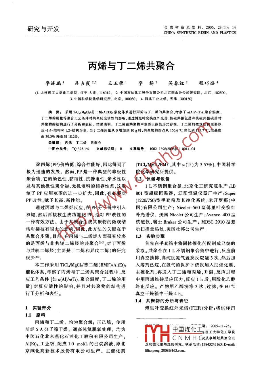 研究與開發(fā)合成樹脂及塑料,2006,23(1):14CHINA SYNTHETIC RESIN AND PLASTICS丙烯與丁二烯共聚合李連鵬1呂占霞23王玉榮1李楊2吳春紅2程巧煥←(1.大連理工大學(xué)化工學(xué)院,遼寧大連,116012;2.中國(guó)石油化工股份有限公司北京燕山分公司研究院,北京,1025003.中國(guó)科學(xué)院化學(xué)研究所,北京,100080;4.河北工業(yè)大學(xué),天津,30013摘要:采用TCl/MgCl芴二醚/AlIE)催化體系進(jìn)行丙烯與丁二烯的共聚合,考察了n(AIya(T)聚合溫度丁二烯的用量等聚合工藝條件對(duì)共聚反應(yīng)活性的影響,通過(guò)傅里葉變換紅外光譜、核磁共振氫譜和核磁共振碳譜對(duì)共聚物的結(jié)構(gòu)進(jìn)行了分析和表征。結(jié)果表明,丁二烯在共聚物中主要以嵌段形式存在,丁二烯的微觀結(jié)構(gòu)主要以反-14結(jié)構(gòu)和1,2-結(jié)構(gòu)為主。當(dāng)丁二烯用量從0增加到10g時(shí),共聚物的熔點(diǎn)從1566℃降低到137.7℃,結(jié)晶度由393%降低到182%關(guān)鍵詞:丙烯丁二烯共聚合中圖分類號(hào):TQ325.14文獻(xiàn)標(biāo)識(shí)碼:B文章編號(hào):1002-13962006)01-001404聚丙烯(PP)價(jià)格低、綜合性能好,因此得到了 TTiCLMgCI/BMF,其中w(Ti)為3.57%],中國(guó)科學(xué)極為迅速的發(fā)展。然而,PP是一種典型的非極性院化學(xué)研究所提供。聚合物,它的染色性、黏結(jié)性、抗靜電性、親水性以12儀器與設(shè)備及與其他極性聚合物、無(wú)機(jī)填料的相容性差,這限1L不銹鋼聚合釜,北京化工研究院生產(chǎn);IB制了P應(yīng)用范圍的進(jìn)一步擴(kuò)大,因此,有必要對(duì)801型超級(jí)恒溫器,遼陽(yáng)恒溫儀器廠生產(chǎn); SuperPP改性,賦予其高、新性能(1220750型手套箱及其凈化系統(tǒng),米開羅那(中通過(guò)丙烯與二烯烴反應(yīng),在PP分子鏈中引入國(guó))有限公司生產(chǎn); Nicolet-560型傅里葉變換紅雙鍵,然后再接枝生成功能化PP,是對(duì)PP改性的外光譜儀,美國(guó) Nicolet公司生產(chǎn); Avance-400型種有效方法。由于共聚合生成共聚物的微觀結(jié)核磁儀,瑞士 Bruker公司生產(chǎn);MDSC2910型差構(gòu)對(duì)接枝有很大的影響,因此,此方法的關(guān)鍵在于示掃描量熱儀,美國(guó)杜邦公司生產(chǎn)。共聚合步驟。目前,在丙烯與二烯烴方面研究較多1.3實(shí)驗(yàn)步驟的是丙烯與非共軛二烯烴的共聚合習(xí),對(duì)于丙烯首先在手套箱中將固體催化劑配制成己烷的與共軛二烯烴(主要是丁二烯和異戊二烯)的研究漿液。共聚合在1L不銹鋼聚合釜中進(jìn)行,反應(yīng)前很少。用真空抽排、高純度氮?dú)庵脫Q反應(yīng)釜3次,然后加本工作采用 TiCl/MgCly芴二醚(BMF)Al(E)3人溶劑己烷,在氮?dú)獾谋Wo(hù)下依次加入助催化劑催化體系,考察了丙烯與丁二烯共聚合過(guò)程中,反主催化劑,再通入丁二烯和丙烯,升溫,反應(yīng)過(guò)程應(yīng)工藝條件[如n(ADya(Ti),聚合溫度,丁二烯的用中用丙烯維持反應(yīng)壓力,反應(yīng)1h后,用酸化乙醇量]對(duì)反應(yīng)活性的影響,并且對(duì)共聚物的結(jié)構(gòu)進(jìn)終止反應(yīng)。產(chǎn)物用乙醇洗滌3次,過(guò)濾,在60℃行了分析和表真空干燥箱中干燥4h。14共聚物的分析與表征1實(shí)驗(yàn)部分傅里葉變換紅外光譜(FTIR)分析:將試樣掃原料丙烯和丁二烯,均為聚合級(jí);正已烷,使用中國(guó)煤化平明:2005-11-25。前經(jīng)5A分子篩干燥,通髙純氮脫氧處理。均為理工大學(xué)化工學(xué)院中國(guó)石化北京燕化石油化工股份有限公司生產(chǎn)CNMH從事烯烴共聚合以Al(Et)3,工業(yè)級(jí),配成1.0moL的己烷溶液,原北及功能化聚烯烴的研究。聯(lián)系電話:13843243163;E-mail京燕化高新技術(shù)股份有限公司生產(chǎn)。主催化劑第1期李連鵬等.丙烯與丁二烯共聚合描32次,選取分辨率為4cm-1,將共聚物粉末與方面,不利于絡(luò)合物的形成以及單體的吸附溴化鉀研勻、壓片測(cè)試。另一方面,溫度較高使活性中心的不可逆失活加共聚物微觀結(jié)構(gòu)測(cè)試:采用核磁共振氫譜快,導(dǎo)致了反應(yīng)活性的降低。除此之外,當(dāng)聚合溫(H-NMR)和核磁共振碳譜(HC-NMR),先用氘代度達(dá)到70℃時(shí),所得產(chǎn)物在己烷溶劑中能夠溶鄰二氯苯將共聚物溶解,配成濃度為20mgmL的脹,溶脹物包纏了部分催化劑,使暴露在外的活性溶液,于120℃測(cè)試。中心數(shù)目減少。因此,共聚合溫度應(yīng)控制在60℃熔點(diǎn)(T)和結(jié)晶溫度(T)測(cè)試:在氮?dú)獗Wo(hù)以內(nèi)。下,升溫速率和降溫速率均為10℃/min062結(jié)果和討論21聚合工藝條件對(duì)反應(yīng)活性的影響042.1.1 n(Al)n(ti)由圖1可以看出,隨著n(A)n(T)的增加反應(yīng)活性逐漸增大,在n(A)n(T)為90左右達(dá)到最大,然后隨著n(Al)/n(T)的增大而逐漸下聚合溫度/℃降。這是由于烷基鋁除了清除體系中的微量雜質(zhì)(如H4O,O2等)外,還主要與T作用生成活性中圖2聚合溫度對(duì)反應(yīng)活性的影響心。當(dāng)加入少量的A(Et3時(shí),體系中的雜質(zhì)會(huì)消Fig. 2 Influence of copolymerization temperature onreaction activty耗掉部分A(EU),從而使與主催化劑絡(luò)合形成活注:TCl4濃度為245×10·molL;助催化劑為Al(E);性中心引發(fā)單體聚合的A(Et)3不足,導(dǎo)致反應(yīng)活聚合壓力為04MPa;n(ADy(為100。性較低;隨著n(A)n(T)的增大,T“被還原為213丁二烯用量T的數(shù)量增多,活性中心的數(shù)量增加,反應(yīng)