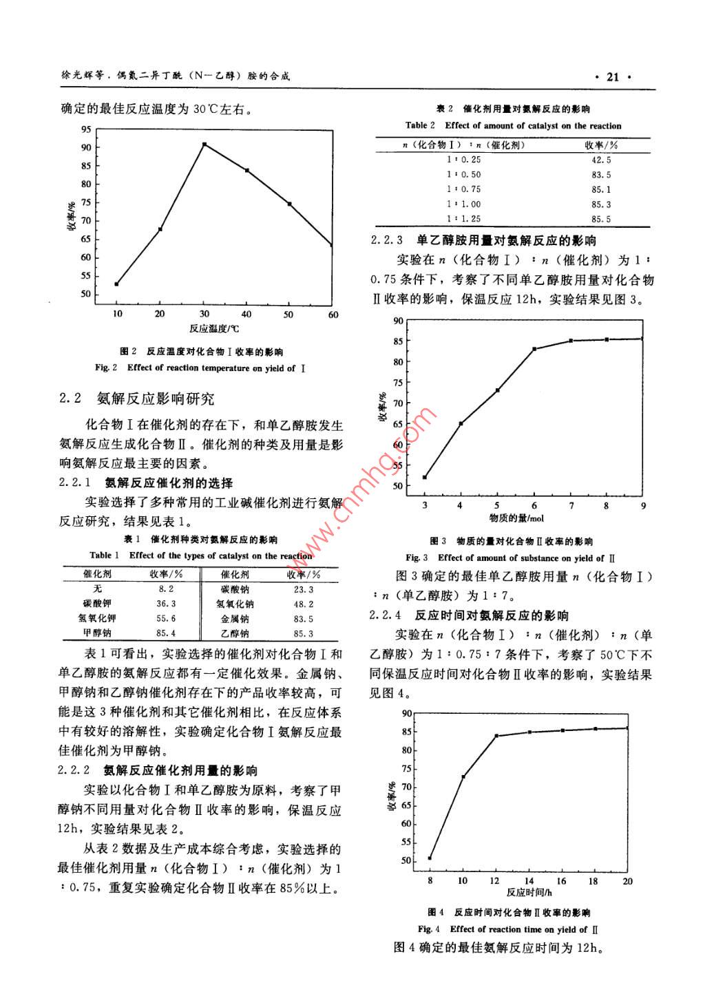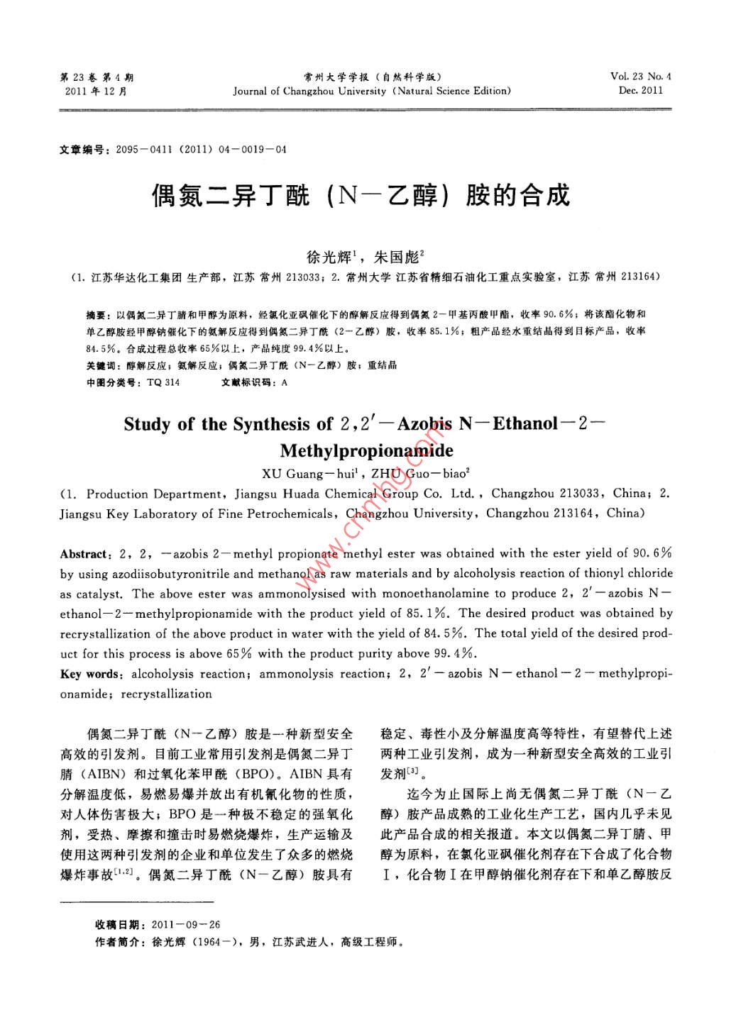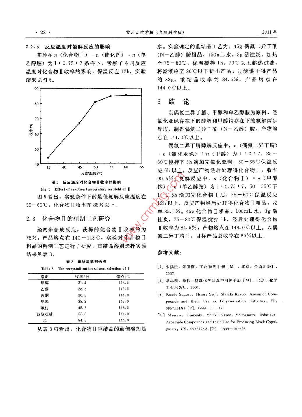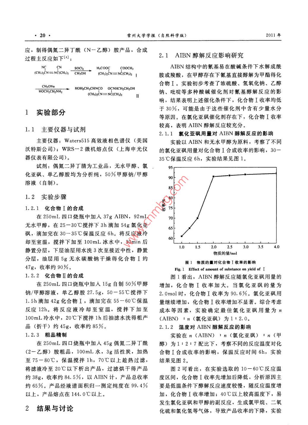第23卷第4期常州大學學報(自然科學版)VoL. 23 No 42011年12月Journal of Changzhou University (Natural Science Edition)Dec.2011文章編號:2095—0411(2011)04-0019-04偶氮二異丁酰(N一乙醇)胺的合成徐光輝,朱國彪2(1.江蘇華達化工集團生產(chǎn)部,江蘇常州213033;2.常州大學江蘇省精細石油化工重點實驗室,江蘇常州213164)摘要:以偶氮二異丁腈和甲醇為原料,經(jīng)氯化亞砜催化下的醇解反應(yīng)得到偶氮2一甲基丙酸甲酯,收率90.6%;將該酯化物和單乙醇胺經(jīng)甲醇鈉催化下的氨解反應(yīng)得到偶氮二異丁酰(2-乙醇)胺,收率85,1%;粗產(chǎn)品經(jīng)水重結(jié)晶得到目標產(chǎn)品,收率84.5%。合成過程總收率65%以上,產(chǎn)品純度9.4%以上關(guān)鍵詞:醇解反應(yīng);氨解反應(yīng);偶氮二異丁酰(N一乙醇)胺;重結(jié)晶中圖分類號:TQ314文獻標識碼:AStudy of the Synthesis of 2, 2-Azobis n-Ethanol-2-MethylpropionamideXU Guang-hui, ZHU Guo-biao(1. Production Department, Jiangsu Huada Chemical Group Co. Ltd, Changzhou 213033, China; 2.Jiangsu Key Laboratory of Fine Petrochemicals, Changzhou University, Changzhou 213164, China)Abstract:2,2,-azobis 2-methyl propionate methyl ester was obtained with the ester yield of 90. 6%by using azodiisobutyronitrile and methanol as raw materials and by alcoholysis reaction of thionyl chlorideas catalyst. The above ester was ammonolysised with monoethanolamine to produce 2, 2'-azobis Nethanol-2-methylpropionamide with the product yield of 85. 1%. The desired product was obtained byrecrystallization of the above product in water with the yield of 84. 5%. The total yield of the desired product for this process is above 65% with the product purity above 99.4%6Key words: alcoholysis reaction; ammonolysis reaction; 2, 2'-azobis N- ethanol -2-methylproronamide; recrystallization偶氮二異丁酰(N—乙醇)胺是一種新型安全穩(wěn)定、毒性小及分解溫度高等特性,有望替代上述高效的引發(fā)劑。目前工業(yè)常用引發(fā)劑是偶氮二異丁兩種工業(yè)引發(fā)劑,成為一種新型安全高效的工業(yè)引腈(AIBN)和過氧化苯甲酰(BPO)。AIBN具有發(fā)劑3分解溫度低,易燃易爆并放出有機氰化物的性質(zhì)迄今為止國際上尚無偶氮二異丁酰(N-乙對人體傷害極大;BPO是一種極不穩(wěn)定的強氧化醇)胺產(chǎn)品成熟的工業(yè)化生產(chǎn)工藝,國內(nèi)幾乎未見劑,受熱、摩擦和撞擊時易燃燒爆炸,生產(chǎn)運輸及此產(chǎn)品合成的相關(guān)報道。本文以偶氮二異丁腈、甲使用這兩種引發(fā)劑的企業(yè)和單位發(fā)生了眾多的燃燒醇為原料,在氯化亞砜催化劑存在下合成了化合物爆炸事故:2。偶氮二異丁酰(N一乙醇)胺具有I,化合物I在甲醇鈉催化劑存在下和單乙醇胺反收稿日期:2011-09-26作者簡介:徐光輝(1964-),男,江蘇武進人,高級工程師。20常州大學學報(自然科學版)2011年應(yīng),制得偶氮二異丁酰(N-乙醇)胺產(chǎn)品,合成過程主反應(yīng)如下:2.1AIBN醇解反應(yīng)影響研究ch=Cb-n→H,COoCCOOCH,AIBN結(jié)構(gòu)中的氰基易在酸堿條件下水解成酰CH,):CNENC(CH,)z胺或羧酸,在甲醇存在下氰基直接醇解為甲酯得化合物Ⅰ。實驗初步考查了濃硫酸、氫氧化鈉、乙醇HOHyCH: CHNCO OCNHCH: CH-OHOCH, CH, NH(CH,hCN鈉、吡啶等多種酸堿催化劑對氰基醇解反應(yīng)的影響,結(jié)果表明上述催化條件下,化合物I收率均低1實驗部分于30%,可能是由于這些催化劑中含有少量水分等原因。在氯化亞砜催化劑存在下,化合物I收率1.1主要儀器與試劑較高,表明AIBN醇解反應(yīng)較充分。2.1.1氯化亞砜用量對AIBN醇解反應(yīng)的影響主要儀器: Waters515高效液相色譜儀(美國實驗以AIBN和無水甲醇為原料,考察了不同沃特斯公司);WRS-2微機熔點儀(上海申光儀的氯化亞砜用量對化合物I合成收率的影響,30器儀表有限公司)。35℃保溫反應(yīng)6h,實驗結(jié)果見圖1。試劑:偶氮二異丁腈為工業(yè)品,無水甲醇、氯化亞砜、單乙醇胺均為分析純,50%甲醇鈉/甲醇溶液(自制)。1.2實驗步驟1.2.1化合物I的合成在250mL四口燒瓶中加入37 g AIBN,92mL無水甲醇,在25-30℃攪拌下3h滴加54g氯化亞砜,滴加完在30-35℃保溫反應(yīng)6h。將反應(yīng)液冷卻至室溫,攪拌下加至100mL冰水中,30min后靜置分層,下層油層用水洗3次至接近中性,靜置5物質(zhì)的量/mol分層,油層用5g無水碳酸鈉干燥得化合物I約圖1物質(zhì)的量對化合物I收率的影響47g,收率約90%Fig. 1 Effect of amount of substance on yield of I1.2.2化合物Ⅱ的合成圖1看出,AIBN醇解反應(yīng)隨氯化亞砜用量的在250mL四口燒瓶中加入15g自制50%甲醇增加,化合物I收率加大。當氯化亞砜的量為鈉/甲醇溶液,單乙醇胺27.5g,50-55℃攪拌下2.0mol時,化合物I收率為90.6%。氯化亞砜用1.5h滴加42g化合物I,滴加完在55-60℃保溫量繼續(xù)增加,化合物I收率增加不顯著。綜合考慮反應(yīng)12h。將反應(yīng)液冷卻至室溫,攪拌下加至成本等因素,實驗確定最佳氯化亞砜用量為n100mL冷水中,20C下攪拌1h后抽濾水洗得粗產(chǎn)(AIBN):n(氯化亞砜)為1:2.0。品(折干)約45g,收率約85%2.1.2溫度對AIBN醇解反應(yīng)的影響1.2.3粗品精制實驗在n(AIBN):n(氯化亞砜):n(甲在250mL四口燒瓶中加入45g偶氮二異丁酰醇)為1:2:7配比下,考察不同的反應(yīng)溫度對化(2一乙醇)胺粗品,100mL水,3g活性炭,加熱合物I合成收率的影響,保溫反應(yīng)時間6h,實驗至75-80℃,保溫攪拌1h,70℃以上趁熱過濾,結(jié)果見圖2。將濾液冷至20℃以下析出產(chǎn)品,過濾烘干得產(chǎn)品圖2可看出,在實驗選取的10-60℃
