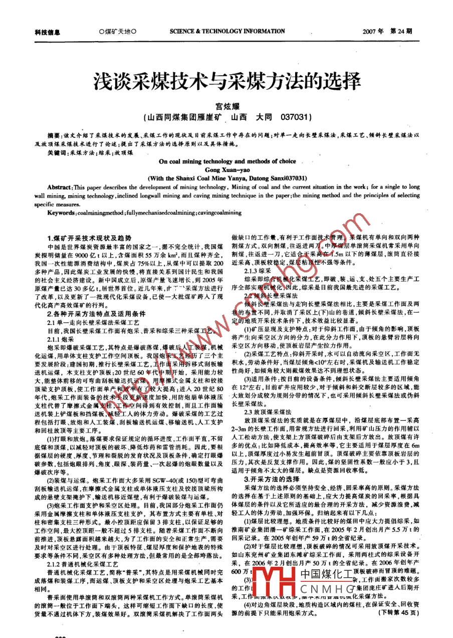 科技信息O煤礦天地口SCIENCE & TECHNOLOGY INFORMATION2007年第24期淺談采煤技術(shù)與采煤方法的選擇宮炫耀(山西同煤集團雁崖礦、山西大同037031)摘要:該文介紹了采煤技術(shù)的發(fā)展、采煤工作的現(xiàn)狀及目前采煤工作中存在的問題;對單一走向長璧采煤法,采煤工藝、傾斜長壁采煤法以及放頂煤采煤技術(shù)進行了論述;提出了采煤方法的選擇原則以及具體措施。關(guān)鍵詞:采煤方法;綜采;放頂煤On coal mining technology and methods of choiceGong Xuan- yao(With the Shanxi Coal Mine Yanya, Datong Sanxi037031)Abstract:This paper describes the development of mining technology, Mining of coal and the current situation in the work; for a single to longwall mining, mining technology ,inclined longwall mining and caving mining technique in the paper ;the mining method and the principles of selectingspecifie measures.1.煤礦開采技術(shù)現(xiàn)狀及趨勢做缺口的工作最,有利于工作面技術(shù)管理。采煤機有單向和雙向兩種中國是世界煤炭資源最豐富的國家之- ,據(jù)不完全統(tǒng)計,我國煤割煤 方式。雙向割煤.往返進兩刀。中厚煤層單躥簡采煤機常采用單向炭探明儲量在90億t以上,含媒面積55萬余kmr,而且煤種齊全,割煤 ,往返進一-刀,它適合于采高在1.5m以下的薄煤層,讓筒直徑接我國一次性能源消費結(jié)構(gòu)中,煤炭占75%以上,從煤中可以提取200近采高 頂板較穩(wěn)定,煤層粘頂性不強等條件。多種產(chǎn)品,因此煤炭工業(yè)發(fā)展的快慢,將直接關(guān)系到國計民生和我國綜采即綜合機械化采煤工藝,即破、裝、運、支處五個主要生產(chǎn)工2.1.3綜采的社會主義經(jīng)濟建設(shè)。新中國成立后,原煤產(chǎn)量飛速增長,到2005年原煤產(chǎn)量已達30多億t,居世界首位。近幾年來,由下一采煤方法進行序全部實現(xiàn)機械化 .因此,綜采是目前我國最先進的采煤工藝。了改革,以及更新了一批現(xiàn)代化采煤設(shè)備,已使- -大批煤礦跨人了現(xiàn)2.2傾斜長壁采煤法傾斜長壁采煤法與走向長壁采煤法相比,主要是采煤工作面及兩代化高產(chǎn)高效煤礦的行列。2.各種開采方法特點及適用條件巷的布置不同,并取消了采區(qū)上(下)山的巷道,傾斜長壁采煤法,在一2.1單一走向長壁采煤法采煤工藝定的地質(zhì)開采技術(shù)條件下,技術(shù)效益比較顯著。目前,我國長壁采煤工作面有炮采、普采和絳采三種采煤工藝?!?1)礦壓顯現(xiàn)及支護特點:對于仰斜工作面,由于傾角的影響,頂板2.1.1 炮采將產(chǎn)生向采空區(qū)方向的分力,在此分力作用下,頂板的懸臂巖層將向炮采即爆破采煤工藝,其特點是爆破落煤,爆破后人工裝煤,機械采空區(qū)方向移動 ,使頂板巖層產(chǎn)生拉力作用?;\煤,用單體支柱支護工作空間頂板。我國炮采工藝經(jīng)歷了三個主(2)采煤工藝特點:仰斜開采時,水可以自動流向采空區(qū),工作面無要發(fā)展階段:建國初期,推行長壁采煤工藝,工作面采用拆移式刮板輸積水,勞動條件好,當煤層傾角<10°左右時.采煤機及輸送機工作穩(wěn)定送機運煤,木支柱支護頂板;20世紀60年代中期開始,采用能力較性尚好 ,如傾角較大則藏煤效果達不到理想狀態(tài)。大,能整體前移的可彎曲刮板輸送機運煤。用摩擦式金屬支柱和鉸接(3)適用條件:按目前的設(shè)備條件.傾斜長璧采煤法主要適用傾角頂梁支護質(zhì)板,使工作面單產(chǎn)和效率有了較大提高;進人20世紀80在 12°左右,目前礦井應(yīng)用較少,對于傾斜和斜交斷層較多的區(qū)域,能年代,炮采工作面裝備的技術(shù)手段更新速度加快,用防炮崩單體液壓大致劃分成較為規(guī)則分帶的情況下,也可采用傾斜長壁采煤法或偽斜支柱代替了摩擦式金屬支柱,工作空間得到有效控制,而且工作面輸長璧采煤法。送機裝上鏟煤板和擋煤板,減輕工人的體力勞動。爆破采煤的工藝過放頂煤采煤法的實質(zhì)就是在厚煤層中,沿煤層底部布置一采高2.3放頂煤采煤法程包括打眼、放炮和人工裝煤,刮板輸送機運煤移輸送機、人工支護2~-3m的長晚工作面,用常規(guī)方法進行回采,利用礦山壓力的作用輔以和回柱放頂?shù)戎饕ば颉?)打眼和放炮。落煤要求保證規(guī)定的循環(huán)進度.工作面平直,不留人工松動方法 ,使支架上方頂煤破碎后由支架后方放出。放頂煤有許底煤和頂煤,以減輕對頂板的破壞、降低炸藥和雷管消耗。因此,要根多的優(yōu)點: 比如降低成本.提高效率等,它主要適用于煤層厚度在6m據(jù)煤層的硬度厚度、節(jié)理和裂脫的發(fā)有狀況及頂板條件確定打眼爆以上,質(zhì)煤厚度過小易發(fā)生 超前管頂。頂煤破碎主要依靠頂板巖層的破參數(shù),包括趣眼排列角度、眼深、裝藥量、一次起燥的炮眼數(shù)量以及壓力 ,其次是反復(fù)支撐作用。因此,煤的堅固性系數(shù)-般應(yīng)小于 3,且爆破次序等。適用于傾角不太大的煤層。缺點是資源回收率低。(2)裝煤與運煤。炮采工作面大多采用SGW- -40(或150)型可彎曲3.開采方法的選擇刮板輸送機運煤,在摩擦式金屬支柱或單體液壓支柱及餃接頂梁所構(gòu)采煤方法的選擇必須堅持安全、經(jīng)濟、回采率高的原則。采煤方法成的懸壁支架掩護下,輸送機移近煤壁,有利于爆破裴煤與運煤。的選擇在基于上述原則的基礎(chǔ)上,應(yīng)大力提高煤炭的回采率,根據(jù)具(3)炮采工作 面支護和采空區(qū)處理。目前,我國部分炮