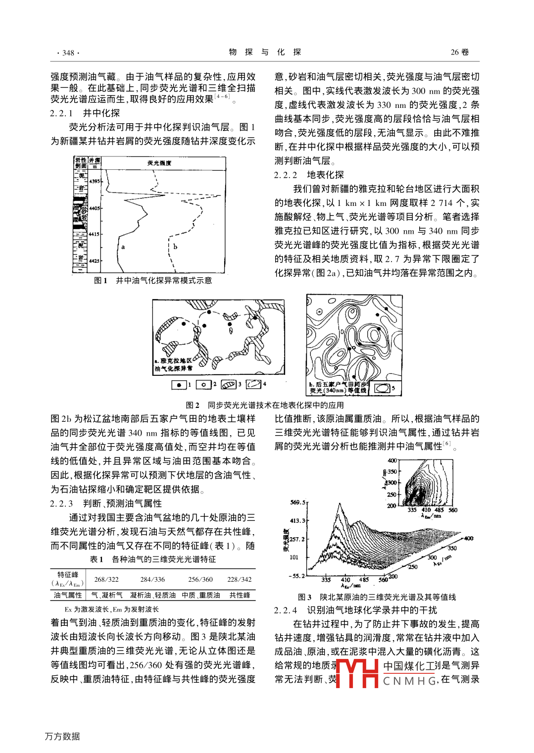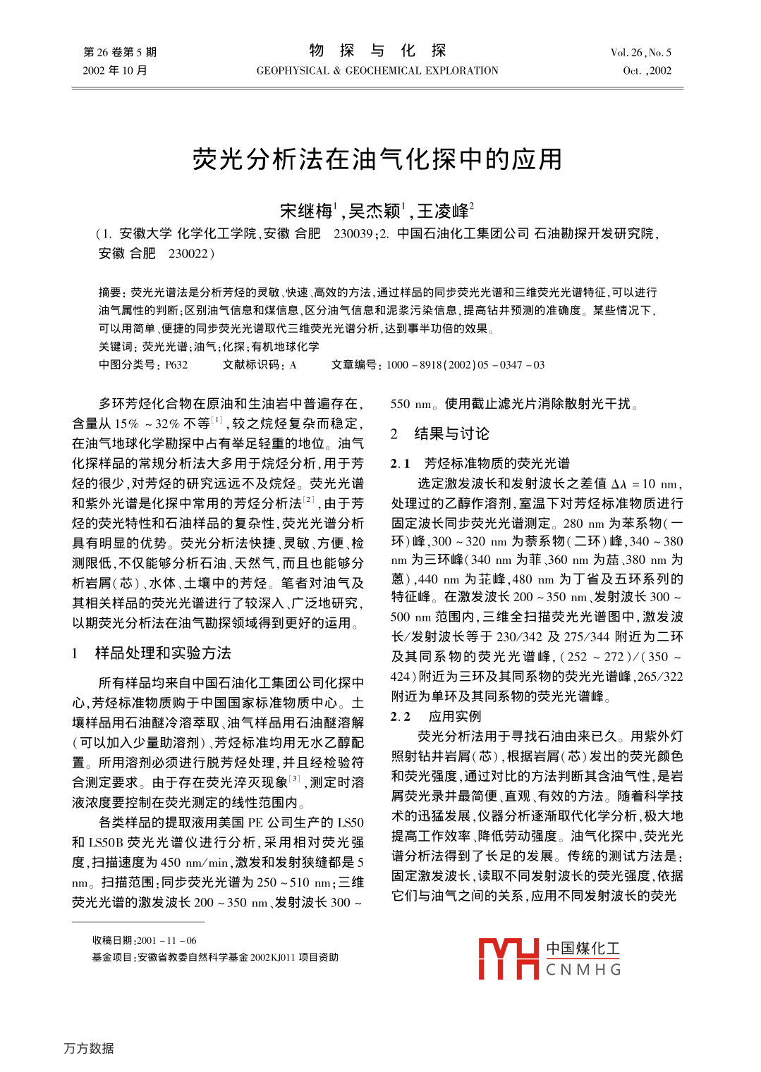 第26卷第5期物探與化探Vol 26. No 52002年10月GEOPHYSICAL GEOCHEMICAl EXPlOrationOct.,2002熒光分析法在油氣化探中的應(yīng)用宋繼梅,吳杰穎,王凌峰(1.安徽大學(xué)化學(xué)化工學(xué)院,安徽合肥230039;2.中國(guó)石油化工集團(tuán)公司石油勘探開(kāi)發(fā)研究院,安徽合肥230022)摘要:熒光光譜法是分析芳烴的靈敏、快速、髙效旳方法,通過(guò)樣品的同步熒光光譜和三維熒光光譜特征,可以進(jìn)行油氣屬性的判斷;區(qū)別油氣信息和煤信息,區(qū)分油氣信息和泥漿污染信息,提高鉆井預(yù)測(cè)的準(zhǔn)確度。某些情況下,可以用簡(jiǎn)單、便捷的同步熒光光譜取代三維熒光光譜分析,達(dá)到事半功倍的效果。關(guān)鍵詞:熒光光譜;油氣;化探;有機(jī)地球化學(xué)中圖分類(lèi)號(hào):P32文獻(xiàn)標(biāo)識(shí)碼:A文章編號(hào):1000-8918(2002)05-0347-03多環(huán)芳烴化合物在原油和生油巖中普遍存在,550m。使用截止濾光片消除散射光干擾。含量從15%~32%不等,較之烷烴復(fù)雜而穩(wěn)定,在油氣地球化學(xué)勘探中占有舉足輕重的地位。油氣2結(jié)果與討論化探樣品的常規(guī)分析法大多用于烷烴分析,用于芳2.Ⅰ芳烴標(biāo)準(zhǔn)物質(zhì)的熒光光譜烴的很少,對(duì)芳烴的研究遠(yuǎn)遠(yuǎn)不及烷烴。熒光光譜選定激發(fā)波長(zhǎng)和發(fā)射波長(zhǎng)之差值Δλ=10nm,和紫外光譜是化探中常用的芳烴分析法2,由于芳處理過(guò)的乙醇作溶劑,室溫下對(duì)芳烴標(biāo)準(zhǔn)物質(zhì)進(jìn)行烴的熒光特性和石油樣品的復(fù)雜性,熒光光譜分析固定波長(zhǎng)同步熒光光譜測(cè)定。280nm為苯系物(具有明顯的優(yōu)勢(shì)。熒光分析法快捷、靈敏、方便、檢環(huán))峰,300~320m為萘系物(二環(huán))峰,340~380測(cè)限低不僅能夠分析石油、天然氣,而且也能夠分m為三環(huán)峰(340mm為菲、360m為、380m為析巖屑(芯)、水體、土壤中的芳烴。筆者對(duì)油氣及蒽),410m為芘峰,480mm為丁省及五環(huán)系列的其相關(guān)樣品的鼓光光譜進(jìn)行了較深入廣泛地研究,特征峰。在激發(fā)波長(zhǎng)200-350m發(fā)射波長(zhǎng)30以期熒光分析法在油氣勘探領(lǐng)域得到更好的運(yùn)用500nm范圍內(nèi),三維全掃描熒光光譜圖中,激發(fā)波長(zhǎng)/發(fā)射波長(zhǎng)等于230/342及275/344附近為二環(huán)1樣品處理和實(shí)驗(yàn)方法及其同系物的熒光光譜峰,(252~272)/(350所有樣品均來(lái)自中國(guó)石油化工集團(tuán)公司化探中424)附近為三環(huán)及其同系物的熒光光譜峰,265/322心,芳烴標(biāo)準(zhǔn)物質(zhì)購(gòu)于中國(guó)國(guó)家標(biāo)準(zhǔn)物質(zhì)中心。土附近為單環(huán)及其同系物的熒光光譜峰。壤樣品用石油醚冷溶萃取、油氣樣品用石油醚溶解2·2應(yīng)用實(shí)例(可以加入少量助溶劑)、芳烴標(biāo)準(zhǔn)均用無(wú)水乙醇配熒光分析法用于尋找石油由來(lái)已久。用紫外燈置。所用溶劑必須進(jìn)行脫芳烴處理,并且經(jīng)檢驗(yàn)符照射鉆井巖屑(芯),根據(jù)巖屑(芯)發(fā)出的熒光顏色合測(cè)定要求。由于存在熒光淬滅現(xiàn)象,測(cè)定時(shí)溶和熒光強(qiáng)度通過(guò)對(duì)比的方法判斷其含油氣性,是巖液濃度要控制在熒光測(cè)定的線(xiàn)性范圍內(nèi)。屑熒光錄井最簡(jiǎn)便、直觀(guān)、有效的方法。隨著科學(xué)技各類(lèi)樣品的提取液用美國(guó)PE公司生產(chǎn)的LS5術(shù)的迅猛發(fā)展,儀器分析逐漸取代化學(xué)分析,極大地和IS50B熒光光譜儀進(jìn)行分析,采用相對(duì)熒光強(qiáng)提高工作效率降低勞動(dòng)強(qiáng)度。油氣化探中,熒光光度,掃描速度為450mm/min,激發(fā)和發(fā)射狹縫都是5譜分析法得到了長(zhǎng)足的發(fā)展。傳統(tǒng)的測(cè)試方法是mn掃描范圍同步熒光光譜為250~510m;三維固定激發(fā)波長(zhǎng)讀取不同發(fā)射波長(zhǎng)的熒光強(qiáng)度,據(jù)熒光光譜的激發(fā)波長(zhǎng)200-350mm、發(fā)射波長(zhǎng)300它們與油氣之間的關(guān)系,應(yīng)用不同發(fā)射波長(zhǎng)的熒光收稿日期:2001-11-06基金項(xiàng)目:安徽省教委自然科學(xué)基金2002KJ011項(xiàng)目資助中國(guó)煤化工CNMHG34物探與化探26卷強(qiáng)度預(yù)測(cè)油氣藏。由于油氣樣品的復(fù)雜性,應(yīng)用效意,砂巖和油氣層密切相關(guān),熒光強(qiáng)度與油氣層密切果一般。在此基礎(chǔ)上,同步熒光光譜和三維全掃描相關(guān)。圖中,實(shí)線(xiàn)代表激發(fā)波長(zhǎng)為300m的熒光強(qiáng)熒光光譜應(yīng)運(yùn)而生取得良好的應(yīng)用效果度,虛線(xiàn)代表激發(fā)波長(zhǎng)為330mm的熒光強(qiáng)度,2條2.2.1井中化探曲線(xiàn)基本同步,熒光強(qiáng)度高的層段恰恰與油氣層相熒光分析法可用于井中化探判識(shí)油氣層。圖1吻合,熒光強(qiáng)度低的層段,無(wú)油氣顯示。由此不難推為新疆某井鉆井巖屑的熒光強(qiáng)度隨鉆井深度變化示斷,在井中化探中根據(jù)樣品熒光強(qiáng)度的大小,可以預(yù)月性井熒光強(qiáng)度測(cè)判斷油氣層。2.2.2地表化探--我們?cè)鴮?duì)新疆的雅克拉和輪臺(tái)地區(qū)進(jìn)行大面積的地表化探,以1km×1km網(wǎng)度取樣2714個(gè),實(shí)施酸解烴、物上氣、熒光光譜等項(xiàng)目分析。筆者選擇雅克拉已知區(qū)進(jìn)行研究,以300mm與340mm同步熒光光譜峰的熒光強(qi
