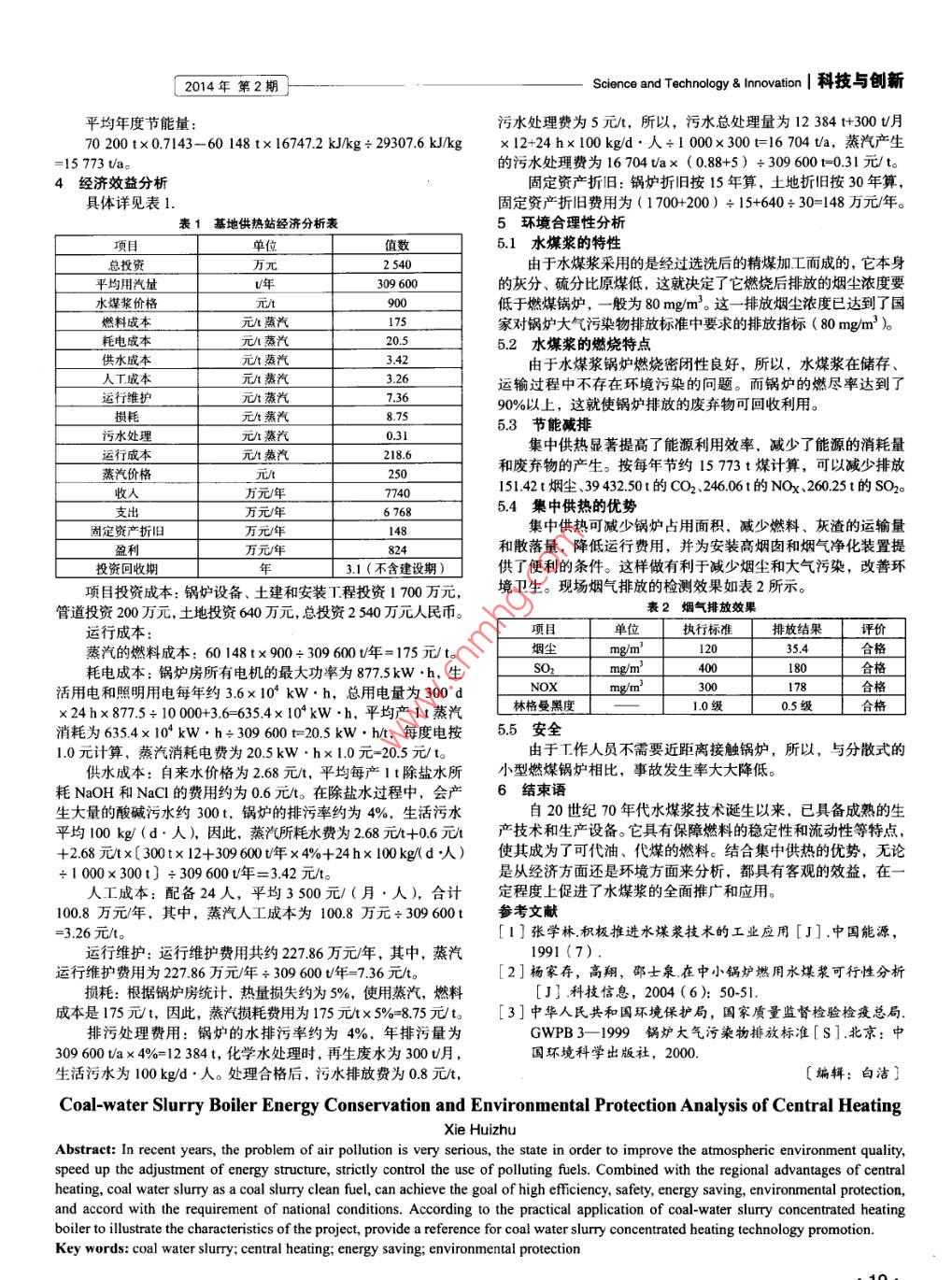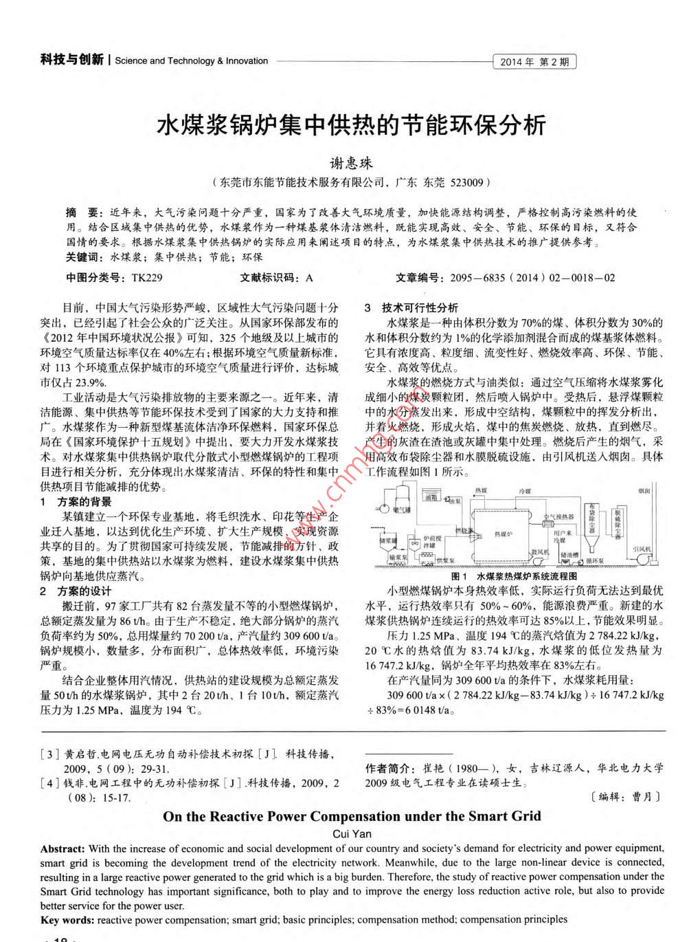科技與創(chuàng)新 Science and Technology& Innovation2014年第2期水煤漿鍋爐集中供熱的節(jié)能環(huán)保分析謝惠珠(東莞市東能節(jié)能技術(shù)服務(wù)有限公司,廣東東莞523009)摘要:近年來,大氣污染問題十分嚴(yán)重,國家為了改善大氣環(huán)境質(zhì)量,加快能源結(jié)構(gòu)調(diào)整,嚴(yán)格控制高污染燃料的使用。結(jié)合區(qū)域集中供熱的優(yōu)勢,水煤漿作為一種煤基漿體清潔燃料,既能實現(xiàn)高效、安全、節(jié)能、環(huán)保的目標(biāo),又符合國情的要求。根據(jù)水煤漿集中供熱鍋爐的實際應(yīng)用來闡述項目的特點,為水煤漿集中供熱技術(shù)的推廣提供參考。關(guān)鍵詞:水煤漿;集中供熱;節(jié)能;環(huán)保中圖分類號:TK229文獻(xiàn)標(biāo)識碼:A文章編號:2095-6835(2014)02-0018-02目前,中國大氣污染形勢嚴(yán)峻,區(qū)域性大氣污染問題十分3技術(shù)可行性分析突出,已經(jīng)引起了社會公眾的廣泛關(guān)注。從國家環(huán)保部發(fā)布的水煤漿是一種由體積分?jǐn)?shù)為70%的煤、體積分?jǐn)?shù)為30%的《2012年中國環(huán)境狀況公報》可知,325個地級及以上城市的水和體積分?jǐn)?shù)約為1%的化學(xué)添加劑混合而成的煤基漿體燃料。環(huán)境空氣質(zhì)量達(dá)標(biāo)率僅在40%左右;根據(jù)環(huán)境空氣質(zhì)量新標(biāo)準(zhǔn),它具有濃度高、粒度細(xì)、流變性好、燃燒效率高、環(huán)保、節(jié)能、對113個環(huán)境重點保護(hù)城市的環(huán)境空氣質(zhì)量進(jìn)行評價,達(dá)標(biāo)城安全、高效等優(yōu)點市僅占23.9%水煤漿的燃燒方式與油類似:通過空氣壓縮將水煤漿霧化工業(yè)活動是大氣污染排放物的主要來源之一。近年來,清成細(xì)小的煤炭顆粒閉,然后噴入鍋爐中。受熱后,懸浮煤顆粒潔能源、集中供熱等節(jié)能環(huán)保技術(shù)受到了國家的大力支持和推中的水分蒸發(fā)出來,形成中空結(jié)構(gòu),煤顆粒中的揮發(fā)分析出,廣。水煤漿作為一種新型煤基流體潔凈環(huán)保燃料,國家環(huán)??偛⒅鹑紵?形成火焰,煤中的焦炭燃燒、放熱,直到燃盡。局在《國家環(huán)境保護(hù)十五規(guī)劃》中提出,要大力開發(fā)水煤漿技產(chǎn)生的灰渣在渣池或灰罐中集中處理。燃燒后產(chǎn)生的煙氣,采術(shù)。對水煤漿集中供熱鍋爐取代分散式小型燃煤鍋爐的工程項用高效布袋除塵器和水膜脫硫設(shè)施,由引風(fēng)機(jī)送入煙囪。具體目進(jìn)行相關(guān)分析,充分體現(xiàn)出水煤漿清潔、環(huán)保的特性和集中工作流程如圖1所示。供熱項目節(jié)能減排的優(yōu)勢1方案的背景某鎮(zhèn)建立一個環(huán)保專業(yè)基地,將毛織洗水、印花等生產(chǎn)企葡氣罐氣預(yù)熱器業(yè)遷人基地,以達(dá)到優(yōu)化生產(chǎn)環(huán)境、擴(kuò)大生產(chǎn)規(guī)模、實現(xiàn)資源妒前捏=熱共享的目的。為了貫徹國家可持續(xù)發(fā)展,節(jié)能減排的方針、政策,基地的集中供熱站以水煤漿為燃料,建設(shè)水煤漿集中供熱6循環(huán)泵鍋爐向基地供應(yīng)蒸汽。圖1水煤漿熱煤爐系統(tǒng)流程圖2方案的設(shè)計小型燃煤鍋爐本身熱效率低,實際運(yùn)行負(fù)荷無法達(dá)到最優(yōu)搬遷前,97家工廠共有82臺蒸發(fā)量不等的小型燃煤鍋爐,水平,運(yùn)行熱效率只有50%~60%,能源浪費嚴(yán)重。新建的水總額定蒸發(fā)量為86th。由于生產(chǎn)不穩(wěn)定,絕大部分鍋爐的蒸汽煤漿供熱鍋爐連續(xù)運(yùn)行的熱效率可達(dá)85%以上,節(jié)能效果明顯負(fù)荷率約為50%,總用煤量約70200ta,產(chǎn)汽量約309600ta壓力1.25MPa、溫度194℃的蒸汽焓值為278422kJ/kg,鍋爐規(guī)模小,數(shù)量多,分布面積廣,總體熱效率低,環(huán)境污染20℃水的熱焓值為83.74kJ/kg,水煤漿的低位發(fā)熱量為嚴(yán)重。16747.2kJkg,鍋爐全年平均熱效率在83%左右。結(jié)合企業(yè)整體用汽情況,供熱站的建設(shè)規(guī)模為總額定蒸發(fā)在產(chǎn)汽量同為309600ta的條件下,水煤漿耗用量:量50th的水煤漿鍋爐,其中2臺20th、1臺10th,額定蒸汽309600tax(278422kJ/kg-83.74kJkg)÷16747.2kJkg壓力為1.25MPa,溫度為194℃?!?3%=60148t/a。3]黃啟哲電網(wǎng)電壓無功自動補(bǔ)償技術(shù)初探[J!科技傳播,2009,5(09):29-31作者簡介:崔艷(1980—),女,吉林遼源人,華北電力大學(xué)[4]錢非.電網(wǎng)工程中的無功補(bǔ)償初探[J]科技傳播,2009,22009級電氣工程專業(yè)在讀碩士生。(08):15-17〔編輯:曹月〕On the Reactive power Compensation under the smart gridCui YaAbstract: With the increase of economic and social development of our country and societys demand for electricity and power equipment,smart grid is becoming the development trend of the electricity network. Meanwhile, due to the large non-linear device is connected,resulting in a large reactive power generated to the grid which is a big burden. Therefore, the study of reactive power compensation under theSmart Grid technology has important significance, both to play and to improve the energy loss reduction active role, but also to providebetter service for the power user.Key words: reactive power compensation; smart grid; basic principles; compensation method; compensation principles2014年第2期Science and Technology& t Innovation|科技與創(chuàng)新平均年度節(jié)能量污水處理費為5元,所以,污水總處理量為12384t+300t月70200t×07143-60148t×16747.2kJ/kg÷29307.6kJ/kg×12+24h×100kg/d·人÷1000×3