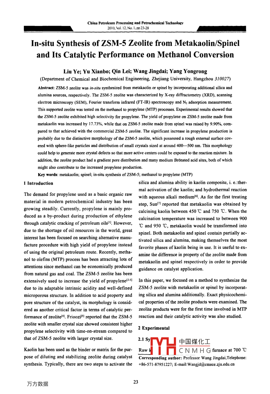 China Petroleum Processing and Petrochemical Technologv2010. Vol.12. No.1.Dp 23-28In-situ Synthesis of ZSM-5 Zeolite from Metakaolin/Spineland Its Catalytic Performance on Methanol ConversionLiu Ye; Yu Xianbo; Qin Lei; w ang Jingdai; Yang Yongrong(Department of Chemical and Biochemical Engineering, Zhejiang University, Hangzhou 310027)Abstract: ZSM-5 zeolite was in-situ syntbesized from metakaolin or spinel by incorporating additional silica andalumina sources, respectively. The ZSM-5 zeolite was characterized by X-ray diffractometry (XRD), scanningelctron microscopy (SEM), Fourier transform infrared (FT-IR) spectroscopy and N2 adsorption measurement.This supported zeolite was tested on the methanol to propylene (MTP) processes. Experimental results showed thatthe ZSM-s5 zeolite exhibited high sletivity for propylene. The yield of propylene on ZSM-5 zeolite made fommetakaolin was increased by 17.73%, while that on ZSM-5 zeolite made from spinel was raised by 9.90%, com-pared to that achieved with the commercial ZSM-5 zeolite. The significant increase in propylene production isprobably due to the distinctive morphology of the ZSM-5 zeolite, which possessed a rough extermal surface Cov-ered with sphere-like particles and distribution of small crystals sized at around 400- -500 nm. This morphologycould help to generate more crystal defects so that more active centers could be exposed to the reaction mixture. Inadition, the zeolite product had a gradient pore distribution and many medium Broinsted acid sites, both of whichmight also contribute to the increased propylene production.Key words: metakaolin; spinel; in-situ synthesis of ZSM-S; methanol to propylene (MTP)1 Introductionsilica and alumina ability in kaolin composite, i. e:ther-mal activation of the kaolin; and hydrothermal reactionThe demand for propylene used as a basic organic rawwith aqueous alkali mediumlol. As for the first treatingmaterial in modern petrochemical industry has beenstep, Sun'] reported that metakaolin was obtained bygrowing steadily. Currently, propylene is mainly pro-calcining kaolin between 450 C and 750 C. When theduced as a by-product during production of ethylenecalcination temperature was increased to between 900through catalytic cracking of petroleum oilsl!I. However,C and 950 C, metakaolin would be transformed intodue to the shortage of oil resources in the world, greatspinel. Both metakaolin and spinel contain partially ac-interest has been focused on searching alternative manu-tivated silica and alumina, making themselves the mostfacture procedure with high yield of propylene insteadfavorite phases of kaolin being in use. It is useful to ex-of using the original petroleum route. Recently, metha-amine the difference in property of the zeolite made fromnol to olefins (MTP) process has been atracting lots ofmetakaolin and spinel respectively in order to provideattentions since methanol can be economically producedguidance on catalyst application.from natural gas and coal. The ZSM-5 zeolite has beenextensively used to increase the yield of propylenel231 In this paper, we focused on a method to synthesize thedue to its adaptable intrinsic acidity and well-defined ZSM-5 zeolite with metakaolin or spinel by incorporat-microporous structure. In addition to acid property anding silica and alumina additionally. Exact physicochemi-pore structure of the catalyst, its morphology is consid- cal properties of the zeolite products were examined. Theered as another critial factor in terms of catalytic per- zeolite products were for the first time involved in MTPformance of zeolitel. Frioozil5] reported that the ZSM-5 reaction and their catalytic activity was also studied.zeolite with smaller crystal size showed consistent higher2 Experimentalpropylene selectivity with time-on-stream compared tothat of ZSM-5 zeolite with larger crystal size.2.1 Sy中國煤化工Kaoin has been used as the binder or matrix for the pur- Raw IMHCNMHGfurnaceat700Cpose of diluting and stabilizing zeolite during catalyst Corresponding author: Professor Wang Jingdai,Telepbone:synthesis. Typically, there are two steps to activate the +86-571-87951227; E-mail:Wangjd@cmsce.zju.edu.cnLiu Ye, et aL In-situ Synthesis of ZSM-5 Zeolite from Metakaolin/Spinel and Its Catalytic Performance onMethanol Conversionand 950 C for 4 h, respctively, to obtain metakaolin detector (FID) coupled with a 30-m plot-Q capillaryand spinel. RK, MK and SK are used hereinafter to stand column.for raw kaolin, metakaolin and spinel, respectively. Dur-3 Results and Discussioning the synthesis process, water glass, ethylenediamine(EDA) and MK or SK were frst added into dstlld water. Kaolinite [AlSiO;(OH)4] is the main mineral phase inA mixture of sulfuric acid and aluminum sulfate was in- kaolin. It is composed of two interlayer surfaces com-silled dropwise to the solution to obtain the following bined by hydrogen bonding interaction, with one sur-molar ratio: 40MK (SK): 80SiO: 10EDA: 1Al2O;: 3100 face of slion atoms in tetrahedral positins and anotherH2O. Aluminum sulfate and water glass were used as surface of aluminum atoms in octahedral positions8-9.supplementary alumina and silica sources. After contin- After calcination treatment, aluminum atoms in one ka-ued stiring at room temperature for 2 h, the slurry was olin surface would transform from octabedral positionsremoved into an autoclave and the mixture was hydro- to tetrahedral positions with higher activity. The envi-thermally treated at 180 C for 40 h. Then the product ronment of silicon atoms becomes distorted and finallywas washed with distilled water three times, driedat 110 amorphous silica is liberatedlI01 along with a dehydroxylationC overmight and calcined at 550 C to remove the template. process. Amounts of these activated silica and aluminaThe ZSM-5 sample obtained thereby is referred to as species in kaolin are altered with an increasing calcina-ZSM-5 zeolite made from metakaolin (MZ) or ZSM-5 tion temperat