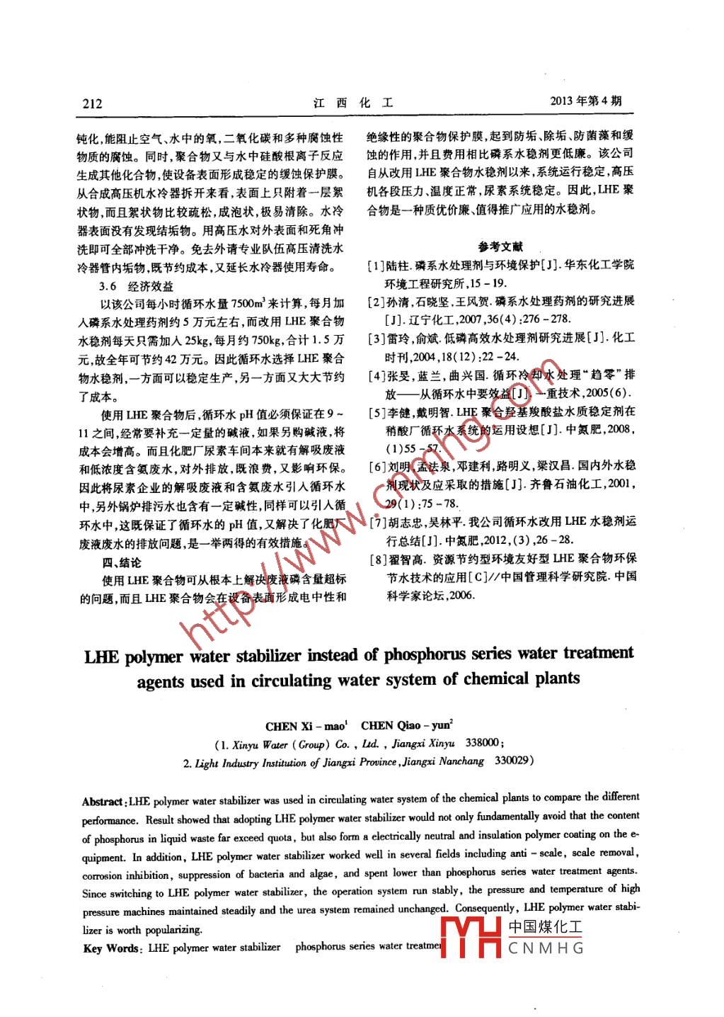 2013年12月化工廠循環(huán)水系統(tǒng)用lhe水穩(wěn)劑代替磷系水處理劑的應(yīng)用研究209化工廠循環(huán)水系統(tǒng)用LHE水穩(wěn)劑代替磷系水處理劑的應(yīng)用研究陳細(xì)任’陳巧 云(1.新余水務(wù)集團(tuán)有限公司,江西新余338000;2.江西省輕工業(yè)研究所,江西南昌3300290)摘要:對(duì)新余市某大型化工企業(yè)循環(huán)水系統(tǒng)采用LHE聚合物水處理劑的前后使用效果進(jìn)行了對(duì)比研究,結(jié)果發(fā)現(xiàn)使用LHE聚合物不但可從根本上解決廢液磷含量超標(biāo)的問(wèn)題,而且LHE聚合物會(huì)在設(shè)備表面形成電中性和絕緣性的聚合物保護(hù)膜,其不但防垢、除垢、防菌藻和緩蝕的效果優(yōu)異。而且費(fèi)用相比磷系水穩(wěn)劑低廉。自從改用LHE聚合物水穩(wěn)劑以來(lái),系統(tǒng)運(yùn)行穩(wěn)定,高壓機(jī)各段壓力溫度都正常,尿素系統(tǒng)穩(wěn)定。是值得廣泛推廣的一種水穩(wěn)劑。關(guān)鍵詞:LHE聚合物水穩(wěn)劑磷系水處理藥劑 經(jīng)濟(jì)效益--簡(jiǎn)介基于以上原因,尋找一種新型且使用效果好的水工業(yè)循環(huán)水處理主要包括阻垢、緩蝕、殺菌和滅處理劑成為企業(yè)正常的重要任務(wù)。LHE聚合物水穩(wěn)藻。通常使用的是磷系水處理藥劑" ,其在實(shí)際生產(chǎn)劑i5)是一種含羥基酸鹽結(jié)構(gòu)聚合物的水處理藥劑,不運(yùn)行中出現(xiàn)一些問(wèn)題:如合成高壓機(jī)、冰機(jī)水冷器、尿含磷和金屬元素。LHE聚合物具有多個(gè)絡(luò)合螯合位,素水冷器結(jié)垢等[2]。我們都知道,當(dāng)碳鋼表面附著一能使循環(huán)水中幾乎所有多價(jià)金屬離子被絡(luò)合,并逐漸層污垢后,它的導(dǎo)熱系數(shù)明顯要下降幾十倍[3]1 ,因此只轉(zhuǎn)化為不溶性沉淀物,菌藻失去了賴以生存的可溶性在換熱器表面形成-層薄薄的污垢,就將嚴(yán)重影響換微量營(yíng)養(yǎng)元素[°-7]。聚合物與鈣、鎂離子形成的絮狀熱器的換熱效果,影響生產(chǎn)。導(dǎo)致高壓機(jī)水冷器冷卻物"],也會(huì)使菌藻微生物原生幼體被不斷地包裹而清效果差,高壓機(jī)各段超壓、超溫,打氣量差;在尿素生產(chǎn)除。中冷卻效果差,造成低壓系統(tǒng)超壓,蒸發(fā)系統(tǒng)真空度低鑒于其優(yōu)良的性能,我們?cè)谀炒笮突す臼褂玫?另外對(duì)于水冷器易出現(xiàn)腐蝕,水冷器使用壽命縮了LHE聚合物的水處理系統(tǒng)來(lái)代替常規(guī)的磷系水處理短;冷卻器結(jié)垢后必須在大修時(shí)拆開,再請(qǐng)專業(yè)清洗隊(duì)藥劑,并對(duì)使用效果進(jìn)行了對(duì)比。伍清洗,有的還有可能由于結(jié)垢嚴(yán)重?zé)o法清洗而報(bào)廢,二、實(shí)驗(yàn)增加成本投資。該化工公司循環(huán)水系統(tǒng)總循環(huán)水量約7500m'/h,另外,目前磷系水處理藥劑的循環(huán)水中總磷含量主要供合成車間和尿素車間水冷器冷卻用水。該公司-般為8~11mg/L。而國(guó)家標(biāo)準(zhǔn)[4)規(guī)定:現(xiàn)有企業(yè)自循環(huán)水系統(tǒng)蒸發(fā)水量約80m'/h, 補(bǔ)充水量約120m’/h,2010年7月1日起及新建企業(yè)自2008年7月1日起,排污水量約32m'/h,因此,每天的排水量約800m'。其水污染物排放限值為總磷≤0.5mg/L。而這種污水排之前使用的水處理劑主要是磷系水處理藥劑。從2010放明顯超標(biāo),違反環(huán)保有關(guān)規(guī)定。因此尋求一種無(wú)磷年10月28日開始使用LHE聚合物的水處理系統(tǒng)。水穩(wěn)劑來(lái)代替磷系水穩(wěn)劑,是勢(shì)在必行。2.1使用 LHE的控制指標(biāo)表1循環(huán)水控制指標(biāo)控制指標(biāo)最佳值分析次數(shù)pH值9~11每班1~2次懸浮物mg/L50~ 80每星期1~2次硬度≤800中國(guó)煤化工堿度≥400YHCNMHG210江西化工2013年第4期總鐵mg/L≥0.5每星期1~2次氯離子≤120(碳鋼)每班1次≤800 (不銹鋼)2.1.1 pH 值10之間。使用LHE聚合物,循環(huán)水中pH值必須控制在8.52.2.2日 常加藥量以上,該種藥劑可在較高pH值下運(yùn)行,根據(jù)實(shí)踐運(yùn)行日常加藥量按每m'循環(huán)水中加藥量為3~5g計(jì),情況,pH值的上限可達(dá)12以上,但有銅質(zhì)設(shè)備的一般我公司每小時(shí)循環(huán)量為7500 m' ,則每藥量為7500x(3宜小于9.5。由于藥劑與垢離子絡(luò)合成不溶物,在旁~5) x10-3 =22. 5 ~37.5kg,因此每天加1包(25kg)流處理或沉積池中沉積而不斷與循環(huán)水分離,循環(huán)水LHE聚合物,加熱溶解后加人水中,循環(huán)水的顏色一般的堿度和pH值不僅不會(huì)隨循環(huán)水的濃縮而提高,反而為淡白色,經(jīng)過(guò)幾天循環(huán)后,pH值穩(wěn)定在8.9左右,但.會(huì)降低或平衡在-個(gè)相對(duì)穩(wěn)定的范圍內(nèi),這與磷系水要時(shí)而補(bǔ)充堿液。為了穩(wěn)定循環(huán)水的pH值,可將帶有處理是不同的。弱堿性的尿素車間廢液引至循環(huán)水中,通過(guò)廢液連續(xù)2.1.2氯離子濃度不斷地補(bǔ)充,保證了循環(huán)水的pH值在指標(biāo)內(nèi)。循環(huán)水系統(tǒng)若是碳鋼材質(zhì),水中氯離子宜小于2.3.循環(huán)水流速1200mg/L;若是不銹鋼材質(zhì),則應(yīng)小于800mg/L為宜,循環(huán)水的流速不小于0. 9m/s,有利于管道內(nèi)和換總的原則是循環(huán)水中氯離子和可溶鹽份越低,腐蝕性熱部位懸浮物高速流動(dòng)不沉積。循環(huán)水系統(tǒng)應(yīng)有較大就越小。的沉淀池、合適