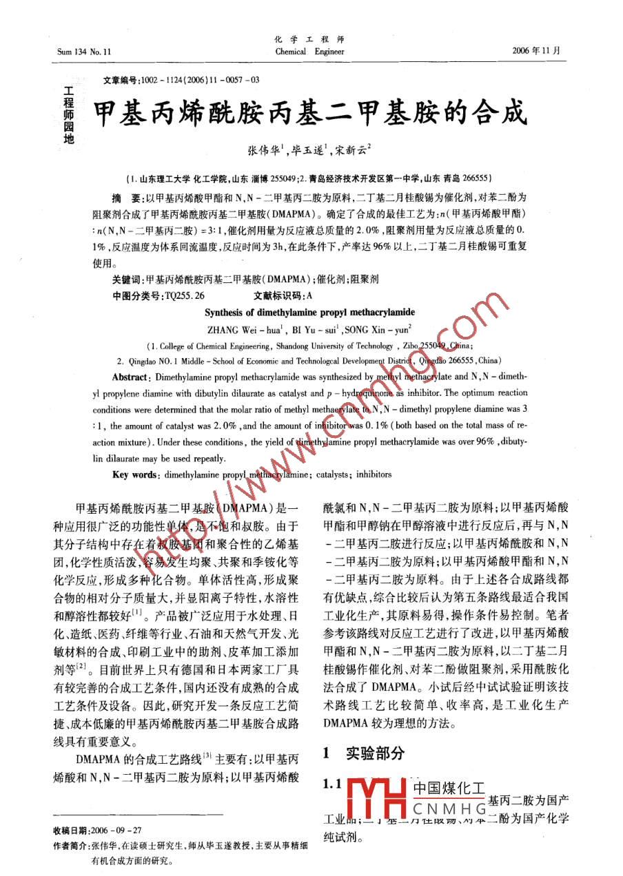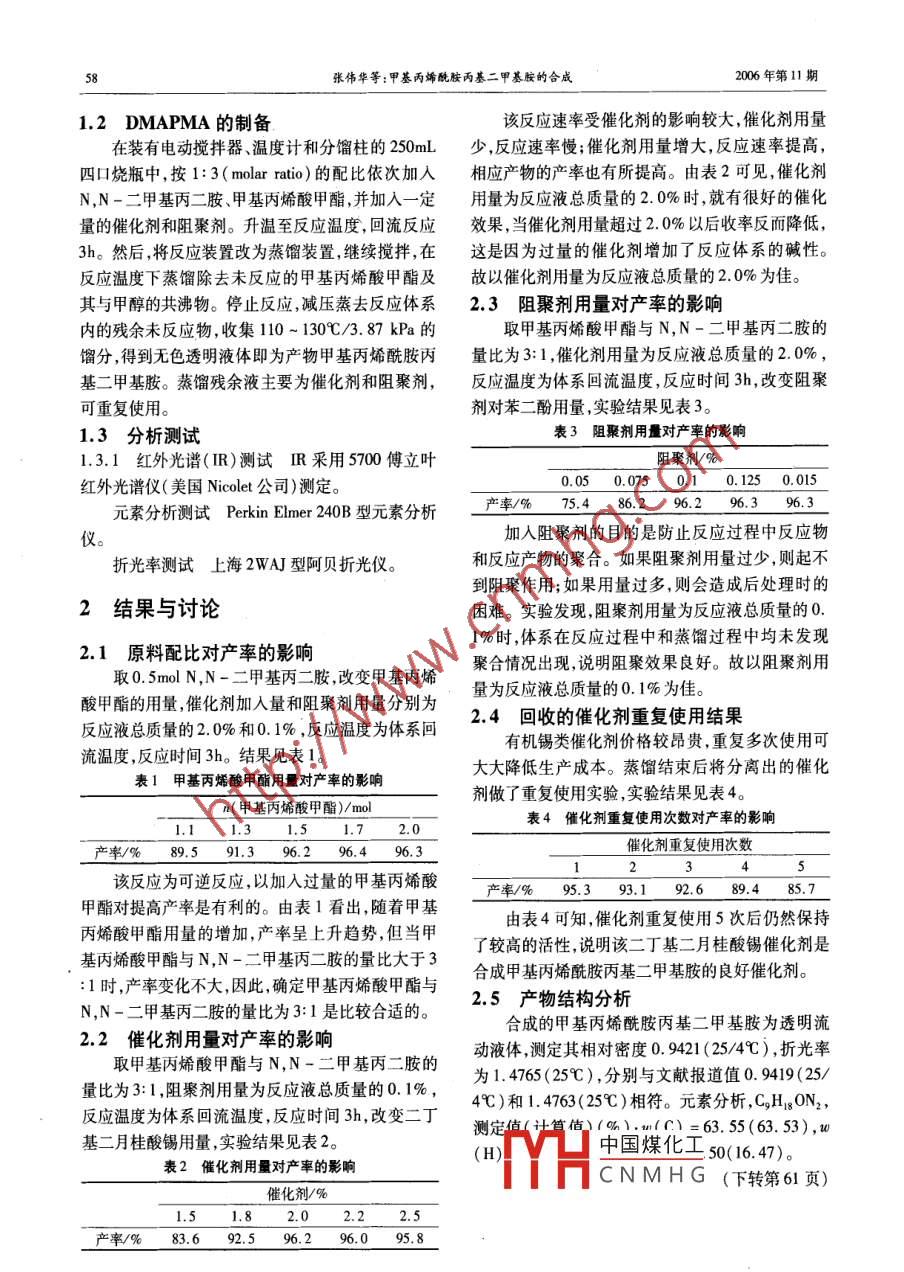 化學工程師Sum 134 No 11Chemical Engineer2006年11月文章編號:1002-1124(2006)11-0057-03甲基丙烯酰胺丙基二甲基胺的合成張偉華,畢玉遂,宋新云2(1.山東理工大學化工學院,山東淄博25549;2青島經濟技術開發(fā)區(qū)第一中學山東青島2655摘要:以甲基丙烯酸甲酯和N,N-二甲基丙二胺為原料,二丁基二月桂酸錫為催化劑,對苯二酚為阻聚劑合成了甲基丙烯酰胺丙基二甲基胺( DMAPMA)。確定了合成的最佳工藝為:n(甲基丙烯酸甲酯)n(N,N-二甲基丙二胺)=3:1,催化劑用量為反應液總質量的2.0%,阻聚劑用量為反應液總質量的01%,反應溫度為體系回流溫度,反應時間為3h,在此條件下,產率達96%以上,二丁基二月桂酸錫可重復使用。關鍵詞:甲基丙烯酰胺丙基二甲基胺( DMAPMA);催化劑;阻聚劑中圖分類號:TQ255.26文獻標識碼:ASynthesis of dimethylamine propyl methacrylamideZHANG Wei-hua, BI Yu-sui, SONG Xin-yu1. College of Chemical Engineering, Shandong University of Technology, Zibo 255049, China;2. Qingdao NO I Middle-School of Economic and Technologcal Development District, Qingdao 266555, China)Abstract: Dimethylamine propyl methacrylamide was synthesized by methyl methacrylate and N, N-dimeth-conditions were determined that the molar ratio of methyl methacrylate to N, N-dimethyl propylene diamine was 3the amount of catalyst was 2.0%, and the amount of inhibitor was 0. 1%(both based on the total mass ofaction mixture). Under these conditions, the yield of dimethylamine propyl methacrylamide was over 96%, dibutylin dilaurate may be used repeatlyKey words: dimethylamine propyl methacrylamine; catalysts; inhibitors甲基丙烯酰胺丙基二甲基胺( DMAPMA)是一酰氯和NN-二甲基丙二胺為原料;以甲基丙烯酸種應用很廣泛的功能性單體,是不飽和叔胺。由于甲酯和甲醇鈉在甲醇溶液中進行反應后,再與N,N其分子結構中存在著叔胺基團和聚合性的乙烯基二甲基丙二胺進行反應;以甲基內烯酰胺和N,N團,化學性質活潑,容易發(fā)生均聚、共聚和季銨化等二甲基丙二胺為原料;以甲基丙烯酸甲酯和N,N化學反應,形成多種化合物。單體活性高,形成聚甲基丙二胺為原料。由于上述各合成路線都合物的相對分子質量大,并顯陽離子特性,水溶性有優(yōu)缺點綜合比較后認為第五條路線最適合我國和醇溶性都較好。產品被廣泛應用于水處理、日工業(yè)化生產,其原料易得,操作條件易控制。筆者化、造紙、醫(yī)藥、纖維等行業(yè)、石油和天然氣開發(fā)、光參考該路線對反應工藝進行了改進,以甲基丙烯酸敏材料的合成、印刷工業(yè)中的助劑、皮革加工添加甲酯和N,N-二甲基丙二胺為原料,以二丁基二月劑等2。目前世界上只有德國和日本兩家工廠具桂酸錫作催化劑、對苯二酚做阻聚劑,采用酰胺化有較完善的合成工藝條件,國內還沒有成熟的合成法合成了 DMAPMA。小試后經中試試驗證明該技工藝條件及設備。因此,研究開發(fā)一條反應工藝簡術路線工藝比較簡單、收率高,是工業(yè)化生產捷成本低廉的甲基丙烯酰胺丙基二甲基胺合成路 DMAPMA較為理想的方法。線具有重要意義。DMAPMA的合成工藝路線主要有:以甲基丙1實驗部分烯酸和NN三甲基內膠為原科:以甲基內酸11TV凵中國煤化工CNMHG基丙二胺為國產工業(yè)住取、平二酚為國產化學收稿日期:2006-09-27純試劑作者簡介:張偉華,在讀碩士研究生,師從畢玉遂教授,主要從事精細有機合成方面的研究張偉華等:甲基丙烯酰胺丙基二甲基胺的合成2006年第11期1.2 DMAPMA的制備該反應速率受催化劑的影響較大,催化劑用量在裝有電動攪拌器、溫度計和分餾柱的250mL少,反應速率慢;催化劑用量增大,反應速率提高四口燒瓶中按1:3( molar ratio)的配比依次加入相應產物的產率也有所提高。由表2可見,催化劑NN-二甲基丙二胺、甲基丙烯酸甲酯并加入一定用量為反應液總質量的2.0%時,就有很好的催化量的催化劑和阻聚劑。升溫至反應溫度,回流反應效果,當催化劑用量超過20%以后收率反而降低,3h。然后,將反應裝置改為蒸餾裝置,繼續(xù)攪拌,在這是因為過量的催化劑增加了反應體系的堿性反應溫度下蒸餾除去未反應的甲基丙烯酸甲酯及故以催化劑用量為反應液總質量的2.0%為佳。其與甲醇的共沸物。停止反應,減壓蒸去反應體系2.3阻聚劑用量對產率的影響內的殘余未反應物,收集110-130℃/3.87kPa的取甲基丙烯酸甲酯與N,N-二甲基丙二胺的餾分,得到無色透明液體即為產物甲基丙烯酰胺丙量比為3:1,催化劑用量為反應液總質量的2.0%,基二甲基胺。蒸餾殘余液主要為催化劑和阻聚劑,反應溫度為體系回流溫度,反應時間3h,改變阻聚可重復使用。劑對苯二酚用量,實驗結果見表3。1.3分析測試表3阻聚劑用量對產率的影響1.3.1紅外光譜(IR)測試IR采用5700傅立葉阻聚劑/%紅外光譜儀(美國 Nicolet公司)測定0.050.0750.10.1250.015元素分析測試 Perkin Elmer240B型元素分析產率/%75486.296.296.3儀加入阻聚劑的目的是防止反應過程中反應物折光率測試上海2WAJ型阿貝折光儀。和反應產物的聚合。如果阻聚劑用量過少,則起不到阻聚作用;如果用量過多,則會造成后處理時的2結果與討論困難。實驗發(fā)現(xiàn),阻聚劑用量為反應液總質量的01%時,體系在反應過程中和蒸餾過程中均未發(fā)現(xiàn)2.1原料配比對產率的影響聚合情況出現(xiàn),說明阻聚效果良好。故以阻聚劑用取0.5molN,N-二甲基丙二胺,改變甲基丙烯量為反應液總質量的0.1%為佳。酸甲酯的用量,催化劑加入量和阻聚劑用量分別為反應液總質量的20%