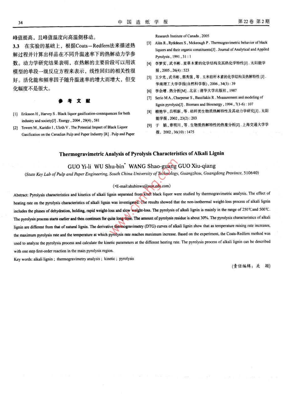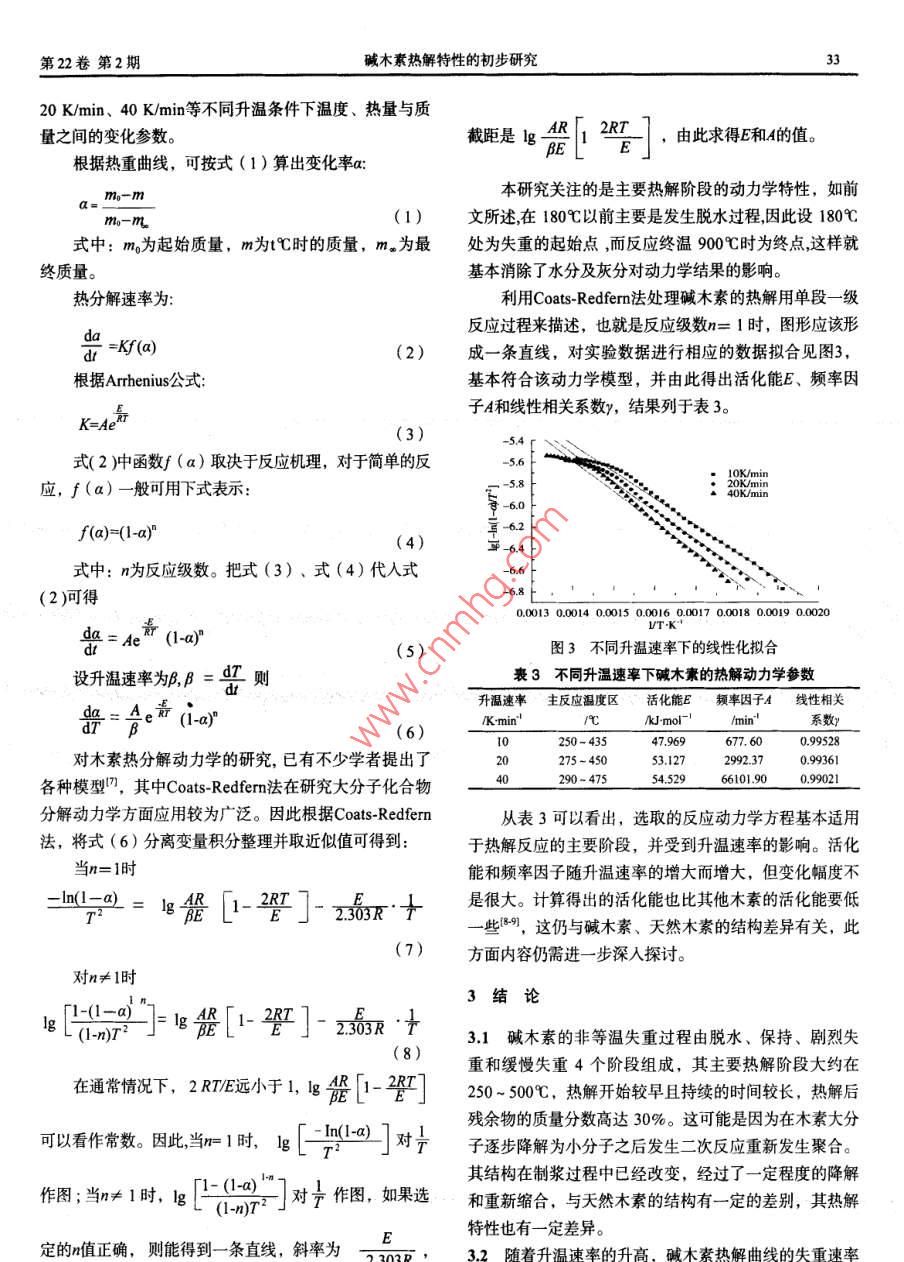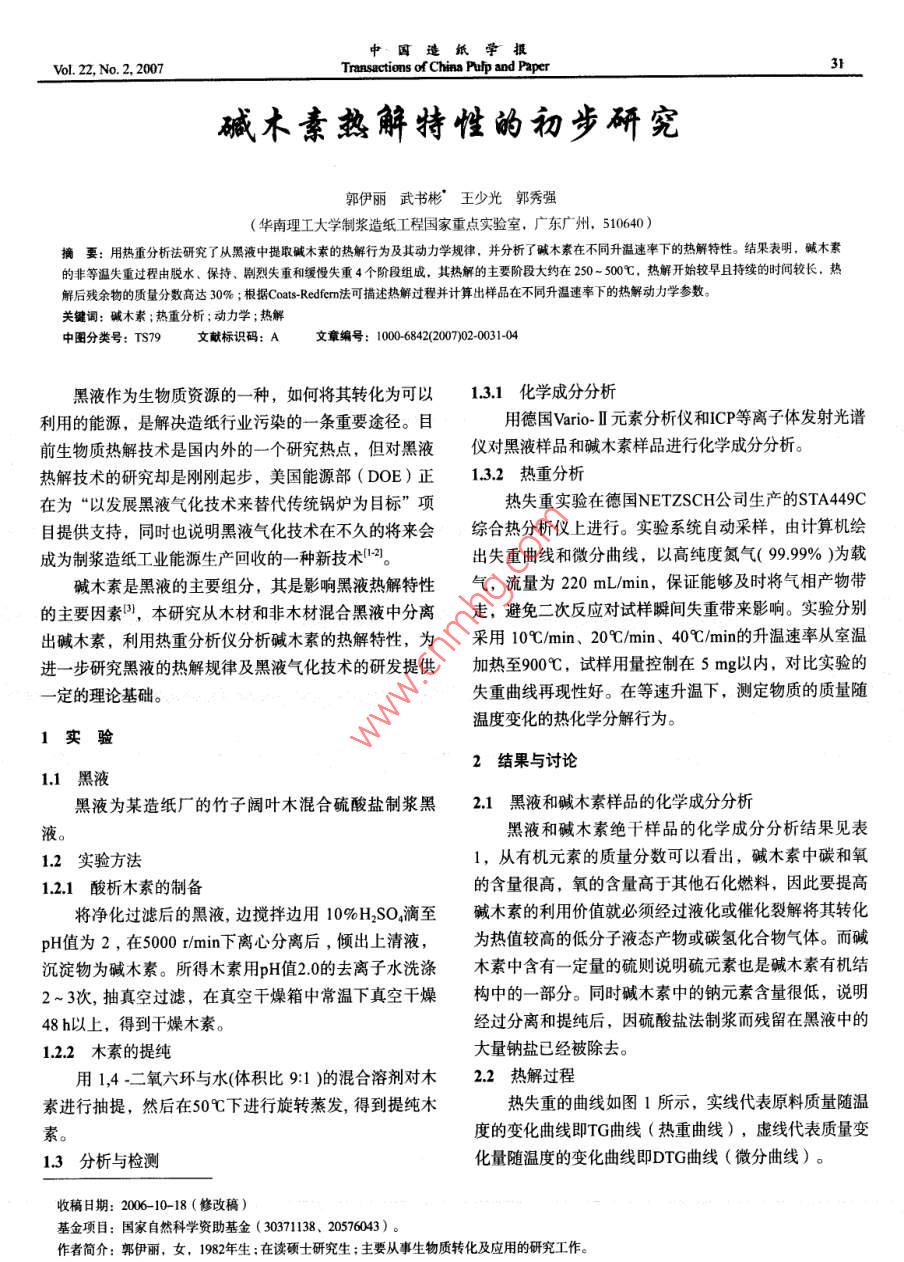 中國造紙學(xué)報vol.22,No.2,2007ransactions of China Pulp and paper堿木素?zé)峤馓匦缘某醪窖芯抗聋愇鋾颉蓖跎俟夤銖?華南理工大學(xué)制漿造紙工程國家重點實驗室,廣東廣州,510640)擴要:用熱重分析法研究了從黑液中提取堿木素的熱解行為及其動力學(xué)規(guī)律,并分析了堿木素在不同升溫速率下的熱解特性。結(jié)果表明,堿木素的非等溫失重過程由脫水、保持、劇烈失重和緩慢失重4個階段組成,其熱解的主要階段大約在250-50℃,熱解開始較早且持續(xù)的時間較長,熱解后殘余物的質(zhì)量分數(shù)高達30%;根據(jù) Coats-Redfcrm法可描述熱解過程并計算出樣品在不同升溫速率下的熱解動力學(xué)參數(shù)關(guān)鍵詞:堿木素;熱重分析;動力學(xué);熱解中圖分類號:TS79文獻標識碼:A文章編號:10006842(2007)020031-04黑液作為生物質(zhì)資源的一種,如何將其轉(zhuǎn)化為可以13.1化學(xué)成分分析利用的能源,是解決造紙行業(yè)污染的一條重要途徑。目用德國 vario-Ⅱ元素分析儀和CP等離子體發(fā)射光譜前生物質(zhì)熱解技術(shù)是國內(nèi)外的一個研究熱點,但對黑液儀對黑液樣品和堿木素樣品進行化學(xué)成分分析。熱解技術(shù)的研究卻是剛剛起步,美國能源部(DOE)正1.32熱重分析在為“以發(fā)展黑液氣化技術(shù)來替代傳統(tǒng)鍋爐為目標”項熱失重實驗在德國 NETZSCH公司生產(chǎn)的STA449C目提供支持,同時也說明黑液氣化技術(shù)在不久的將來會綜合熱分析儀上進行。實驗系統(tǒng)自動采樣,由計算機繪成為制漿造紙工業(yè)能源生產(chǎn)回收的一種新技術(shù)2出失重曲線和微分曲線,以高純度氮氣(9999%9)為載堿木素是黑液的主要組分,其是影響黑液熱解特性氣,流量為220mL/min,保證能夠及時將氣相產(chǎn)物帶的主要因素,本研究從木材和非木材混合黑液中分離走,避免二次反應(yīng)對試樣瞬間失重帶來影響。實驗分別出堿木素,利用熱重分析儀分析堿木素的熱解特性,為采用10℃/min、20℃/min、40℃/min的升溫速率從室溫進一步研究黑液的熱解規(guī)律及黑液氣化技術(shù)的研發(fā)提供加熱至900℃,試樣用量控制在5mg以內(nèi),對比實驗的定的理論基礎(chǔ)。失重曲線再現(xiàn)性好。在等速升溫下,測定物質(zhì)的質(zhì)量隨溫度變化的熱化學(xué)分解行為。1實驗2結(jié)果與討論11黑液黑液為某造紙廠的竹子闊葉木混合硫酸鹽制漿黑1黑液和堿木素樣品的化學(xué)成分分析液黑液和堿木素絕干樣品的化學(xué)成分分析結(jié)果見表12實驗方法1,從有機元素的質(zhì)量分數(shù)可以看出,堿木素中碳和氧121酸析木素的制備的含量很高,氧的含量高于其他石化燃料,因此要提高將凈化過濾后的黑液,邊攪拌邊用10%H2SO4滴至堿木素的利用價值就必須經(jīng)過液化或催化裂解將其轉(zhuǎn)化pH值為2,在500min下離心分離后,傾出上清液,為熱值較高的低分子液態(tài)產(chǎn)物或碳氫化合物氣體。而堿沉淀物為堿木素。所得木素用pH值20的去離子水洗滌木素中含有一定量的硫則說明硫元素也是堿木素有機結(jié)2~3次,抽真空過濾,在真空干燥箱中常溫下真空干燥構(gòu)中的一部分。同時堿木素中的鈉元素含量很低,說明48h以上,得到干燥木素。經(jīng)過分離和提純后,因硫酸鹽法制漿而殘留在黑液中的1.22木素的提純大量鈉鹽已經(jīng)被除去。用1,4.二氧六環(huán)與水(體積比91)的混合溶劑對木2.2熱解過程素進行抽提,然后在50℃下進行旋轉(zhuǎn)蒸發(fā),得到提純木熱失重的曲線如圖1所示,實線代表原料質(zhì)量隨溫素度的變化曲線即TG曲線(熱重曲線),虛線代表質(zhì)量變13分析與檢測化量隨溫度的變化曲線即DrG曲線(微分曲線)收稿日期:2006-10-18(修改稿)基金項目:國家自然科學(xué)資助基金(30371138、20576043)。作者簡介:郭伊麗,女,1982年生:在讀碩士研究生;主要從事生物質(zhì)轉(zhuǎn)化及應(yīng)用的研究工作。第22卷第2期表1黑液與堿木素樣品的化學(xué)成分的檢測與升溫速率密切相關(guān)。升溫速率快往往不利于中元素的質(zhì)量分數(shù)%分間產(chǎn)物的檢出,因為TG曲線上的拐點很不明顯。升溫速黑液0530121814332306(慢可得到明確的實驗結(jié)果,在熱重法中,采用高的升堿木素0206201865333036015溫速率一般對熱重曲線的測定不利含量/ mg.kg Ca Cu FeMg黑液2926l1.7368.17167672328148808446升溫速率增加,樣品顆粒達到熱解所需溫度的響應(yīng)堿木素32108214203210294114332536時間變短,有利于熱解;但是,升溫速率的增加使顆粒注S的質(zhì)量分數(shù)為未含無機物中硫元素的質(zhì)量分數(shù);O質(zhì)量分數(shù)的測定采內(nèi)外的溫差變大,顆粒外層的熱解氣來不及擴散,有可用差減能影響內(nèi)部熱解的進行。因此,生物質(zhì)熱解的快慢取決于這兩個相反過程的主次關(guān)系圖2為不同升溫速率下純堿木素樣品的TG和DTG0.10曲線。由圖2可知,不同升溫速率下熱重曲線的形狀基0.15本一致;分解溫度隨升溫速率的變化而改變,但失重量0.20保持恒定。40℃/min的TG曲線與10℃min的TG曲線相殘余物:35比,其拐點較不明顯,即升溫速率過快往往不利于中間3763℃產(chǎn)物的檢出。8001000圖1提純堿木素的TG和DTG曲線90在升溫速率(20℃/min)一定的情況下,隨著溫度的升高,木素的熱解經(jīng)歷了幾個不同的階段。由圖1可0.10見,熱失重主要分為4個階段。坦60第1階段從室溫到180℃,DTG曲線有個小的峰,