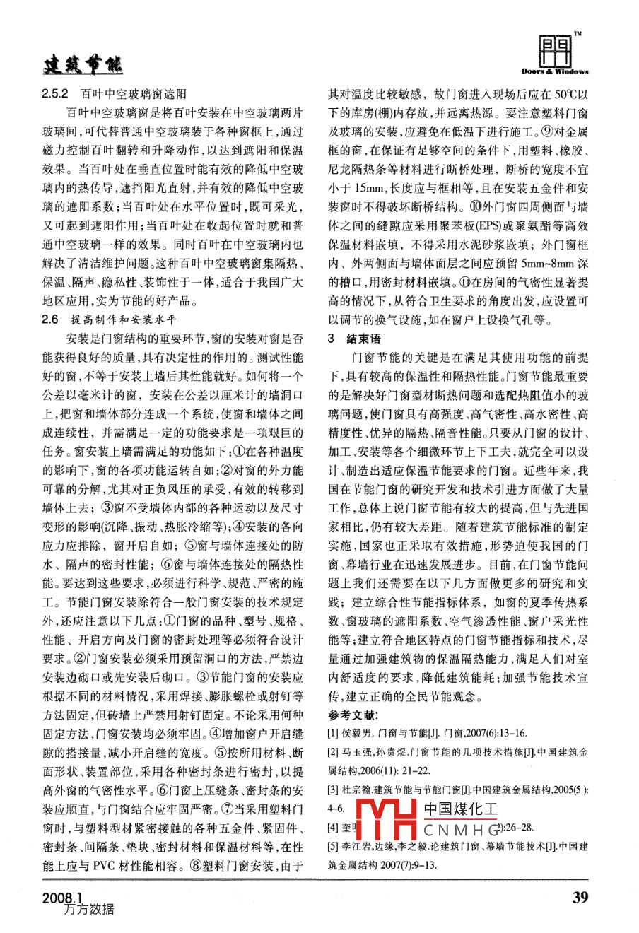 日舊Doory windows建筑節(jié)能門窗的節(jié)能技術(shù)與方法王艷武漢儀表電子學(xué)校張志超中國建筑第三工程局摘要:分析了門窗傳熱原理,探討了門窗的節(jié)能途徑,提出了門窗在各個環(huán)節(jié)上的節(jié)能措施。關(guān)鍵詞:門窗;節(jié)能;技術(shù);途徑1門窗節(jié)能概述室溫的影響也越小。③窗墻比系數(shù)與朝向。窗墻比例窗戶是建筑外圍結(jié)構(gòu)的開口部位之一,是建筑是指外窗的面積與外墻面積之比。通常門窗的傳熱的“眼睛”,它在建筑與環(huán)境的協(xié)調(diào)上擔(dān)負(fù)著人與自熱阻比墻體的傳熱熱阻要小得多,因此,建筑的冷然、戶內(nèi)與戶外、既溝通又分離的多重實用功能。窗熱耗量隨窗墻面積比的增加而增加。作為建筑節(jié)能戶還有保溫、隔熱、遮陽、抗風(fēng)雨、擋噪聲等種種作的一項措施要求在滿足采光通風(fēng)的條件下確定適宜用。同時,門窗是建筑物熱交換、熱傳導(dǎo)最活躍、最的窗墻比。一般而言,不同朝向的太陽輻射強(qiáng)度和日敏感部位,是圍護(hù)結(jié)構(gòu)保溫的薄弱環(huán)節(jié),是墻體熱損照率不同,窗戶所獲得的太陽輻射熱也不相同。失的5-6倍。從對建筑能耗組成的分析中,人們發(fā)門窗節(jié)能途徑主要是保溫隔熱。其措施包括:①現(xiàn)通過門窗所損失的能量是十分嚴(yán)重的,是影響建提高窗戶的保溫性能;②提高窗戶的隔熱性能,③提高筑熱環(huán)境和造成能耗過高的主要原因傳統(tǒng)建筑中,門窗的氣密性。而門窗的隔熱保溫能力最終體現(xiàn)在以通過門窗的傳熱量占建筑總能耗20%以上;節(jié)能建下兩個方面:其一,門窗框(扇)型材和玻璃傳遞輻射熱筑中,隨著墻體釆用保溫材料后熱阻的增大,門窗的耗能量;其二,通過門窗縫隙對流滲透冷熱風(fēng)耗能量。熱損失占建筑總能耗的比例更大除了提高門窗的制作質(zhì)量外,增設(shè)密封條是提從傳熱學(xué)的角度考慮,門窗上的能量損失來自高門窗氣密性的手段之三個方面:即對流、傳導(dǎo)和輻射。對流就是在門窗的2門窗的節(jié)能技術(shù)空隙間冷熱氣流運(yùn)動,導(dǎo)致熱量交換,反映的是門窗2.1選擇節(jié)能窗型的氣密性;傳導(dǎo)是通過玻璃和窗用型材將一面的熱窗型是影響節(jié)能性能的第一要素。推拉窗的節(jié)量傳導(dǎo)到另一面,由分子運(yùn)動進(jìn)行熱量傳遞;輻射是能效果差,而平開窗和固定窗的節(jié)能效果優(yōu)越。因太陽輻射的紅外線傳遞得熱。其過程包括:通過玻推拉窗沿窗框下滑軌來回滑動,上部有較大的空間璃進(jìn)入建筑的太陽輻射熱量;通過玻璃的傳熱損失;下部有滑輪間的空隙,窗扇上下形成明顯的對流交通過窗格與窗框的熱損失;窗洞口熱橋造成的熱損換,熱冷空氣的對流形成較大的熱損失,因此,不論失;縫隙冷風(fēng)滲透造成的熱損失采用何種隔熱型材作窗框,都達(dá)不到節(jié)能效果。平影響門窗能量損耗大小的因素很多,主要有以開窗的窗扇和窗框間一般有橡膠密封壓條,在窗扇下幾方面:①門窗的傳熱系數(shù)。門窗的傳熱系數(shù)是關(guān)閉后,密封條被壓得很緊,幾乎沒有空隙,很難形指在單位時間內(nèi)通過單位面積的傳熱量。傳熱系數(shù)成對流,熱量流失主要是玻璃、窗扇和窗框型材本身越大,則在冬季通過門窗的熱量損失就越大,而門窗的熱傳導(dǎo)、輻射散熱和窗扇與窗框接觸位置的空氣的傳熱系數(shù)又與門窗的材料類型有關(guān)。②門窗的滲漏,以及窗框與墻體之間的空氣滲漏等,熱損失相氣密性。門窗的氣密性是指在門窗關(guān)閉狀態(tài)下,阻對減中國煤化工內(nèi),玻璃直接安裝止空氣滲透的能力。門窗氣密性等級的高低,對熱在窗CNMHG或者密封膠密封量的損失影響極大,室外風(fēng)力變化會對室溫產(chǎn)生不空氣很難通過密封膠形成對流,很難造成熱損失。在利的影響,氣密性等級越高,則熱量損失就越少,對固定窗上,玻璃和窗框熱傳導(dǎo)為主要熱損失的來源,362008.1建筑節(jié)能如果在玻璃上采取有效措施,就可以大大提高節(jié)能形式,有良好的強(qiáng)度,另外隔熱條中的玻璃纖維排列效果。因此從結(jié)構(gòu)上講,固定窗是最節(jié)能的窗型。有序,能夠長時間承受高拉應(yīng)力和高剪切應(yīng)力,隔熱2.2確定合適的窗墻比和朝向條的線形膨脹系數(shù)接近鋁,有非常好的加工性能;同般來說,窗戶的傳熱系數(shù)大于同朝向、同面積時內(nèi)、外型材可以由不同顏色和表面處理方式的型的外墻傳熱系數(shù),因此,能量的損失隨著窗墻比例的材組成,增強(qiáng)了裝飾效果;并且可抗多種酸、堿化學(xué)增加而增加。在采光和通風(fēng)允許的條件下,控制窗物質(zhì)的腐蝕。再加上鋁合金的陽極氧化、電泳噴漆墻比例比設(shè)置保溫窗簾和窗板更加有效,即窗墻面塑料噴涂、氟碳噴涂等著色技術(shù)的發(fā)展,鋁合金節(jié)能積比設(shè)計越小,熱量損耗就越小,節(jié)能效果越佳。熱門窗幕墻深受歡迎。量損耗還與外窗的朝向有關(guān),南、北朝向的窗戶太陽2.32玻璃輻射強(qiáng)度和日照率高,窗戶所獲得的太陽輻射熱多。在窗戶中,玻璃面積占窗戶面積的65%-75%。在《民用建筑節(jié)能設(shè)計標(biāo)準(zhǔn)(采暖居住建筑部分》普通玻璃的熱阻值很小,而且對遠(yuǎn)紅外熱輻射幾乎完中,雖然對窗墻面積