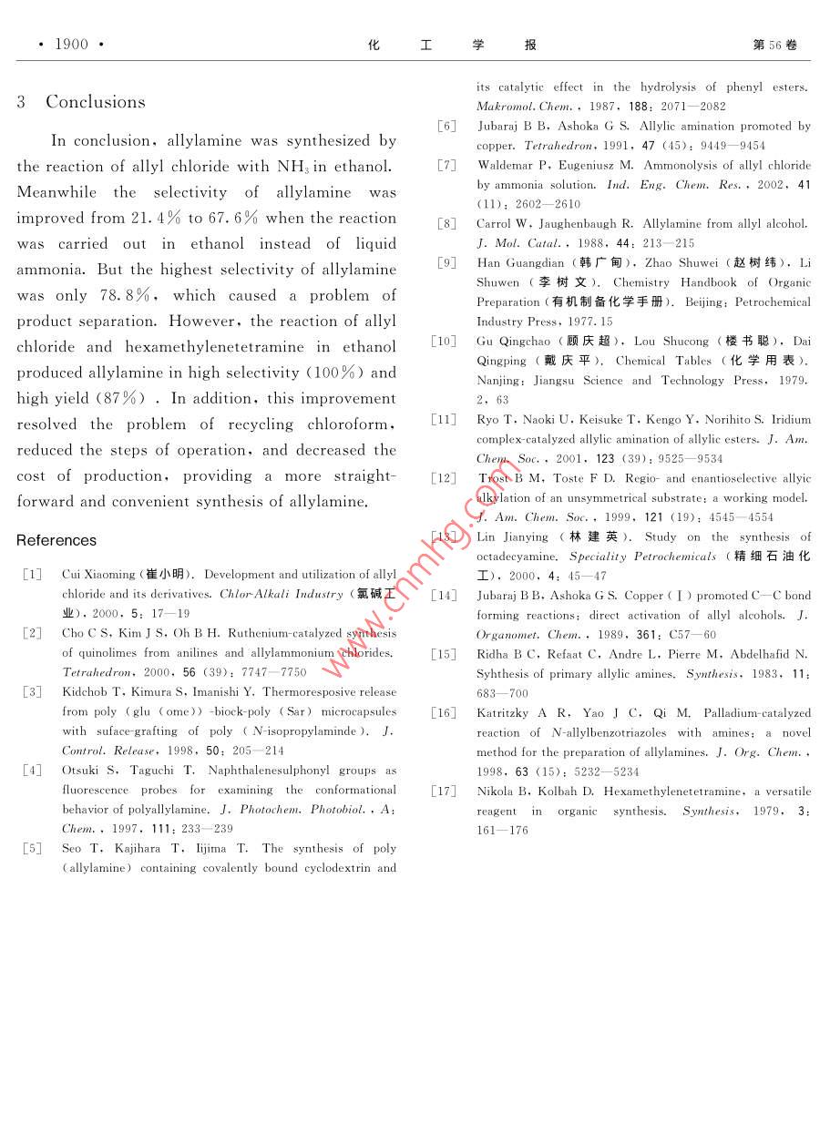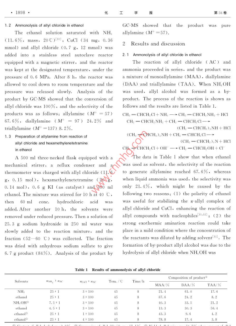 第56卷第10期化工學(xué)報(bào) Vol. 56 No. 102005年10月 Journal of Chemical Industry and Engineering (China) October 2005研究簡(jiǎn)報(bào) Synthesis of allylamine in ethanol222222 TANG Bingtao(唐炳濤), ZHANG Shufen(張淑芬, YANG Jinzong(楊錦宗) (State Key Laboratory of Fine Chemicals, Dalian University of Technology, Dalian 116012, Liaoning, China) Abstract: Allylamine was prepared from the ammonolysis of allyl chloride or the reaction of allyl chloride with hexamethylenetetramine in ethanol. The selectivity of allylamine was improved from 21. 4% to 67.6% when the reaction was carried out in ethanol instead of liquid ammonia. At the same time, the selectivity of allylamine was increased from 13. 3% to 67.6% when the molar ratio of NH, to allyl chloride was increased from 4.5: 1 to 25: 1. However, the reaction of allyl chloride and hexamethylenetetramine in ethanol produced allylamine with high selectivity(100%) and high yield(87%). The synthesis of allylamine from the reaction of allyl chloride and hexamethylenetetramine in ethanol was more straightforward and convenient. Key words: allyl chloride; allylamine; synthesis; hexamethylenetetramine CLC number: TQ 612.9 Document code: A Article ID:0438-1157(2005)10-1897-04 Introduction Moreover, allyl alcohol was formed as a by-product when aqueous ammonia was used for the Allylamine is a versatile organic intermediate. amination. Although the selectivity of allylamine It is useful as a corrosion inhibitor for steel11, and by the ammonolysis of allyl alcohol could reach is also used for the synthesis of quinolines[]. The 90%[8], the conversion of allyl alcohol was very polymer of allylamine can also be molded into low and the reaction conditions were quite severe. microcapsules3], polymeric fluorescence probes4] In this paper, two more straightforward and and polymeric catalytic carrier5. Allylamine is convenient methods of synthesis of allylamine by commonly prepared from ammonolysis of allyl (1) ammonolysis of allyl chloride in ethanol, and chloride6]. The process proceeds with low (2) reaction of allyl chloride and hexamethylene- selectivity of allylamine, and the selectivity of the tetramine in ethanol are reported. The results of transformation to allylamine, diallylamine and experiments showed that the selectivity of allylamine triallylamine depends on reaction temperature, reached 78. 8% and 100% respectively when NH3 and reaction time, molar ratio of NH3 /allyl chloride hexamethylenetetramine were used. and molar ratio of CuCl /allyl chloride. 1 Experimental 1. 1 Reagents and instruments Received date: 2004-10-12. Ethanol, NH. OH, potassium iodide and First author: TANG Bingtao, male, born in 1976, PhD hexamethylenetetramine were analytically pure candidate Corresponding author: Prof. ZHANG Shufen.- mail: reagents. CuCl was prepared according to the zhangshf@chem.dlut.edu.cn method described by Han, et al.The Foundation item: supported by Trans century Training determination of the ratio of allylamine, Program Foundation for the Talents by the State Education methylamine, diallylamine and triallylamine in the Commission and the National Natural Science Foundation of China11111111898·化工學(xué)報(bào)第56卷 1.2 Ammonolysis of allyl chloride in ethanol GC-MS showed that the product was pure The ethanol solution saturated with NH: allylamine (M+=57).(11.6%,mass,20c)o,CuCl(34mg,0.36 2 Results and discussion mmol) and allyl chloride (0. 7 g, 12 mmol) was added into a stainless steel autoclave reactor 2. 1 Ammonolysis of allyl chloride in ethanol equipped with a magnetic stirrer, and the reactor The reaction of allyl chloride(ac)and was kept at the designated temperature, under the ammonia proceeded in series, and the product was pressure of 0.6 MPa. After 8 h, the reactor was a mixture of monoallylamine (MAA),diallylamine allowed to cool down to room temperature and the (DAA)and triallylamine (TAA). When NH,OH pressure was released slowly. Analysis of the was used, allyl alcohol was formed as a by- product by GC-MS showed that the conversion of product. The process of the reaction is shown as allyl chloride was 100%, and the selectivity of the follows and the results are listed in Table 1. products was as follows: allylamine (M*=57) CH2 -CHCH2+ NH: CH2 -CHCH: NH2 +HCI67.6%, diallylamine(m+=97)24.2% and CH2=chch2n2+ch2=CCH2Cl→ triallylamine (M*=137)8.2%. (CH2 -CHCH: )2NH+HCI 1.3 Preparation of allylamine from reaction of (CH2-CHCH2 )2NH+CH2-CHCH: Cl allyl chloride and hexamethylenetetramine in ethanol A 500 ml three-necked flask equipped with a The data in Table show that when ethanol mechanical stirrer, a reflux condenser and a was used as solvent, the selectivity of the reaction thermometer was charged with allyl chloride (11.6 to generate allylamine reached 67.6%, whereasg,0.15mol), hexamethylenetetramine(20g, when liquid ammonia was used, the selectivity was 0.14 mol), 0.6 g KI (as catalyst) and 300 ml only 21.4%, which might be caused by the ethanol. The mixture was stirred for 10 at 40 C, following two reasons: (1) the polarity of ethanol then 60 ml conc. hydrochloric acid was was useful for stabilizing the x-allyl complex of added. After another 10 h, the solvents were allyl chloride and CuCl, enhancing the reaction of removed under reduced pressure. Then a solution of allyl compounds with nucleophiles1, 12; ()the 25.3 g sodium hydroxide in 250 ml water was strong exothermic amination reaction could take slowly added to the reaction mixture, and the place in a mild condition where the concentration of fraction (52 60 C) was collected. The fraction the reactants was diluted by adding solvent3). The was dried with anhydrous sodium sulfate to give formation of by-product allyl alcohol was due to the 6. 7 g product (84%). Analysis of the product by hydrolysis of allyl chloride when NH, OH was Table 1 Results of ammonolysis of allyl chloride Composition of product Solvents FINH,AC nCuClnAc Tem. /C Ti