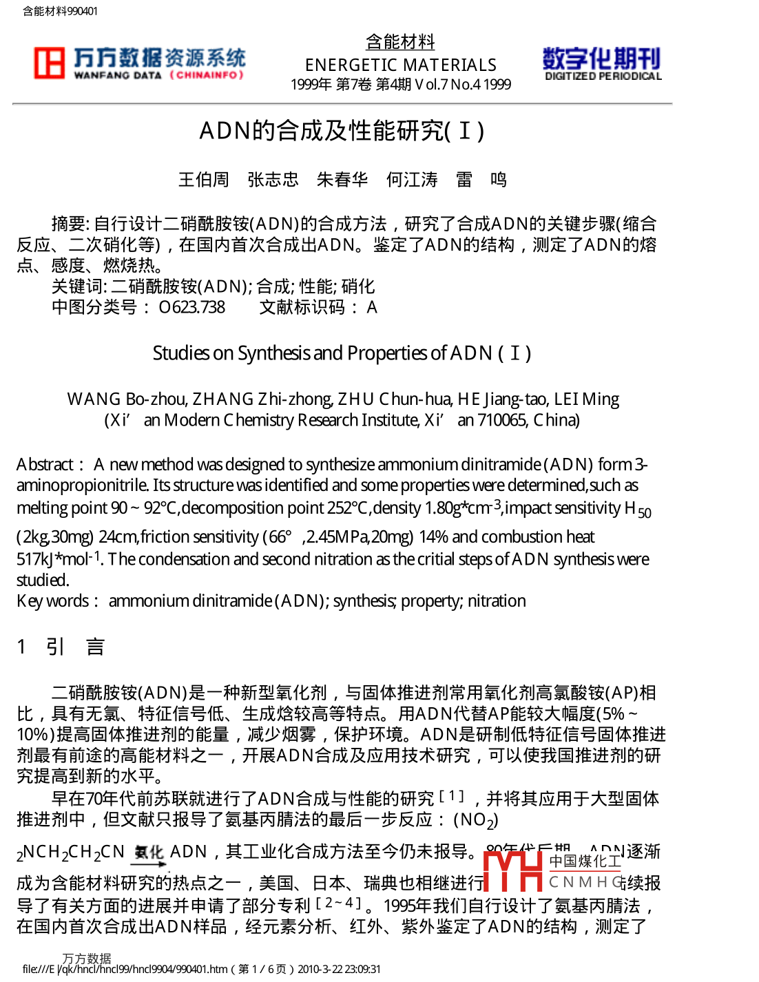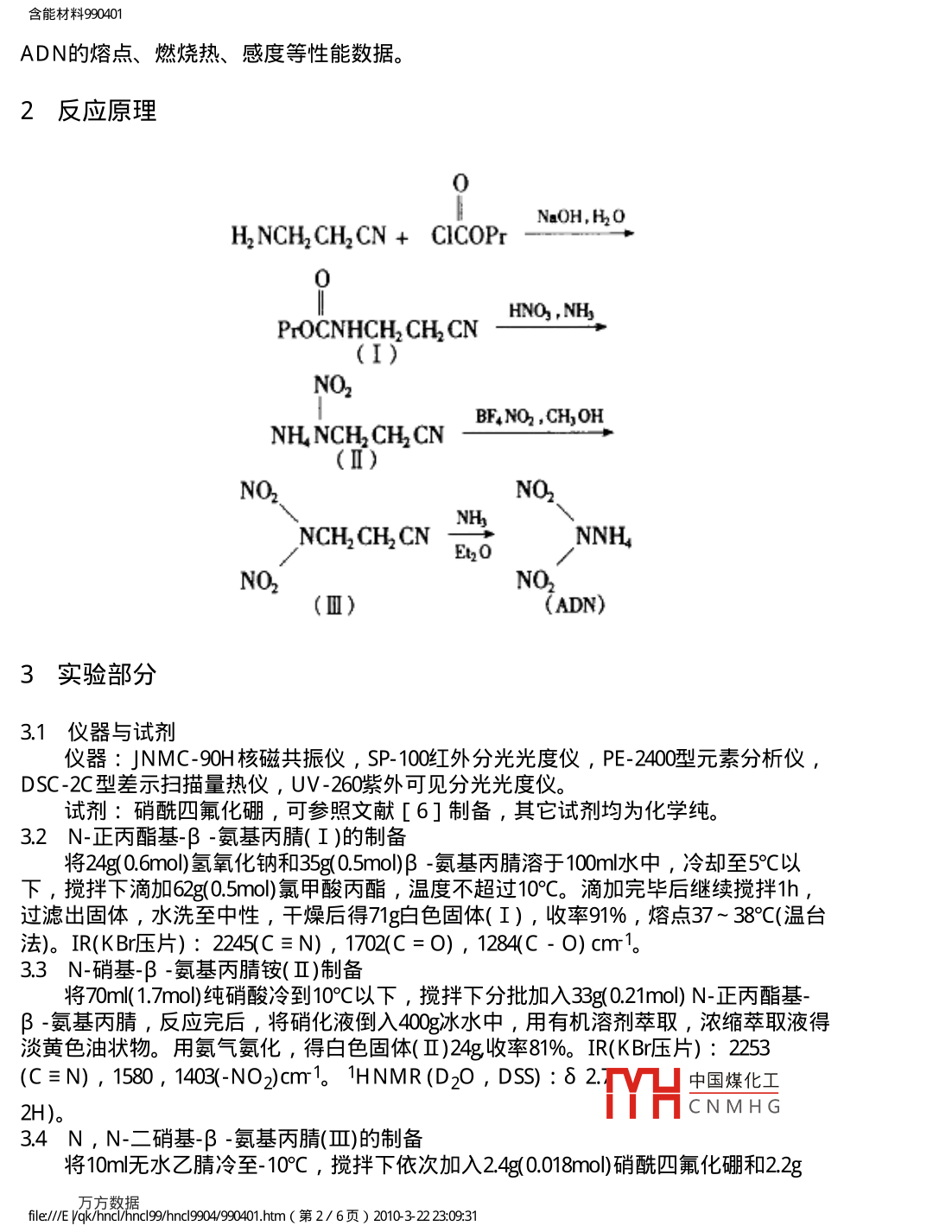 含能材料990401含能材料日資源系統(tǒng)ENERGETIC MATERIALS數(shù)字化期刊WANFANG DATA ( CHINAINFO)DIGITIZED PE RIODICAL1999年第7卷第4期V ol.7No.4 1999ADN的合成及性能研究( I)王伯周張志忠朱春華何江濤雷鳴摘要:自行設(shè)計二硝酰胺銨(ADN)的合成方法,研究了合成ADN的關(guān)鍵步驟(縮合反應(yīng)、二次硝化等) ,在國內(nèi)首次合成出ADN。鑒定了ADN的結(jié)構(gòu),測定了ADN的熔點、感度、燃燒熱。關(guān)鍵詞:二硝酰胺銨(ADN);合成;性能;硝化中圖分類號: 0623.738文獻(xiàn)標(biāo)識碼: AStudies on Synthesis and PropertiesofADN( I)WANG Bo-zhou, ZHANG Zhi-zhong, ZHU Chun-hua, HE Jjiang- tao, LEI Ming(Xi' an Modern Chemistry Research Institute, Xi' an 710065, C hina)Abstract : A new method was designed to synthesize ammonium dinitramide (AD N) form3-aminopropionitrile. Its structure was identified and some properties were determined,such asmelting point 90 ~ 92°C,decomposition point 252°C,density 1.80g*cm3,impact sensitivity H 50(2kg30mg) 24cm,friction sensitivity (66° ,2.45MPa,20mg) 14% and combustion heat517kJ*mol-1. The condensation and second nitration as thecritial steps of ADN synthesiswerestudied.Key words : ammonium dinitramide(AD N); synthesis, property; nitration1引言二硝酰胺銨(ADN)是-種新型氧化劑,與固體推進(jìn)劑常用氧化劑高氯酸銨(AP)相比,具有無氯、特征信號低、生成焓較高等特點。用ADN代替AP能較大幅度(5%~10% )提高固體推進(jìn)劑的能量,減少煙霧,保護(hù)環(huán)境。AD N是研制低特征信號固體推進(jìn)劑最有前途的高能材料之一, 開展ADN合成及應(yīng)用技術(shù)研究,可以使我國推進(jìn)劑的研究提高到新的水平。早在70年代前蘇聯(lián)就進(jìn)行了ADN合成與性能的研究[1] , 并將其應(yīng)用于大型固體推進(jìn)劑中, 但文獻(xiàn)只報導(dǎo)了氨基丙腈法的最后一步反應(yīng): (NO2)2NCH2CH2CN氨化ADN ,其工業(yè)化合成方法至今仍未報導(dǎo)。9年代后期5I逐漸中國煤化工'成為含能材料研究的熱點之一,美國、日本、瑞典也相繼進(jìn)行YHCNMH陸續(xù)報導(dǎo)了有關(guān)方面的進(jìn)展并申請了部分專利[2~4]。1995年我們自行設(shè)計了氨基丙腈法,在國內(nèi)首次合成出ADN樣品,經(jīng)元素分析、紅外、紫外鑒定了ADN的結(jié)構(gòu), 測定了fle://E/ vnhnn/91h9n1994/990401.htm (第1/ 6頁) 2010-3-22 23:09:31含能材料990401ADN的熔點、燃燒熱、感度等性能數(shù)據(jù)。2反應(yīng)原理0NaOH, HOH2NCH2CH2CN + CICOPrPrOCNHCH2CH2CNHNO3 ,NHy.(I)NO2NH NCH2CH2CNBFA NOh ,CHOH_NO2.NCH2 CH2CNExONNH(M)(ADN)3實驗部分3.1儀器與試劑儀器: JNMC-90H核磁共振儀, SP- 100紅外分光光度儀, PE- 2400型元素分析儀,DSC-2C型差示掃描量熱儀, UV-260紫外可見分光光度儀。試劑:硝酰四氟化硼,可參照文獻(xiàn)[6]制備,其它試劑均為化學(xué)純。3.2 N- 正丙酯基-β -氨基丙腈( I )的制備將24g( 0.6mo)氫氧化鈉和35g( 0.5mol)β -氨基丙腈溶于100ml水中, 冷卻至5°C以下,攪拌下滴加62g(0.5mol)氯甲酸丙酯,溫度不超過10°C。 滴加完畢后繼續(xù)攪拌1h過濾出固體,水洗至中性,干燥后得71g白色固體( I) ,收率91% ,熔點37 ~ 38°C(溫臺法)。IR(KBr壓片) : 2245(C=N) , 1702(C=0) , 1284(C - 0) cmr1。3.3 N- 硝基_β -氨基丙腈銨( I )制備將70ml( 1.7mol)純硝酸冷到10°C以下,攪拌下分批加入33g( 0.21mol) N-正丙酯基-β -氨基丙腈,反應(yīng)完后,將硝化液倒入400g冰水中,用有機(jī)溶劑萃取,濃縮萃取液得淡黃色油狀物。用氨氣氨化,得白色固體( I )24g,收率81%。IR(KBr壓片) : 2253(C=N) , 1580,1403(-NO2)cm1。 1HNMR(D20,DSS) :δ 2中國煤化工2H)。TYHCNM HG3.4 N , N-二硝基-β -氨基丙腈()的制備將10ml無水乙腈冷至-10°C , 攪拌下依次加入2.4g( 0.018mol)硝酰四氟化硼和2.2gfle://E vhhch1/91/n04940901.htoh (第2/ 6頁) 2010-3-22 23:09.31含能材料990401(0.016mol)N-硝基-β - 氨基丙腈銨。加料完畢后,溫度升至0°C ,繼續(xù)反應(yīng)完后,將反應(yīng)液倒入100g冰水中,用有機(jī)溶劑萃取,萃取液用冷水洗至中性后,用無水硫酸鎂干燥,濃縮蒸干得2.1g淡黃色油狀物(I) ,收率75.5%。IR (KBr壓片) : 2250(C=N) ;1432 , 1309 , 1648(- NO2)cm1。1HNMR(氯仿-a , TMS) : δ 2.7(t, 2H) , 4.1(t, 2H)。3.5 ADN的合成及性 能測試將5g(0.03mol) N, N-二硝基_β - 氨基丙腈溶于10ml無水乙醚中,用冰鹽浴冷至-10°C以下,加入足夠量的氨,繼續(xù)反應(yīng)30min ,濃縮除去乙醚得油狀物,冷卻后析出淡黃色ADN固體3.2g ,收率82.5%。粗品經(jīng)正J醇結(jié)晶兩次后得白色結(jié)晶,精制收率.70% ,熔點90~ 92°C(溫臺法)。元素分析(%) : N4H404,計算值: N 45.16, H 3.25 ;實測值: N 45.20 , 45.70, H 3.23 , 3.25。UV(H2O , λ max) : 220, 282nm(見圖1)。IR(KBr壓片) : 3260~ 3150(NH+4) ; 1529.7 , 1402.2(-NO2)cm-1(見圖2)。5.0 r4.03.02.01.0200 220 240 260 280 300 320 340λ /nm圖1 ADN的紫外光譜圖Fig.1 UV spectrum ofADN中國煤化工MHCNM HGfle://E vhhch1/91/n04940901.htoh (第3/ 6頁) 2010-3-22 23:09.31含能材料9904010.8p0.7-828.8721.70.66334.21343.730.33034.905 t3744.90.451029.5).3 t1529.71402.2193.840003500 100025002000 1800 1600 1400 1200 1000 800 600 400(I/A )/cm'圖2 ADN的紅外 光譜圖Fig.2 IR spectrum of ADN熔點90~ 92°C(溫臺法) ,密度1.80g;cm-3 , DSC(Tm) 190.4°C(圖3) ,燃燒熱517kJ.mol-1 ,生成焓- 140kj.md- 1(文獻(xiàn)值) [7] , 摩擦感度(66° , 2.45MPa 20mg)14% ;撞擊感度H50( 2kg30mg)24cm。1S.0r90.3言。人7.5190.460120240300T1 C圖3 ADN的DSC 曲線中國煤化工Fig.3 DSC curveof ADNMHCNM HGfle://E vhhch1/91/n04940901.htoh (第4/ 6頁) 2010-3-22 23:09.31含能材料9904014結(jié)果與討論4.1氯甲 酸正丙酯和β -氨基丙腈縮合反應(y
