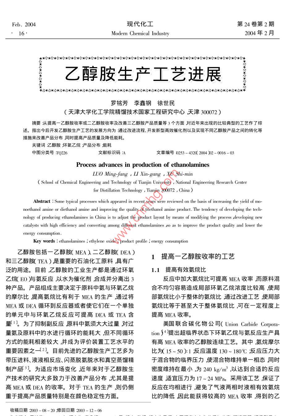 乙醇胺生產(chǎn)工藝進(jìn)展