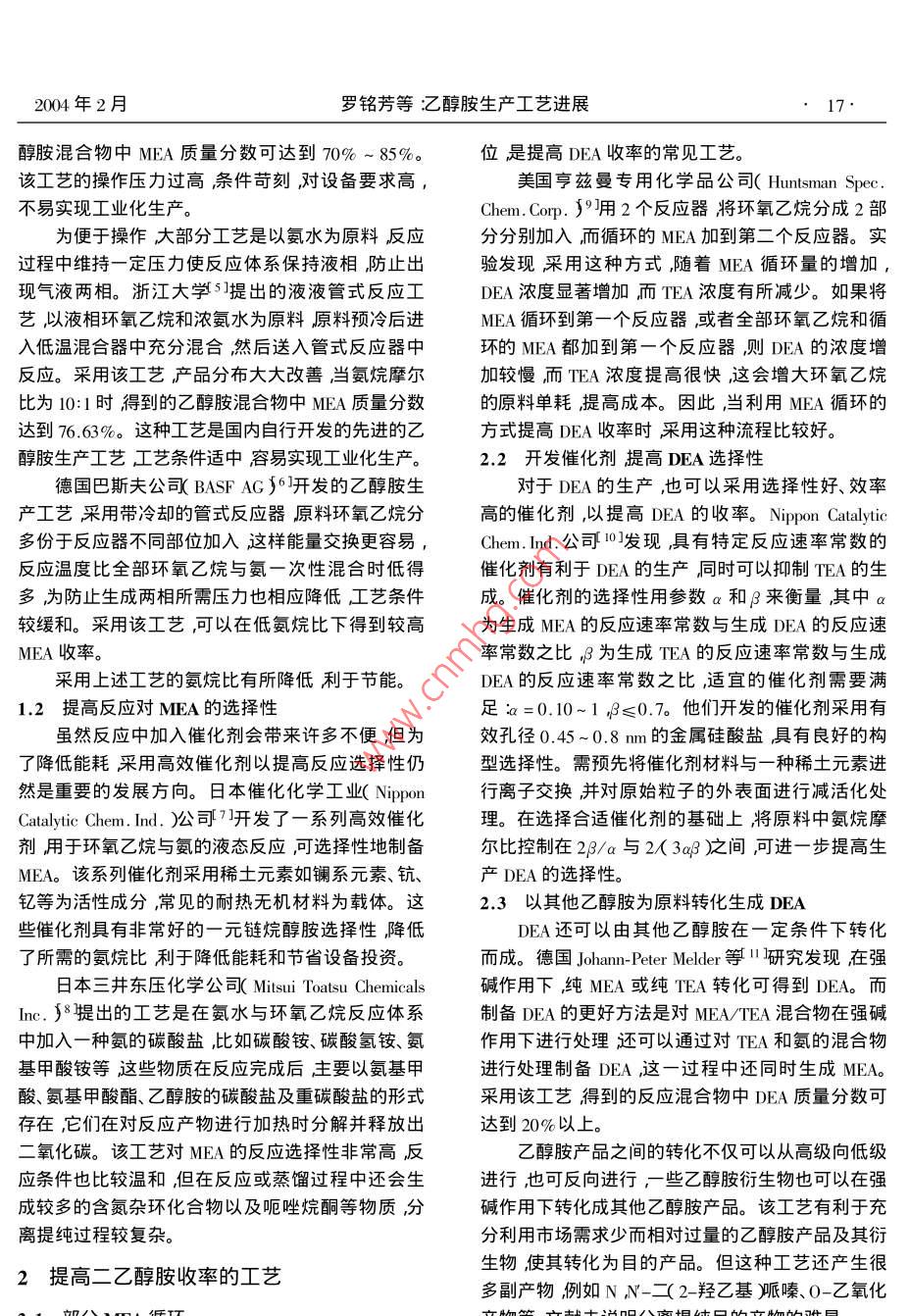 Feb.2004現(xiàn)代化工第24卷第2期16 Modern Chemical Industry2004年2月乙醇胺生產(chǎn)工藝進(jìn)展★羅銘芳李鑫鋼徐世民(天津大學(xué)化工學(xué)院精餾技術(shù)國家工程研究中心天津300072)摘要從提高乙醇胺收率或二乙醇胺收率及改善三乙醇胺產(chǎn)品質(zhì)量等3個方面對近年來出現(xiàn)的比較典型的工藝作了綜述。指出今后開發(fā)乙醇胺生產(chǎn)工藝的發(fā)展方向為通過改進(jìn)流程、開發(fā)新型高效催化劑以及實現(xiàn)不同乙醇胺產(chǎn)品之間的轉(zhuǎn)化等措施來改善產(chǎn)品分布同時提高產(chǎn)品質(zhì)量及降低能耗。關(guān)鍵詞乙醇胺環(huán)氧乙烷產(chǎn)品分布能耗中圖分類號TQ226文獻(xiàn)標(biāo)識碼:A文章編號D253-4320(20042-0016-03 Process advances in production of ethanolamines LUO Ming-fang, LI Xin-gang XU Shi-min (School of Chemical Engineering and Technology of Tianjin University National Engineering Research Center for Distillation Technology, Tianjin 300072 China) Abstract Some typical processes which appeared in recent years were reviewed on the basis of increasing the yield of mo- noethanol amine or diethanol amine and improving the quality of triethanol amine product. The tendency of developing the tech- nology of producing ethanolamines in China is to adjust the product layout by means of modifying the process developing new catalysts with high efficiency and converting among different ethanolamines so as to improve the product quality and lower the energy consumption. Key words: ethanolamines ethylene oxide product profile energy consumption乙醇胺包括一乙醇胺(MEA)二乙醇胺(DEA)1提高一乙醇胺收率的工藝和三乙醇胺(TEA)是重要的石油化工原料具有廣泛的用途目前乙醇胺的工業(yè)生產(chǎn)都是通過環(huán)氧1.1提高有效氨烷比乙烷EO)與氨反應(yīng)以水為催化劑合成并分離出3反應(yīng)中加大氨烷比可提高M(jìn)EA收率而原料混種產(chǎn)品。產(chǎn)品組成主要決定于原料中氨與環(huán)氧乙烷合不均勻容易造成局部環(huán)氧乙烷濃度比較高使局的摩爾比提高氨烷比有利于MEA的生產(chǎn)通過將部氨烷比小于整體的氨烷比通過改進(jìn)工藝使局部MA或DEA循環(huán)到反應(yīng)器或者使它們在一個單獨氨烷比等于甚至大于整體氨烷比可在一定程度上的單元中與環(huán)氧乙烷反應(yīng)可提高DEA或TEA含提高M(jìn)EA收率。量。為了抑制副反應(yīng)原料中氨須大大過量對過美國聯(lián)合碳化物公司( Union Carbide Corpora量氨及原料中的水進(jìn)行循環(huán)的能耗大但不同循環(huán)tion4提出超臨界狀態(tài)下環(huán)氧乙烷與氨反應(yīng)生產(chǎn)具方式的能耗相差較大并成為評價裝置工藝水平的有高M(jìn)EA收率的乙醇胺連續(xù)工藝。其中氨烷摩爾重要因素之2目前先進(jìn)的乙醇胺生產(chǎn)工藝多為比為(15~50):1反應(yīng)溫度130~180℃反應(yīng)壓力大帶壓進(jìn)料、液液相反應(yīng)閃蒸脫氨脫水和真空蒸餾精于混合物的臨界壓力使混合物維持單一相態(tài)同時制產(chǎn)品3為適應(yīng)市場變化近年來對于乙醇胺生密度維持在最小,為240kg/m3,以達(dá)到合適的反應(yīng)產(chǎn)技術(shù)的研究大多致力于改善產(chǎn)品分布尤其是提速度適宜壓力為17~24mpa采用該工藝保證了高M(jìn)EA或DEA的收率。對于TEA的生產(chǎn)則仍側(cè)反應(yīng)在均相進(jìn)行避免了氣液兩相時液相有效氨烷重于提高產(chǎn)品質(zhì)量特別是在顏色穩(wěn)定性方面。比的降低因此能獲得較高的MEA收率得到的乙收稿日期2003-08-20修回日期2003-12-02004年2月羅銘芳等乙醇胺生產(chǎn)工藝進(jìn)展17醇胺混合物中MEA質(zhì)量分?jǐn)?shù)可達(dá)到70%~8%位是提高DEA收率的常見工藝。該工藝的操作壓力過高條件苛刻對設(shè)備要求高,美國亨茲曼專用化學(xué)品公司( Huntsman Spec.不易實現(xiàn)工業(yè)化生產(chǎn)。Chem.orp.9用2個反應(yīng)器將環(huán)氧乙烷分成2部為便于操作大部分工藝是以氨水為原料反應(yīng)分分別加入而循環(huán)的MEA加到第二個反應(yīng)器。實過程中維持一定壓力使反應(yīng)體系保持液相防止出驗發(fā)現(xiàn)采用這種方式,隨著MEA循環(huán)量的增加,現(xiàn)氣液兩相。浙江大學(xué)提出的液液管式反應(yīng)工DEA濃度顯著增加而TEA濃度有所減少。如果將藝以液相環(huán)氧乙烷和濃氨水為原料原料預(yù)冷后進(jìn)MEA循環(huán)到第一個反應(yīng)器或者全部環(huán)氧乙烷和循入低溫混合器中充分混合然后送入管式反應(yīng)器中環(huán)的MEA都加到第一個反應(yīng)器則DEA的濃度增反應(yīng)。采用該工藝產(chǎn)品分布大大改善,當(dāng)氨烷摩爾加較慢而TEA濃度提高很快這會增大環(huán)氧乙烷比為10:1時得到的乙醇胺混合物中MA質(zhì)量分?jǐn)?shù)的原料單耗提高成本因此當(dāng)利用MEA循環(huán)的達(dá)到76.63%這種工藝是國內(nèi)自行開發(fā)的先進(jìn)的乙方式提高DEA收率時采用這種流程比較好。醇胺生產(chǎn)工藝工藝條件適中容易實現(xiàn)工業(yè)化生產(chǎn)2.2開發(fā)催化劑提高DEA選擇性德國巴斯夫公司( BASF AG6開發(fā)的乙醇胺生對于DEA的生產(chǎn),也可以采用選擇性好、效率產(chǎn)工藝采用帶冷卻的管式反應(yīng)器原料環(huán)氧乙烷分高的催化劑,以提高DEA的收率。 Nippon Catalytic多份于反應(yīng)器不同部位加入這樣能量交換更容易,Chem.Ind.公司10發(fā)現(xiàn)具有特定反應(yīng)速率常