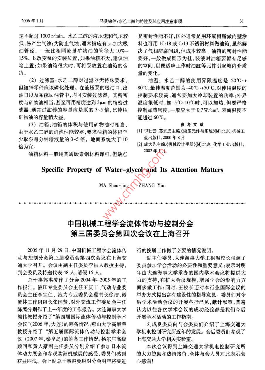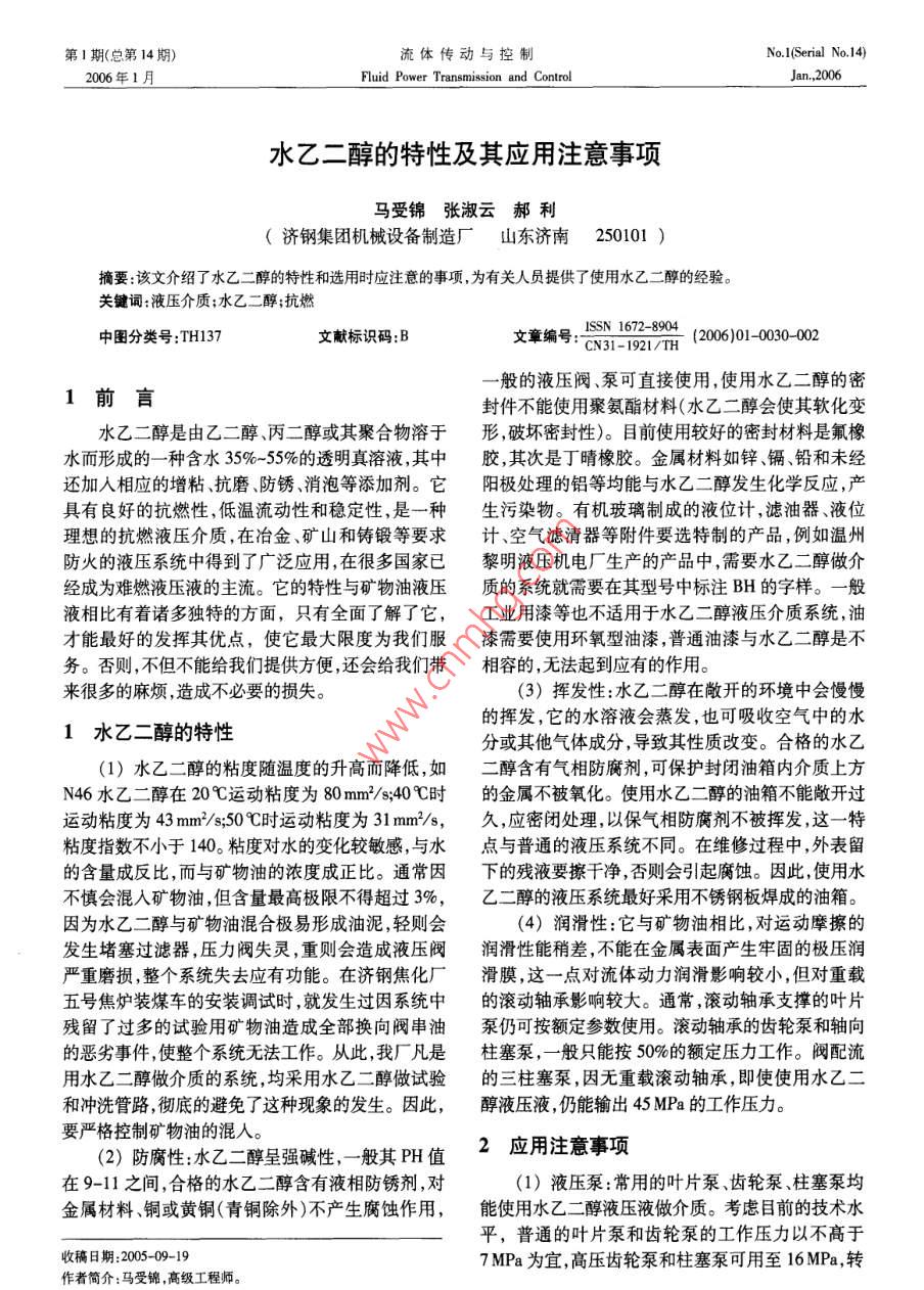 第1期(總第14期)流體傳動與控制 No.(Serial No.14)2006年1月 Fluid Power Transmission and ControlJan,2006水乙二醇的特性及其應用注意事項馬受錦張淑云郝利(濟鋼集團機械設備制造廠山東濟南250101)摘要:該文介紹了水乙二醇的特性和選用時應注意的事項為有關人員提供了使用水乙二醇的經(jīng)驗。關鍵詞:液壓介質(zhì);水乙二醇;抗燃中圖分類號:TH137文獻標識碼:B文章編1-1921/00一般的液壓閥、泵可直接使用,使用水乙二醇的密1前言封件不能使用聚氨酯材料(水乙二醇會使其軟化變水乙二醇是由乙二醇、丙二醇或其聚合物溶于形,破壞密封性)目前使用較好的密封材料是氟橡水而形成的一種含水35%-55%的透明真溶液,其中膠,其次是丁晴橡膠。金屬材料如鋅、鎘、鉛和未經(jīng)還加入相應的增粘抗磨、防銹、消泡等添加劑。它陽極處理的鋁等均能與水乙二醇發(fā)生化學反應,產(chǎn)具有良好的抗燃性,低溫流動性和穩(wěn)定性,是一種生污染物。有機玻璃制成的液位計,濾油器、液位理想的抗燃液壓介質(zhì),在冶金、礦山和鑄鍛等要求計、空氣濾清器等附件要選特制的產(chǎn)品,例如溫州防火的液壓系統(tǒng)中得到了廣泛應用,在很多國家已黎明液壓機電廠生產(chǎn)的產(chǎn)品中,需要水乙二醇做介經(jīng)成為難燃液壓液的主流。它的特性與礦物油液壓質(zhì)的系統(tǒng)就需要在其型號中標注BH的字樣。一般液相比有著諸多獨特的方面,只有全面了解了它,工業(yè)用漆等也不適用于水乙二醇液壓介質(zhì)系統(tǒng),油才能最好的發(fā)揮其優(yōu)點,使它最大限度為我們服漆需要使用環(huán)氧型油漆,普通油漆與水乙二醇是不務。否則,不但不能給我們提供方便,還會給我們帶相容的,無法起到應有的作用。來很多的麻煩,造成不必要的損失。(3)揮發(fā)性:水乙二醇在敞開的環(huán)境中會慢慢的揮發(fā),它的水溶液會蒸發(fā),也可吸收空氣中的水1水乙二醇的特性分或其他氣體成分,導致其性質(zhì)改變。合格的水乙(1)水乙二醇的粘度隨溫度的升高而降低,如二醇含有氣相防腐劑,可保護封閉油箱內(nèi)介質(zhì)上方N46水乙二醇在20℃運動粘度為80mm2/s;4℃時的金屬不被氧化。使用水乙二醇的油箱不能敞開過運動粘度為43mm/s;50℃時運動粘度為31mm2/s,久,應密閉處理,以保氣相防腐劑不被揮發(fā),這一特粘度指數(shù)不小于140粘度對水的變化較敏感,與水點與普通的液壓系統(tǒng)不同。在維修過程中,外表留的含量成反比,而與礦物油的濃度成正比。通常因下的殘液要擦干凈,否則會引起腐蝕。因此,使用水不慎會混入礦物油,但含量最高極限不得超過3%,乙二醇的液壓系統(tǒng)最好采用不銹鋼板焊成的油箱。因為水乙二醇與礦物油混合極易形成油泥,輕則會(4)潤滑性:它與礦物油相比,對運動摩擦的發(fā)生堵塞過濾器,壓力閥失靈,重則會造成液壓閥潤滑性能稍差,不能在金屬表面產(chǎn)生牢固的極壓潤嚴重磨損,整個系統(tǒng)失去應有功能。在濟鋼焦化廠滑膜,這一點對流體動力潤滑影響較小,但對重載五號焦爐裝煤車的安裝調(diào)試時,就發(fā)生過因系統(tǒng)中的滾動軸承影響較大。通常,滾動軸承支撐的葉片殘留了過多的試驗用礦物油造成全部換向閥串油泵仍可按額定參數(shù)使用。滾動軸承的齒輪泵和軸向的惡劣事件,使整個系統(tǒng)無法工作。從此,我廠凡是柱塞泵,一般只能按50%的額定壓力工作。閥配流用水乙二醇做介質(zhì)的系統(tǒng),均采用水乙二醇做試驗的三柱塞泵,因無重載滾動軸承,即使使用水乙二和沖洗管路,徹底的避免了這種現(xiàn)象的發(fā)生。因此,醇液壓液,仍能輸出45MPa的工作壓力。要嚴格控制礦物油的混人。(2)防腐性:水乙二醇呈強堿性,一般其PH值2應用注意事項在9-11之間,合格的水乙二醇含有液相防銹劑,對(1)液壓泵:常用的葉片泵、齒輪泵、柱塞泵均金屬材料、銅或黃銅(青銅除外)不產(chǎn)生腐蝕作用,能使用水乙二醇液壓液做介質(zhì)??紤]目前的技術水平,普通的葉片泵和齒輪泵的工作壓力以不高于收稿日期:2005-09-197Ma為宜,高壓齒輪泵和柱塞泵可用至16MPa,轉(zhuǎn)作者簡介:馬受錦,高級工程師。2006年1月馬受錦等:水乙二醇的特性及其應用注意事項31速不超過1000r/min。水乙二醇的液壓飽和氣壓較是密封性能不好,國外通常是用環(huán)氧樹脂做內(nèi)壁涂低,易產(chǎn)生氣蝕;為防止氣蝕,通常措施有:a加大吸料也可用1Cr18或Cr13不銹鋼材料做油箱,雖然解油管徑,一般比相同流量礦物油的管徑大0%決了氣相防腐問題,但成本較高。油箱的密封性能15%b改變泵的安裝位置,如果油箱不大,建議油要好,一般做成圓形為佳,裝液時油箱要留有足夠箱上置;如果油箱很大時,可將泵放置在油箱的旁的空間,以便適應工作時油缸等元件引起箱內(nèi)介質(zhì)邊。量的變化。(2)過濾器:水乙二醇對過濾器無特殊要求。油溫:水乙二醇的使用界限溫度是-20℃~+但鍍鋅零件應該磷化處理。在液壓泵的吸油口、出80℃,最佳溫度范圍為+40℃~+50℃,對使用溫度的油口以及系統(tǒng)回油管中,均可安裝過濾器。其精密控制要求較高,通常要加大冷卻裝置的功率;外界度與礦物油相當,甚至可用精度達到3m的精密過溫度很低時,如-5℃~10℃時,可以加熱,但要嚴格濾器,通常過濾器的容量應是泵的3~5倍,比使用控制加熱密度,一般應大于0.7W/cm2,表面溫度不礦物油的容量稍大些。