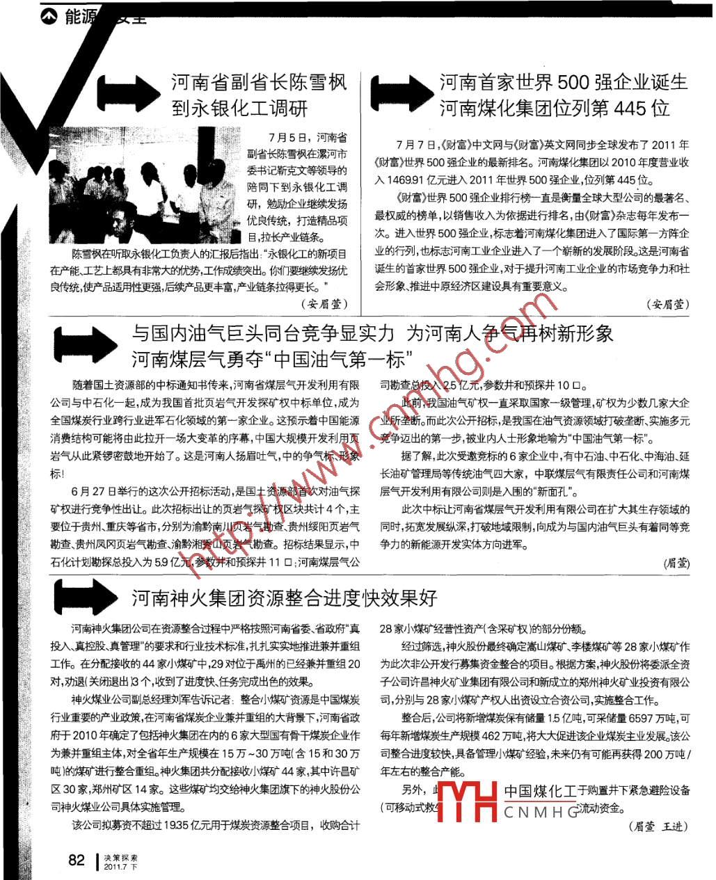 不能源星河南省副省長陳雪楓河南首家世界500強(qiáng)企業(yè)誕生7- ;到永銀化工調(diào)研河南煤化集團(tuán)位列第445位7月5日,河南省7月7日,《財(cái)富>中文網(wǎng)與<財(cái)富>英文網(wǎng)同步全球發(fā)布了2011年副省長陳雪楓在漯河市《財(cái)富>世界500強(qiáng)企業(yè)的最新排名。河南煤化集團(tuán)以2010年度營業(yè)收委書記靳克文等領(lǐng)導(dǎo)的入1469.91億元進(jìn)入2011年世界500強(qiáng)企業(yè),位列第445位。陪同下到永銀化工調(diào)研,勉勵(lì)企業(yè)繼續(xù)發(fā)揚(yáng)<財(cái)富>世界500強(qiáng)企業(yè)排行榜- -直是衡量全球大型公司的最著名、優(yōu)良傳統(tǒng),打造精品項(xiàng)最權(quán)威的榜單,以銷售收入為依據(jù)進(jìn)行排名,由<財(cái)富>雜志每年發(fā)布一目,拉長產(chǎn)業(yè)鏈條。次。進(jìn)入世界500強(qiáng)企業(yè),標(biāo)志著河南煤化集團(tuán)進(jìn)入了國際第一方陣企陳雪楓在聽取永銀化工負(fù)責(zé)人的匯報(bào)后指出:“永銀化工的新項(xiàng)目業(yè)的行列,也標(biāo)志河南工業(yè)企業(yè)進(jìn)入了-個(gè)嶄新的發(fā)展階段。這是河南省在產(chǎn)能工藝上都具有非常大的優(yōu)勢(shì),工作成績突出。你們要繼續(xù)發(fā)揚(yáng)優(yōu)誕生的首家世界500強(qiáng)企業(yè),對(duì)于提升河南工業(yè)企業(yè)的市場競爭力和社良傳統(tǒng),使產(chǎn)品適用性更強(qiáng),后續(xù)產(chǎn)品更豐富,產(chǎn)業(yè)鏈條拉得更長。"會(huì)形象、推進(jìn)中原經(jīng)濟(jì)區(qū)建設(shè)具有重要意義。(安眉萱)與國內(nèi)油氣巨頭同臺(tái)競爭顯實(shí)力為河南人爭氣再樹新形象河南煤層氣勇奪“中國油氣第一標(biāo)”隨著國土資源部的中標(biāo)通知書傳來,河南省煤層氣開發(fā)利用有限司勘查總投入2.5億元,參數(shù)井和預(yù)探井10口。公司與中石化一起,成為我國 首批頁巖氣開發(fā)探礦權(quán)中標(biāo)單位,成為此前,我國油氣礦權(quán)- -直采取國家一級(jí)管理 ,礦權(quán)為少數(shù)幾家大企全國煤炭行業(yè)跨行業(yè)進(jìn)軍石化領(lǐng)域的第-家企業(yè)。 這預(yù)示著中國能源業(yè)所壟斷。而此次公開招標(biāo),是我國在油氣資源領(lǐng)域打破壟斷、實(shí)施多元消費(fèi)結(jié)構(gòu)可能將由此拉開一場大變革的序幕,中國大規(guī)模開發(fā)利用頁競爭邁出的第一 步,被業(yè)內(nèi)人士形象地喻為"中國油氣第- -標(biāo)”。巖氣從此緊鑼密鼓地開始了。這是河南人揚(yáng)眉吐氣,中的爭氣標(biāo)、形象據(jù)了解,此次受邀競標(biāo)的6家企業(yè)中,有中石油中石化中海油、延標(biāo)!長油礦管理局等傳統(tǒng)油氣四大家,中聯(lián)煤層氣有限責(zé)任公司和河南煤6月27日舉行的這次公開招標(biāo)活動(dòng),是國土資源部首次對(duì)油氣探層氣開發(fā)利用有限公司則是入圍的“新面孔”。礦權(quán)進(jìn)行競爭性出讓。此次招標(biāo)出讓的頁巖t氣探礦權(quán)區(qū)塊共計(jì)4個(gè),主此次中標(biāo)讓河南省煤層氣開發(fā)利用有限公司在擴(kuò)大其生存領(lǐng)域的要位于貴州、重慶等省市,分別為渝黔南川頁巖氣勘查貴州綏陽頁巖氣同時(shí),拓寬發(fā)展縱深,打破地域限制,向成為與國內(nèi)油氣巨頭有著同等競勘查、貴州鳳岡頁巖氣勘查渝黔湘秀山頁巖氣勘查。招標(biāo)結(jié)果顯示,中爭力的新能源開 發(fā)實(shí)體方向進(jìn)軍。石化計(jì)劃勘探總投入為5.9億元,參數(shù)井和預(yù)探井11口;河南煤層氣公(眉萱)河南神火集團(tuán)資源整合進(jìn)度快效果好河南神火集團(tuán)公司在資源整合過程中嚴(yán)格按照河南省委、省政府真28 家小煤礦經(jīng)營性資產(chǎn)(含采礦權(quán)的部分份額。投入、真控股、真管理”的要求和行業(yè)技術(shù)標(biāo)準(zhǔn)扎扎實(shí)實(shí)地推進(jìn)兼并重組經(jīng)過篩選神火股份最終確定嵩山煤礦李樓煤礦等28家小煤礦作工作。在分配接收的44家小煤礦中,29對(duì)位于禹州的已經(jīng)兼并重組20為此次非公開發(fā)行募集資金整合的項(xiàng)目。 根據(jù)方案,神火股份將委派全資對(duì),勸退(關(guān)閉退出)3個(gè),收到了進(jìn)度快、任務(wù)完成出色的效果。子公司許昌神火礦業(yè)集團(tuán)有限公司和新成立的鄭州神火礦業(yè)投資有限公神火煤業(yè)公司副總經(jīng)理劉軍告訴記者:整合小煤礦資源是中國煤炭司,分別與28家小煤礦產(chǎn)權(quán)人出資設(shè)立合資公司,實(shí)施整合工作。行業(yè)重要的產(chǎn)業(yè)政策,在河南省煤炭企業(yè)兼并重組的大背景下,河南省政整合后,公司將新增煤炭保有儲(chǔ)量15億噸,可采儲(chǔ)量6597萬噸,可府于2010年確定了包括神火集團(tuán)在內(nèi)的6家大型國有骨干煤炭企業(yè)作每年新增煤炭生產(chǎn)規(guī)模 462萬噸,將大大促進(jìn)該企業(yè)煤炭主業(yè)發(fā)展該公為兼并重組主體,對(duì)全省年生產(chǎn)規(guī)模在15萬~30萬噸(含15和30萬司整合進(jìn)度較快,具備 管理小煤經(jīng)驗(yàn),未來仍有可能再獲得200萬噸/噸)的煤礦進(jìn)行整合重組。神火集團(tuán)共分配接收小煤礦44家,其中許昌礦年左右的整合產(chǎn)能。區(qū)30家,鄭州礦區(qū)14家。這些煤礦均交給神火集團(tuán)旗下的神火股份公另外,中國煤化工于購