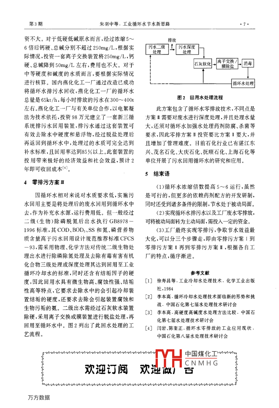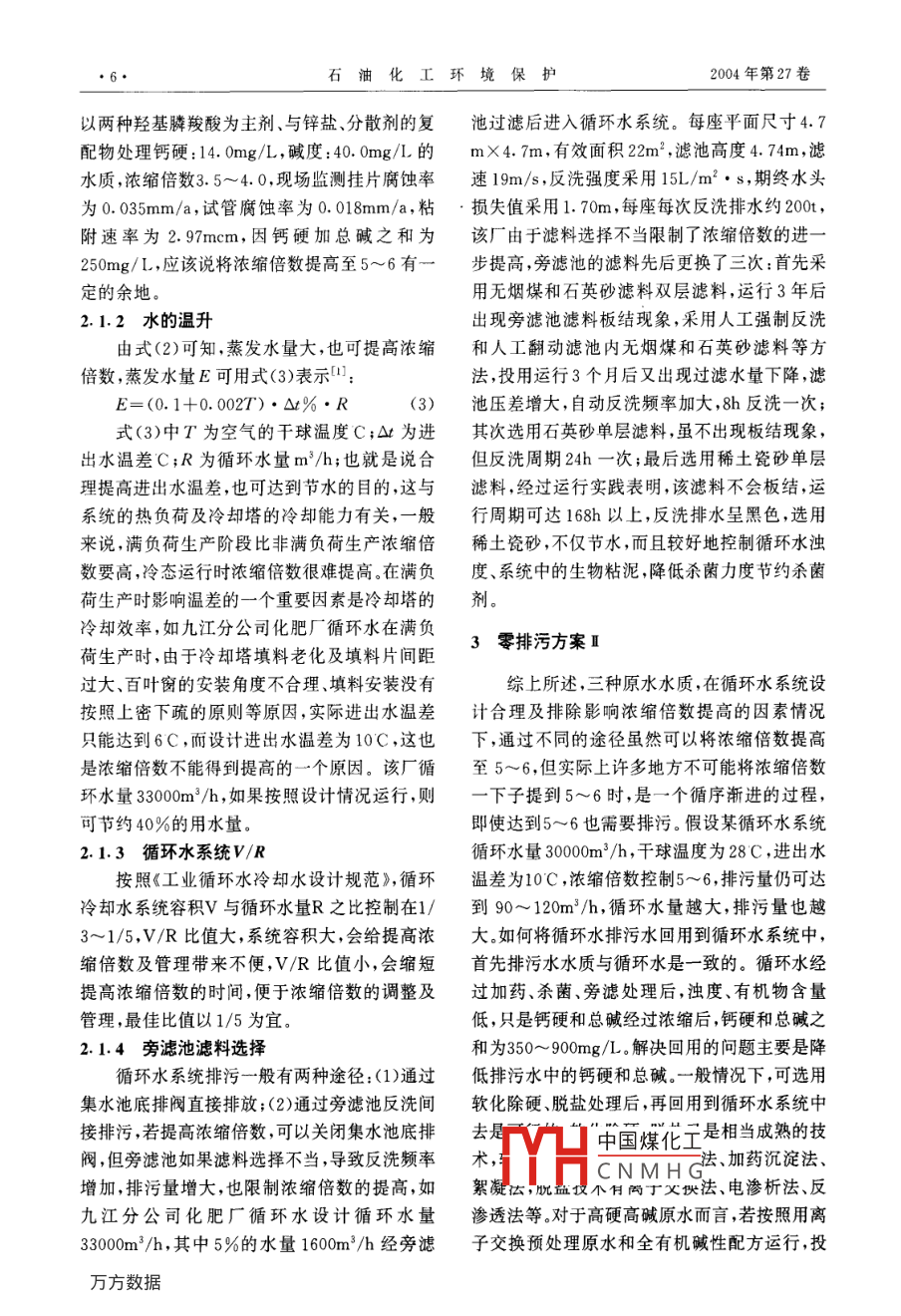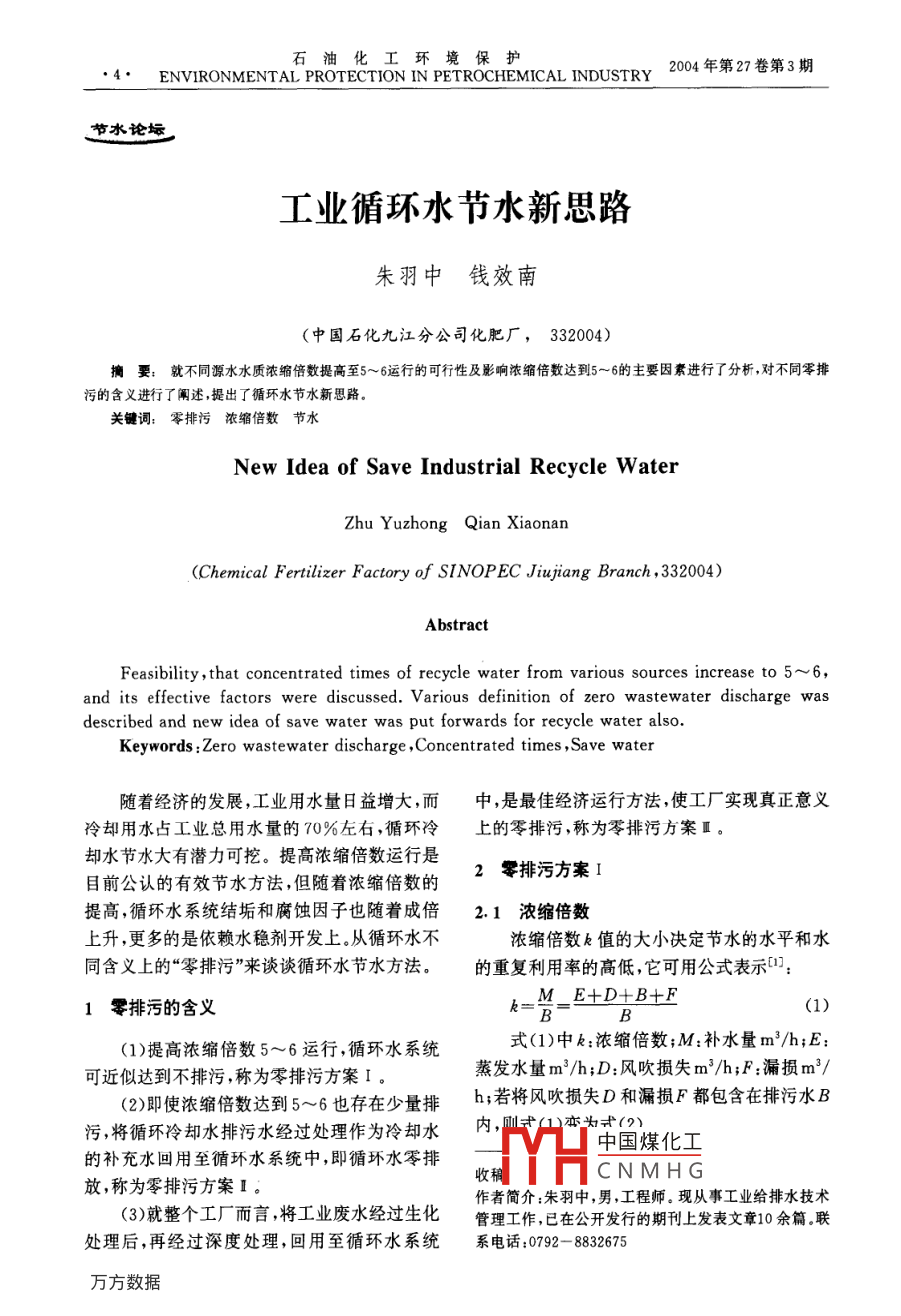 石油化工環(huán)境保護(hù)4. ENVIRONMENTAL PROTECTION IN PETROCHEMICAL INDUSTRY2004年第27卷第3期節(jié)水論壇工業(yè)循環(huán)水節(jié)水新思路朱羽中錢效南(中國石化九江分公司化肥廠,332004)摘要:就不同源水水質(zhì)濃縮倍數(shù)提高至5~6運行的可行性及影響濃縮倍數(shù)達(dá)到5~6的主要因素進(jìn)行了分析,對不同零排污的含義進(jìn)行了闡述,提出了循環(huán)水節(jié)水新思路關(guān)鍵詞:零排污濃縮倍數(shù)節(jié)水New Idea of Save Industrial Recycle WaterZhu Yuzhong Qian XiaonanChemical Fertilizer Factory of SINOPEC Jiujiang Branch, 332004)AbstractFeasibility, that concentrated times of recycle water from various sources increase to 5-6described and new idea of save water was put forwards for recycle water alo ter discharge wasand its effective factors were discussed. Various definition of zero wastewaKeywords: Zero wastewater discharge, Concentrated times, Save water隨著經(jīng)濟的發(fā)展,工業(yè)用水量日益增大,而中,是最佳經(jīng)濟運行方法,使工廠實現(xiàn)真正意義冷卻用水占工業(yè)總用水量的70%左右,循環(huán)冷上的零排污,稱為零排污方案卻水節(jié)水大有潛力可挖。提高濃縮倍數(shù)運行是目前公認(rèn)的有效節(jié)水方法,但隨著濃縮倍數(shù)的2零排污方案I提高,循環(huán)水系統(tǒng)結(jié)垢和腐蝕因子也隨著成倍2.1濃縮倍數(shù)上升,更多的是依賴水穩(wěn)劑開發(fā)上。從循環(huán)水不濃縮倍數(shù)k值的大小決定節(jié)水的水平和水同含義上的“零排污”來談?wù)勓h(huán)水節(jié)水方法。的重復(fù)利用率的高低,它可用公式表示0:1零排污的含義k=M-EtD+B+F(1)提高濃縮倍數(shù)5~6運行,循環(huán)水系統(tǒng)式(1)中k:濃縮倍數(shù);M:補水量m3/h;E:可近似達(dá)到不排污,稱為零排污方案I。蒸發(fā)水量m3/h;D:風(fēng)吹損失m3/h;F:漏損m3(2)即使?jié)饪s倍數(shù)達(dá)到5~6也存在少量排h;若將風(fēng)吹損失D和漏損F都包含在排污水B污,將循環(huán)冷卻水排污水經(jīng)過處理作為冷卻水內(nèi),亦為式(9)中國煤化工的補充水回用至循環(huán)水系統(tǒng)中,即循環(huán)水零排CNMHG放,稱為零排污方案I收稠作者簡介:朱羽中,男,工程師。現(xiàn)從事工業(yè)給排水技術(shù)(3)就整個工廠而言,將工業(yè)廢水經(jīng)過生化管理工作,已在公開發(fā)行的期刊上發(fā)表文章10余篇聯(lián)處理后,再經(jīng)過深度處理,回用至循環(huán)水系統(tǒng)系電話:0792-8832675第3期朱羽中等,工業(yè)循環(huán)水節(jié)水新思路E+B M(2)取三種方法進(jìn)行研究3:第一種方法用離子交B M-EE換樹脂處理原水,將原水中的硬度和堿度分別若E保持不變,排污量越小,則補水量越降至50mg/L后補入循環(huán)水中,循環(huán)水鈣硬加小,得到濃縮倍數(shù)越大。一般情況下,當(dāng)k>1,隨總堿之和在350~900mg/1運行,濃縮倍數(shù)可著k值的增大,從圖1可以看出,M/E下降程度控制在55~6之間,水穩(wěn)劑采用全有機復(fù)合較快,排污量迅速下降;當(dāng)濃縮倍數(shù)大于5~6以藥劑。第二種方法采取加酸工藝處理,使循環(huán)水后,M/E下降程度緩慢,節(jié)水程度最小。繼續(xù)提中pH值控制在7.5~8之間,循環(huán)水鈣硬加總高濃縮倍數(shù)就目前處理水平而言,增加了對水堿之和在350~900mg/L運行,濃縮倍數(shù)可以處理劑、殺菌劑系統(tǒng)的設(shè)施及管理等要求。因控制在25~5之間。第三種方法采取自然運行此目前公認(rèn)濃縮倍數(shù)最佳經(jīng)濟運行值控制在工藝,原水不經(jīng)處理直接補充至循環(huán)水中,循環(huán)5~6,但濃縮倍數(shù)提高至5~6,還要受補充水的水鈣硬加總堿之和在350~900g.運行,濃水質(zhì)情況、水的溫升、當(dāng)?shù)貧庀髼l件、循環(huán)水系縮倍數(shù)可以控制在17以下,水穩(wěn)劑采用全有統(tǒng)v/R以及旁濾池濾料等各個方面的條件限機復(fù)合藥劑第一種方法綜合運行費用最低,第制。二種方法綜合運行費用居中,第三種方法綜合運行費用最高,因此處理高硬高堿水質(zhì)選用離子交換處理源水,將源水鈣硬加總堿之和控制在150mg/L左右,再輔以全有機配方,將濃縮倍數(shù)提高至5~6是可行的對于中等硬度和堿度的水質(zhì)而言,原水鈣硬加總堿之和150~200mg/L,長江中下游屬于此類水質(zhì),將濃縮倍數(shù)提高至5~6,采取自然控制法是能達(dá)到的,但很大程度上還依賴于生產(chǎn)廠家及科研院所的研發(fā)。處理此類水質(zhì)目前普遍采用全有機堿性配方,由HEDP、丙烯酸丙烯零排污區(qū)酯共聚物、鋅鹽等組成,即阻垢緩蝕劑Ⅱ(添加銅緩蝕劑為阻垢緩蝕劑Ⅱ)。九江分公司化肥廠圖1M/E和k之間的關(guān)系循環(huán)水處理(原水鈣硬加總堿之和180200mg/L左右)原采用此配方,由于該配方本2.1.1水質(zhì)條件身的缺陷,循環(huán)水中的正磷含量偏高濃縮倍數(shù)目前習(xí)慣根據(jù)水質(zhì)的硬度和堿度將補充水控制在20~35效果較好,年平均為2.5,而濃劃分為三個等級,即高硬高堿、中等硬度和堿縮倍數(shù)超過3.5時,系統(tǒng)就出現(xiàn)結(jié)垢趨勢,加之度、低硬低堿三種水質(zhì)。對于高硬高堿而言,補水處理藥劑濃度低,投加量大等缺點,限制了濃充水中鈣硬加總堿之和超過250mg/L,若將濃縮倍數(shù)的繼續(xù)提高。后在原配方的基礎(chǔ)上進(jìn)行縮倍數(shù)提高至5~6,則循環(huán)水中鈣硬加總堿之調(diào)整,添加阻垢性能較好的PBTC,用新型含和