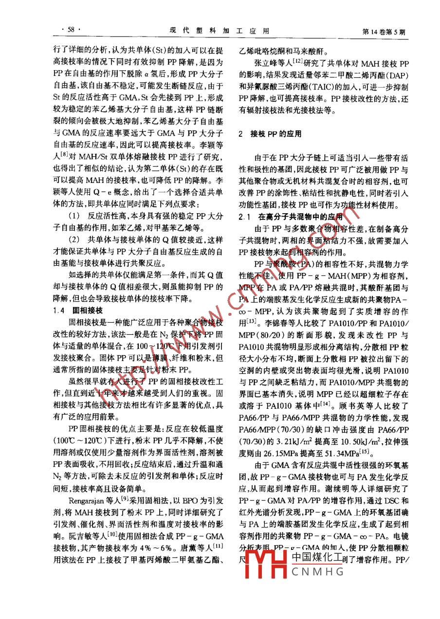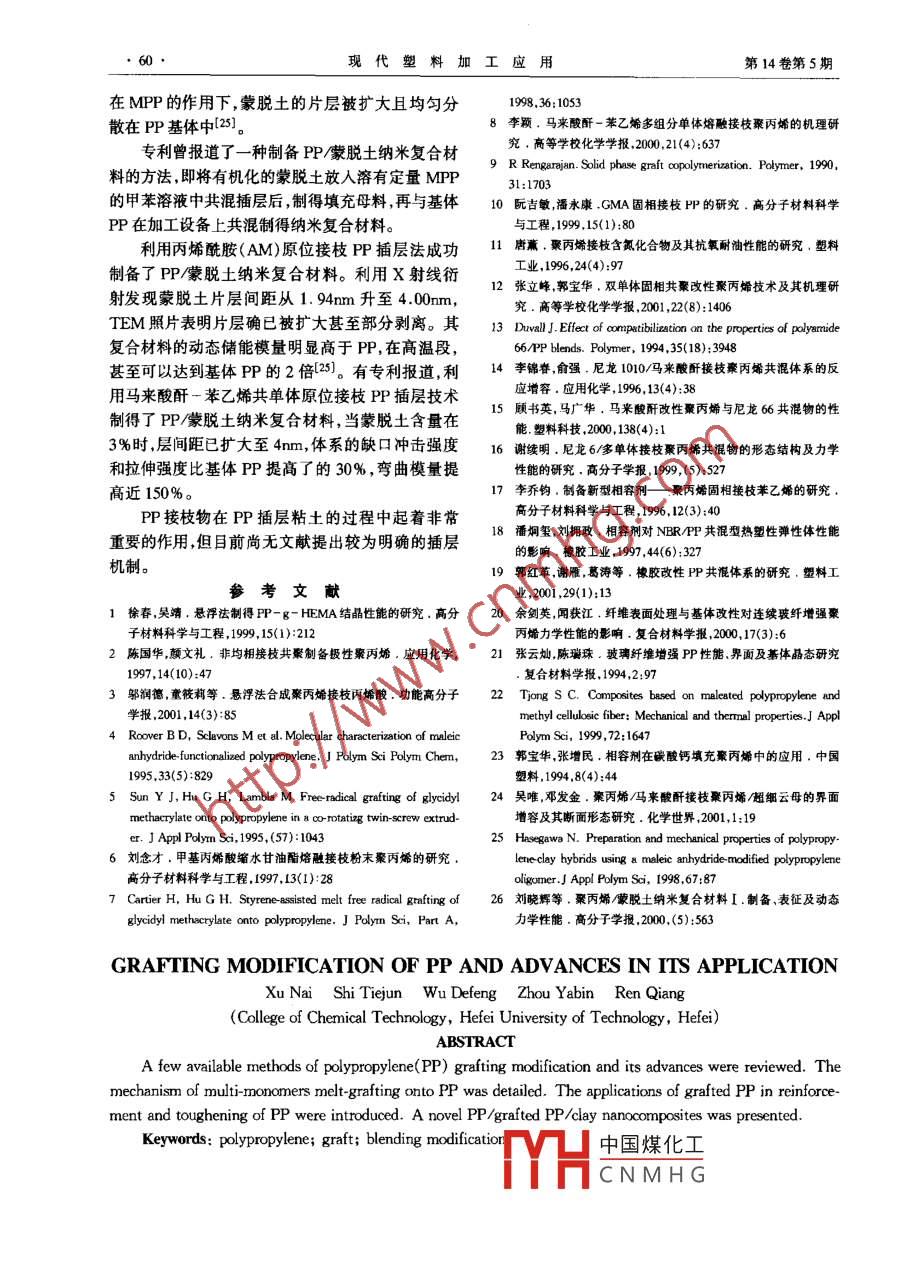 第14卷第5期現(xiàn)代塑料加工應(yīng)Modern plastcessing and Applications2002年10月聚丙烯的接枝改性及其進(jìn)展徐鼐史鐵鈞吳德峰周亞斌任強(qiáng)(合肥工業(yè)大學(xué)化工學(xué)院,23009摘要:介紹了聚丙烯(PP)接枝改性的幾種常用方法研究進(jìn)展和接枝PP在增韌增強(qiáng)PP中的應(yīng)用,并報(bào)道了PP接枝PP/粘土插層納米復(fù)合材料。關(guān)鍵詞:鞭丙爆接枝共混改性納米復(fù)合材刺聚丙烯(PP)是一種價(jià)格低、綜合性能良好、應(yīng)1.3熔融接枝用廣泛的塑料品種,但PP的缺點(diǎn)也是非常明顯的,該法是在PP熔融狀態(tài)下加入單體與引發(fā)劑其熱變形溫度較低,低溫沖擊強(qiáng)度低,同時(shí)PP是非從而發(fā)生接枝反應(yīng)。一般是在單、雙螺桿擠出機(jī)等極性聚合物,分子鏈上不含有極性基團(tuán)因而其相容加工設(shè)備上進(jìn)行的。由于加工溫度一般要在180℃性、粘結(jié)性、染色性和抗靜電性不佳,特別是PP與以上,故要求單體的沸點(diǎn)要高,馬來(lái)酸酐、丙烯酸及其他多數(shù)聚合物及無(wú)機(jī)填料不能有效地共混,極大其酯類(lèi)可用于該法。由于該法直接在加工設(shè)備上接限制了PP向工程塑料及其他方面的發(fā)展。因此枝PP,不需溶劑,工序簡(jiǎn)單,可以大批量連續(xù)生產(chǎn)PP改性的研究一直方興未艾,其中接枝改性是較為但缺點(diǎn)是反應(yīng)溫度高,PP降解嚴(yán)重,對(duì)材料性能的有效的一種手段負(fù)面影響較為嚴(yán)重馬來(lái)酸酐(MAH)接枝PP是熔融法研究最多的1常用的接枝方法及其研究進(jìn)展一個(gè)體系4。Roer等人以過(guò)氧化物為引發(fā)劑,研究了熔融條件下MAH接枝PP的反應(yīng)機(jī)理,認(rèn)為不1.1溶液接枝同于溶液接枝原理,接枝反應(yīng)絕大部分是在PP大PP溶液接枝所用的溶劑可以是甲苯、二甲苯或分子鏈B位斷裂之后發(fā)生的,當(dāng)MAH分子接到PP苯在100-140℃下待PP完全溶解后加入接枝單分子鏈斷裂的一端后,可能立即與其他的活性自由體,采用自由基、氧化或輻射等手段引發(fā)接枝反應(yīng)?;己辖K止,也可能繼續(xù)與MAH均聚溶液法的優(yōu)點(diǎn)是反應(yīng)溫度較低,反應(yīng)溫和PP的降Sum等用熔融法制備了聚丙烯接枝甲基丙烯解程度低接枝率高。但缺點(diǎn)是溶劑的使用量大,回酸縮水甘油酯(GMA),劉念才等人使用氫氧化鈉反收困難,該法在工業(yè)生產(chǎn)中已逐漸被淘汰滴定法測(cè)定了PP-g-GMA接枝率6。其他單體1.2懸浮接枝如丙烯酸(AA),甲基丙烯酸β-羥乙酯(HMA)、丙懸浮法接枝PP是在不使用或只使用少量有機(jī)烯酰胺、馬來(lái)酸二丁酯(DBM)等均可以用熔融法接溶劑的條件下,將PP粉末、薄膜或纖維與接枝單體枝PP起在水相中引發(fā)反應(yīng)的方法。該法不但繼承了溶近年來(lái)第二單體在熔融接枝PP時(shí)所起的作用液法反應(yīng)溫度低、PP降解程度低、反應(yīng)易控制等優(yōu)正逐漸受到重視和研究。對(duì)自由基引發(fā)MAH和點(diǎn),而且沒(méi)有溶劑回收的問(wèn)題,有利于保護(hù)環(huán)境。GMA熔解接枝PP體系做了大量研究工作7,發(fā)現(xiàn)M. Kajimura等人分別用該法制備了PP-g-第二單體的加人可以提高接枝率并能抑制PP的降St(St為苯乙烯)接枝物。徐春等則分別制得了解,他們對(duì) GMA/St雙單體熔融接枝PP的機(jī)理進(jìn)PP-g-HEMA(HEMA為甲基丙烯酸β-羥乙酯)和PP-g-MAA(MAA為甲基丙烯酸)接枝物。鄔收稿日期:2002-04-0作者簡(jiǎn)介:徐,1978年生,1995-1999年就讀于合肥工業(yè)大學(xué)潤(rùn)德等利用固相懸浮溶脹法合成了聚丙烯接枝丙烯高分酸(AA)-3)碩士學(xué)YH中國(guó)煤化工政讀高分子材料專(zhuān)業(yè)CNMHG現(xiàn)代塑料加工應(yīng)用第14卷第5期行了詳細(xì)的分析,認(rèn)為共單體(St)的加入可以在提乙烯吡咯烷酮和馬來(lái)酸酐。高接枝率的情況下同時(shí)有效抑制PP降解,是因?yàn)閺埩⒎宓热?2研究了共單體對(duì)MAH接枝PPPP在自由基的作用下脫除a氫后,形成PP大分子的影響結(jié)果發(fā)現(xiàn)適量鄰苯二甲酸二烯丙酯(DAP)自由基,該自由基不穩(wěn)定,可能發(fā)生斷鏈反應(yīng),由于和異氰脲酸三烯丙酯(TAC)的加入,可進(jìn)一步抑制St的反應(yīng)活性高于GMA,St會(huì)先接到PP上,形成PP降解,也可提高接枝率。PP接枝改性的方法,還較為穩(wěn)定的苯乙烯基大分子自由基,這樣PP鏈斷有輻射接枝法和光接枝法等。裂的傾向會(huì)被極大地抑制,苯乙烯基大分子自由基與GMA的反應(yīng)速率要遠(yuǎn)大于GMA與PP大分子2接枝PP的應(yīng)用自由基的反應(yīng)速率,因此可以提高接枝率。李穎等人8對(duì) MAH/St雙單體熔融接枝PP進(jìn)行了研究由于在PP大分子鏈上可適當(dāng)引入一些帶有活也得出了相似的結(jié)論,認(rèn)為第二單體(St)的存在既性和極性的基團(tuán),因此接枝PP可廣泛被用做PP與可以提高M(jìn)AH的接枝率,也可降低PP的降解。李其他聚合物或無(wú)機(jī)材料共混復(fù)合時(shí)的相容劑,也可穎等人使用Q-e概念,給出了一個(gè)選擇合適共單改善PP的涂飾性粘結(jié)性和抗靜電性,同時(shí)若引入體的方法,即共單體應(yīng)同時(shí)滿足下列點(diǎn)要求功能性基團(tuán),接枝PP也可作為功能性材料使用。(1)反應(yīng)活性高,本身具有強(qiáng)的穩(wěn)定PP大分2.1在高分子共混物中的應(yīng)用子自由基的作用,如苯乙烯,對(duì)甲基