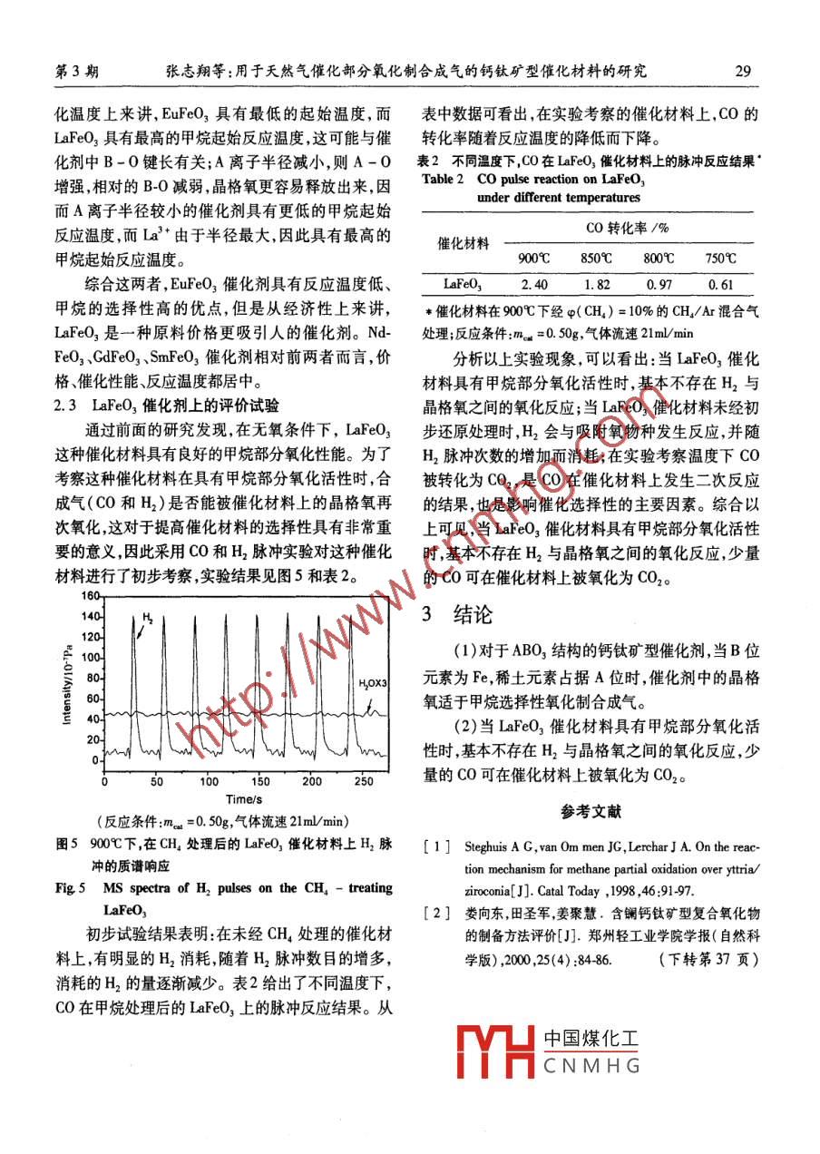 天然氣化工2007年第32卷用于天然氣催化部分氧化制合成氣的鈣鈦礦型催化材料的研究張志翔,孫建林,王鳳榮,苑慧敏(中國(guó)石油天然氣股份有限公司大慶化工研究中心,黑龍江大慶163714)摘要:對(duì)鈣鈦礦型晶格氧催化劑用于天然氣部分氧化制合成氣進(jìn)行了研究,考察了AFeO3(A=Ia,Nd,Sm,Eu)型催化劑的性能以及A位元素,反應(yīng)溫度,催化劑的再氧化時(shí)間等對(duì)催化性能的影響。結(jié)果表明,由稀土金屬(La,Nd,Sm,Eu)制得的AFeO3催化劑中以 LaFeO3選擇氧化性能最好,當(dāng)其具有甲烷部分氧化活性時(shí),基本不存在H2與晶格氧之間的氧化反應(yīng),少量的CO可在催化材料上被氧化為CO2關(guān)鍵詞:鈣鈦礦晶格氧催化劑;天然氣;催化部分氧化;合成氣制備中圖分類(lèi)號(hào):TE992.1文獻(xiàn)標(biāo)識(shí)碼:A文章編號(hào):1001-9219(2007)03-2604天然氣制合成氣占整個(gè)天然氣化工過(guò)程投資和循環(huán)流化床,就可以比較容易地實(shí)現(xiàn)這一新過(guò)程,從生產(chǎn)費(fèi)用的60%,因此改進(jìn)天然氣造氣技術(shù)一直是而避免了 ITMOTM過(guò)程放大的諸多困難。天然氣化工利用領(lǐng)域的研究重點(diǎn)。近年來(lái)發(fā)展起來(lái)實(shí)現(xiàn)這一新工藝的關(guān)鍵技術(shù)問(wèn)題是研制一種能的天然氣部分氧化制合成氣技術(shù),具有能耗和產(chǎn)品滿(mǎn)足氧化-還原循環(huán)的晶格氧催化劑,該催化劑不氣體組成等方面的優(yōu)點(diǎn)但該工藝需用純氧而制氧僅能提供一定量的晶格氧與甲烷進(jìn)行選擇氧化生成裝置的投資和操作費(fèi)用高昂,部分抵消了部分氧化合成氣,而且要具有良好的氧化還原性能和結(jié)構(gòu)穩(wěn)造氣技術(shù)的優(yōu)勢(shì),為解決這一矛盾,國(guó)內(nèi)外的研究者定性。稀土鈣鈦礦型氧化物具有穩(wěn)定的晶體結(jié)構(gòu)和們相繼開(kāi)發(fā)了離子透過(guò)膜制合成氣技術(shù)(TM)和氧較好的高溫穩(wěn)定性,在實(shí)驗(yàn)條件下能提供具有較好離子傳遞膜造氣技術(shù)(OTM),但這類(lèi)膜反應(yīng)器的放流動(dòng)性能和氧化性能的晶格氧,因此我們把該類(lèi)物大存在巨大困難。因此mM和OTM技術(shù)的實(shí)用性質(zhì)作為新型天然氣部分氧化催化劑的主體材料。還難以確定Steghui等認(rèn)為,晶格氧是生成CO,CO2和為解決上述問(wèn)題,開(kāi)發(fā)了一種復(fù)合氧化物材料H2O的活性氧物種,CH4與氧化表面相互作用發(fā)生作為催化部分氧化用催化劑,利用其氧化-還原性解離吸附,與晶格氧形成一個(gè)羥基和一個(gè)甲基。這質(zhì)把空氣中的氣態(tài)分子氧變?yōu)榇呋瘎┲泄虘B(tài)形式一反應(yīng)的活性位可能是配位不飽和陽(yáng)離子,CH4在的晶格氧,作為甲烷催化氧化制合成氣的氧源可以 Lewis酸位上異裂成CH3,H'被鄰近的晶格氧接將甲烷高選擇性地氧化為合成氣。納;另一種可能是CH4在配位不飽和的0位上均該方法的基本思路是:甲烷與催化劑上的晶格裂成一個(gè)甲氧基和一個(gè)羥基,在這種情況下甲基也氧反應(yīng)生成合成氣,晶格氧參與反應(yīng)后催化劑被還可能通過(guò)氧的插入或遷移轉(zhuǎn)移到配位不飽和的晶格原為低價(jià)態(tài);利用空氣將低價(jià)態(tài)的催化劑氧化為高氧上形成甲氧基。稀土鈣鈦礦型氧化物具有結(jié)構(gòu)缺價(jià)態(tài)補(bǔ)充晶格氧,完成催化循環(huán),這樣空氣中的分子陷含有氧空位,0具有遷移性能這樣,甲烷與氧氧就以晶格氧的形式固定下來(lái)。晶格氧的傳遞可以化物表面在兩種情況下都可以形成甲氧基和羥基,采用循環(huán)流化床或固定床切換來(lái)完成這樣空氣和甲氧基在試驗(yàn)溫度下易于分解成CO和H2,從而完甲烷可以分開(kāi)進(jìn)料,實(shí)現(xiàn)了用晶格氧代替純氧的甲成甲烷的氧化反應(yīng)。烷氧化制合成氣新工藝,該工藝還避免了甲烷/氧共稀土鈣鈦礦型氧化物的通式為ABO3,A通常為進(jìn)料工藝存在爆炸的危險(xiǎn)問(wèn)題。該方法具有mM+3價(jià)n中國(guó)煤化工用是穩(wěn)定結(jié)構(gòu)BOTM技術(shù)的主要優(yōu)點(diǎn)。同時(shí)借助現(xiàn)在已有的高溫通常CNMHG催化反應(yīng)的活性路邊博個(gè)平單(m)王程中心,關(guān)物質(zhì)題糊見(jiàn)圖本文主要考察了AFeO3系列催化劑中不同的A位離子,反應(yīng)溫第3期張志翔等:用于天然氣催化部分氧化制合成氣的鈣鈦礦型催化材料的研究度再氧化條件對(duì)反應(yīng)氧化性能的影響。變化確定反應(yīng)條件。為考察催化劑的表面狀態(tài)對(duì)甲烷催化反應(yīng)性能的影響,脈沖反應(yīng)采用了CH4連續(xù)脈沖以及CH4和O2交替脈沖兩種方式,CH4連續(xù)脈沖后,在反應(yīng)系統(tǒng)中進(jìn)行O2脈沖,對(duì)還原后的催化劑進(jìn)行氧化補(bǔ)氧,同時(shí)還可以考察CH4反應(yīng)時(shí)催化劑上是否積炭。脈沖實(shí)驗(yàn)反應(yīng)后的氣體進(jìn)行質(zhì)譜在線(xiàn)分析,質(zhì)譜采樣速度為15m/AMU(原子質(zhì)量單位)。脈沖實(shí)驗(yàn)用16ml/min的Ar(或He)為載氣反應(yīng)壓力為常壓,兩個(gè)脈沖時(shí)間間隔為lmin2結(jié)果與討論圖1典型稀土鈣鈦礦型氧化物結(jié)構(gòu)圖Fig 1 Typical structure of the rare earth perovsk2.1AFeO3(A=Cd,Sm,Nd,Eu)型鈣鈦礦催化劑oxides的XRD表征1實(shí)驗(yàn)部分該系列催化劑的XRD譜圖如圖2所示。將AFeO3(A=La,Nd,Sm,Gd,Eu
