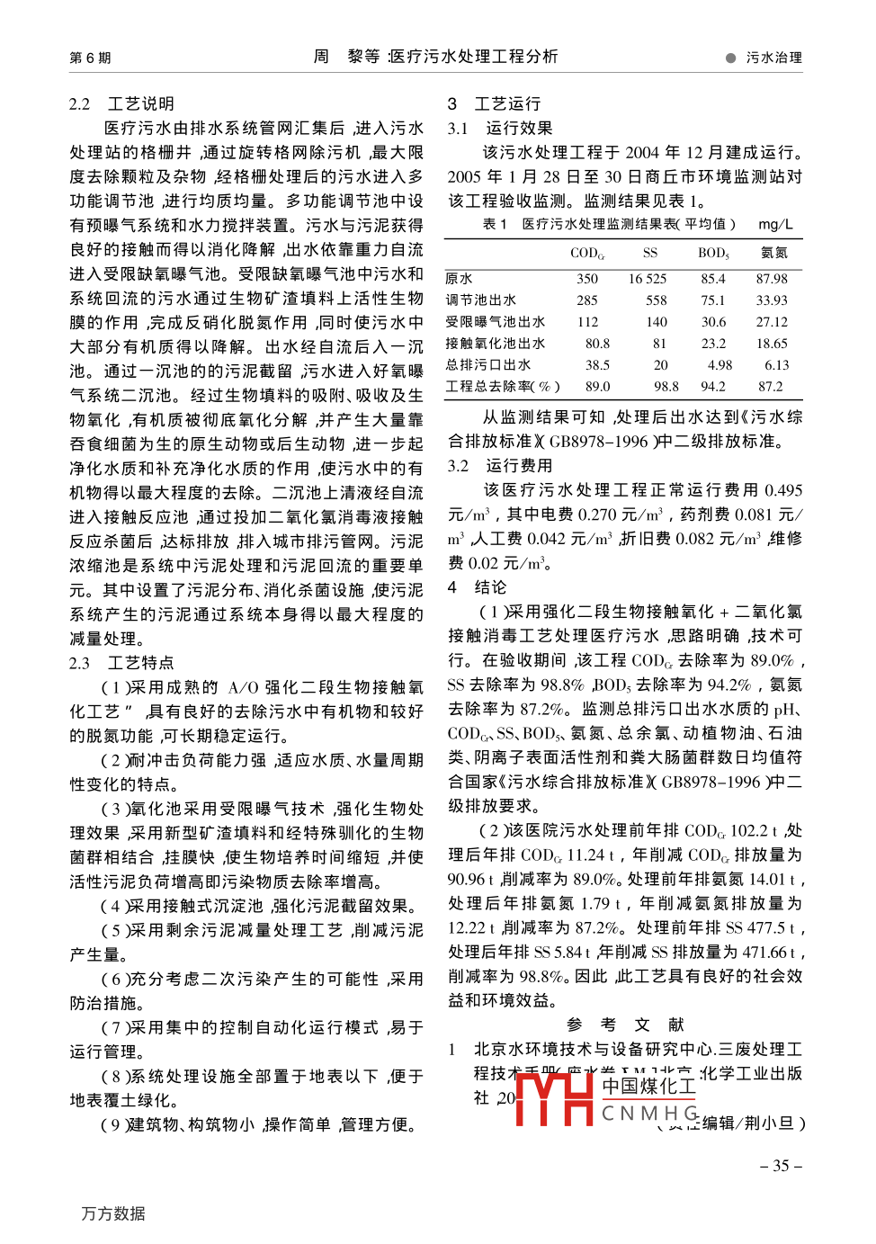 中國資源綜合利用Vol.24 ,No.6●污水治理China Resources Comprehensive Utilization2006年6月醫(yī)療污水處理工程分析周黎郭愛婷,劉莎(商丘市環(huán)境監(jiān)測站河南商丘476000)摘要對(duì)醫(yī)院醫(yī)療污水采用強(qiáng)化二段生物接觸氧化+二氧化氯接觸消毒工藝處理污水處理后達(dá)到《污水綜合排放標(biāo)準(zhǔn)xGB8978-1996)中二級(jí)排放標(biāo)準(zhǔn)。關(guān)鍵詞:醫(yī)療污水強(qiáng)化二段生物接觸氧化二氧化氯接觸消毒中圖分類號(hào):X703文獻(xiàn)標(biāo)識(shí)碼:A文章編號(hào):1008- -9500( 2006 )06- 0034 -02Dirty Aqua in Medical Treatment Treating Engineering AnalyseZhou Li ,Guo Aiting Liu Sha( Shangqiu Environmental Monitoring Station Shangqiu 476000 ,China )Abstract :Enhance two living creatures contact buming to the dirty aqua in medical treatment in hospitaladoption + the chlorine dioxide contact antipoisoning craft handles ,the dirty aqua treating attains behindthe dirty aqua in" synthesizes the second class exhaustion standard in inside in"( GB8978-1996) inexhaustion standard.Keywords xdirty aqua in medical treatment enhance two living creatures contact burning xchlorine dioxidecontact antipoisoning1污水特點(diǎn)放量約為800 m'/d CODc濃度在236~402 mg/L .商丘市某醫(yī)院醫(yī)療污水主要來自門診樓、病之間,總余氯為0.0mg/L,糞大腸菌群數(shù)濃度≥房樓、化驗(yàn)室、洗衣房、餐廳、部分職工生活污水。2.4x 10* 個(gè)/L。污水所含污染物種類復(fù)雜, 特別是各種病房、手2處理工藝術(shù)室、洗衣房所排污水除含有大量病原微生物、2.1 工藝 流程寄生蟲卵及各種病毒如肝炎病毒、肺結(jié)核菌和痢該醫(yī)療污水處理工程采用強(qiáng)化二段生物接疾菌等外還含有大量污染物。該醫(yī)院特殊排水觸氧化 +二氧化氯接觸消毒工藝處理[1 ,設(shè)計(jì)處病區(qū)沒有重金屬廢水排放放射科洗印廢水已回理 能力為800m2/d工程總投資115.66萬元。其收利用不進(jìn)入污水處理站處理。該醫(yī)院污水排工藝流程 見圖1。污水回流綜合污水>「格柵井]_ >|調(diào)節(jié)池1_「 受限曝氣池>_-沉池一 >[ 二氧池二沉池城市排水管網(wǎng)←排水明渠|消毒反應(yīng)池污泥(上清液)回流t 污泥濃縮井←一二氧化氯發(fā)生器污泥消毒、板框壓濾、外運(yùn)圖1醫(yī)療污水處理工藝流程中國煤化工收稿日期2005-12-29 .J.H.C NMHG作者簡介周黎(1972-)女 河南虞城人工程師從事環(huán)境監(jiān)測、評(píng)價(jià)、治埋乃面的工TF。-34-第6期周黎等:醫(yī)療污水處理 工程分析●污水治理.2.2工藝說明3工藝運(yùn)行醫(yī)療污水由排水系統(tǒng)管網(wǎng)匯集后進(jìn)入污水3.1 運(yùn)行效果處理站的格柵井,通過旋轉(zhuǎn)格網(wǎng)除污機(jī)最大限.該污水處理工程于2004年12月建成運(yùn)行。度去除顆粒及雜物經(jīng)格柵處理后的污水進(jìn)入多2005年1月28日至30日商丘市環(huán)境監(jiān)測站對(duì)功能調(diào)節(jié)池,進(jìn)行均質(zhì)均量。多功能調(diào)節(jié)池中設(shè)該工程驗(yàn)收監(jiān)測。監(jiān)測結(jié)果見表1。有預(yù)曝氣系統(tǒng)和水力攪拌裝置。污水與污泥獲得表1醫(yī)療污水處理 監(jiān)測結(jié)果表(平均值) mg/L良好的接觸而得以消化降解出水依靠重力自流COD。SsBOD,氨氮進(jìn)入受限缺氧曝氣池。受限缺氧曝氣池中污水和原水350165255.487.98系統(tǒng)回流的污水通過生物礦渣填料上活性生物調(diào)節(jié)池出水.28555875.133.93膜的作用,完成反硝化脫氮作用,同時(shí)使污水中受限曝氣池出水1124030.627.12大部分有機(jī)質(zhì)得以降解。出水經(jīng)自流后入一沉接觸氧化池 出水80.8 .8123..18.65池。通過-沉池的的污泥截留污水進(jìn)入好氧曝總排污口出水38.5204.986.13氣系統(tǒng)二沉池。經(jīng)過生物填料的吸附、吸收及生工程總?cè)コ?%)89.098.8 94.287.2物氧化,有機(jī)質(zhì)被徹底氧化分解,并產(chǎn)生大量靠從監(jiān)測結(jié)果可知,處理后出水達(dá)到《污水綜吞食細(xì)菌為生的原生動(dòng)物或后生動(dòng)物,進(jìn)一步起合排放標(biāo)準(zhǔn)XGB8978-1996)中二級(jí)排放標(biāo)準(zhǔn)。凈化水質(zhì)和補(bǔ)充凈化水質(zhì)的作用,使污水中的有3.2 運(yùn)行費(fèi)用機(jī)物得以最大程度的去除。二沉池上清液經(jīng)自流該醫(yī)療污水處理工程正常運(yùn)行費(fèi)用0.495進(jìn)入接觸反應(yīng)池通過投加二氧化氯消毒液接觸元/m3 ,其中電費(fèi)0.270元/m3 ,藥劑費(fèi)0.081元/反應(yīng)殺菌后達(dá)標(biāo)排放排入城市排污管網(wǎng)。污泥m' 人工費(fèi)0.042元/m3折舊費(fèi)0.082元/m2維修濃縮池是系統(tǒng)中污泥處理和污泥回流的重要單費(fèi)0.02元/m'。元。其中設(shè)置了污泥分布、消化殺菌設(shè)施,使污泥4結(jié)論系統(tǒng)產(chǎn)生的污泥通過系統(tǒng)本身得以最大程度的(1采用強(qiáng)化二段生物接觸氧化+二氧化氯減量處理。接觸消毒工藝處理醫(yī)療污水思路明確技術(shù)可2.3 工藝特點(diǎn)行。在驗(yàn)收期間,該工程CODc去除率為89.0% ,(1采用成熟的A/O 強(qiáng)化二段生物接觸氧ss 去除率為98.8% ,BOD, 去除率為94.2% ,氨氮化工藝”具有良好的去除污水中有機(jī)物和較好去除率為87.2%。監(jiān)測總排污口出水水質(zhì)的pH、的脫氮功能,可長期穩(wěn)定運(yùn)行。CODcrss.BOD3、氨氮、總余氯、動(dòng)植物油、石油(2耐沖擊負(fù)荷能力強(qiáng)適