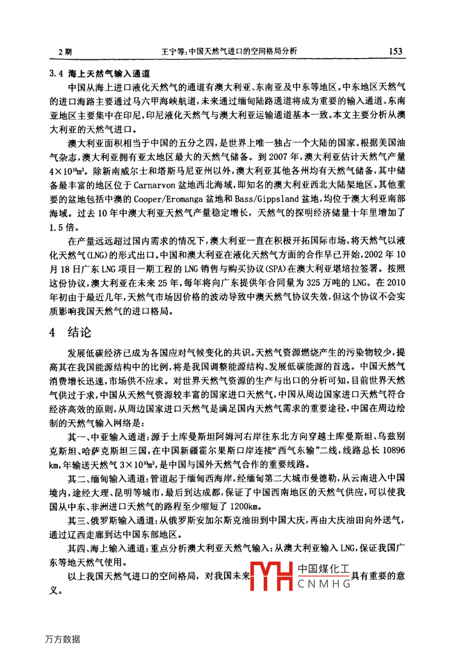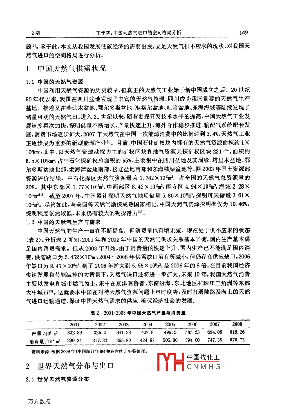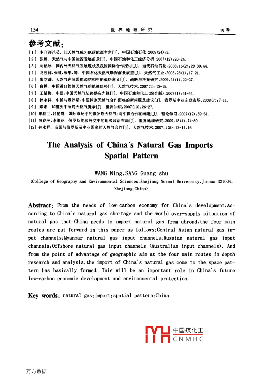 世界地理研究第19卷第2期vol.19,N.22010年3月WORLD REGIONAL STUDIESMay.,2010中國天然氣進口的空問格局分析王寧,桑廣書(浙江師范大學(xué)地理與環(huán)境科學(xué)學(xué)院浙江金華321004摘要:文章從中國發(fā)展低碳經(jīng)濟的需要出發(fā)指出天然氣是一種理想的高效清潔能源,是發(fā)展低碳能源的首選。通過分析中國天然氣供不應(yīng)求、世界天然氣供過于求的市場現(xiàn)狀,以及世界天然氣資源的分布,提出中國從其周邊國家進口天然氣符合經(jīng)濟高效原則。中國從國外進口天然氣主要有四條路線,即中亞輸入通道;緬甸輸入通道;俄羅斯輸入通道;海上輸入通道(重點分析了澳大利亞輸入通道)。文章對此四條路線格局及其地緣優(yōu)勢進行了分析,認為中國天然氣進口的空間格局已基本形成,這將對我國未來發(fā)展低碳經(jīng)濟和保護環(huán)境起重要的促進作用。關(guān)鍵詞:天然氣;進口;空間格局;中國中圖分類號:F124.5文獻標識碼:A哥本哈根聯(lián)合國氣候大會之后,“節(jié)能減排”成為各國應(yīng)對氣候變化的共識。中國政府做出減排承諾,到2020年單位GDP二氧化碳排放量比2005年下降40%至45%,并作為約束性指標,納入國民經(jīng)濟和社會發(fā)展中長期規(guī)劃。但是,在目前中國的能源消費中,清潔能源核電、水電、風(fēng)電等所占比重僅為8.9%。而以煤、石油、天然氣為主導(dǎo)的化石能源占了90%以上其中煤炭的比重更高達68.%。中國的能源稟賦決定了在短時間內(nèi)難以形成清潔能源占主導(dǎo)地位的能源結(jié)構(gòu)。在傳統(tǒng)的化石能源中,天然氣燃燒產(chǎn)生的污染物較少,燃燒后產(chǎn)生的溫室氣體只有煤炭的1/2、石油的2/3,對環(huán)境造成的污染遠遠小于煤炭和石油,且天然氣熱值高達8500大卡遠高于煤氣熱值,可見天然氣是一種理想的高效清潔的能源2,因此提高天然氣在我國能源結(jié)構(gòu)中的比例,將是我國調(diào)整能源結(jié)構(gòu),發(fā)展低碳能源的首選。從世界天然氣生產(chǎn)和消費看(表1),21世紀以來世界天然氣總體供過于求,而我國雖然近年來天然氣開采量在不斷增加,但消費量增長更快,處于供不應(yīng)求的狀態(tài)。據(jù)預(yù)測,到2020年中國天然氣需求量將超過2×10m3,缺口將達到1×10m3。超過50%的對外依存度,將給中國的能源發(fā)展提出新的課襄12001-2007年世界天然氣產(chǎn)量與消費量20052006產(chǎn)量/109m32483.82527.92618.82703.72775.5287222940.0消費量/109m2455.0253352590.92689.22765.22834.4292l.9資料來源:根據(jù)2002~2008年《世界統(tǒng)計年鑒》整理中國煤化工收稿日期:2009-12-21:修訂日期:2010-05-03基金項目:北京市科委軟科學(xué)課題成果CNMHG作者簡介:王寧(1985-),女碩士研究生。主要從事能源地理研究。E-mail:wanning8504020163.com通訊作者:桑廣書(1963-),男,博士,教授。主要從事自然資源、地貌學(xué)等教學(xué)與研究。2期王寧等:中國天然氣進口的空間格局分析題。鑒于此,本文從我國發(fā)展低碳經(jīng)濟的需要出發(fā),立足天然氣供不應(yīng)求的現(xiàn)狀,對我國天然氣進口的空間格局進行分析。中國天然氣供需狀況1.1中國的天然氣資源中國利用天然氣資源的歷史較早,但真正的天然氣工業(yè)始于新中國成立之后。20世紀50年代以來,我國在四川盆地發(fā)現(xiàn)了豐富的天然氣資源四川成為我國重要的天然氣生產(chǎn)基地。接著又在柴達木盆地、鄂爾多斯盆地、準格爾盆地、吐哈盆地、東海海域等陸續(xù)發(fā)現(xiàn)了儲量可觀的天然氣田進入21世紀以來隨著勘探開發(fā)技術(shù)水平的提高中國天然氣工業(yè)發(fā)展速度再次加快,探明儲量不斷增長,產(chǎn)量快速上升,海外合作穩(wěn)步推進輸配氣系統(tǒng)配套發(fā)展,消費市場逐步擴大,2007年天然氣在中國一次能源消費中的比例達到3.4%,天然氣工業(yè)正逐步成為重要的新型能源產(chǎn)業(yè)。目前中國石化礦權(quán)塊內(nèi)擁有的天然氣資源面積約110km2:其中,以天然氣資源勘探為主的礦權(quán)區(qū)塊和油氣資源共探礦權(quán)區(qū)塊221l個,面積約6.5×10%km2,占中石化探礦權(quán)總面積的65%,主要集中在四川盆地及其周緣、塔里木盆地鄂爾多斯盆地北部渤海灣盆地南部、松遼盆地南部和東海陸架盆地等據(jù)2003年國土資源部資源評價結(jié)果,中石化探區(qū)天然氣資源量為1.742×10m3,占全國的天然氣總資源量的30%。其中東部區(qū)1.77×10m,中西部區(qū)8.4×10m3,南方區(qū)494×10m,海域2.28×10"m。截至207年,中國累計探明天然氣地質(zhì)儲量5.86×10%m3,探明可采儲量3.6110m。盡管如此,與美國等天然氣勘探成熟國家相比,中國天然氣資源探明率僅為10.46%,探明程度依然較低,未來仍有較大的勘探潛力。1.2中國的天然氣生產(chǎn)與需求中國天然氣的生產(chǎn)一直在不斷提高,但消費量也有增無減,現(xiàn)在處于供不應(yīng)求的狀態(tài)(表2)。分析表2可知,2001年和2002年中國的天然氣供求關(guān)系基本平衡,國內(nèi)生產(chǎn)基本滿足國內(nèi)消費需求。但從2003年開始,由于消費量的快速上升,國內(nèi)生產(chǎn)已不能滿足國內(nèi)消費供需缺口為2452×10%m3,2004~2006年供需缺口雖有所減小但仍存在供應(yīng)缺口2006年缺口為8.47×10m,到了2008年擴大到555×10和m,是2006年的6倍。在目前我國經(jīng)濟快速發(fā)展和節(jié)能減排的大背景下,天然氣缺