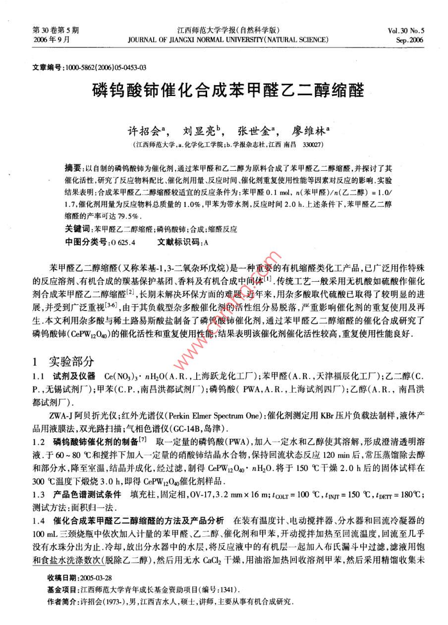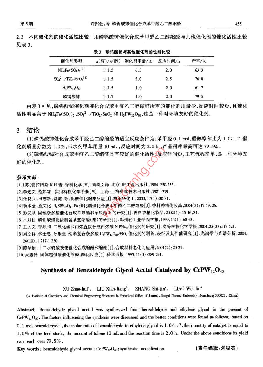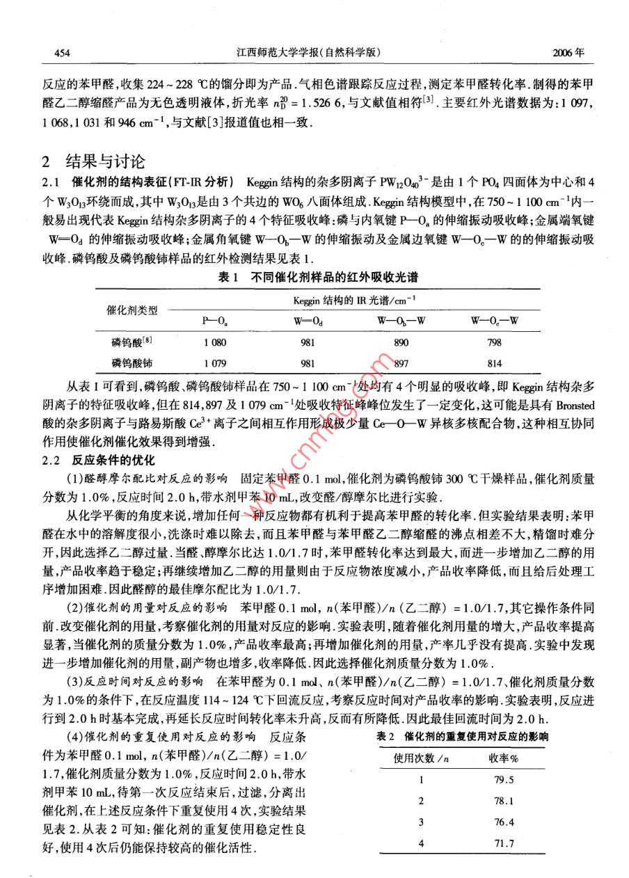 第30卷第5期江西師范大學(xué)學(xué)報(bào)(自然科學(xué)版) Vol.30 No.52006年9月 JOURNAL OF JLANGXI NORMAL UNIVERSITY NATURAL SCIENCE)Sep.2006文章編號(hào):1000-5862(2006)05-0453-03磷鎢酸鈰催化合成苯甲醛乙ニ醇縮醛許招會(huì)a,劉顯亮b,張世金,廖維林(江西師范大學(xué),a.化學(xué)化工學(xué)院;b.學(xué)報(bào)雜志社,江西南昌330027)摘要:以自制的磷鎢酸鈰為催化劑,通過苯甲醛和乙二醇為原料合成了苯甲醛乙二醇縮醛,并探討了其催化活性,研究了反應(yīng)物料配比、催化劑用量、應(yīng)時(shí)間、催化劑重復(fù)使用性能等因素對(duì)反應(yīng)的影響實(shí)驗(yàn)結(jié)果表明:合成苯甲醛乙二醇縮醛較適宜的反應(yīng)條件為:苯甲醛0.1mol,n(苯甲醛)/n(乙二醇)=1.01.7,催化劑用量為反應(yīng)物料總質(zhì)量的1.0%,甲苯為帶水劑,反應(yīng)時(shí)間2.0h.上述條件下,苯甲醛乙二醇縮醛的產(chǎn)率可達(dá)79.5%關(guān)鍵詞苯甲醛乙二醇縮醛;磷鎢酸鈰;合成;縮醛反應(yīng)中圖分類號(hào):0625.4文獻(xiàn)標(biāo)識(shí)碼:A苯甲醛乙二醇縮醛(又稱苯基-1,3-二氧雜環(huán)戊烷)是一種重要的有機(jī)縮醛類化工產(chǎn)品,已廣泛用作特殊的反應(yīng)溶劑、有機(jī)合成的羰基保護(hù)基團(tuán)、香料及有機(jī)合成中間體傳統(tǒng)工藝一般采用無機(jī)酸如硫酸作催化劑合成苯甲醛乙二醇縮醛2,長期未解決環(huán)保方面的難題.近年來,用雜多酸取代硫酸已取得了較明顯的進(jìn)展,并受到廣泛重視36,由于其負(fù)載型雜多酸催化劑的活性組分易脫落,嚴(yán)重影響催化劑的重復(fù)使用及再生本文利用雜多酸與稀土路易斯酸鹽制備了磷鎢酸鈰催化劑,通過苯甲醛乙二醇縮醛的催化合成研究了磷鎢酸鈰(CePW12O40)的催化活性和重復(fù)使用性能,結(jié)果表明該催化劑催化活性較高,重復(fù)使用性能良好1實(shí)驗(yàn)部分1.1試劑及儀器Ce(NO3)3nH2O(A.R.,上海躍龍化工廠);苯甲醛(A.R.,天津福辰化工廠);乙二醇(C.P.,無錫試劑廠);甲苯(C.P.,南昌洪都試劑廠);鎢酸(PWA,A..,上海試劑四廠);乙醇A南昌洪都試劑廠).ZWA-J阿貝折光儀;紅外光譜儀(Perkin Elmer Spectrum One):催化劑測定用Kr壓片負(fù)載法制樣,液體產(chǎn)品用液膜法,雙光路掃描;氣相色譜儀(GC-14B,島津).1.2磷鎢酸鈰催化劑的制備7取一定量的磷鎢酸(PWA),加入一定水和乙醇使其溶解,形成澄清透明溶液.于60~80℃和攪拌下加入一定量的硝酸結(jié)晶水合物,保持回流狀態(tài)反應(yīng)120min后,常壓蒸餾除去醇和部分水,降至室溫,結(jié)晶并成化,經(jīng)過濾,制得Cpwi2O40nH2O.將于150℃干燥2.0h后的固體試樣在300℃溫度下煅燒3.0h,即得CePW12O4催化劑樣品.1.3產(chǎn)品色譜測試條件填充柱,固定相,V17,3.2mm×16m ICoLT=100℃,tn=150℃,e=180℃;測試方法:面積歸一法.1.4催化合成苯甲醛乙二醇縮醛的方法及產(chǎn)品分析在裝有溫度計(jì)、電動(dòng)攪拌器、分水器和回流冷凝器的100mL三頸燒瓶中依次加入計(jì)量的苯甲醛、二醇、催化劑和甲苯,開動(dòng)攪拌加熱至回流溫度,回流至幾乎沒有水珠分出為止冷卻,放出分水器中的水層,將反應(yīng)液中的有機(jī)層一起加入布氏漏斗中過濾,濾液用飽和食鹽水洗滌數(shù)次(脫除乙二醇),然后用無水a(chǎn)Cl2干燥,用油浴加熱回收溶劑甲苯,然后采用精餾收集未收稿日期:2005-03-28基金項(xiàng)目:江西師范大學(xué)青年成長基金資助項(xiàng)目(編號(hào):1341).作者簡介:許招會(huì)(1973-),男,江西吉水人,碩士講師,主要從事有機(jī)合成研究454江西師范大學(xué)學(xué)報(bào)(自然科學(xué)版)2006年反應(yīng)的苯甲醛,收集224~228℃的餾分即為產(chǎn)品氣相色譜跟蹤反應(yīng)過程,測定苯甲醛轉(zhuǎn)化率制得的苯甲醛乙二醇縮醛產(chǎn)品為無色透明液體,折光率n=1.566,與文獻(xiàn)值相符31.主要紅外光譜數(shù)據(jù)為:1097,1068,1031和946cm-1,與文獻(xiàn)[3]報(bào)道值也相一致2結(jié)果與討論2.1催化劑的結(jié)構(gòu)表征(f-R分析) Keggin構(gòu)的雜多陰離子PW12O403-是由1個(gè)PO4四面體為中心和4個(gè)W3O13環(huán)繞而成,其中W3O13是由3個(gè)共邊的WO6八面體組成 Keggin結(jié)構(gòu)模型中,在750~1100cm-內(nèi)一般易出現(xiàn)代表 Keggin結(jié)構(gòu)雜多陰離子的4個(gè)特征吸收峰:磷與內(nèi)氧鍵PO的伸縮振動(dòng)吸收峰;金屬端氧鍵W4的伸縮振動(dòng)吸收峰;金屬角氧鍵WOb-W的伸縮振動(dòng)及金屬邊氧鍵W0W的的伸縮振動(dòng)吸收峰.磷鎢酸及磷鎢酸鈰樣品的紅外檢測結(jié)果見表1.表1不同催化劑樣品的紅外吸收光譜 Keggin結(jié)構(gòu)的IR光譜/cm-1催化劑類型 P-0.W0W-0—磷鎢酸81080981890798磷鎢酸鈰107998197814從表1可看到,磷鎢酸、磷鎢酸鈰樣品在750~110cm-1處均有4個(gè)明顯的吸收峰,即 Keggin結(jié)構(gòu)雜多陰離子的特征吸收峰,但在814,897及1079c-1處吸收特征峰峰位發(fā)生了一定變化,這可能是具有 Bronsted酸的雜多陰離子與路易斯酸Ce3+離子之間相互作用形成極少量Ce0W異核多核配合物,這種相互協(xié)同作用使催化劑催化效果得到增強(qiáng)2.2反應(yīng)條件的優(yōu)化(1)醛醇摩爾配比對(duì)反應(yīng)的影響固定苯甲醛.1mol,催化劑為磷鎢酸鈰300℃干燥樣品,催化劑質(zhì)量分?jǐn)?shù)為1.0%,反應(yīng)時(shí)間2.0h,帶水劑甲苯1mL,改變?nèi)?醇摩爾比進(jìn)行實(shí)驗(yàn)從化學(xué)平衡的角度來說,增加任何一種反應(yīng)物都有機(jī)利于