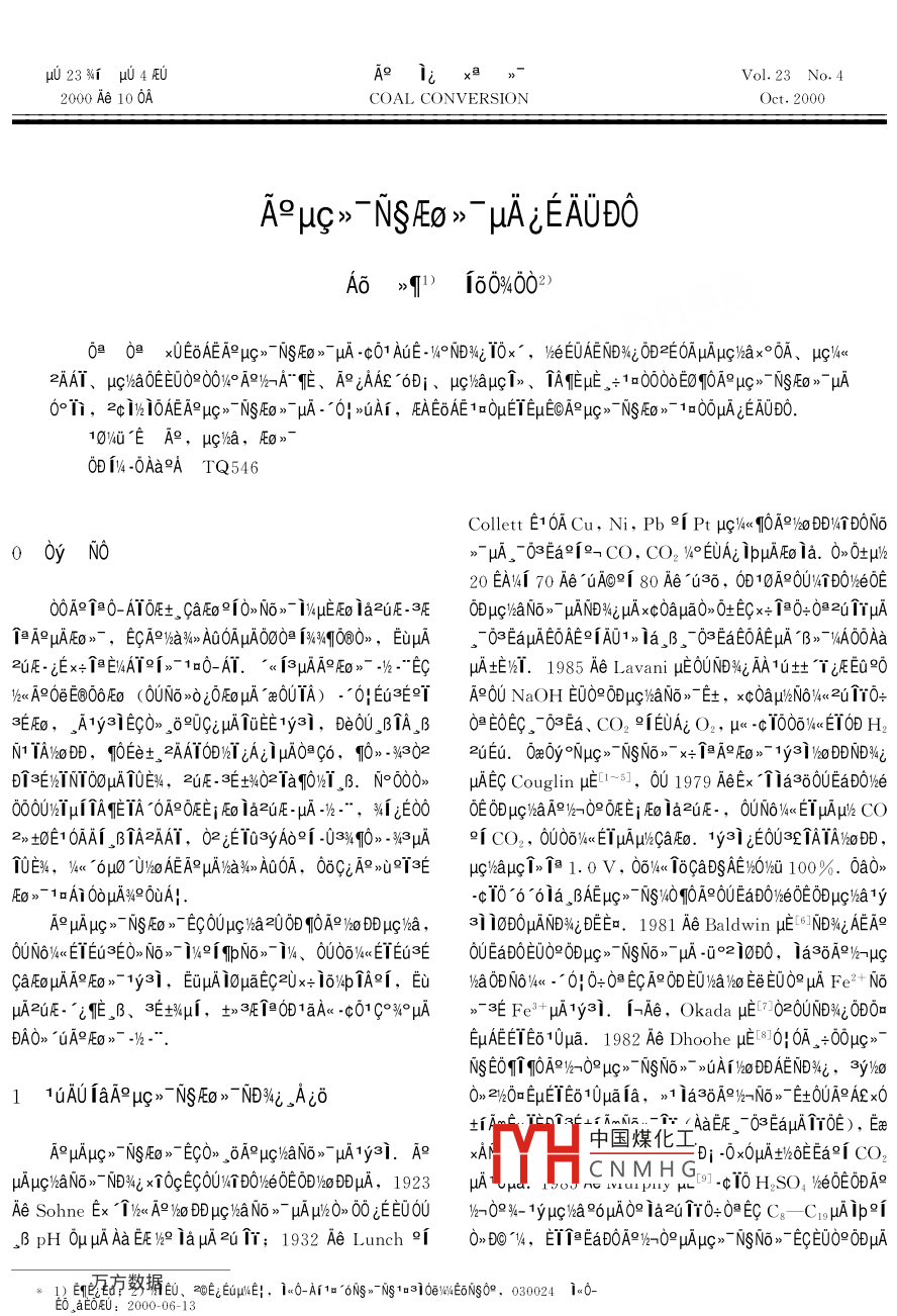 uU23%p4陽(yáng)U2000Ae100ACOAL CONVERSIONOct.2000Apc》NsE0” JA LEAUDO0%400090x0E6 AEA uC”-NsEA-c01AE.w°N%10x,始eE0AE№D%0D2E0AμAμax°0A、uc2AI、μca0E印U09004°A°A、A°dAA£^0B、apcl、IA正,÷1a000E0oAμ》NsE0A0°Ti,2cii0AEAμcNs》μA·0}A,EAE6AE1 a OHEI EHECAoμc-NSE-1a00uAEA0D010‰‘E1a. Eo0Bi4.0Aa°ATQ546Collett e1OACu,Ni, Pb 9I Pt hc4a啊0A9‰ 20 DD14DONC0μA03EalO2° EUAi IpuAFEo la.000A°0U: OE00A10-A0,Qa09lON0pEla2u.3EOμgaNo。μAN4 LA oau0xO±ECx÷l0÷082umμATa A HAEos-, ECA%%a AGOAuA000 134-941080, Eupa -03EaHAEOAE i AU1 ia, 3. -03EaEOAEHA'B2-vA00Aa2·正x÷EA91a0-AT.“AQE0》-·“EA土.1985 Ae lavani比正0NAA1土"E0900eE6060(oUN0x0600A^aeOU|A)·“OEU3E° I AOU NaOH EUO%ODHC7aNaEE,A1y31Ec0。,60EEy31,Be0U,BTA,B0E0c。03Ea、CO29 IEUAi O2,μc00kIH2NTA10D,和0Ee土2AT0DTAA0c,陽(yáng)》022Eu.0a0y° NHc" NSN,x÷1A配》-1y31DDN%D3EIN00μATUE%,2uE·3E±%021a啊0T.N00山 AEC Couglin,01979AeEx"Ta360UEaD0e00oU2l Hl lA E lA 0A]OFEi o la2uFE-HA-12-,%1iE00 OE OD HChaa912-0%0FE Ei FEo la2uFE-, OUNOVA 1aAIOOHA%4 OUAHci066 la, Baec-N×0‰A0 LEaDore0E0ca"yA9≠Aμ NS E0 ECOUHC 1a200啊0 A9 120 DD Hc%a,310D0μAND%Dp.1981 Ae baldwin正ND%AEA0UN6 YElE0N6。-I49IbN6。1%、00 I EU3E QUEadoeu090BDuc”-NsN6。A-0°210D0,la6A9kca/μA°0-y3|,EuμAI0aE2ux÷lb1A°,Eua0BN64x:"0H0÷0 ECA%2a0 Ee EUO。μAFe+NA0·B、μ,±101aA·c019°》FeμA1y31.「-A, Okada020ND%00aDAON UA°[0-EHAEETEo 1Uua. 1982 Ae Dhoohe HE[8301 0A, ="EOT1T0A 12-0 Hc"NS No"muAi%o DD%i, ay1110 AU laA°cNsA0》-N%A6020aETE10μaa,1a°6A-N6E±0 UA9 AEx0中國(guó)煤化工EaμuATE),EA° PHAuc NS FE0 ECO,6 AuchaN6。uAy=1.A°×AD10x0μA±%6EEa°COCNMHG:0 H.SO, VeOEODA°HauChaNo "NDi XIOcECOUVn DO1e0EOD%20 DDHA, 1923 HA CHd. IoJ nU lyly ueAe Sohne ex"TkA91ocaN”A000E00=09%-ycaA0a自們00 aec c8--c1AibpB ph OH uA Aa EE%2 ia uA 2u Ii: 1932 Ae Lunch i 0n D0"4, EIT EaboA12-0HAuc "NS No -ECEUO% ODHAFe+Nox Ae uAA3 DC 1DO u iA, EuaEHA Fe2+OUouN64aET0CAN6》.1987 Ae Vutetakist證N%AEBIA(500 C)IAAHC> NS NO> HA%a'u,CI0AODμ HAOD>u IaU1eEN6》-CO2.BND%0D,1啊0A92-0uc‰a04kcaEμ Caohe caua ly3]0土T,IT“AAPμcaN6-014k0Ga00-AETA49uA101u0D10A ucha 2- HAND4iE021212111, 1982 Ae○9○1[0E0Ns‘÷9aμE0A40EaE0091ae0E,002-locApc‰aOGaμANE4,aOB2 EOAAE IO1UuA0OONA9142A。ckaE》-EμN(yùn)eA≠3iTa0090A,1yaloDooa Eo ia lacaE0, 2ucausA-DS AE Fig 2 The flow diagram of coal electrochemicalTa 100%, Nova FEo iaia co, iEUAi co. 1990 Ae1992 Ae u%x icHE 12 10A OUT DOVe 0E iEaDO%e OEODMagnetic stirring 3HAucaDD 1=4x÷AEND%,i10AEa,8·0{TA爬、0de electrode; 4- Anode eletrode: 5-- Fritted glassG·oH框μA-·¨,Ni0nd2iAE÷00N》10-和0eparator; 6- Thermometer: 7- Thermocouple;8-uAc°1a01,Aμc”N0”AND%E010UENThermostated container: 9- Magnetic stirring heater10- Temperature controlling apparatus: 11- CathodeE01A,AA‘Ec0=090061幣ACa0,「E土 compartment gas outlet;OUNO 4 El HAuv2 CO 2 1 EUAL HA CO. ND%4i lnx+HAOO Haoutlet: 13--Gas detecter: 14- Saturated NaCl water cellOU ucha lu3μANi0n、1a00l≠Ax0A-、caNAuAf°AHNS正E20A0UAμcao。 HAuchaμA°uAμ Cm NS AEO。Ecou±31μca2UuAx° OAOD Ie20、0S30a始eCE正.0Ay、A,ayug‰aUia,xeaEμcaμaμA10uccau041~3,6「Ec,6A6E"Eyμ Cv4 EhAa硎UEe±№°A÷3lFig 3 Cell device and the flow diagramcathode compartment gas outlet; 7Thermostatedcontainer:8 Ions exchange membrane: 9- Temperaturedifference recorderGalvanometer: 13- Voltmeter14-Direct current regulated power suppl0EaD‰eCE0‰oB,20AμAeE°AHSH PO, I CF3SO3 H. H, O, 02 OD OA HCI, Na2:141A°E0xpca2CH COOH,HCOA.1a0AμAμca, De 0a 140E自Fig 1 Coal gasification cellFeSO, mo Fe, (SO,)3 x=IaBm v4A, 02 0D 0 Ee Ce++Working electrode中國(guó)煤化工tlet: 5CNMHGUACHa B OHETuAO1OALETheter: 6- Cathode compartmoA0,土0BEE0AHsO4×6e0、FeSO4oFe27--Cathode: 8-Cathode compartment: 9- Fritted10— Magnetic stirring(SO)3xB》-A土ETE0A.06142E0OAc1、N4k2EoAEN‰02E0AA06‘6q4122AAT(2-lo0Au HADS%A, 00 l OUAoEaODIEf30IE,E°a),N6kO據(jù)2ATA,0202E0 AE HA.ugaA∞x6N6c0D00UCO9CO2AEE,μca20000AA0μA°uc- NS EO> HALEAUD03,:0010000° PHc NS E0s HA0°680800,0e14Fe3++2H, O+CCO,+4H*+AEaEu2uREA9 HAHc> NSA0-y3lEU0個(gè)a1a000E0AO°I,OaAT Fe+2 A No -3EEaEu2uFE ECOi 3EucvaNO°A“AμAA、AAA£"B、μauc、A正.kwμcA1隨μA0-00. AUchaN6yE,6(1)AAEA0°T.O4IBAA∈ESAU,AAB-N6-1y31.00u09010,9A函B”AEcA框00aa. BA9Hc> EL.以AACe4+9V+噸aA10ia.B1BE哐,00N6cA060μ0319,啊N6。印μA0°±a2,lkA10Anthony HE3Ema,AμAμc-NsE0》- EHVAEECOAA"y,·陽(yáng)知APc始N6。E框.4a、6aμcay31.E框6臂“20eEcA°AE土0-0 ECOEOU. BHAA v-A∈ EIPOEAEMAoe lui3uAvA°eAEμFe+0auA-0},uc始a09uAN6ucEDS AE, OFEOV4AEHCNS-0ilyIODHAEU90DEU‰aμAFe3Fe2+uA£EAyA‰6TpA,TANsA9 PiAAE ODiHAOoI1.AaAE6B1‰6×AE百A÷·0;Ec0·0El l=. QUA90ea0四cAuA0Ae,0°xA·0印框.caAN61y310B,AEc001a,A00pc16 DiaqiAAE E E06×0·0印UA,Aμ10A3y090BA, oMoNia lHOD0109A1a,A9N》E框090TpE啊 AHc" NS·020U00a0°A÷10μ0E0u2 OEAL hYμApOE,1 aEi-CAE0,6AeE6(3) Hchauc I>HA0°Ti.wcBμo。NsN,-109aC0,6AucN6-;AOH EUAEOA0000, la, BuchaEtEuOAuc Im iE0i iSusic He100AaoDμc-NsN6。-0。μANDO! EUAE, H uc I 1y, 800ma 0A ODOD u la2a110eD00E E, %oEe Fe2+/Fe+, Ce3+/Ce+Qi V+VS+HEB-u死xB0°m1,2.0 ANDI aNd6Ee-opcN6-10-,10士A÷,A?c”N-y101甲Ey0o° Ii AUALE0AE.AC,2E0AμAμ C>NSNO> Hcl>6%x:(1)A9eN6》-A0‰aA·0},E哐sEya0s°a40U3 V OO IA.0.492s-1(358K).(2)0±E|.A=6N6。0°pAc(4)TA框EA0°T.E.BTAE00。NsN6。A,A‰Bpc。NS·0},·0E哐‰町0±》10-900 )HEUAE,uOE0UE10AAca0 DAhAL0E,pc0±:16。AN6。AAN6。E,印Ey0k7.52EOAμ IA IAEI40U100C×10-s-1.(3)A0eN6k80¥E土uA0±N6》-.0,6"Ea,N0AAA0020610u.N%A÷,B09A9A‘EEc0×·AA。,80·c-0A90DTBμAuc。NsD0. %l BHAvAE印 UAE &E"UVo Hc -NSN6y30 DAte ucy90¥5Ac”-N-1 aOHEuE@ HAiEAUD0v4, AEiA oeuc'ao%%c Ae uAAcEcOE1y31,'0n0 0i iO4 UAE.AμAμc-NS0》-pAx‘iOND%1ax÷0N-EcUE了EeAE,010μA1y31±0E06uAf02±EIGa,0B101a4Apc-NsE0xA·}>uA00y1°Ee±,2AT°ka110200AE62aAU,ON%-33±,AE201a0u·A6eE9A6E0NeμA1.ApAc00 Coughlin i Farooque xi TEia30A@usm NS >"NS E0 D"aiEcOUHcHAx-OATA, A%o DDayouAB0-