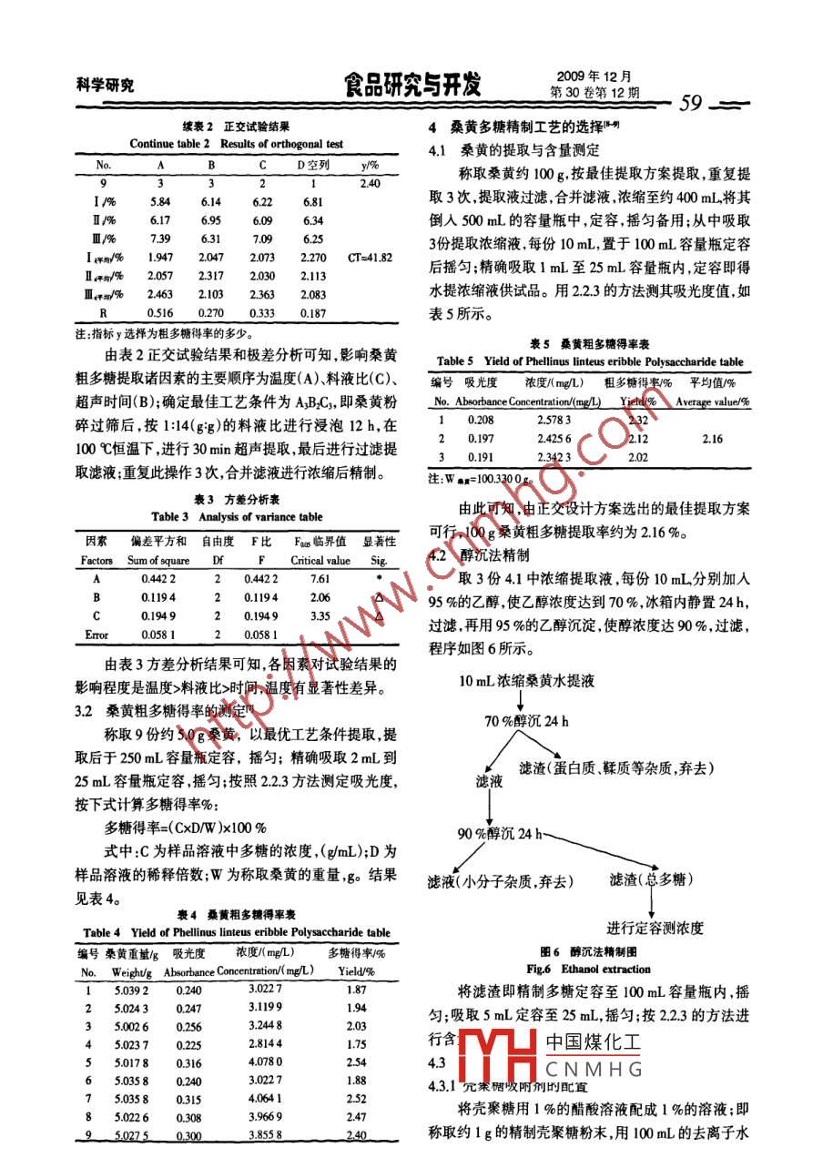 科學(xué)研究食品研究與開發(fā)2009年12月B第3卷第12期桑黃多糖的提取工藝戈延茹,曹恒杰,張曉蘭,卞炯,姜樹紅,吉順莉,張春燕(江蘇大學(xué)藥學(xué)院,江蘇鎮(zhèn)江212013)摘要:篩選出桑黃多糖最佳提取工藝。采取正交設(shè)計(jì)試驗(yàn)優(yōu)選桑黃多糖提取工藝;通過對(duì)醇沉法、殼聚糖吸附法的比較,選出最佳精制工藝。桑黃多糖最佳提取工藝為:按1:14的料水比進(jìn)行浸泡12h,然后在100℃恒溫下,進(jìn)行30min超聲提取,重復(fù)提取3次。精制方法采用殼聚糖吸附法。關(guān)鍵詞:桑黃;多糖;正交設(shè)計(jì);含量測(cè)定TUDY ON THE OPTIMUM EXTRACTION AND PURIFICATION TECHNOLOGY FOR POLYSACCHARIDES FROMPHELLINUS IGNIGARIUSGE Yan-ru, CAO Heng-jie, ZHANG Xiao-lan, BIAN Jiong, JIANG Shu-hong, JI Shun-li, ZHANG Chun-yan(School of pharmaceutical science, Jiangsu University, Zhenjiang 212013, Jiangsu, China)Abstract: Choose the best preparation of the Phellinus igniarius polysaccharide. The best extraction method ofthe polysaccharide was determined by orthogonal design; Through the compare of the ethanol extraction andchitosan absorbing purification, choosing the best extraction method. The best extraction method of thepolysaccharide of the Phellinus igniarius was: At first, the Phellinus igniarius was soaked in water about12 hours, and then when the temperature of extraction was 100 C, the solvent-water and the material is 14: 1extract 3 times during 30 min in supersonic wave. The chitosan absorbing purification was used to extractpolysaccharide. Conclusion: the Phellinus igniarius polysaccharide extracted through the best method was verypure, and the proportion is 1.46 % which means that extracting 1.46 g pure polysaccharide of the phellinus作者簡(jiǎn)介:戈延茹(1960-),女(漢)教授博士在讀,從事中藥制劑與質(zhì)量控制技術(shù)研究。而且上下波動(dòng),沒有明顯的抑制或激活效果,參照數(shù)據(jù)鉬酸銨則是比較理想的激活劑。總體上看,它不屬于抑制劑。鉬酸銨對(duì)醛脫氫酶的抑制效果較為明顯,是一個(gè)抑制劑,抑制效果隨其濃度的參考文獻(xiàn):增加而逐漸增加,但是,在0.5%-0.7%之間的抑制強(qiáng)[江波濤,黃玉賢,孟淑珍,等牛奶保鮮的幾種方法門畜產(chǎn)品加度較強(qiáng),從總體上看,它的抑制效果比較穩(wěn)定,沒有上工,1997,12(6:57下波動(dòng)。2]王敏常喝牛奶好處多四川奶業(yè),2007,2(2)233]孫繼明楊新春黃嘌呤氧化脫氫酶與心血管疾病中華老年心腦血管病雜志,20066(6:63結(jié)論4]皮付偉近紅外光譜技術(shù)在牛奶體細(xì)胞奶酪和奶粉成分中的應(yīng)牛奶中醛脫氫酶的最適溫度為35℃;最適pH為用研究J食品工業(yè)科技,200,(10):15370;最適底物濃度為05%。相應(yīng)的動(dòng)力學(xué)參數(shù)Km=巧韋莉莉水牛奶乳酸脫氫酶同工酶研究廣西農(nóng)業(yè)科學(xué),95,300063moL,vmax=00360Dmin。因此,其動(dòng)力學(xué)中國(guó)煤化工的影響中國(guó)杜區(qū)醫(yī)方程為:V= 0.0361sL-(U/min)7]吳CNMH龍江略東濱地圖出版0063+社,2002:146硝酸鈣和硫脲是比較理想的抑制劑,而硝酸鉀和收稿日期:20007-102009年12月第30卷第12期食品研究與開發(fā)科學(xué)研究igniarius per 100 g crude drug.Key words: Phellinus igniarius; polysaccharide; orthogonal design; the determination of the content桑黃是一種珍貴的藥用真菌叫研究發(fā)現(xiàn)桑黃含有加適量去離子水溶解,轉(zhuǎn)移至100mL容量瓶中,加水多糖、甾醇類物質(zhì)、三萜類芳香酸氨基酸、酶和黃酮至刻度,搖勻配成濃度為0106g的標(biāo)準(zhǔn)葡萄糖溶等多種成分,具有極高的藥用價(jià)值如抗癌、抗纖維化、液備用。增強(qiáng)免疫力、抗血管增生、降血糖等吲。目前國(guó)外特別2.2.25%苯酚試劑的配制是韓國(guó)和日本對(duì)其研究的很多,其抗癌效果顯著,是取苯酚100g,加鋁片0.1g和 NaHcO3005g,蒸一種極具開發(fā)價(jià)值的珍貴藥用真菌;而桑黃無毒副作餾,收集182℃餾分稱取75g加去離子水150mL溶用因此也是開發(fā)保健食品的重要原料明。桑黃不僅可解,置棕色瓶?jī)?nèi)備用。以用于制藥和生產(chǎn)健康食品,還可做為養(yǎng)顏、抗皺、防223標(biāo)準(zhǔn)曲線的制作衰老的活性成分添加到護(hù)膚保健產(chǎn)品中。精確量取上述葡萄糖標(biāo)準(zhǔn)溶液0.1、0.2、0.40.6多糖在抗腫瘤、免疫調(diào)節(jié)、抗衰老、降血糖、抗病08、1.0mL,置于干燥潔凈試管中,分別加去離子水使毒等方面具有重要活性作用,而多糖是桑黃的主要成其成1.0mL,再分別加入5%苯酚溶液20mL,搖勻;分,為了很好的利用這一寶貴資源,本試驗(yàn)對(duì)桑黃多然后加人濃HSO470mL,充分搖勻,室溫放置25min糖的提取精制進(jìn)行了進(jìn)一步的研究。在490nm波長(zhǎng)處測(cè)定吸光度值,同時(shí)做一空白試樣以吸光度值對(duì)葡萄糖濃度做線性回歸,得回歸方程為:1儀器與試劑Y=0072017X+0022317(r=09994,n=6),葡萄糖在11儀器1.0mg/L~100mg/的范圍內(nèi)呈現(xiàn)良好的線性關(guān)系。UV-7502PC紫外可見分光光度計(jì):上海欣茂儀器有限公司;真空干燥箱:江蘇東臺(tái)電器廠;KQ-250B3桑黃多糖提取工藝的選擇型超聲波清洗器昆山市超聲儀器有限公司;HH-S數(shù)3.1制定考察因素和水平間顯恒溫水浴鍋:江蘇省金壇市醫(yī)療儀器廠;SHZ-DⅢ循根據(jù)文獻(xiàn)調(diào)研及數(shù)理統(tǒng)計(jì)設(shè)計(jì)正交試驗(yàn)方案,以環(huán)水式真空泵:鞏義市英峪予華儀器廠;電動(dòng)攪拌器桑黃多糖粗得率為考察指標(biāo)進(jìn)行