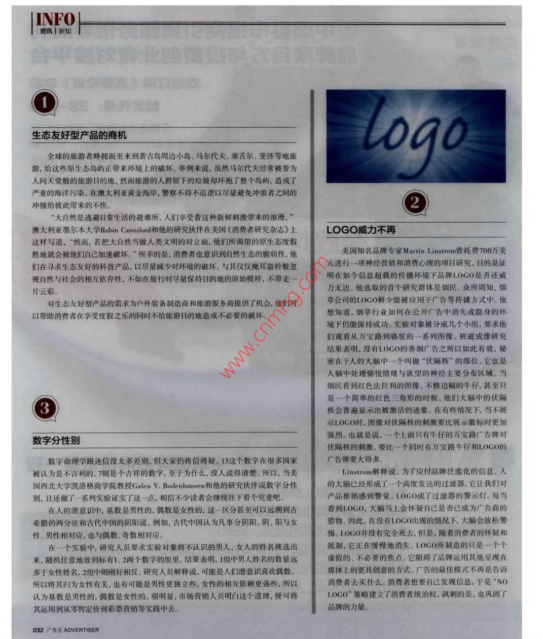 INFO資訊|新知生態(tài)友好型產(chǎn)品的商機00全球的旅游者蜂擁而至來到普吉島周邊小島、馬爾代夫、塞舌爾、斐濟等地旅游,給這些原生態(tài)島嶼正帶來環(huán)境上的破壞。舉例來說,雖然馬爾代夫經(jīng)常被譽為人間天堂般的旅游目的地,然而旅游的人群留下的垃圾卻環(huán)抱了整個島嶼,造成了嚴重的海洋污染。在澳大利亞黃金海岸,警察不得不巡邏以盡量避免沖浪者之間的沖撞給彼此帶來的不快。大自然是逃避日常生活的避難所,人們享受著這種新鮮刺激帶來的浪漫澳大利亞墨爾本大學 Robin Canniford和他的研究伙伴在美國《消費者研究雜志》上LoGo威力不再這樣寫道,“然而,若把大自然當做人類文明的對立面,他們所渴望的原生態(tài)度假勝地就會被他們自己加速破壞。”所幸的是,消費者也意識到自然生態(tài)的脆弱性,他美國知名品牌專家 Martin Instron曾耗費700萬美們在尋求生態(tài)友好的科技產(chǎn)品,以盡量減少對環(huán)境的破壞。與其僅僅掩耳盜鈴般忽元進行一項神經(jīng)營銷和消費心理的項目研究,目的是證視自然與社會的相互依存性,不如在旅行時盡量保持目的地的原始模樣,不帶走明在如今信息超載的傳播環(huán)境下品牌LOGO是否還威片云彩力無邊。他選取的首個研究群體是煙民。眾所周知,煙對生態(tài)友好型產(chǎn)品的需求為戶外裝備制造商和旅游服務商提供了機會,他們可草公司的LOCO鮮少能被應用于廣告等傳播方式中。他以幫助消費者在享受度假之樂的同時不給旅游目的地造成不必要的破壞想知道,煙草行業(yè)如何在公開廣告中消失或隱身的環(huán)境下仍能保持成功。實驗對象被分成幾個小組,要求他們觀看從萬寶路到駱駝的一系列圖像。核磁成像研究結(jié)果表明,沒有LOGO的香煙廣告之所以如此有效,秘密在于人的大腦中一個叫做“伏隔核”的部位。它也是人腦中處理愉悅情緒與欲望的神經(jīng)主要分布區(qū)域。當煙民看到紅色法拉利的圖像、不修邊幅的牛仔,甚至只是一個簡單的紅色三角形的時候,他們大腦中的伏隔核會普遍顯示出被激活的跡象。在有些情況下,當不展示LOGO時,圖像對伏隔核的刺激要比展示徽標時更加數(shù)字分性別強烈。也就是說,一個上面只有牛仔的萬寶路廣告牌對伏隔核的刺激,要比一個同時有萬寶路牛仔和LOGO的數(shù)字命理學跟迷信沒太多差別,但大家仍將信將疑。13這個數(shù)字在很多國家廣告牌要大得多。被認為是不吉利的,7則是個吉祥的數(shù)字,至于為什么,沒人說得清楚。所以,當美Instron解釋說,為了應付品牌泛濫化的信息,人國西北大學凱洛格商學院教授 Galen v. Bodenhausen和他的研究伙伴說數(shù)字分性的大腦已經(jīng)形成了一個高度發(fā)達的過濾器,它讓我們對別,且還做了一系列實驗證實了這一點,相信不少讀者會繼續(xù)往下看個究竟吧產(chǎn)品推銷感到警覺。LOG0成了過濾器的警示燈。每當在人的潛意識中,基數(shù)是男性的,偶數(shù)是女性的,這一區(qū)分甚至可以遠溯到古看到L0GO,大腦馬上會懷疑自己是否已成為廣告商的希臘的兩分法和古代中國的陰陽說。例如,古代中國認為凡事分陰陽,陰、陽與女獵物。因此,在沒有LOCO出現(xiàn)的情況下,大腦會放松警性、男性相對應,也與偶數(shù)、奇數(shù)相對應。惕。LOGO并沒有完全死去,但是,隨著消費者的懷疑和在一個實驗中,研究人員要求實驗對象將不認識的男人、女人的姓名挑選出抵制,它正在緩慢地消失。LOG0所制造的只是一個個來,隨機任意地放到標有1、兩個數(shù)字的組里,結(jié)果表明,1組中男人姓名的數(shù)量遠虛假的、不必要的焦點。它阻礙了品牌運用其他呈現(xiàn)在多于女性姓名,2組中則剛好相反。研究人員解釋說,可能是人們潛意識喜歡偶數(shù)媒體上的更具創(chuàng)意的方式。廣告的最佳模式不再是告訴所以將其歸為女性有關(guān),也有可能是男性更獨立些,女性的相互依賴更強些,所以消費者去買什么。消費者想要自己發(fā)現(xiàn)信息,于是“NO認為基數(shù)是男性的,偶數(shù)是女性的。很明顯,市場營銷人員明白這個道理,便可將LOGO"策略建立了消費者統(tǒng)治權(quán),諷刺的是,也鞏固了其運用到從零售定價到彩票營銷等實踐中去品牌的力量。032廣告主 ADVERTISER