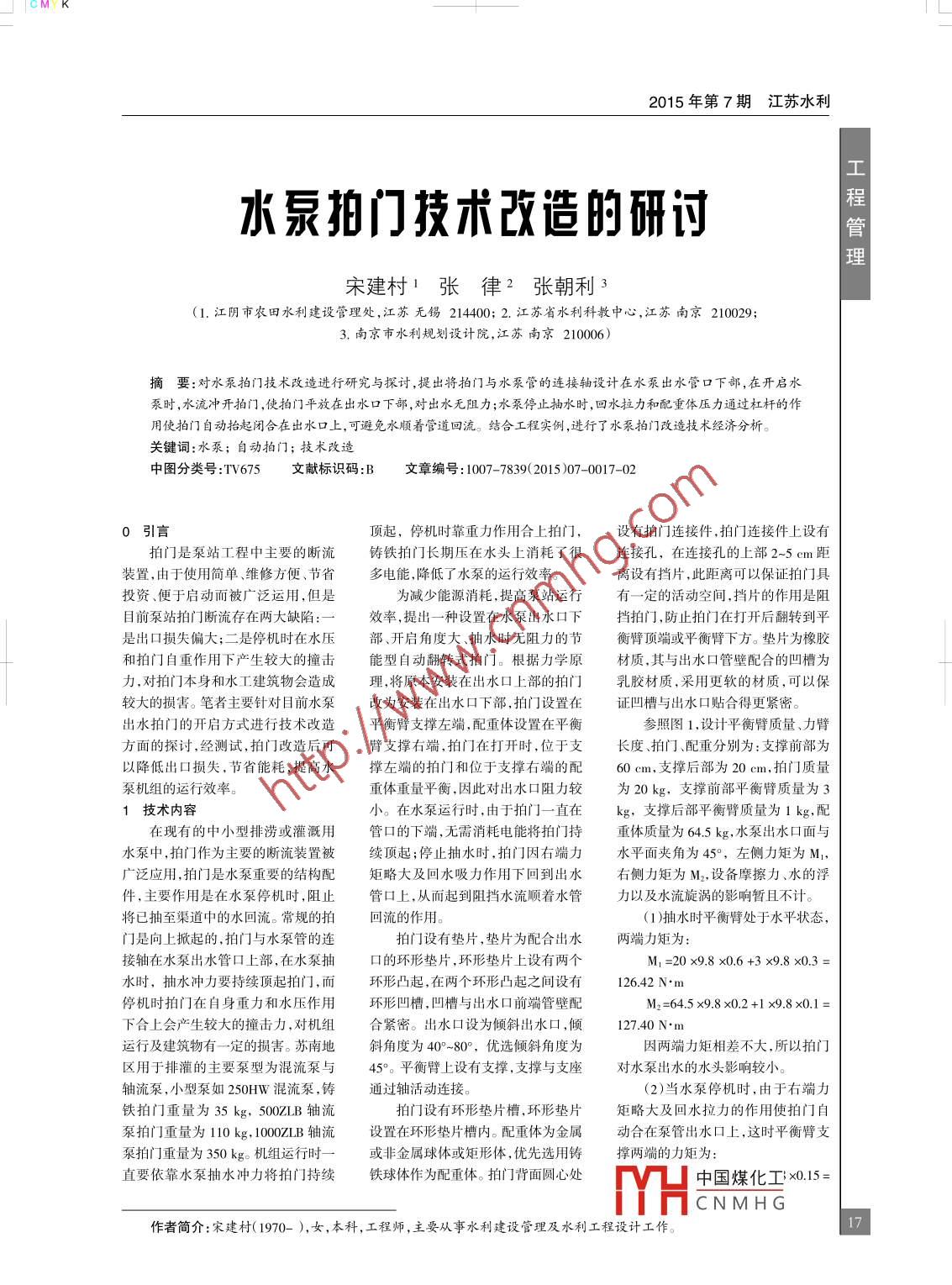 2015年第7期江蘇水利水泵拍門(mén)技術(shù)改造的研討程理宋建村1張律2張朝利(1.江陰市農(nóng)田水利建設(shè)管理處,江蘇無(wú)錫214400;2.江蘇省水利科教中心,江蘇南京210029;3.南京市水利規(guī)劃設(shè)計(jì)院,江蘇南京210006摘要:對(duì)水泵拍門(mén)技術(shù)改造進(jìn)行研究與探討,提岀將拍門(mén)與水泵管的連接軸設(shè)計(jì)在水泵出水管口下部,在開(kāi)啟水泵時(shí),水流沖開(kāi)拍門(mén),使拍門(mén)平放在出水口下部,對(duì)出水無(wú)阻力;水泵停止抽水時(shí),回水拉力和配重體壓力通過(guò)杠桿的作用使拍門(mén)自動(dòng)抬起閉合在出水口上,可避免水順著管道回流。結(jié)合工程實(shí)例,進(jìn)行了水泵拍門(mén)改造技術(shù)經(jīng)濟(jì)分析。關(guān)鍵詞:水泵;自動(dòng)拍門(mén);技術(shù)改造中圖分類(lèi)號(hào):TV675文獻(xiàn)標(biāo)識(shí)碼:B文章編號(hào):1007-7839(2015)07-0017-020引言頂起,停機(jī)時(shí)靠重力作用合上拍門(mén)設(shè)有拍門(mén)連接件,拍門(mén)連接件上設(shè)有拍門(mén)是泵站工程中主要的斷流鑄鐵拍門(mén)長(zhǎng)期壓在水頭上消耗了很連接孔,在連接孔的上部2-5cm距裝置,由于使用簡(jiǎn)單、維修方便、節(jié)省多電能,降低了水泵的運(yùn)行效率離設(shè)有擋片,此距離可以保證拍門(mén)具投資、便于啟動(dòng)而被廣泛運(yùn)用,但是為減少能源消耗,提高泵站運(yùn)行有一定的活動(dòng)空間,擋片的作用是阻目前泵站拍門(mén)斷流存在兩大缺陷效率,提出一種設(shè)置在水泵出水口下?lián)跖拈T(mén),防止拍門(mén)在打開(kāi)后翻轉(zhuǎn)到平是出口損失偏大;二是停機(jī)時(shí)在水壓部、開(kāi)啟角度大、抽水時(shí)無(wú)阻力的節(jié)衡臂頂端或平衡臂下方。墊片為橡膠和拍門(mén)自重作用下產(chǎn)生較大的撞擊能型自動(dòng)翻轉(zhuǎn)式拍門(mén)。根據(jù)力學(xué)原材質(zhì),其與出水口管壁配合的凹槽為力,對(duì)拍門(mén)本身和水工建筑物會(huì)造成理,將原本安裝在出水口上部的拍門(mén)乳膠材質(zhì),采用更軟的材質(zhì),可以保較大的損害。筆者主要針對(duì)目前水泵改為安裝在出水口下部,拍門(mén)設(shè)置在證凹槽與出水口貼合得更緊密出水拍門(mén)的開(kāi)啟方式進(jìn)行技術(shù)改造平衡臂支撐左端,配重體設(shè)置在平衡參照?qǐng)D1,設(shè)計(jì)平衡臂質(zhì)量、力臂方面的探討,經(jīng)測(cè)試,拍門(mén)改造后可臂支撐右端,拍門(mén)在打開(kāi)時(shí),位于支長(zhǎng)度、拍門(mén)、配重分別為:支撐前部為以降低岀口損失,節(jié)省能耗,提高水撐左端的拍門(mén)和位于支撐右端的配60cm,支撐后部為20cm,拍門(mén)質(zhì)量泵機(jī)組的運(yùn)行效率重體重量平衡,因此對(duì)出水口阻力較為20kg,支撐前部平衡臂質(zhì)量為1技術(shù)內(nèi)容小。在水泵運(yùn)行時(shí),由于拍門(mén)一直在kg,支撐后部平衡臂質(zhì)量為1kg,配在現(xiàn)有的中小型排澇或灌溉用管口的下端,無(wú)需消耗電能將拍門(mén)持重體質(zhì)量為64.5kg,水泵出水口面與水泵中,拍門(mén)作為主要的斷流裝置被續(xù)頂起;停止抽水時(shí),拍門(mén)因右端力水平面夾角為45°,左側(cè)力矩為M1廣泛應(yīng)用,拍門(mén)是水泵重要的結(jié)構(gòu)配矩略大及回水吸力作用下回到出水右側(cè)力矩為M2,設(shè)備摩擦力、水的浮件,主要作用是在水泵停機(jī)時(shí),阻止管口上,從而起到阻擋水流順著水管力以及水流旋渦的影響暫且不計(jì)。將已抽至渠道中的水回流。常規(guī)的拍回流的作用(1)抽水時(shí)平衡臂處于水平狀態(tài)門(mén)是向上掀起的,拍門(mén)與水泵管的連拍門(mén)設(shè)有墊片,墊片為配合出水兩端力矩為接軸在水泵出水管口上部,在水泵抽口的環(huán)形墊片,環(huán)形墊片上設(shè)有兩個(gè)M1=20×9.8×0.6+3×98×0.3水時(shí),抽水沖力要持續(xù)頂起拍門(mén),而環(huán)形凸起,在兩個(gè)環(huán)形凸起之間設(shè)有642Nm停機(jī)時(shí)拍門(mén)在自身重力和水壓作用環(huán)形凹槽,凹槽與出水口前端管壁配M,=64.5×9.8×0.2+1×9.8×0.1下合上會(huì)產(chǎn)生較大的撞擊力,對(duì)機(jī)組合緊密。出水口設(shè)為傾斜出水口,傾27.40N·m運(yùn)行及建筑物有一定的損害。蘇南地斜角度為40°-80°,優(yōu)選傾斜角度為因兩端力矩相差不大,所以拍門(mén)區(qū)用于排灌的主要泵型為混流泵與45°。平衡臂上設(shè)有支撐,支撐與支座對(duì)水泵出水的水頭影響較小。軸流泵,小型泵如250HW混流泵,鑄通過(guò)軸活動(dòng)連接(2)當(dāng)水泵停機(jī)時(shí),由于右端力鐵拍門(mén)重量為35kg,500ZLB軸流拍門(mén)設(shè)有環(huán)形墊片槽,環(huán)形墊片矩略大及回水拉力的作用使拍門(mén)自泵拍門(mén)重量為110kg,1000LB軸流設(shè)置在環(huán)形墊片槽內(nèi)。配重體為金屬動(dòng)合在泵管出水口上,這時(shí)平衡臂支泵拍門(mén)重量為350kg。機(jī)組運(yùn)行時(shí)或非金屬球體或矩形體,優(yōu)先選用鑄撐兩端的力矩為:直要依靠水泵抽水沖力將拍門(mén)持續(xù)鐵球體作為配重體。拍門(mén)背面圓心處H中國(guó)煤化工×0.15=CNMHG作者簡(jiǎn)介:宋建村(1970-),女,本科,工程師,主要從事水利建設(shè)管理及水利工程設(shè)計(jì)工作。2015年第7期江蘇水利32×0.85×400/1000×1.732=18.84kW泵站效率n=Na/NA=1