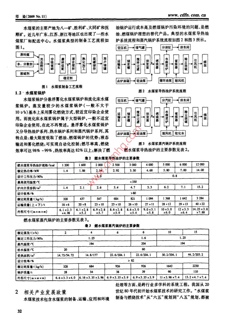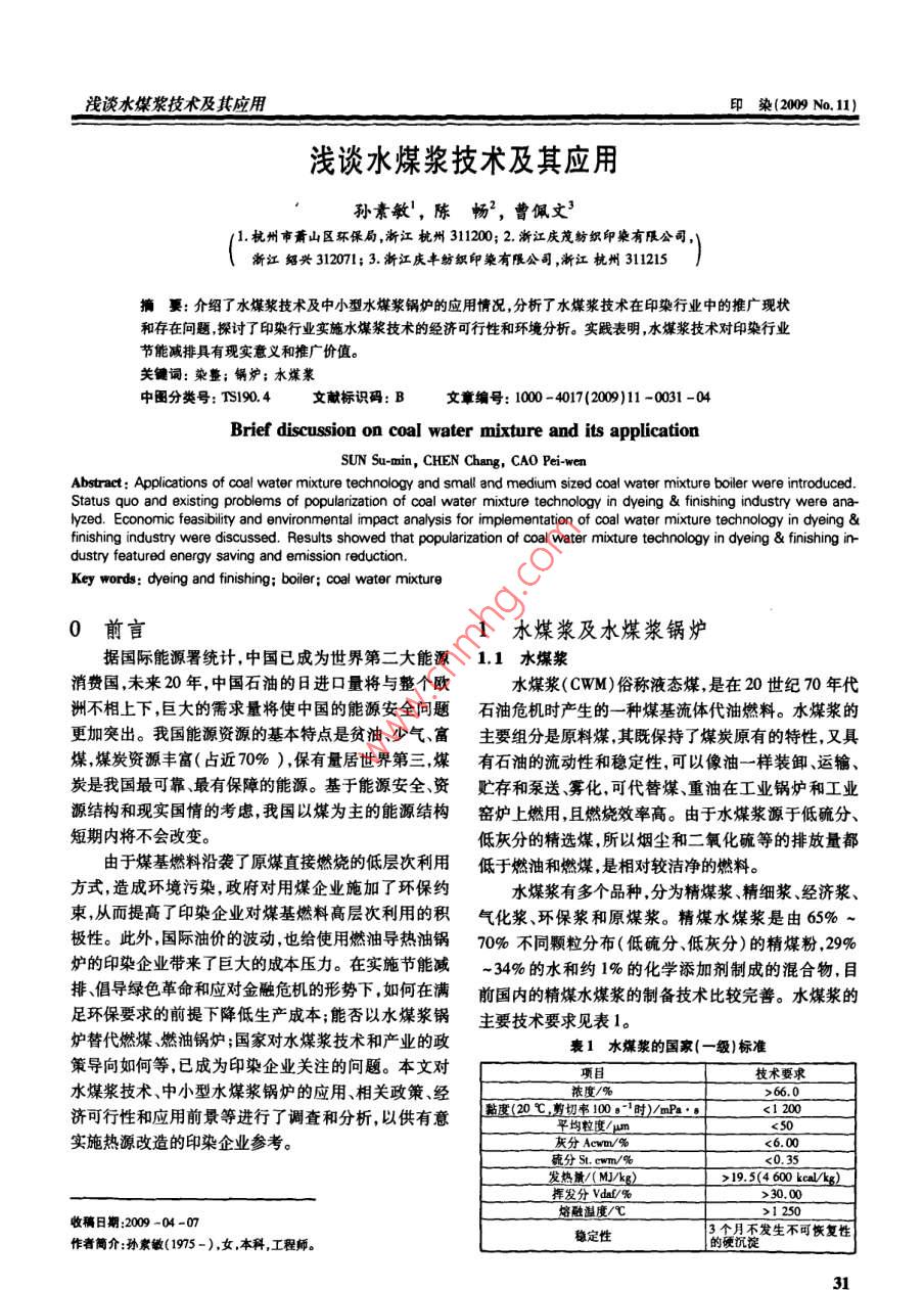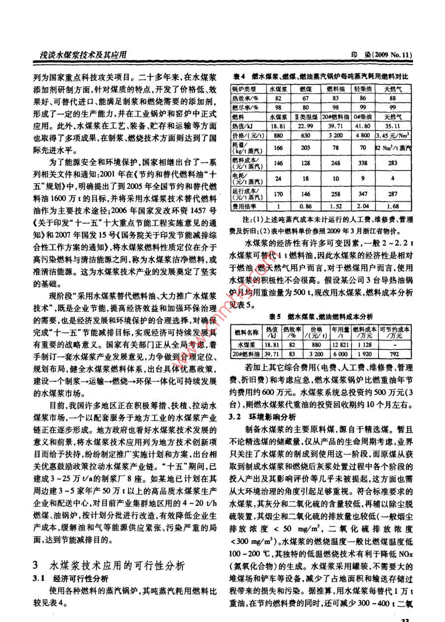 淺談水煤漿技術(shù)及其應(yīng)用印染(2009No.11)淺談水煤漿技術(shù)及其應(yīng)用孫素敏,陳暢,曹佩文31.杭州市蕭山區(qū)環(huán)保局,淅江杭州31100;2淅江慶茂紡織印染有限公司,淅江紹興312071;3.浙江慶豐紡織印染有限公司,漸江杭州311215摘萋:介紹了水煤漿技術(shù)及中小型水煤漿鍋爐的應(yīng)用情況,分析了水煤漿技術(shù)在印染行業(yè)中的推廣現(xiàn)狀和存在問(wèn)題探討了印染行業(yè)實(shí)施水煤漿技術(shù)的經(jīng)濟(jì)可行性和環(huán)境分析。實(shí)踐表明,水煤漿技術(shù)對(duì)印染行業(yè)節(jié)能減排具有現(xiàn)實(shí)意義和推廣價(jià)值。關(guān)鍵詞:染整;鍋爐;水煤漿中圖分類號(hào):Ts190.4文獻(xiàn)標(biāo)文章編號(hào):1000-4017(2009)11-0031-04Brief discussion on coal water mixture and its applicationSUN Su-min, CHEN Chang, CAO Pei-wenAbstract Applications of coal water mixture technology and small and medium sized coal water mixture boiler were introducedStatus quo and existing problems of popularization of coal water mixture technology in dyeing finishing industry were anayzed. Economic feasibility and environmental impact analysis for implementation of coal water mixture technology in dyeingfinishing industry were discussed. Results showed that popularization of coal water mixture technology in dyeing finishing industry featured energy saving and emission reductionKey words: dyeing and finishing: boiler: coal water mixture0前言1水煤漿及水煤漿鍋爐據(jù)國(guó)際能源署統(tǒng)計(jì),中國(guó)已成為世界第二大能源1.1水煤漿消費(fèi)國(guó),未來(lái)20年,中國(guó)石油的日進(jìn)口量將與整個(gè)歐水煤漿(CWM)俗稱液態(tài)煤,是在20世紀(jì)70年代洲不相上下巨大的需求量將使中國(guó)的能源安全問(wèn)題石油危機(jī)時(shí)產(chǎn)生的一種煤基流體代油燃料。水煤漿的更加突出。我國(guó)能源資源的基本特點(diǎn)是貧油、少氣、富主要組分是原料煤其既保持了煤炭原有的特性,又具煤煤炭資源豐富(占近0%),保有量居世界第三,煤有石油的流動(dòng)性和穩(wěn)定性,可以像油一樣裝卸、運(yùn)輸、炭是我國(guó)最可靠、最有保障的能源。基于能源安全資貯存和泵送霧化,可代替煤、重油在工業(yè)鍋爐和工業(yè)源結(jié)構(gòu)和現(xiàn)實(shí)國(guó)情的考慮,我國(guó)以煤為主的能源結(jié)構(gòu)窯爐上燃用,且燃燒效率高。由于水煤漿源于低硫分、短期內(nèi)將不會(huì)改變。低灰分的精選煤,所以煙塵和二氧化硫等的排放量都由于煤基燃料沿襲了原煤直接燃燒的低層次利用低于燃油和燃煤,是相對(duì)較潔凈的燃料。方式,造成環(huán)境污染,政府對(duì)用煤企業(yè)施加了環(huán)保約水煤漿有多個(gè)品種,分為精煤漿、精細(xì)漿、經(jīng)濟(jì)漿、束,從而提髙了印染企業(yè)對(duì)煤基燃料高層次利用的積氣化漿、環(huán)保漿和原煤漿。精煤水煤漿是由65%~極性。此外國(guó)際油價(jià)的波動(dòng),也給使用燃油導(dǎo)熱油鍋70%不同顆粒分布(低硫分、低灰分)的精煤粉,29%爐的印染企業(yè)帶來(lái)了巨大的成本壓力。在實(shí)施節(jié)能減34%的水和約1%的化學(xué)添加劑制成的混合物,目排倡導(dǎo)綠色革命和應(yīng)對(duì)金融危機(jī)的形勢(shì)下,如何在滿前國(guó)內(nèi)的精煤水煤漿的制備技術(shù)比較完善。水煤漿的足環(huán)保要求的前提下降低生產(chǎn)成本;能否以水煤漿鍋主要技術(shù)要求見(jiàn)表1。爐替代燃煤燃油鍋爐;/國(guó)家對(duì)水煤漿技術(shù)和產(chǎn)業(yè)的政表1水煤漿的國(guó)家(一級(jí))標(biāo)準(zhǔn)策導(dǎo)向如何等,已成為印染企業(yè)關(guān)注的問(wèn)題。本文對(duì)技術(shù)要求水煤漿技術(shù)、中小型水煤漿鍋爐的應(yīng)用、相關(guān)政策、經(jīng)濟(jì)可行性和應(yīng)用前景等進(jìn)行了調(diào)查和分析以供有意下度℃率,時(shí)m的實(shí)施熱源改造的印染企業(yè)參考>19.5(4600cA/kg)揮發(fā)分Ⅴdn%1250收稿日期:2009-04-073個(gè)月不發(fā)生不可恢復(fù)性作者簡(jiǎn)介:孫素敏(1975-),女本科,工程師穩(wěn)定性的硬沉淀染www.cdfn.comcn水煤漿的主要產(chǎn)地為八一礦、勝利礦、大同礦和撫油鍋爐運(yùn)行成本高及燃煤鍋爐污染環(huán)境的問(wèn)題,是燃順礦。近幾年廣東、江蘇、浙江等地區(qū)也出現(xiàn)了一些水油燃煤鍋爐理想的替代產(chǎn)品。典型的水煤漿導(dǎo)熱油煤漿廠和配送中心。水煤漿典型的制備工藝流程如爐系統(tǒng)流程和蒸汽鍋爐系統(tǒng)流程如圖2和圖3所示。圖1??諌簷C(jī)}一儲(chǔ)氣罐分油缸供車間匚原科爆水、分散劑脫硫劑穩(wěn)定劑點(diǎn)爐油箱輕油泵上循環(huán)油泵鼓風(fēng)機(jī)圖1水煤漿制備工藝流程1.2·水煤漿鍋爐圖2水煤漿導(dǎo)熱油爐系統(tǒng)流程水煤漿鍋爐分懸浮霧化水煤漿鍋爐和流化床水煤空壓機(jī)一鍵氣罐分汽缸漿鍋爐。蒸發(fā)量較少的水煤漿鍋爐(一般不大于10vh)基本上采用霧化燃燒方式較適宜印染企業(yè)使|運(yùn)用。而流化床水煤漿鍋爐屬于大型鍋爐,一般不適宜|11印染企業(yè)使用在此不再贅述。懸浮霧化水煤漿鍋爐又分導(dǎo)熱油爐系列熱水鍋爐系列和蒸汽鍋爐系列,其點(diǎn)爐油箱輕油泵鼓風(fēng)機(jī)‖軟化水特點(diǎn)是:最大限度吸取了燃油燃煤鍋爐的優(yōu)勢(shì);液態(tài)輸送和霧化燃燒;可實(shí)現(xiàn)自動(dòn