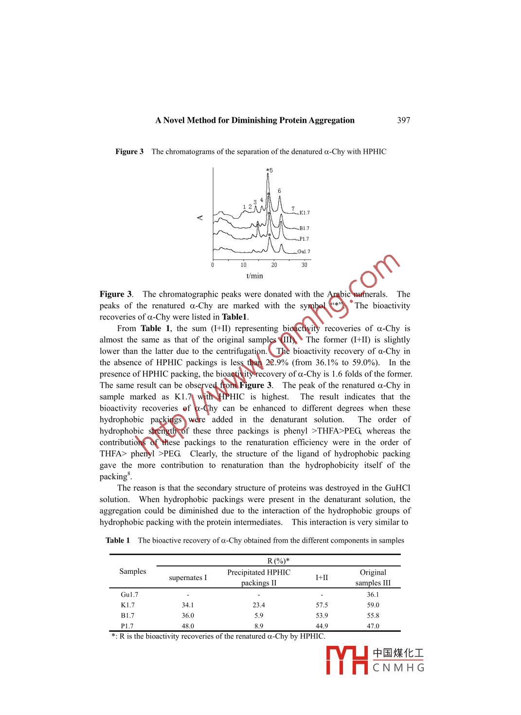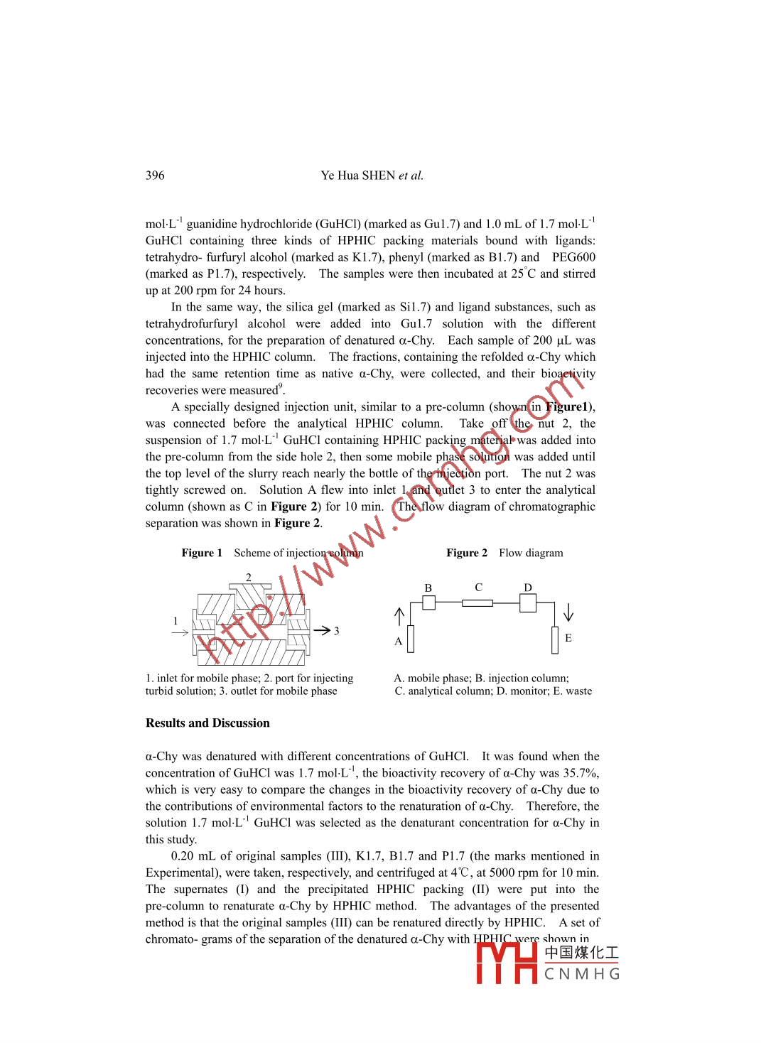 Chinese Chemical Letters Vol. 17, No.3, pp 395-398, 2006395http://www.imm.ac.cn/journal/ccl.htmlA Novel Method for Diminishing Protein Aggregationduring Denatuaration ProcessYe Hua SHEN, Quan BAI, Yang Jun ZHANG, Yin Mao WEI,Hai Bo WANG, Xing Du GENG*Institute of Modern Separation Science, The Key Lab of Modern Separation Science in ShaanxiProvince, Northwest University, Xian 710069Abstract: The addition of packing material for high performance hydrophobic interactionchromatograghy (HPHIC) into the denaturant solution to prevent, or depress protein aggregationin the denatuaration process is presented. The renaturation of a-chymotrypsin (a-Chy)denatured with guanidine hydrochloride (GuHCI) solution indicated that renaturation efficiencycan be enhanced from 36. 1% to 59.0% by this new method. The structure of the ligand linkingof HPHIC packings is also important for the protein renaturation.Keywords: Protein renaturation, a-chymotrypsin, hydrophobic interaction chromatography.Many experimental results show that aggregation is the main side reaction in therenaturation process of proteins and once the proteins aggregate, it is rather difficult tobe renatured again. Therefore, the renaturation efficiency can be highly enhanced, ifthe aggregation is prevented or diminished. Many methods can partially prevent fromthe aggregation of denatured proteins, such as reverse micelles', chaperones', tetra-hydrofurfuryl alcohol (THFA)", polyethylene glycol (PEG)", surfactant,antibodies' andchromatography78 etc..Addition of high-perforamnce hydrophobic interactionchromatography (HPHIC) packing material into the denaturant solution of a.-chymo-trypsin (a-Chy) to prevent, or depress protein aggregation in the denatuaration processwas presented in this paper as a new method for an enhancement of renaturationefficiency.ExperimentalA Shimadzu LC- 10A system with LC- 10Atvp pumps and SPD- 10Avp UV-Vis detectormonitoring at 280 nm was used. The HPHIC packings was synthesized and packed inour lab. The mobile phases consisted of solutions A of 2.5 mol:L' (NH4)2SO4 +0.05mol:L" KH2PO4 (pH 7.0) and B of 0.05 mol-L' KH2PO4 (pH 7.0). The linear gradientwas run from 0-100%B in 25 min at flow rate of 1.0 mL :.min'5.0 mg a-Chy (Shanghai Reagent Company) was dissolved in 1.0 mL of 1.7E-mail: xdgeng@nwu.edu.cn中國煤化工MHCNMH G.396Ye Hua SHEN et al.mol:L"' guanidine hydrochloride (GuHC1) (marked as Gul.7) and 1.0 mL of 1.7 molL'GuHCl containing three kinds of HPHIC packing materials bound with ligands:tetrahydro- furfuryl alcohol (marked as K1.7), phenyl (marked as B1.7) and PEG600(marked as P1.7), respectively. The samples were then incubated at 25 C and stirredup at 200 rpm for 24 hours.In the same way, the silica gel (marked as Sil.7) and ligand substances, such astetrahydrofurfuryl alcohol were added into Gul.7 solution with the differentconcentrations, for the preparation of denatured a-Chy. Each sample of 200 μL wasinjected into the HPHIC column. The fractions, containing the refolded a-Chy whichhad the same retention time as native a-Chy, were collcted, and their bioactivityrecoveries were measured'.A specially designed injection unit, similar to a pre-column (shown in Figure1),was connected before the analytical HPHIC column.Take off the nut 2, thesuspension of 1.7 mol:L" GuHCl containing HPHIC packing material was added intothe pre-column from the side hole 2, then some mobile phase solution was added untilthe top level of the slurry reach nearly the bottle of the injection port. The nut 2 wastightly screwed on. Solution A flew into inlet 1 and outlet 3 to enter the analyticalcolumn (shown as C in Figure 2) for 10 min. The flow diagram of chromatographicseparation was shown in Figure 2.Figure 1 Scheme of injection columnFigure 2 Flow diagram_2BD↑0---0-、-≥3.|| F1. inlet for mobile phase; 2. port for injectingA. mobile phase; B. injection column;turbid solution; 3. outlet for mobile phaseC. analytical column; D. monitor; E. wasteResults and Discussiona-Chy was denatured with different concentrations of GuHCl. It was found when theconcentration of GuHCl was 1.7 mol:L' , the bioactivity recovery of a-Chy was 35.7%,which is very easy to compare the changes in the bioactivity recovery of a-Chy due tothe contributions of environmental factors to the renaturation of a-Chy. Therefore, thesolution 1.7 molL' GuHCl was selected as the denaturant concentration for a-Chy inthis study.0.20 mL of original samples (II), K1.7, B1.7 and P1.7 (the marks mentioned inExperimental), were taken, respectively, and centrifuged at 4C, at 5000 rpm for 10 min.The supermates (I) and the precipitated HPHIC packing (I) were put into thepre-column to renaturate a-Chy by HPHIC method. The advantages of the presentedmethod is that the original samples (II) can be renatured directly by HPHIC. A set ofchromato- grams of the separation of the denatured a-Chy with HPHIC were shown in中國煤化工YHCNMH G.A Novel Method for Diminishing Protein Aggregation397Figure 3 The chromatograms of the separation of the denatured a-Chy with HPHIC- ]_KI-.B1.7- _P1.7)2030t/minFigure 3. The chromatographic peaks were donated with the Arabinumerals. Thepeaks of the renatured a-Chy are marked with the symbol *”The bioactivityrecoveries of a-Chy were listed in Table1.From Table 1, the sum (I+I]) representing bioactivity recoveries of a-Chy isalmost the same as that of the original samples (II)I, The former (+1I) is slightlylower than the latter due to the centrifugation. The bioactivity recovery of a.-Chy inthe absence of HPHIC packings is less than 22.9% (from 36.1% to 59.0%). In thepresence of HPHIC packing, the bioactivity recovery of a-Chy is 1.6 folds of the former.The same result can be observed from Figure 3. The peak of the renatured a-Chy insample marked as K1.7 with HPHIC is highest. The result indicates that thebioactivity recoveries of a.-Chy can be enhanced to different degrees when thesehydrophobic packings were added in the denaturant soluti