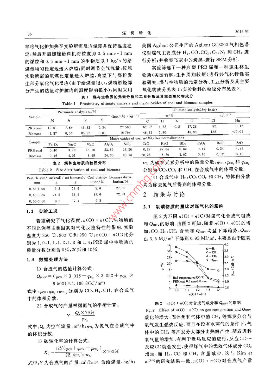 第39卷第1期某炭轉(zhuǎn)化Vol. 39 No. 12016年1月COAL CONVERSIONJan.2016煤與生物質(zhì)共氣化及炭黑的生成特性陳國艷)李 偉莉2)張保森3)鄧浩鑫"張安超”盛偉”摘要在1kg/h規(guī)模的常壓流化床氣化實驗系統(tǒng)上,在850 C,900 C和950 C.n(O) : m(C)分別為1.0,1.1,1.2,1.3和1.4,生物質(zhì)的質(zhì)量分數(shù)分別為20%和40%的條件下,對某地PRB煤和一種生物質(zhì)(美國竹柳)的共氣化特性進行了研究.結(jié)果表明:隨著溫度的升高,H2含量(體積分數(shù),下同)逐漸增加,CO和CH,含量及QHv(合成氣熱值)逐漸減少,合成氣產(chǎn)量和碳轉(zhuǎn)化率增加較多.隨著n(O) ; n(C)的增加,CO,H2,CH含量和QHv呈下降趨勢;合成氣產(chǎn)量和碳轉(zhuǎn)化率增加.隨著生物質(zhì)比例的增加,CO,H2,CH,的含量先減少后增加,Qav增加較多,合成氣產(chǎn)量和碳轉(zhuǎn)化率增加. m(O) : n(C)為1.0時的炭黑量要高于m(O) : n(C)為1.3時的炭黑量.關(guān)鍵詞生物質(zhì),共氣化,流化床,炭黑中圖分類號TQ546為20%和40%的條件下,對某地PRB煤和一種生0引言物質(zhì)的共氣化特性進行了研究;另外,研究了炭黑的煤氣化技術(shù)作為潔凈煤技術(shù)的重要組成部分,生成特性隨溫度及n(O) : n(C)的變化情況,以在由于具有高煤炭利用效率和低污染排放的特點,近.煤與生物質(zhì)共氣化生成可燃氣體的同時,尋求有用年來得到快速發(fā)展.生物質(zhì)與煤的物理化學(xué)性質(zhì)不的副產(chǎn)物.同,二者的有機反應(yīng)特性和無機反應(yīng)特性不同,煤與1實驗部分生物質(zhì)的單獨氣化過程不同,煤與生物質(zhì)的共氣化特性更為復(fù)雜.生物質(zhì)進入氣化爐后,先析出表面水1.1實驗 系統(tǒng)及煤樣分,然后在200 C以上開始干燥,當(dāng)溫度升高到300 C,常壓流化床煤與生物質(zhì)共氣化實驗系統(tǒng)如圖1開始進行熱解反應(yīng);當(dāng)溫度達到400 C ,揮發(fā)分基本所示.整個系統(tǒng)由一維電加熱爐、煤與生物質(zhì)給料裝上能夠析出完全;煤要到800 C才能將揮發(fā)分析出完全,兩者共氣化會相互影響,煤的氣化效率更高.5014金會心等[0]通過煤與生物質(zhì)的熱解實驗,得Y Coual federSample port到了表面特性改善的半焦;宋新潮等[6]研究發(fā)現(xiàn),幾www.-analysis種煤與生物質(zhì)共氣化后,碳轉(zhuǎn)化率和合成氣中可燃Valve8Elxash氣體含量均高于單獨生物質(zhì)或煤氣化時的碳轉(zhuǎn)化率Flow metera和可燃氣體含量;李克忠等切利用煤與生物質(zhì)共氣化制備富氫氣體,結(jié)果表明,在不同工況下產(chǎn)生的合成氣含H2量不同.因此,煤與生物質(zhì)共氣化,不僅F回x本Batamash可以得到可燃的合成氣,而且可以得到相對富裕的Air tankH2或CO等,還可以通過調(diào)節(jié)生物質(zhì)的量來得到合圖1氣化實驗測試系統(tǒng)示意圖適的半焦等產(chǎn)物.為研究生物質(zhì)在煤氣化中的共氣Fig. 1 Schematic diagram of coal gasification test system化特性,在1kg/h規(guī)模的常壓流化床氣化實驗系統(tǒng)置、供氣系統(tǒng)、氣體取樣和分析裝置組成.爐膛加熱上,在850 C,900 C和950 C,n(O) : n(C)分別為段高度為2 m,內(nèi)徑為63.5 mm,氣化爐溫度由自上1.0,1.1,1.2,1.3,1.4,生物質(zhì)占總質(zhì)量的比例分別而下伸人爐膛的熱電偶測定.首先以- -定的升溫速,國家自然科學(xué)青年基金資助項目(51306046).1)博士后、副教授;3)高級工程師;4)博士、副教授,河南理工大學(xué)機械與動力工程學(xué)院,454000河南焦作 ;2)講師,鄭州職業(yè)技術(shù)學(xué)院機械系,450121鄭州收稿日期:2015-01-22;修回日期:2015-05-2236煤炭轉(zhuǎn)化2016年率將氣化爐加熱至實驗所需反應(yīng)溫度并保持溫度穩(wěn)美國Agilent公司生產(chǎn)的Agilent GC3000氣相色譜定;然后開啟螺旋給料機將粒度為0.5 mm~1 mm儀對煤氣主要成分H2,CO,CO2,O2,N2和CH進的煤粒和0.6mm~1mm的生物質(zhì)以1kg/h的給行分析;并收集飛灰中的炭黑,進行SEM分析.煤量均勻穩(wěn)定地送入爐膛;同時調(diào)節(jié)空氣流量,按照實驗篩選了一種典型PRB煤和- -種速生林生實驗所需的氧煤比定量送人爐膛,高溫下與煤粉發(fā)物質(zhì)(美國竹柳,生長周期較短)進行共氣化特性實生部分氧化氣化反應(yīng)(由于給煤量很小,煤粉燃燒部驗研究,煤與生物質(zhì)的元素分析、工業(yè)分析及其主要分產(chǎn)生的熱量對爐膛內(nèi)的溫度影響很小),同時采用氧化物成分見表1;實驗物料的粒徑分布見表2.表煤與生物質(zhì)的元素分析和工業(yè)分析及其主要氧化物成分Table 1 Proximate, ultimate analysis and major oxides of coal and biomass samplesUltimate analysis( dry basis)Proximate analysis w/%Sample: Qow/(kJ.kg~")rw/%w/10AVsH_N_0_CHgPRBcoal 15.01 7.64 43. 320. 5427 56069.02 4.72 0.8 17. 28820.12Biomass__ 6.57 0. 5680. 20, 0119 79446.6532<0.01Major oxides of coal w/ % (after normalization)Fe2O3 Na2OMgOAl2O3SiOzCaOKzOSO3BaOSrOPRB coal3. 7913.1023.69 23. 20D.2727. 840.820.440.344. 89Biomass0.164.019.4924. 3028. 9820.286.70表2煤和生物質(zhì)的粒徑分布wc為碳在元素分析中的質(zhì)量分數(shù);Qc>,9CO2和9CH,Table 2 Size distribution of coal and biomass分別為CO,CO2和CH4在合成氣中的體積分數(shù).Paricle size/ m(coal)/ m( biomass>/ Coal distrb- Biomass distri-4)合成氣中H2 ,CO,CO2和CH的體積分數(shù)mmgution/%_ bution/%均為除去氮氣后得到的體積分數(shù).0. 85-1.002.13. 62.627.090, 60-0. 8574. 536.672. 912結(jié)果與討論0. 50-0.608.317. 49. 82.1氧碳物質(zhì)的量比對煤氣化的影響1.2 實驗工況著重研究了氣