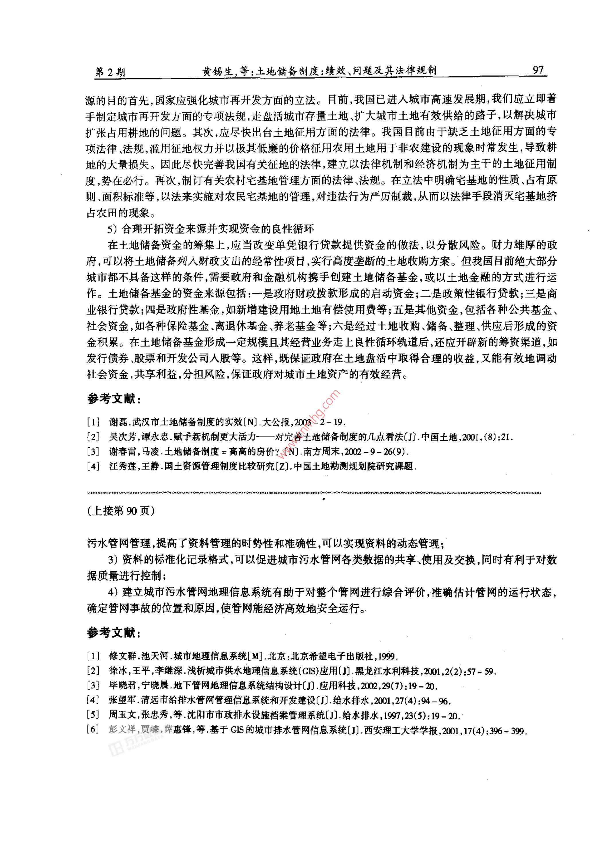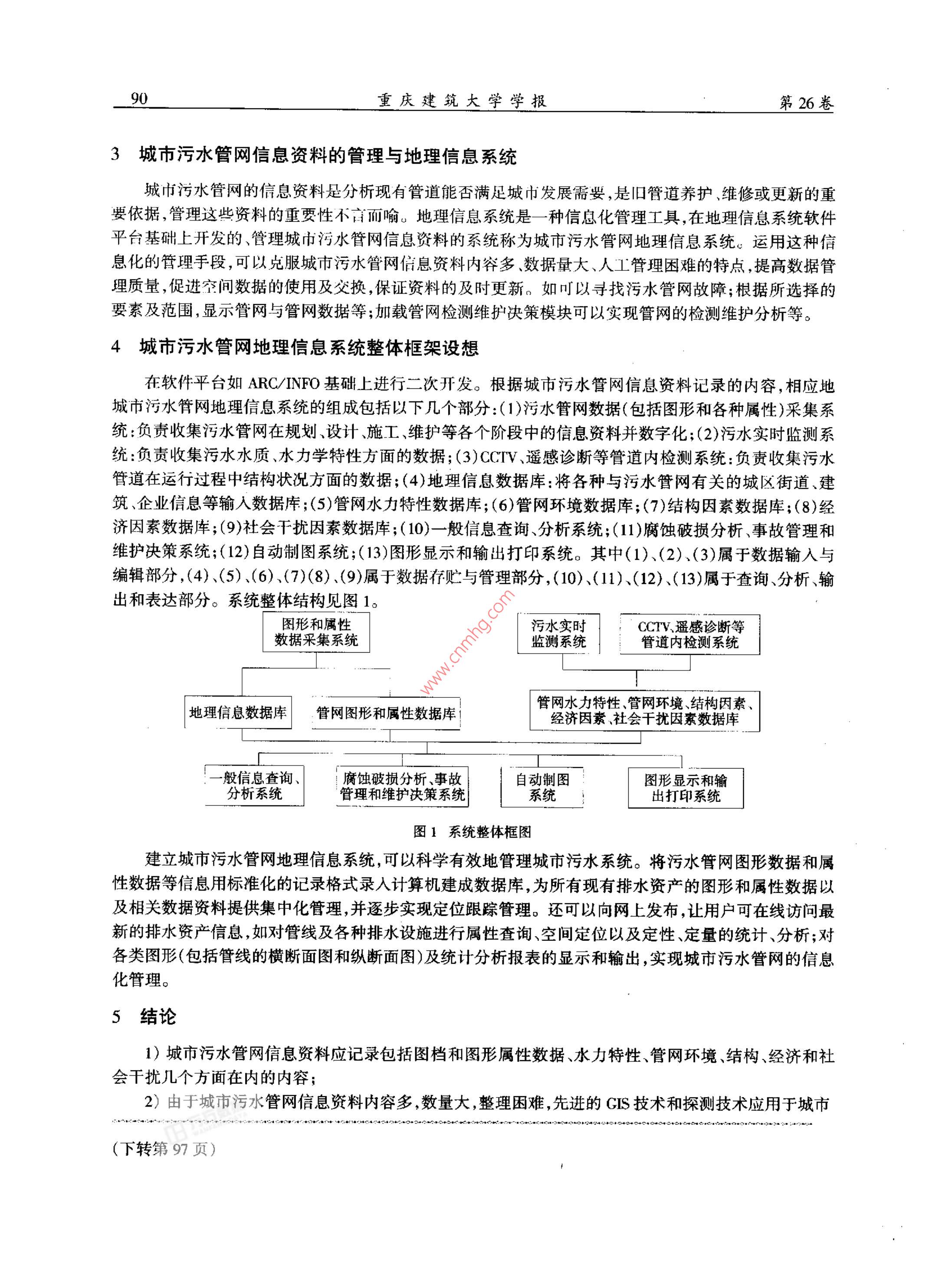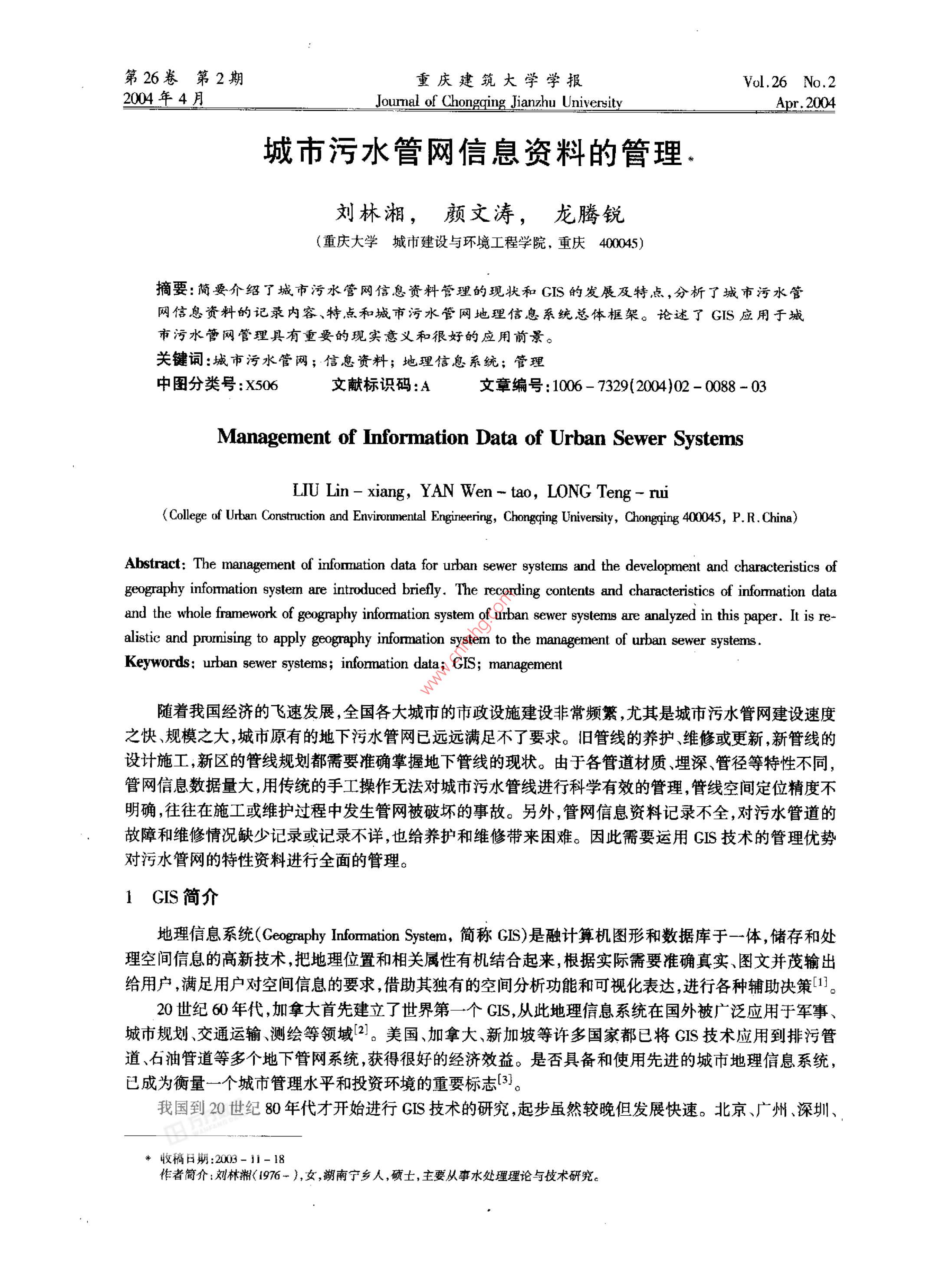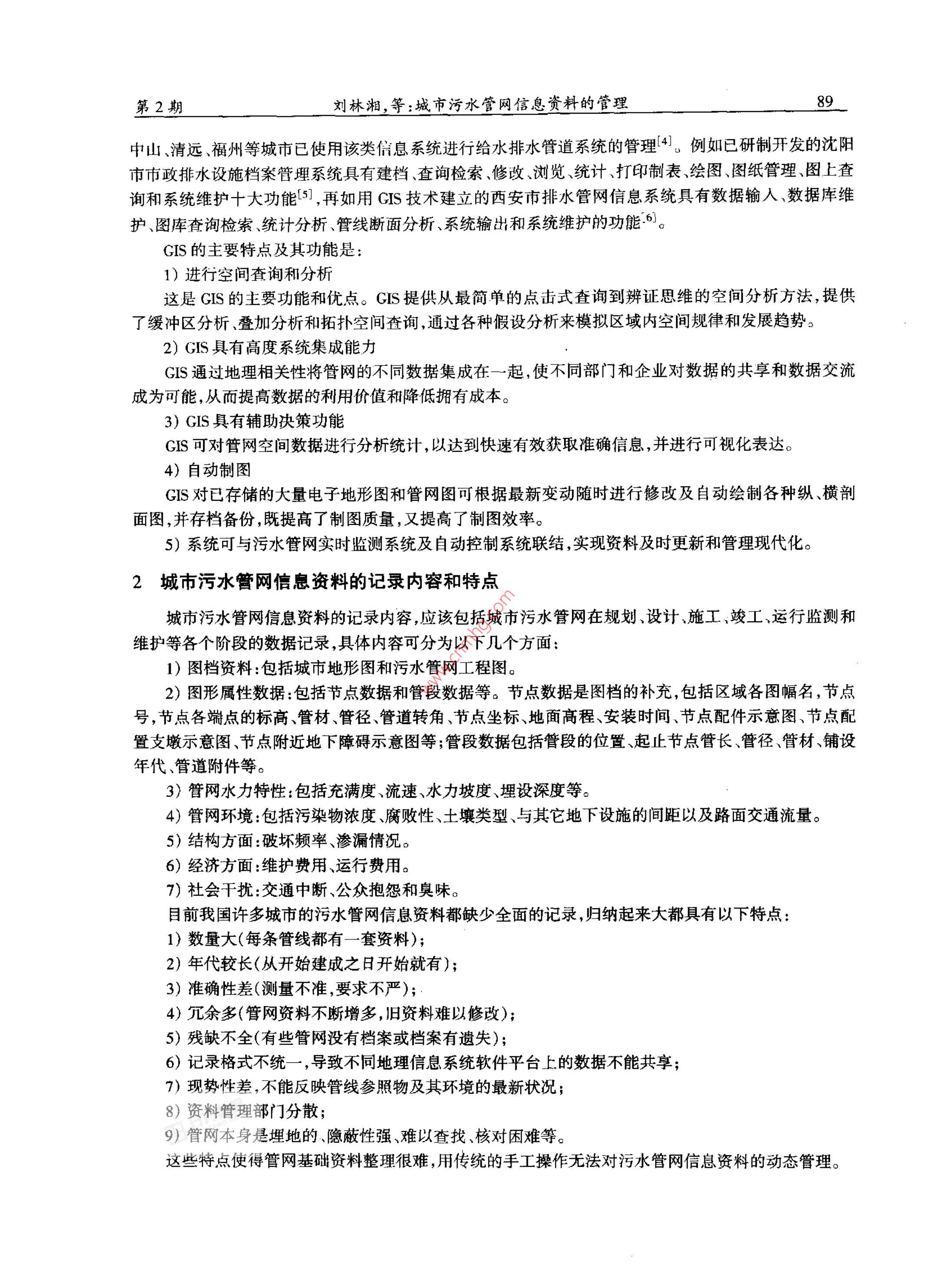 第26卷第2期重慶建筑大學(xué)學(xué)報(bào)Vol.26 No.22004年4月Joumal of Chonging Jianzhu UniversityApr .2004城市污水管網(wǎng)信息資料的管理.劉林湘,顏文濤,龍騰 銳(重慶大學(xué)城市建設(shè)與環(huán)境工程學(xué)院, 重慶400045)摘要:簡(jiǎn)要介紹了城市污水管網(wǎng)信息資料管理的現(xiàn)狀和CIS的發(fā)展及特點(diǎn),分析了城市污水管網(wǎng)信息資料的記錄內(nèi)容、特點(diǎn)和城市污水管網(wǎng)地理信息系統(tǒng)總體框架。論述了GIS 應(yīng)用于城市污水管網(wǎng)管理具有重要的現(xiàn)實(shí)意義和很好的應(yīng)用前景。關(guān)鍵詞:城市污水管網(wǎng);信息資料;地理信息系統(tǒng);管理中圖分類號(hào):X506 ,文獻(xiàn)標(biāo)識(shí)碼:A文章編號(hào):1006 - 7329(2004)02 - 0088 - 03Management of Information Data of Urban Sewer SystemsLIU Lin- xiang, YAN Wen- tao, LONG Teng - rui(College of Urban Construction and Envirormental Engineering, Chongqing University, Chongqing 400045, P. R. China)Abstract: The management of infomation data for urban sewer systerms and the development and characteristics ofgeography information system are introduced briefly. The recording contents and characteristics of information dataand the whole framework of geography information system of urban sewer systems are analyzed in this paper. It is re-alistic and promising to apply geography information system to the management of urban sewer systems.Keywords: urban sewer systems ; infomation data; GIS; management隨著我國(guó)經(jīng)濟(jì)的飛速發(fā)展,全國(guó)各大城市的市政設(shè)施建設(shè)非常頻繁,尤其是城市污水管網(wǎng)建設(shè)速度之快、規(guī)模之大,城市原有的地下污水管網(wǎng)已遠(yuǎn)遠(yuǎn)滿足不了要求。舊管線的養(yǎng)護(hù),維修或更新,新管線的設(shè)計(jì)施工,新區(qū)的管線規(guī)劃都需要準(zhǔn)確掌握地下管線的現(xiàn)狀。由于各管道材質(zhì)埋深、管徑等特性不同,管網(wǎng)信息數(shù)據(jù)量大,用傳統(tǒng)的手工操作無(wú)法對(duì)城市污水管線進(jìn)行科學(xué)有效的管理,管線空間定位精度不明確,往往在施工或維護(hù)過(guò)程中發(fā)生管網(wǎng)被破壞的事故。另外,管網(wǎng)信息資料記錄不全,對(duì)污水管道的故障和維修情況缺少記錄或記錄不詳,也給養(yǎng)護(hù)和維修帶來(lái)困難。因此需要運(yùn)用GIS技術(shù)的管理優(yōu)勢(shì)對(duì)污水管網(wǎng)的特性資料進(jìn)行全面的管理。1GIS簡(jiǎn)介地理信息系統(tǒng)(Geography Information System, 簡(jiǎn)稱GIS)是融計(jì)算機(jī)圖形和數(shù)據(jù)庫(kù)于一體,儲(chǔ)存和處理空間信息的高新技術(shù),把地理位置和相關(guān)屬性有機(jī)結(jié)合起來(lái),根據(jù)實(shí)際需要準(zhǔn)確真實(shí)、圖文并茂輸出給用戶,滿足用戶對(duì)空間信息的要求,借助其獨(dú)有的空間分析功能和可視化表達(dá),進(jìn)行各種輔助決策[1。20世紀(jì)60年代,加拿大首先建立了世界第-一個(gè)GIS,從此地理信息系統(tǒng)在國(guó)外被廣泛應(yīng)用于軍事、城市規(guī)劃、交通運(yùn)輸、測(cè)繪等領(lǐng)域[2]。美國(guó)、加拿大、新加坡等許多國(guó)家都已將GIS技術(shù)應(yīng)用到排污管道、石油管道等多個(gè)地下管網(wǎng)系統(tǒng),獲得很好的經(jīng)濟(jì)效益。是否具備和使用先進(jìn)的城市地理信息系統(tǒng),已成為衡量一個(gè)城市管理水平和投資環(huán)境的重要標(biāo)志[3]。我國(guó)到20世紀(jì)80年代才開始進(jìn)行GIS技術(shù)的研究,起步雖然較晚但發(fā)展快速。北京、廣州、深圳、*收稿日期:2003-11- 18作者簡(jiǎn)介:劉林糊<1976- ),女,湖南寧鄉(xiāng)人,碩士,主要從事水處理理論與技術(shù)研究。.第2期劉林湘,等:城市污水管網(wǎng)信息資料的管理_89_中山、清遠(yuǎn)、福州等城市已使用該類信息系統(tǒng)進(jìn)行給水排水管道系統(tǒng)的管理[4)。例如已研制開發(fā)的沈陽(yáng)市市政排水設(shè)施檔案管理系統(tǒng)具有建檔、查詢檢索、修改、瀏覽統(tǒng)計(jì)、打印制表、繪圖、圖紙管理、圖上查.詢和系統(tǒng)維護(hù)十大功能[5],再如用CIS技術(shù)建立的西安市排水管網(wǎng)信息系統(tǒng)具有數(shù)據(jù)輸人、數(shù)據(jù)庫(kù)維護(hù)、圖庫(kù)查詢檢索、統(tǒng)計(jì)分析、管線斷面分析、系統(tǒng)輸出和系統(tǒng)維護(hù)的功能。GIS的主要特點(diǎn)及其功能是:1)進(jìn)行空間查詢和分析這是GIS的主要功能和優(yōu)點(diǎn)。CIS提供從最簡(jiǎn)單的點(diǎn)擊式查詢到辨證思維的空間分析方法,提供了緩沖區(qū)分析疊加分析和拓?fù)淇臻g查詢,通過(guò)各種假設(shè)分析來(lái)模擬區(qū)域內(nèi)空間規(guī)律和發(fā)展趨勢(shì)。2)GIS具有高度系統(tǒng)集成能力GIS通過(guò)地理相關(guān)性將管網(wǎng)的不同數(shù)據(jù)集成在一起,使不同部門和企業(yè)對(duì)數(shù)據(jù)的共享和數(shù)據(jù)交流成為可能,從而提高數(shù)據(jù)的利用價(jià)值和降低擁有成本。3)GIS具有輔助決策功能GIS可對(duì)管網(wǎng)空間數(shù)據(jù)進(jìn)行分析統(tǒng)計(jì),以達(dá)到快速有效獲取準(zhǔn)確信息,并進(jìn)行可視化表達(dá)。4)自動(dòng)制圖GIS對(duì)已存儲(chǔ)的大量電子地形圖和管網(wǎng)圖可根據(jù)最新變動(dòng)隨時(shí)進(jìn)行修改及自動(dòng)繪制各種縱、橫剖