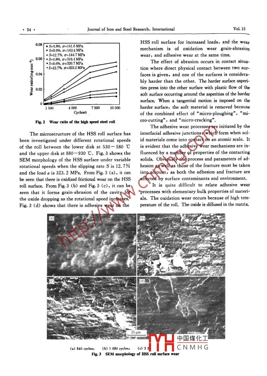 Available online at www.sciencedirect.comScienceDirectJOURNAL OF IR0N AND STEEI. RESEARCH, INTERNATIONAL. 2008, 15(6); 52-55New Method for Evaluating Thermal Wear of Rolls in Rolling ProcessLI Chang-sheng, LIU Xiang-hua, WANG Guo-dong(State Key Laboratory of Rolling and Automation, Northeastern University, Shenyang 10004, Liaoning, China)Abstract: A new method was developed by a thermal wear machine to evaluate the thermal wear of rolls in steel roll-ing process. The steel strip and rolls were simulated by upper and lower heating disks. The upper heating disk couldbe kept at a temperature of over 900 C by induction heating. The pressure between the disks as high as 323.2 MPacould be achieved and the slpping rate could be 12. 7%. The thermal wear of high speed steel (HSS) roll material, the wearrate of the HSS rll, and the SEM morphology of a worn HSS roll surface were investigated. This method was usefuland could be employed to simulate friction and wear between strip and roll during the strip rolling process.Key words; thermal wear; roll; friction; strip rolling; induction heatingThe roll is one of the most important tools in However, this equipment was a mill and the work-the rolling process. Its surface may get worn out be-piece that needed to be heated and rolled for stud-cause of the relative slip between the roll surface andying the frictional wear. Thus, for some workpieces,steels for the fast changes in both rolling force andit was almost impossible to study the wear under differ-temperature. In designing and calculating the wearent slipping rate and load for a long period.crown of rolls, the roll wear is a very important fac-In this paper, the thermal wear test method istor and has to be taken into consideration, as it candeveloped, which is a disk-like machine. The upperreduce the difficulty in controlling steel shape andand lower disks are used to simulate the workpieceincrease the accuracy in the calculation model of theand the roll, respectively. The upper disk can beroll wear crown. Furthermore, the wear of the rollheated up to 900 C through an induction coil. Thsurface will directly affect the surface quality ofload can be exerted as high as 323. 2 MPa betweensteel. Therefore, it is significant to develop an appro-disks, and the maximum slippage ratio is 12. 7%.priate method to evaluate the roll wear and to study the1 Principlemechanism of roll wear based on friction theory.To date, many studies have been carried out con-To evaluate the thermal wear of rolls, a newcerning roll wear. For example, Kato'1] developed atest machine was developed, which was disk-like onthermal wear equipment, which is a disk- shaped ma-the basis of the 2-high φ160 mm mill, The disk,chine. However, it is difficult to simulate the weardrive shaft, bearing block, and forcing equipmentbetween steel and roll during the rolling process, aswere designed and manufactured, and the inductionthe disk is small and thin, and the load is not veryheating equipment was designed with a special shapelarge. Guo et alL2] and Li et al(3] studied the thermalto heat the upper disk where the temperature couldwear attribution of wear-resistant materials 9Cr2reach higher than 900 C. The upper and lower disksand 3Cr2W8V, and the thermal wear equipmentcould be used to simulate the workpiece and the rollsthey used was a pin-disk machine, which could notduring hot rolling, respectively. The ratio of thebe used to simulate the thermal wear of the roll. Li-slip between disks could be determined by the for-aoleJ used a small mill to roll the wire and studiedward slip. The lower disk with different embeddedthe thermal wear of the roll with high Cr cast iron,mate中國煤化,工tudy the wear of the.Foundation Item :Item Sponsored by National Natural Science Foundation of ChinaMYHCNMHGBlography: LI Chang-sheng(1964-), Male, Doctor, Professort E-mail: lics@ral neu. edu. cn; Revised Date; June 3, 2007Issue 6New Method for Evaluating Thermal Wear of Rolls in Rolling Process,53●roll under some rlling condition.The original 2-high $160 mm mill consists ofmotor-driven equipment, a reducer, and junctor.The devices to be designed are disk, shaft, bearingblock, forcing equipment, balancing spring, end3cap, cushion ring, junction box, back plate, and soon. The high- frequency induction equipment is de-signed as a special heating mode. (1) The dimensionof the upper disk is φ160 mmX 30 mm and that ofthe lower disk is φ160 mmX 50 mm. The disk mate-rial is 45 steel and the dimension of the experimentalroll material is $10 mmX 10 mm, which is embeddedon the periphery of the lower disk. (2) The materialof the drive shaft is 40Cr steel which is hollow for1- High frequency power source; 2- -Induction heater;water cooling. The bearing block, the forcing equip-3 Upper disk; 4- -Lower disk;ment, and the balancing spring are also designed.5 Water box; 6- Water pumpFor this purpose, the GP10-C1 high-frequencyFig 1 Schematic ilustration of thermal wear testerinduction apparatus is employed, and the inductionpower source and the parameters are listed in Table 1.conductor material is T1 or T2 pure copper tube andThe surface of the inverse upper disk is heated the dimension is中10 mmX1 mm.by the GP10 C1 induction power source according to2 Experimentalthe theory of skin effect of electromagnetic inductionheating. The induction coil is specially designed as aTo test the validity of the machine perform-semicircle for a continuous heating of the inverse up- ance, roll material of high speed steel (HSS) wasper disk. The experimental setup for testing thermalembedded in the lower disk[5- 門]。 The chemical com-wear including the heater and water cooling system position of the roll material ( mass percent) is listedof the disks is schematically ilustrated in Fig. 1. Thein Table 2. The original hardness of the experimen-tal material was HRC 51.3 measured by HR-150ATable 1 Parameters of GP10-C1 high-frequencyRockwell hardometer.induction apparatusThe worn a